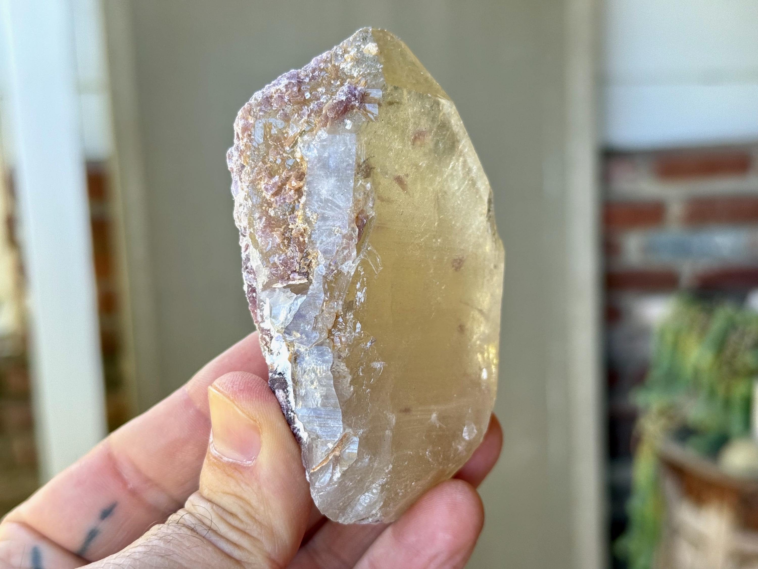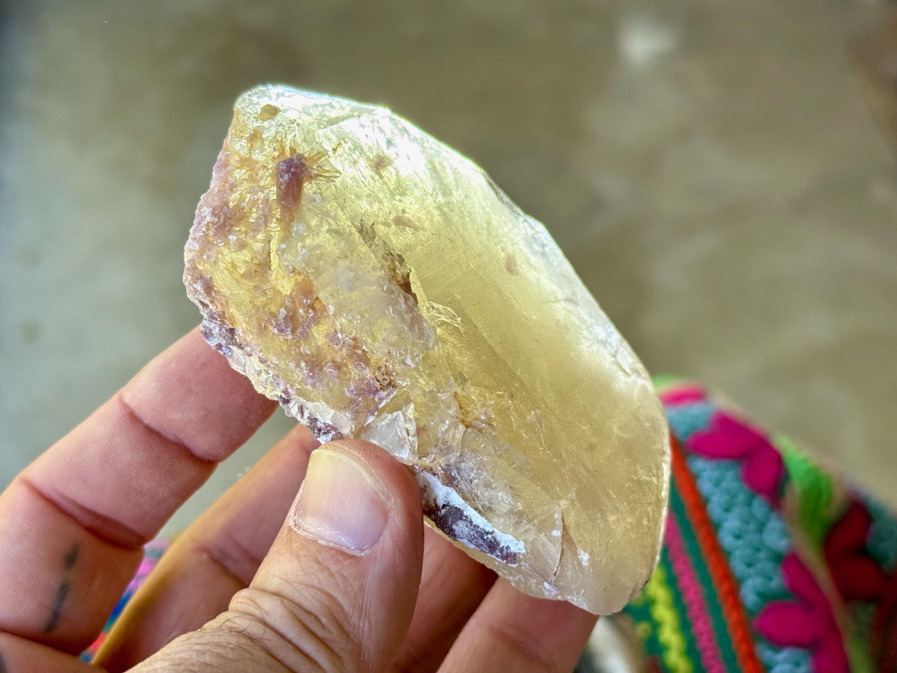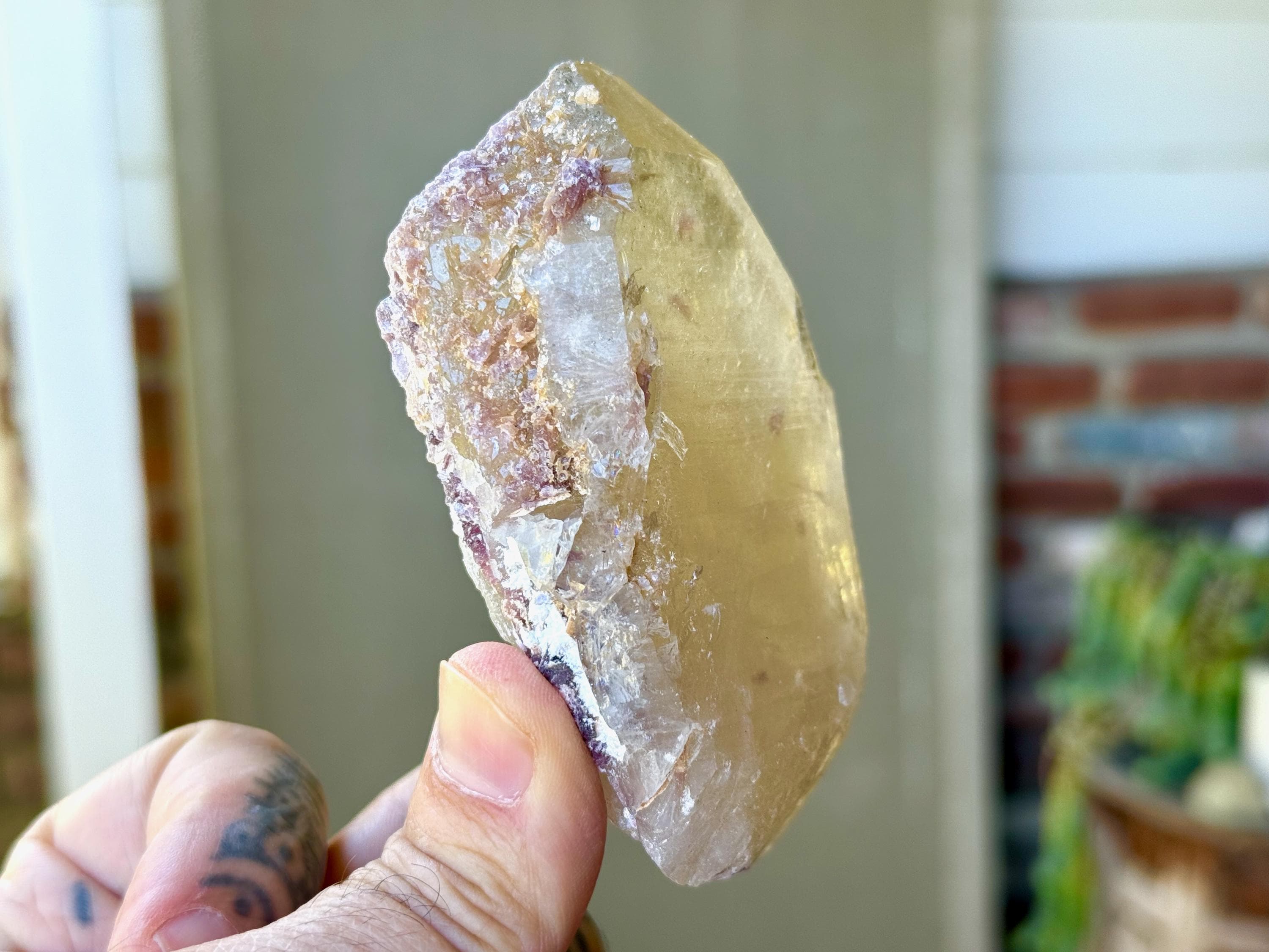 Brilliant luster and a lovely golden hue to this natural Citrine with pretty inclusions of Purple Lepidolite floating within! We see more of this Lepidolite encrusted on the left side of the exterior as well.