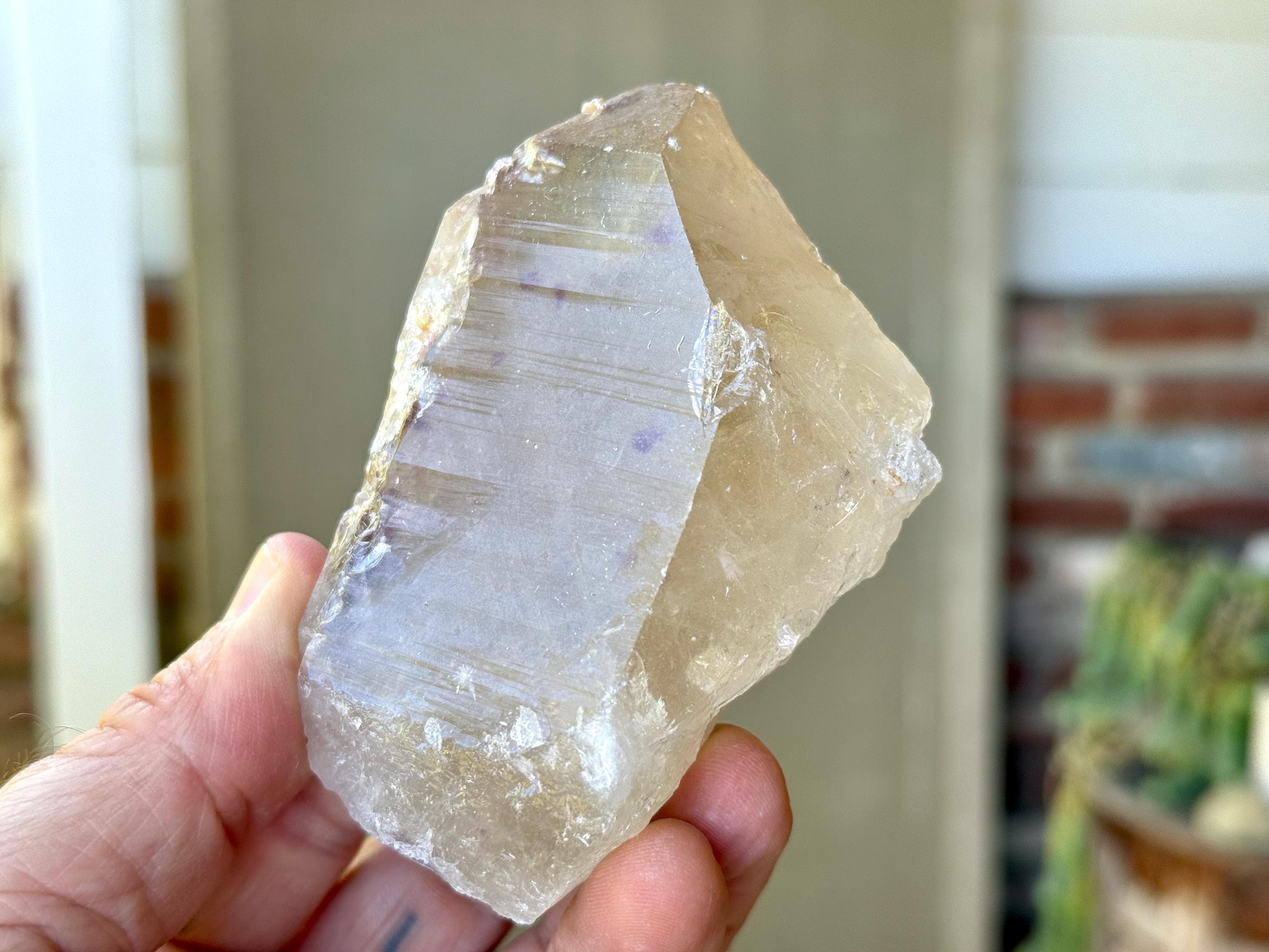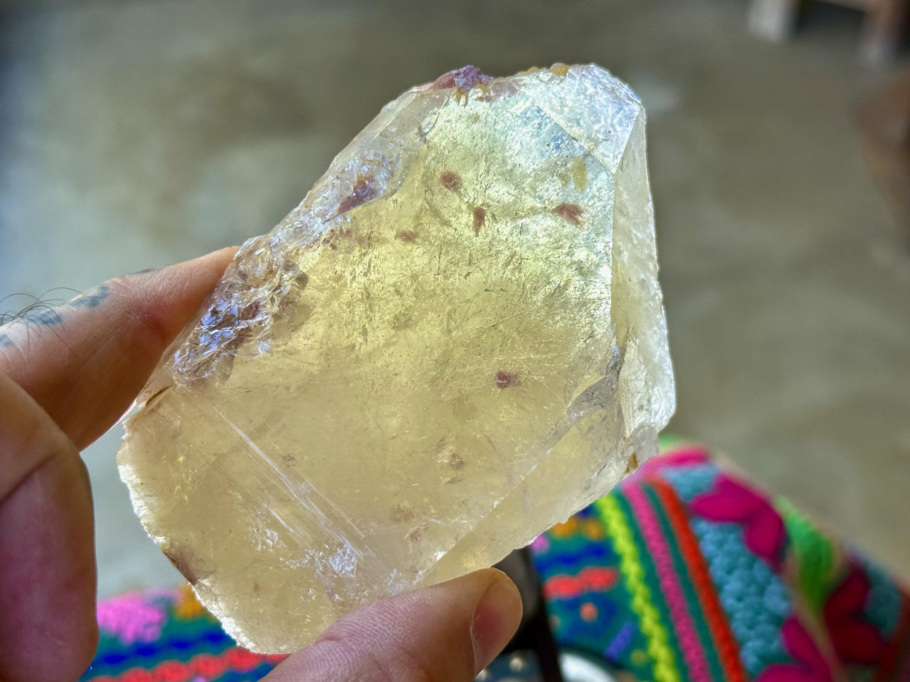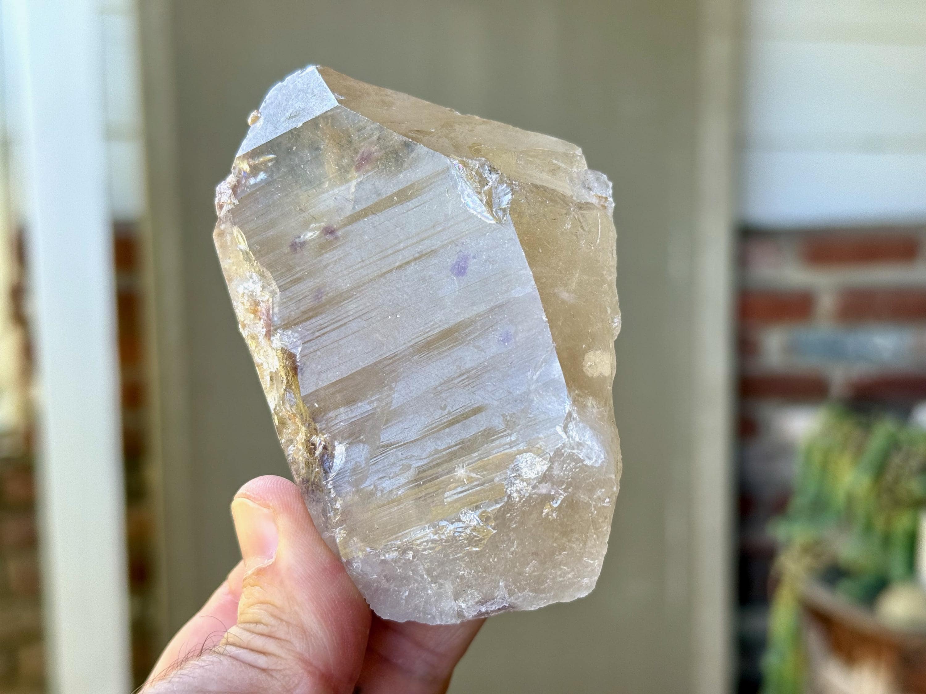 Brilliant luster and a lovely golden hue to this natural Citrine with pretty inclusions of Purple Lepidolite floating within! We see more of this Lepidolite encrusted on the left side of the exterior as well.