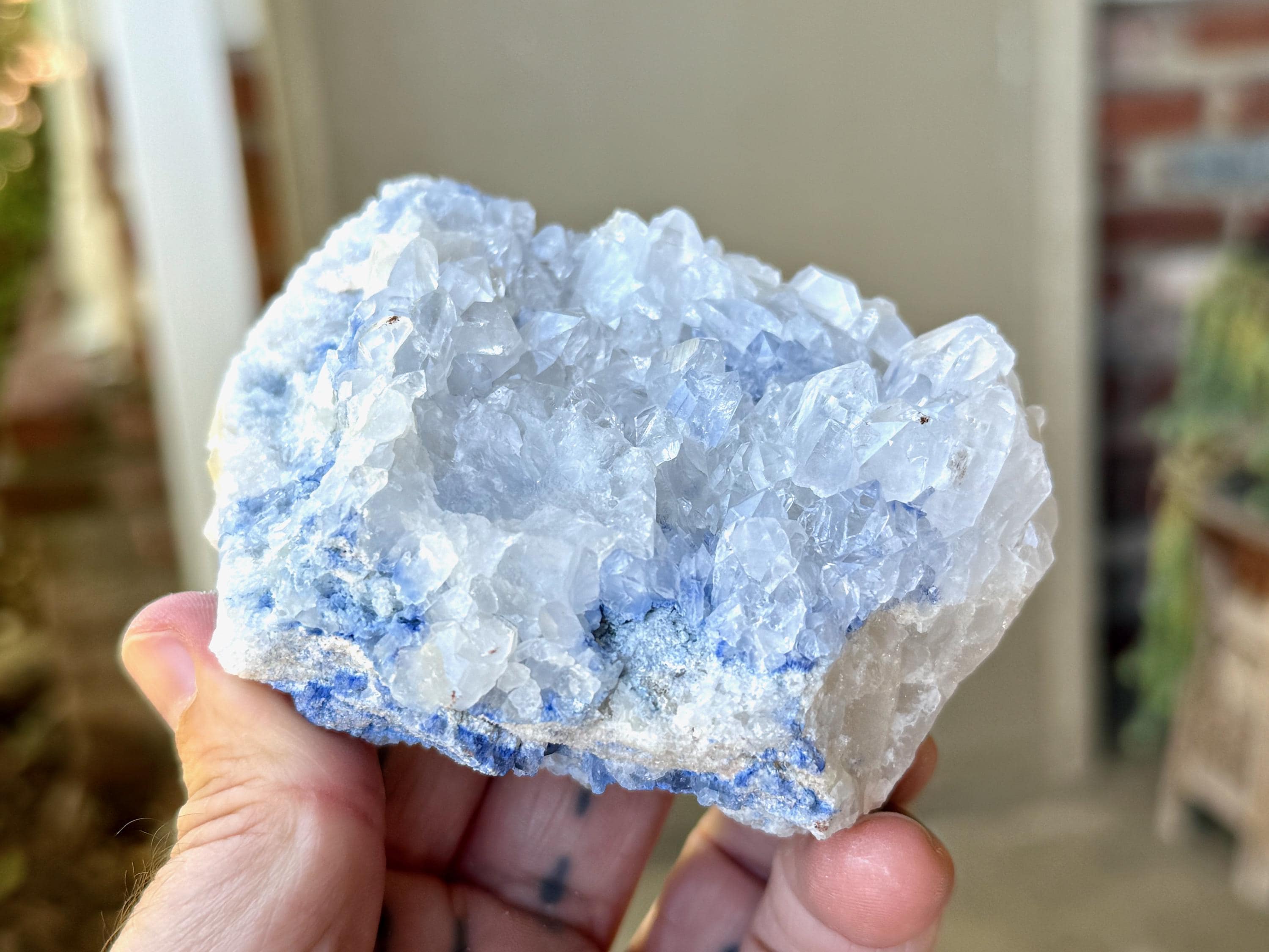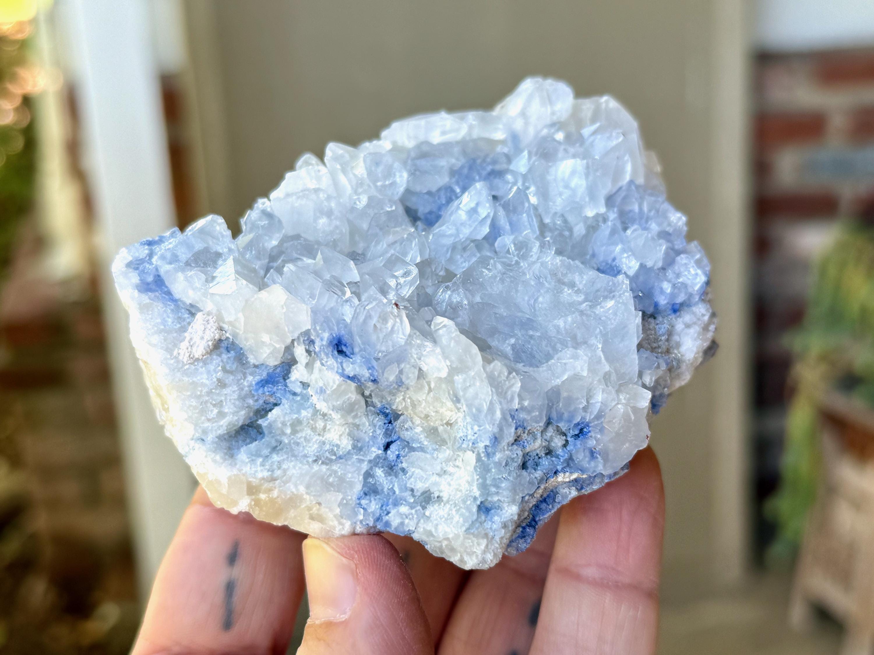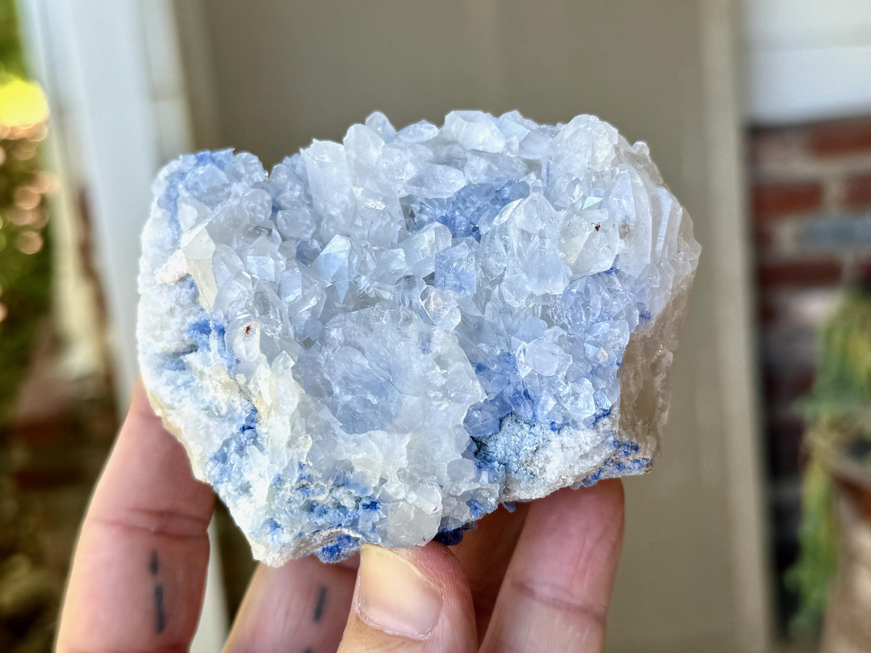 One of the largest and most beautiful crystals from this collection, this stunning Dumortierite Quartz cluster possesses a marvelous formation. Much of the actual Dumortierite is on the white matrix beneath, peeking out into the crystalline formations on top. These small crystal points are lustrous with a wonderful icy complexion. The dark blue Dumortierite is so vibrant, it's superb!