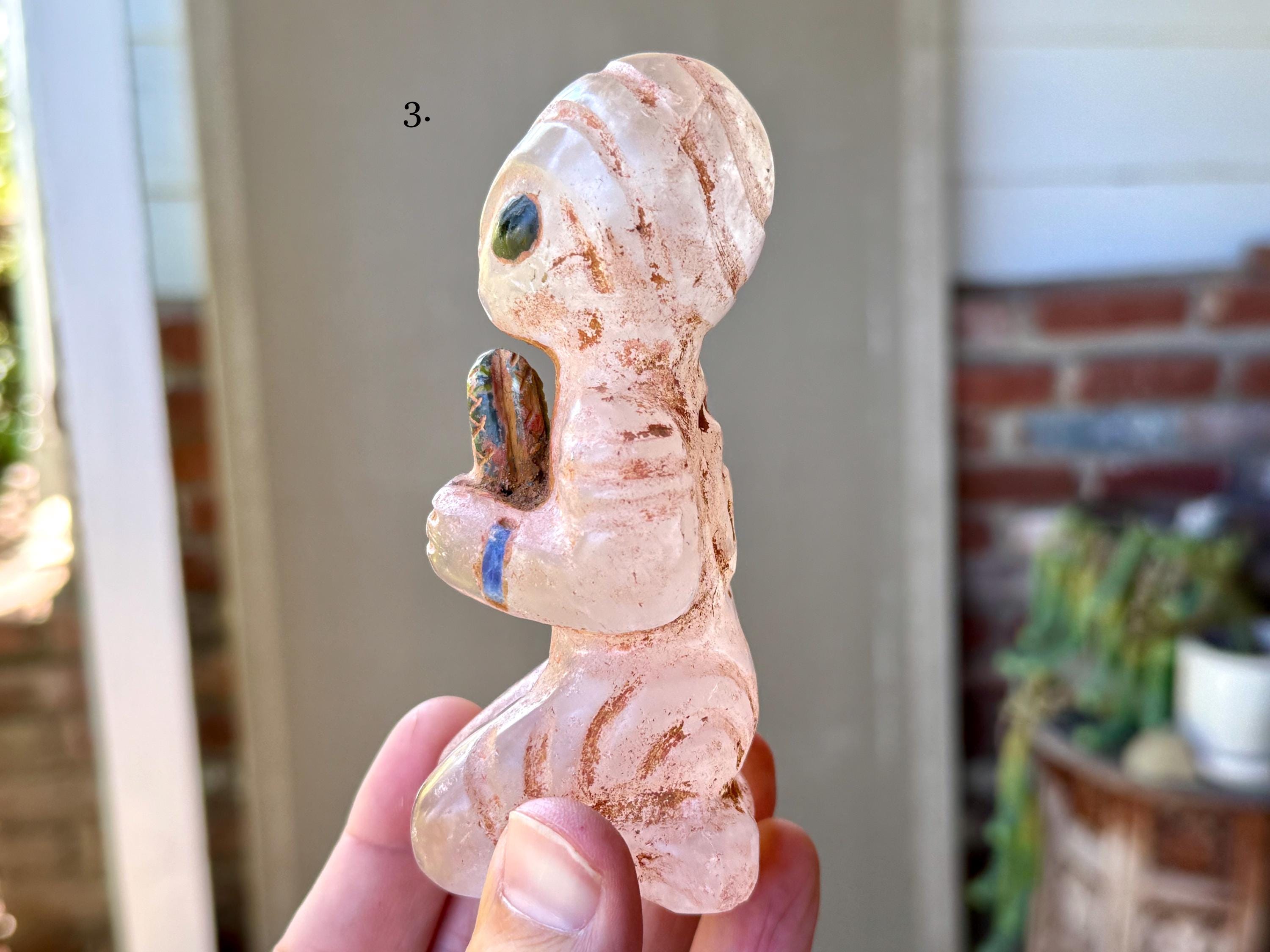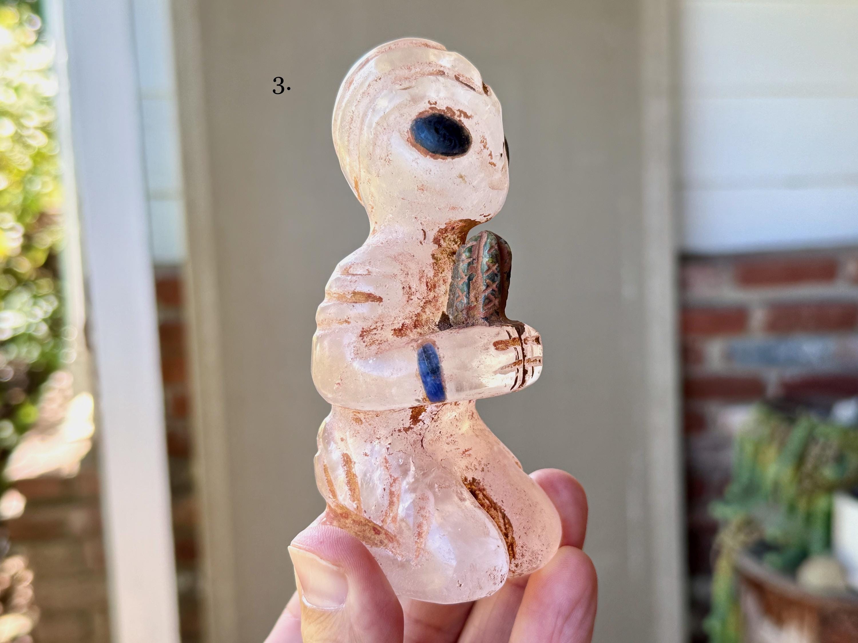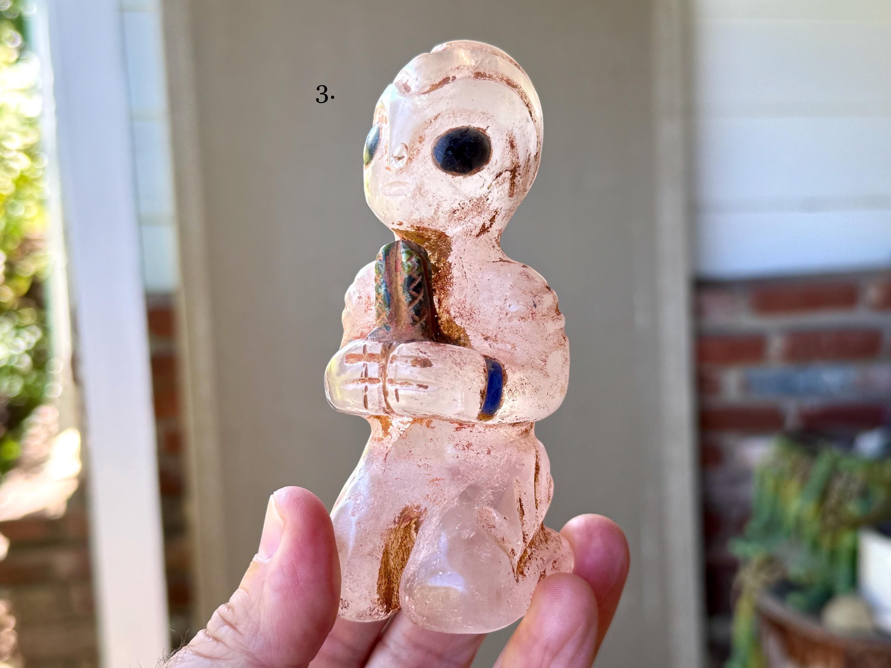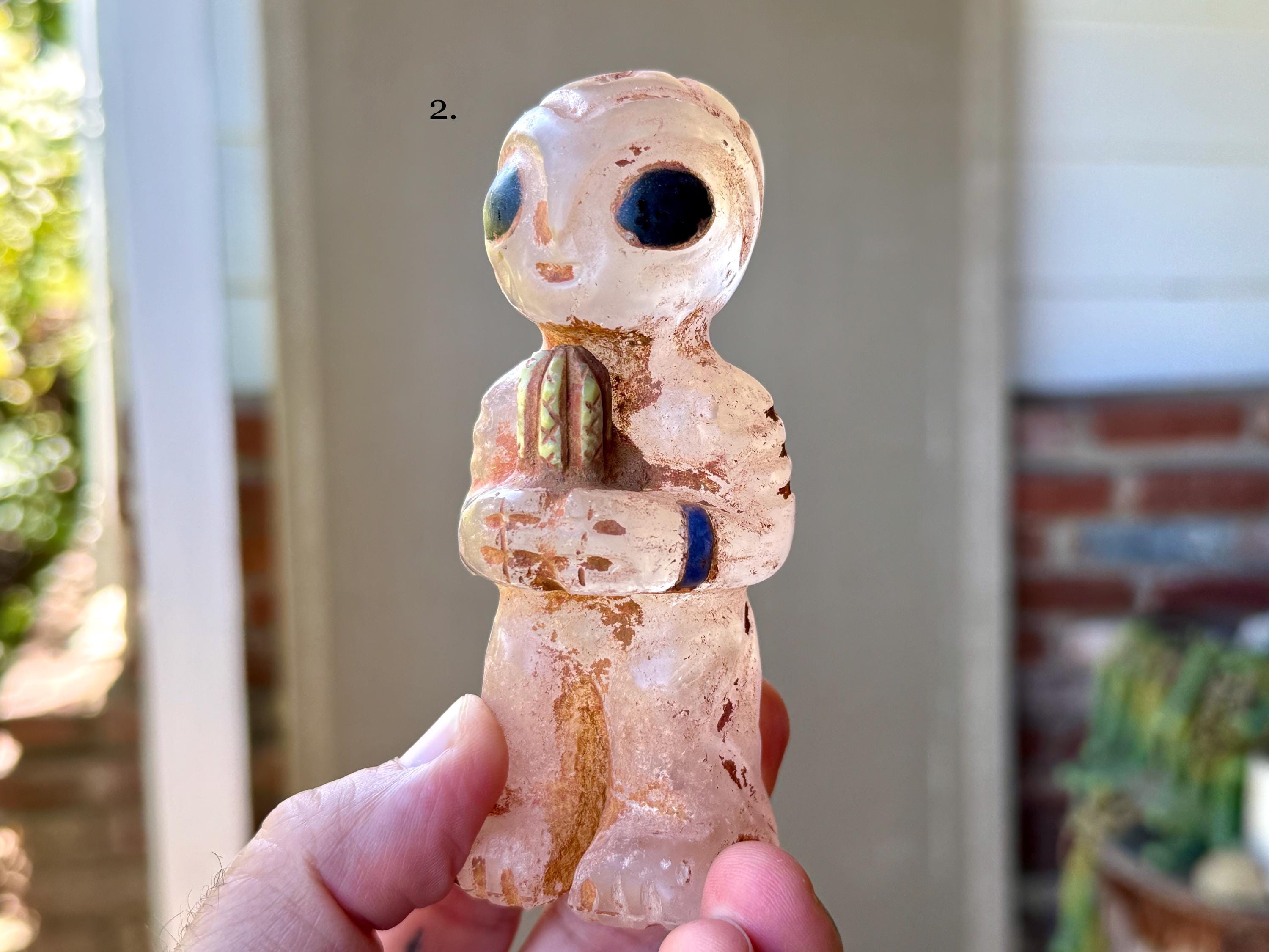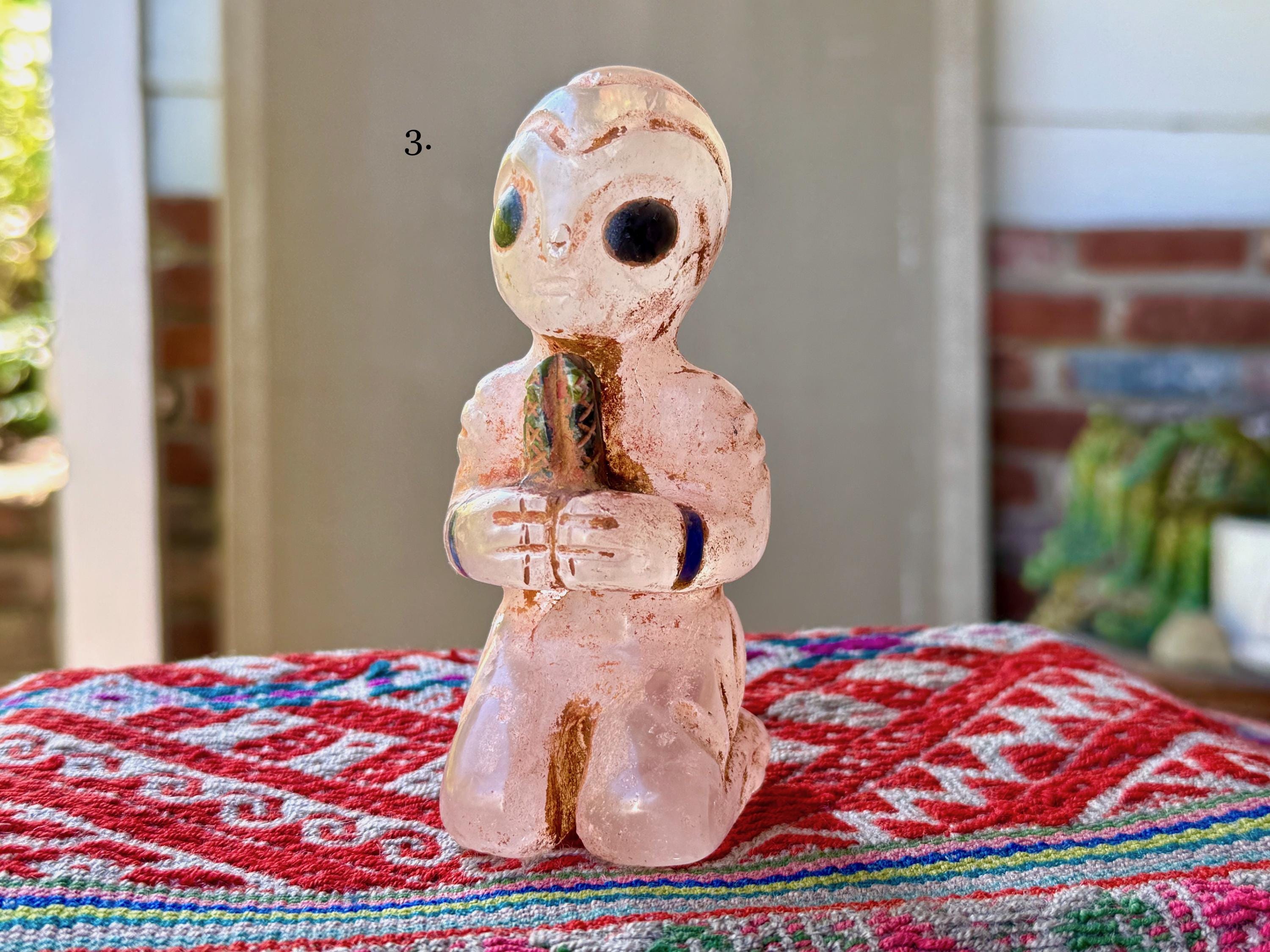 These magnificent Quartz Crystal Extraterrestrial statuettes were hand carved from native Peruvian Quartz by artist Ruben Layme in Peru's Sacred Valley. The Quartz from this area of Peru has a strong energetic quality, especially as the land has a rich history of extraterrestrial activity.