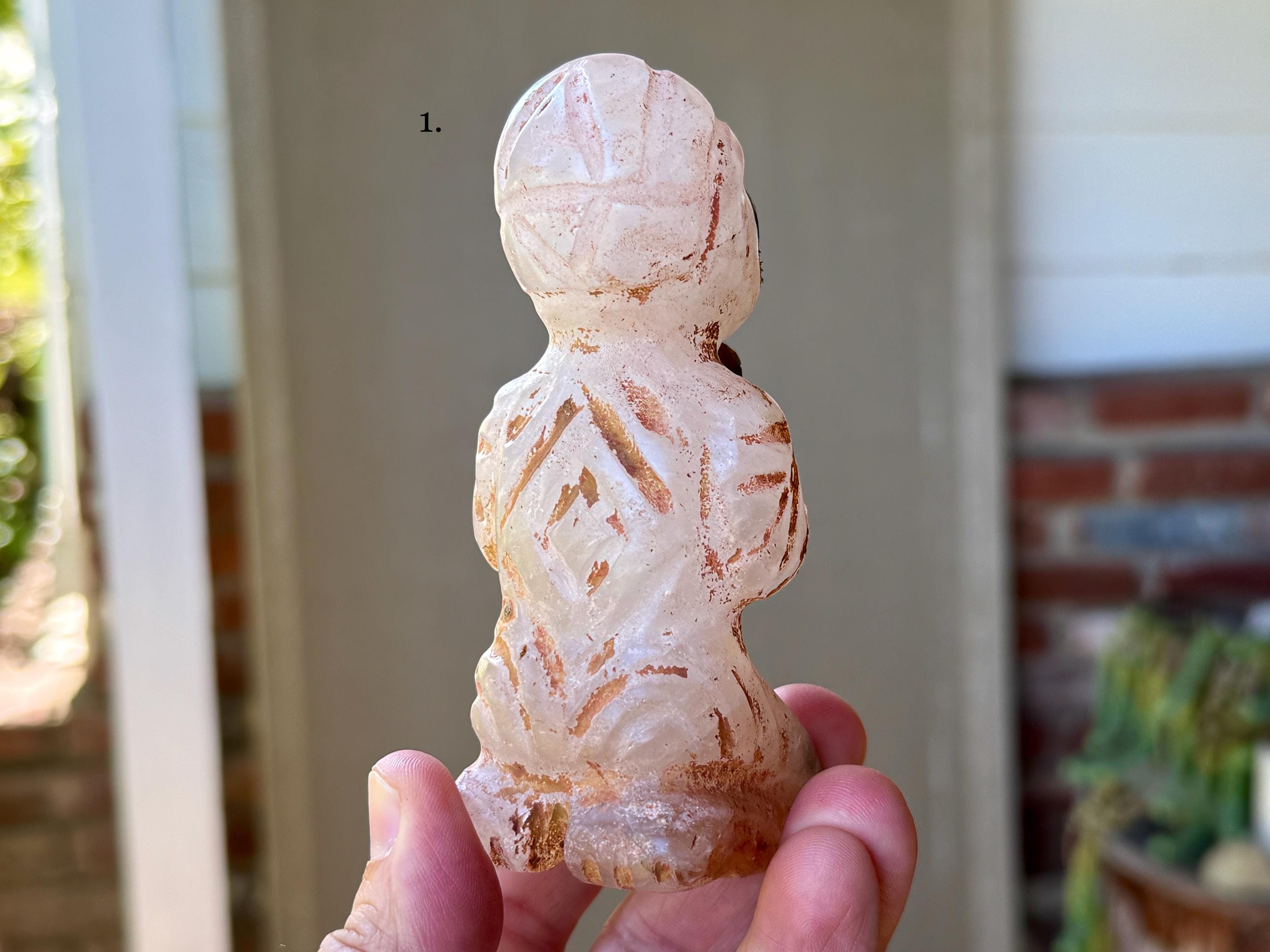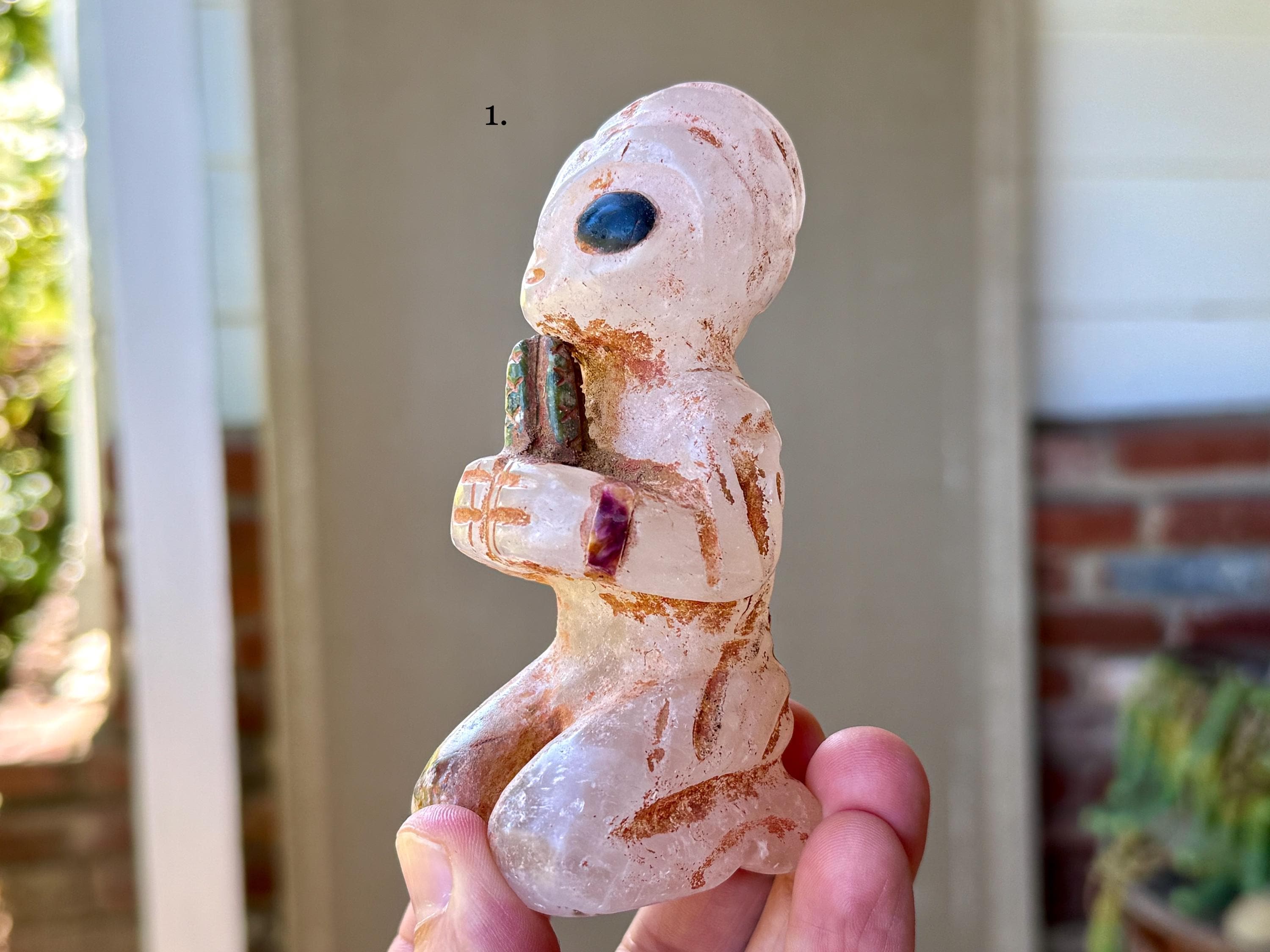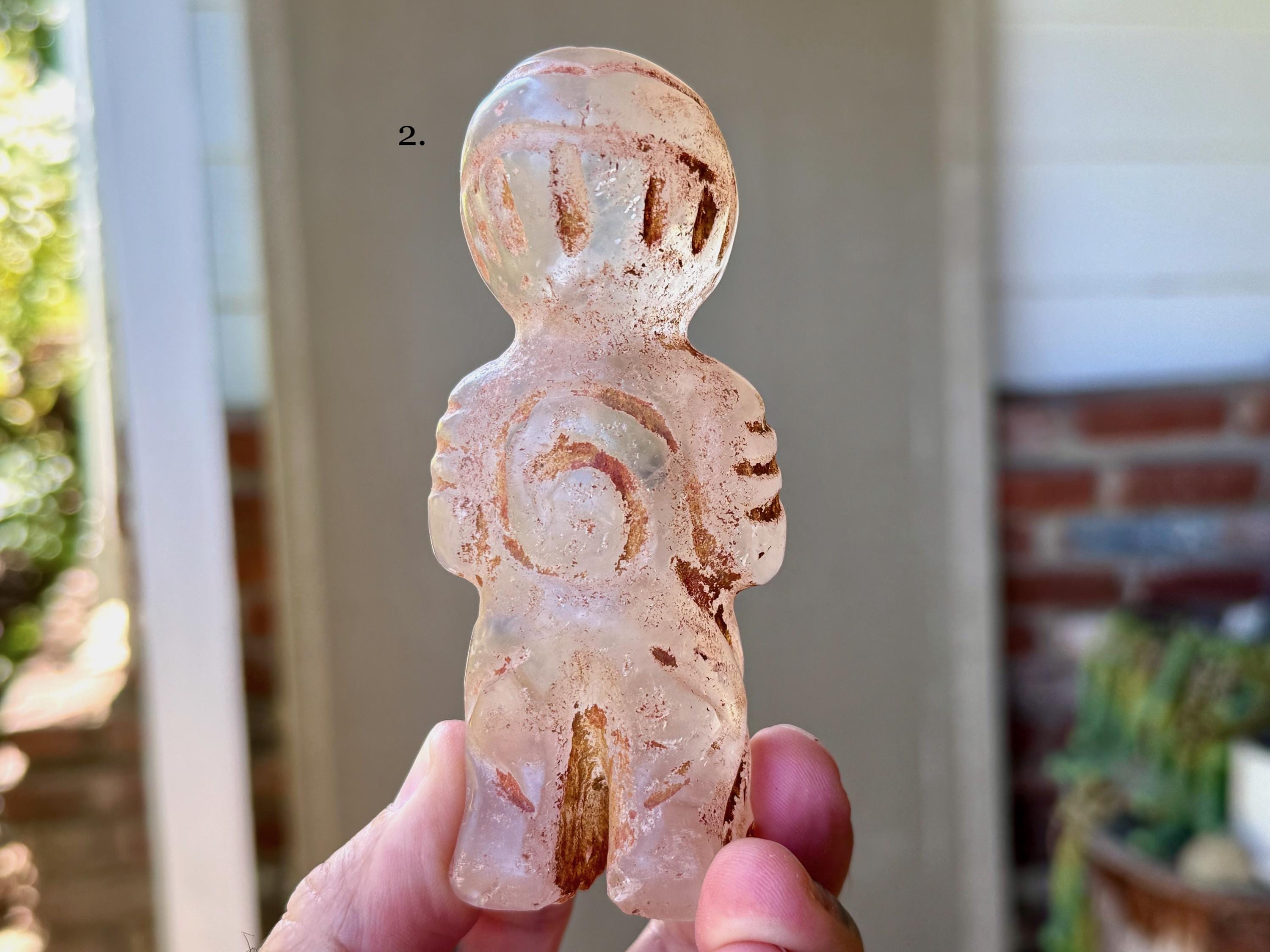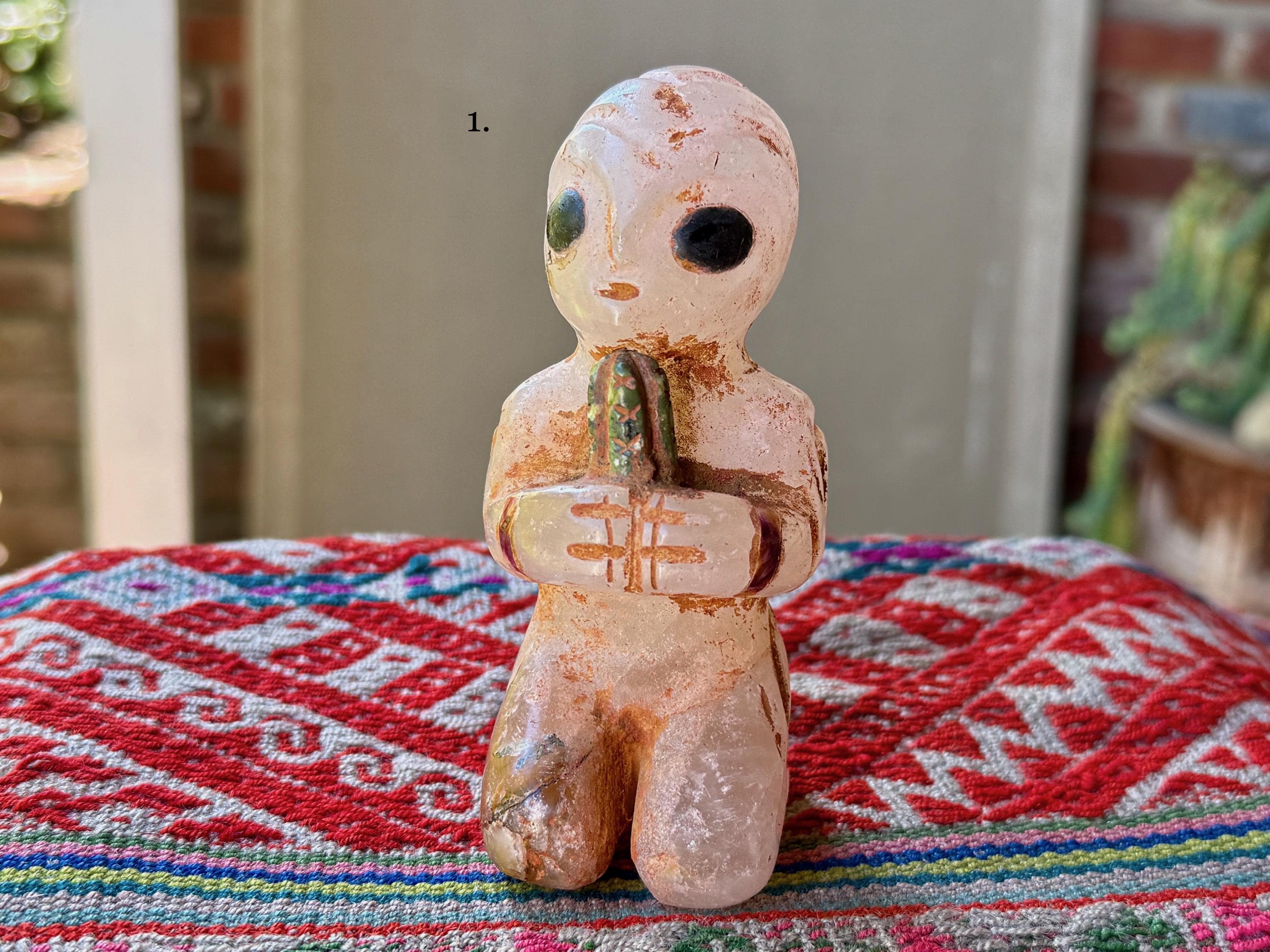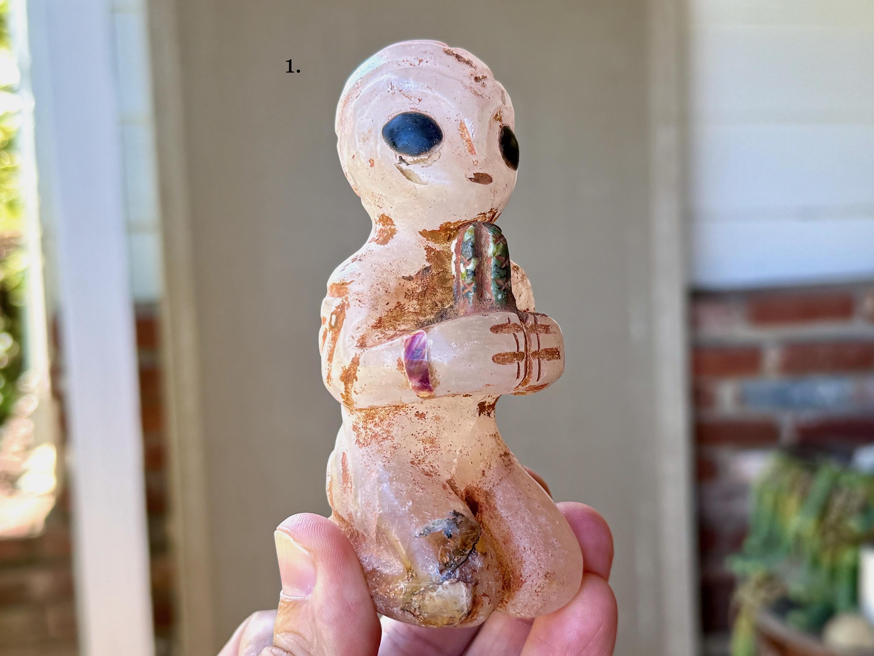 The bodies are made of native Quartz, the eyes are Obsidian inlays, and they hold "Grandfather" cactus which is carved from native Serpentine. On the wrists are bands that appear to be made from some type of seashell. The artist uses a special weathering process to give each an ancient patina. Each comes with its own high-quality woven bag for safe storage.