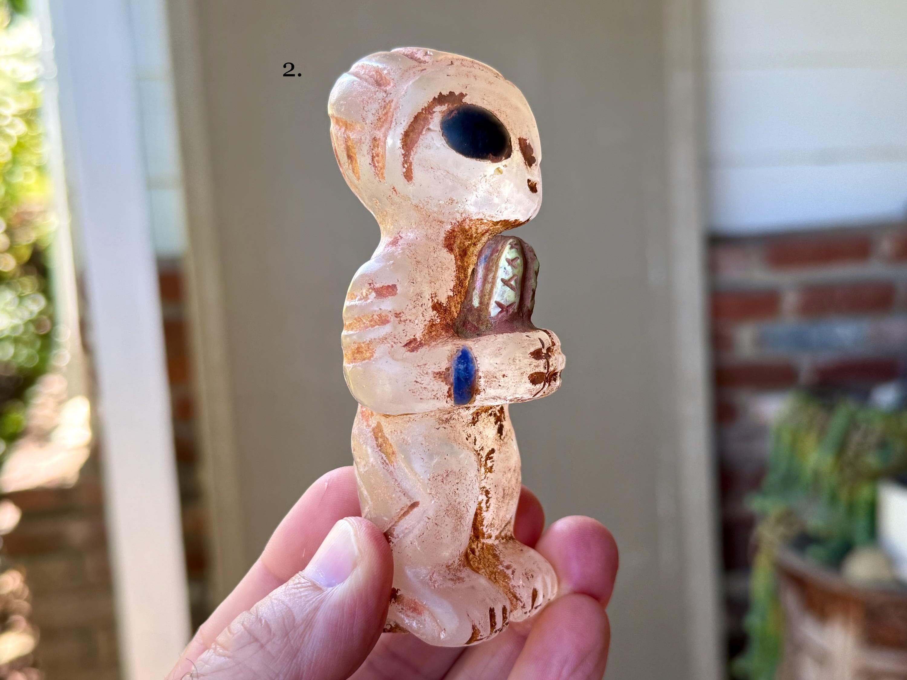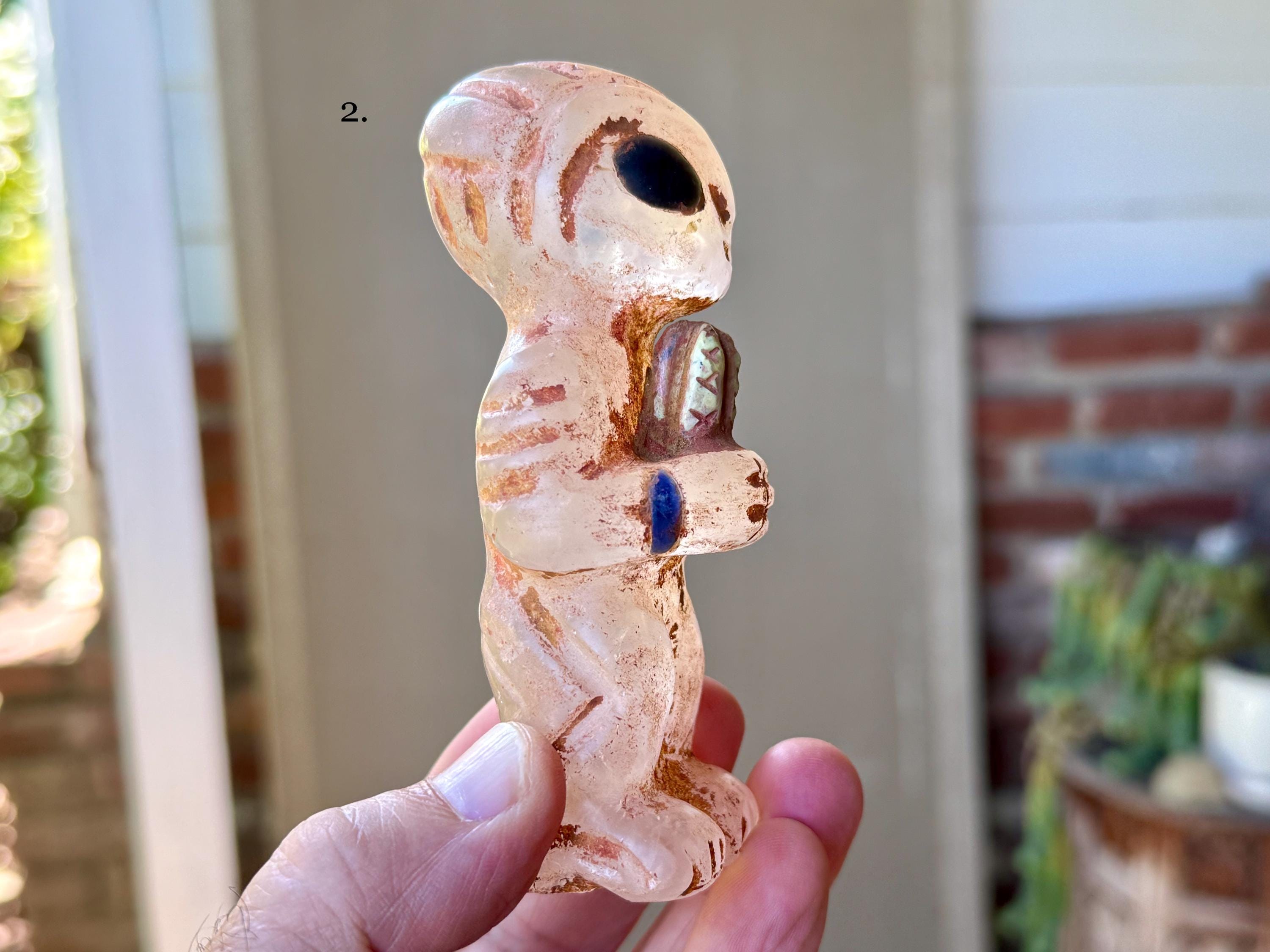 These alien statues stand upright on their own, making them a perfect addition to any shamanic altar, meditation space, or cosmic collection. Their seamless combination of materials and detailed artistry ensures it’s a standout piece for any spiritual or ceremonial space.