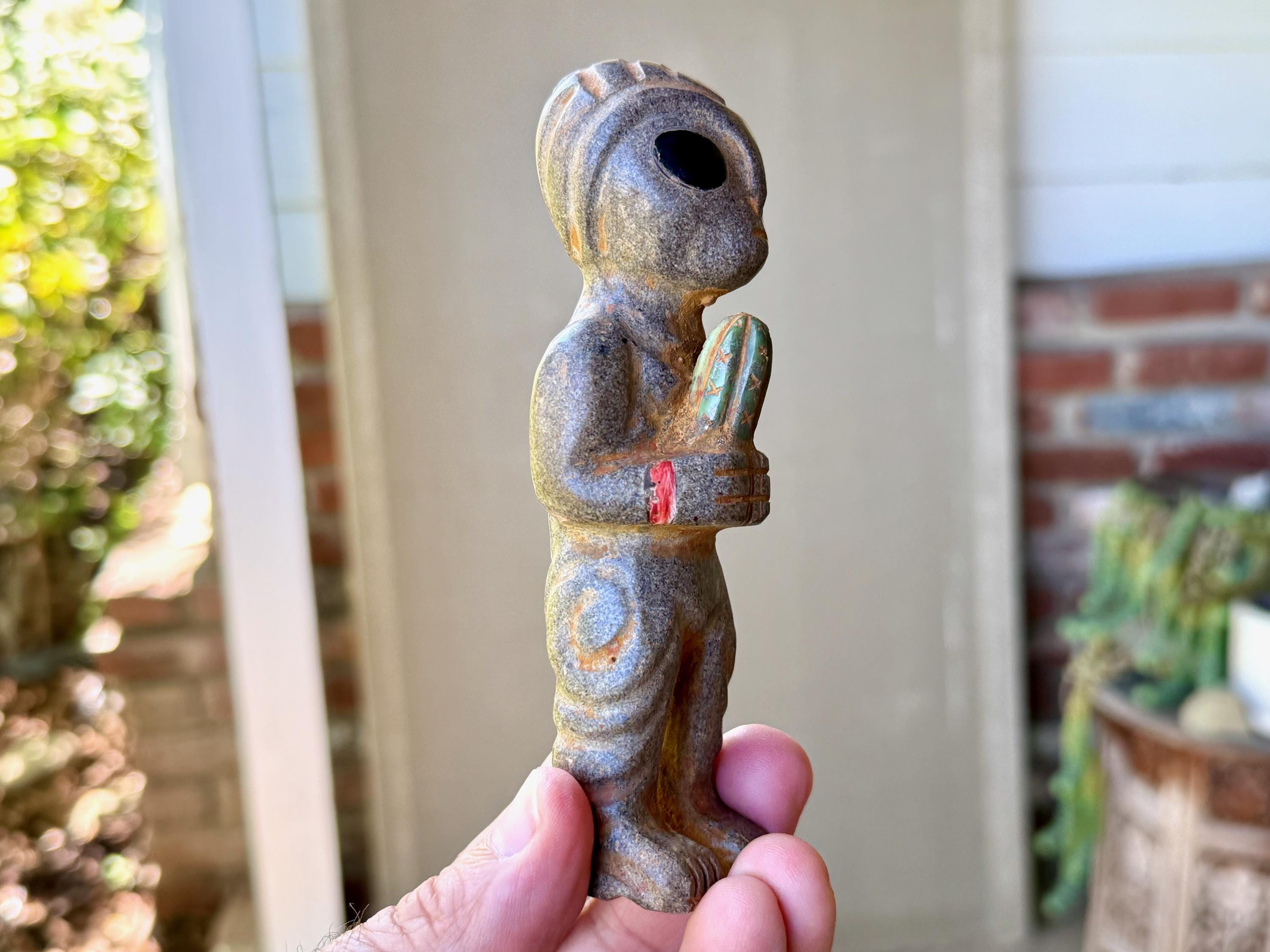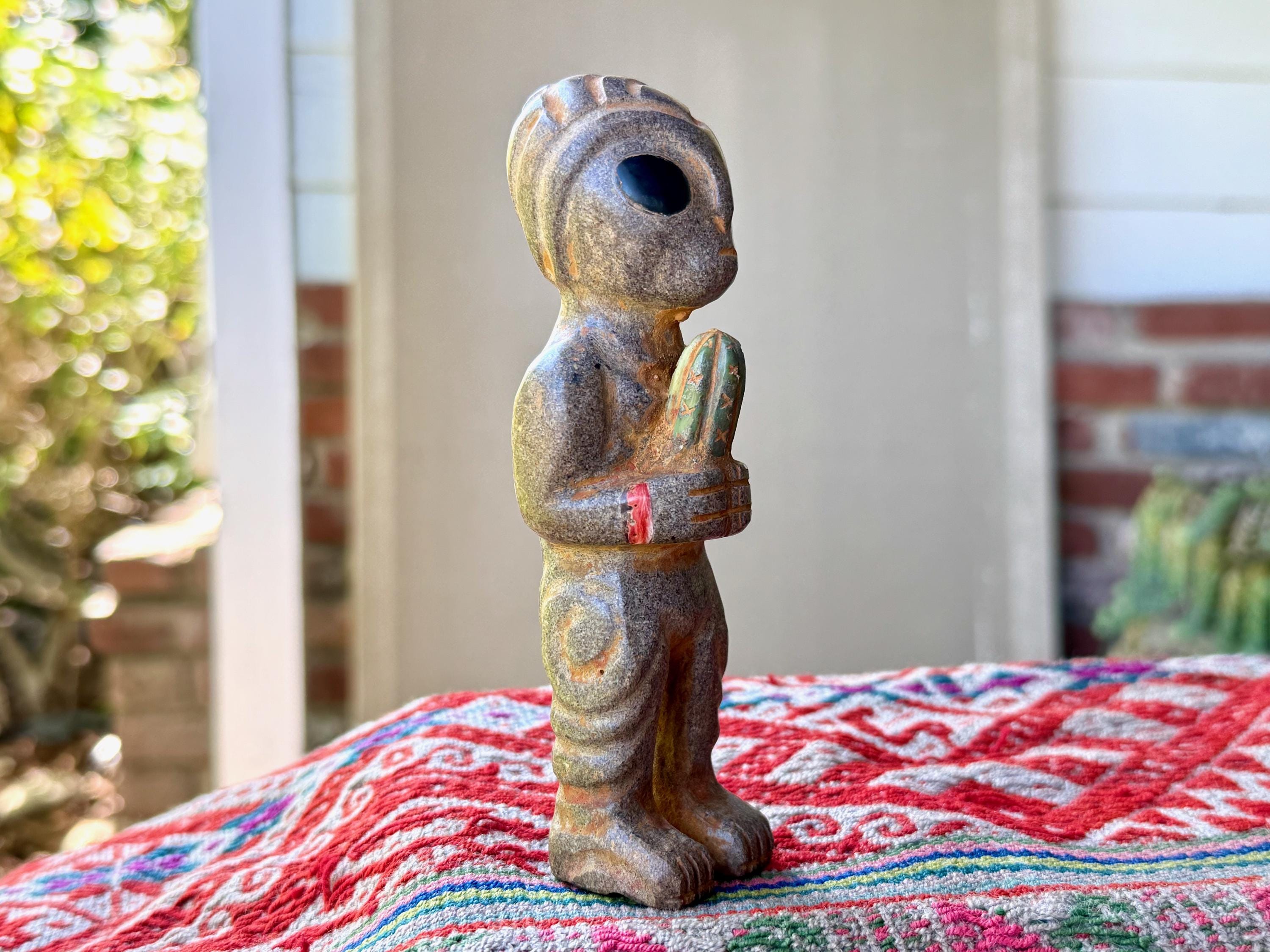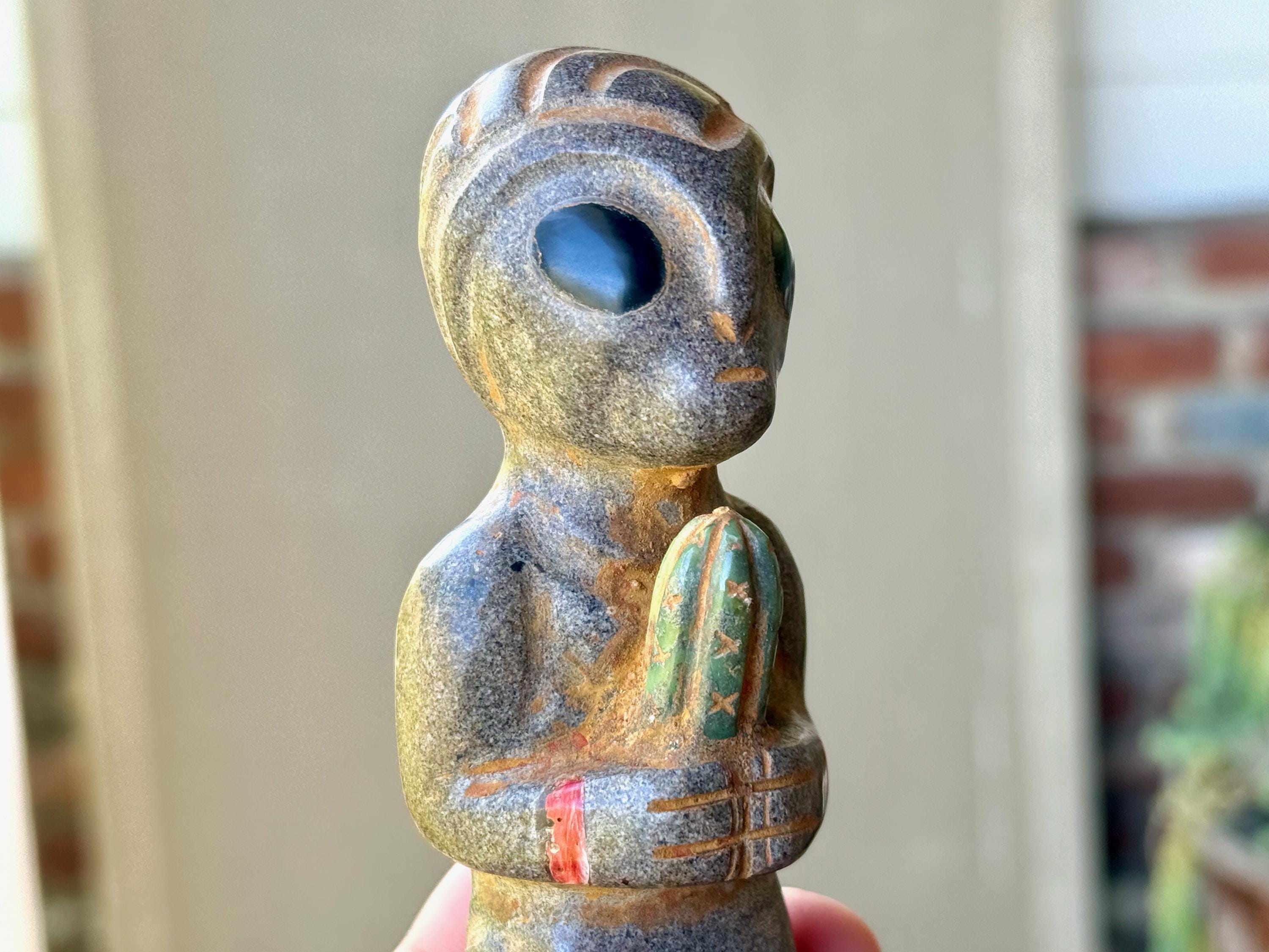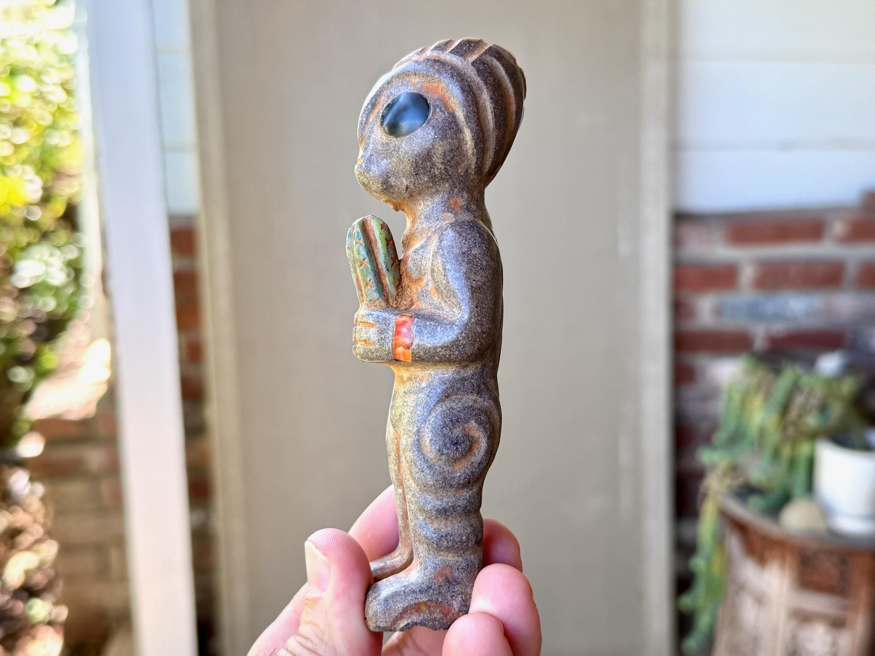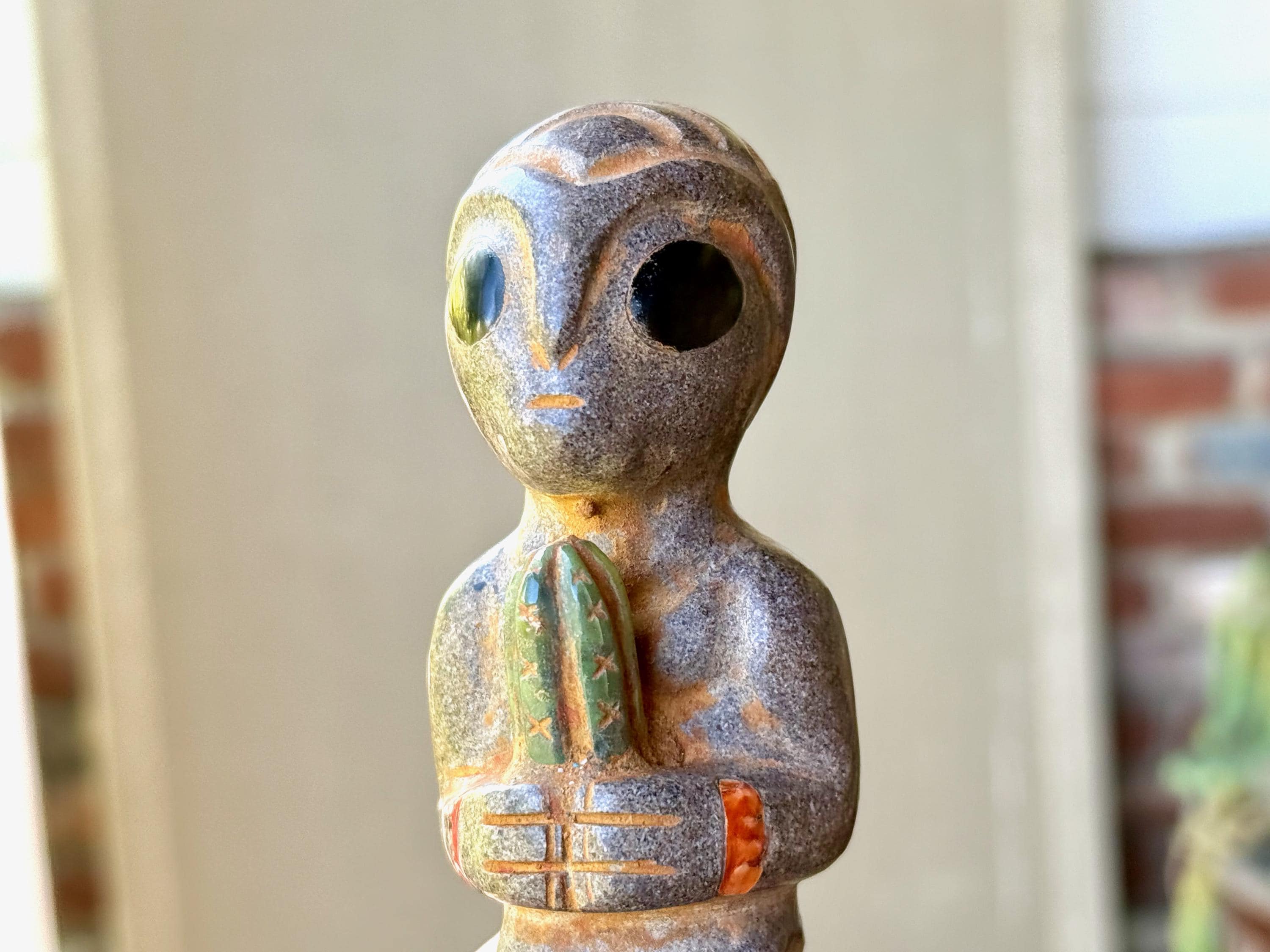 This adorable cosmic traveler is so incredibly well-articulated, blending the ancient Incan art style with a more modern extraterrestrial vision. The piece depicts a classic "Grey" alien carved entirely out of solid Ausungate Stone from the mountains surrounding Peru's Sacred Valley. The eyes are Obsidian inlays, and he holds a "Grandfather" cactus which is carved from Serpentine. On his wrists are bands that appear to be made from some type of opalescent seashell.