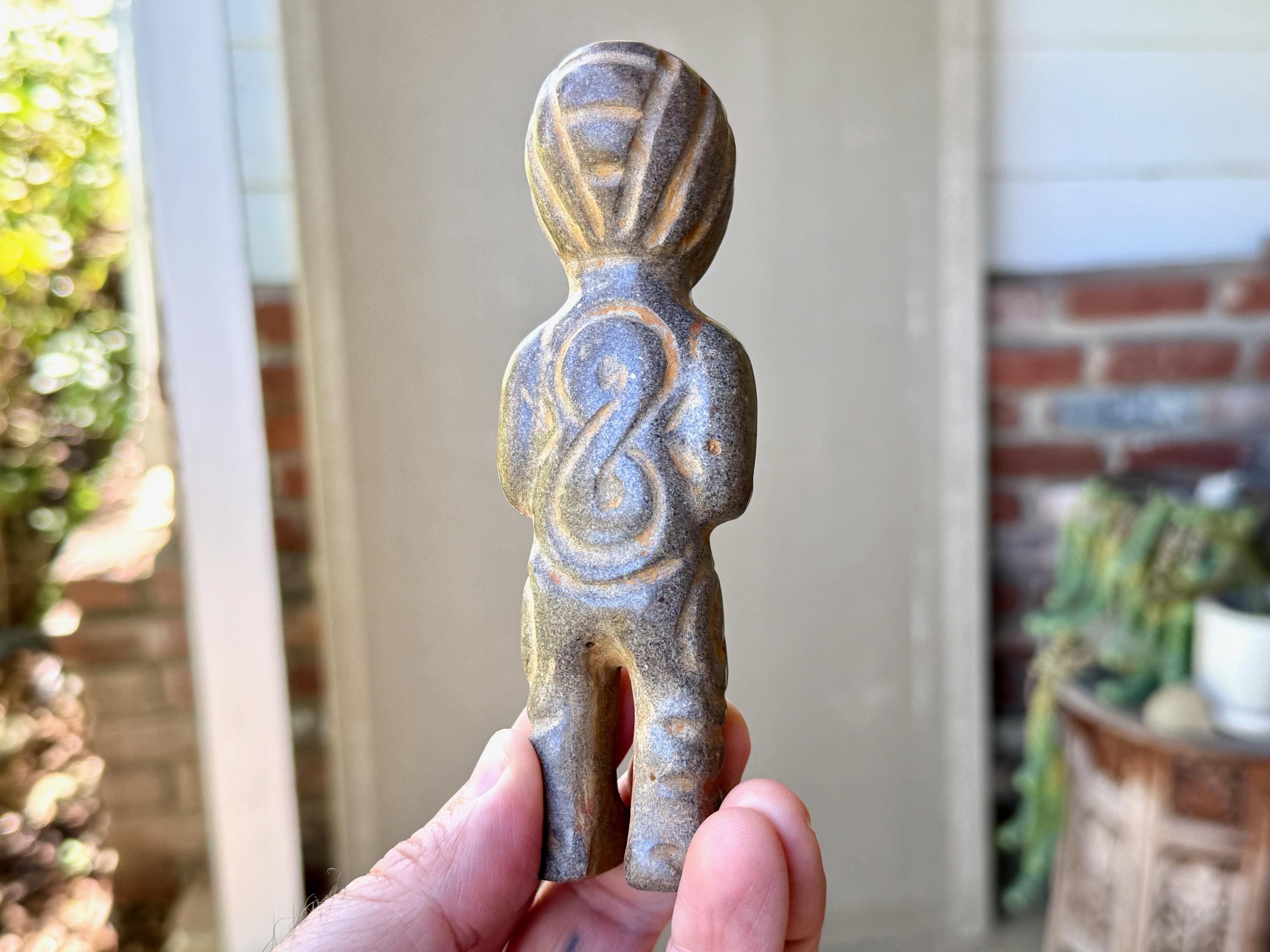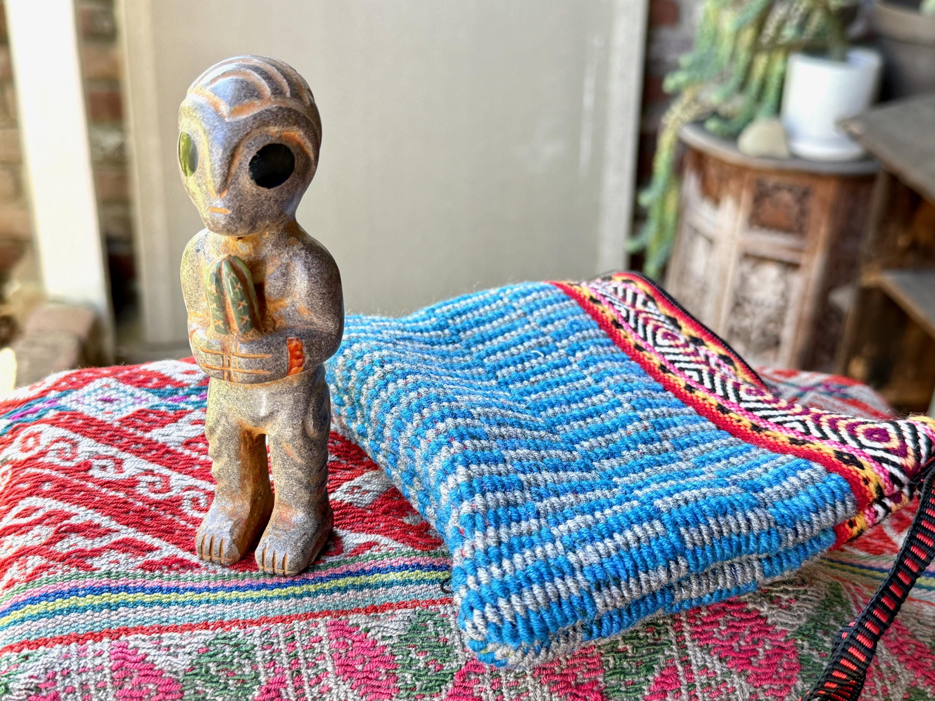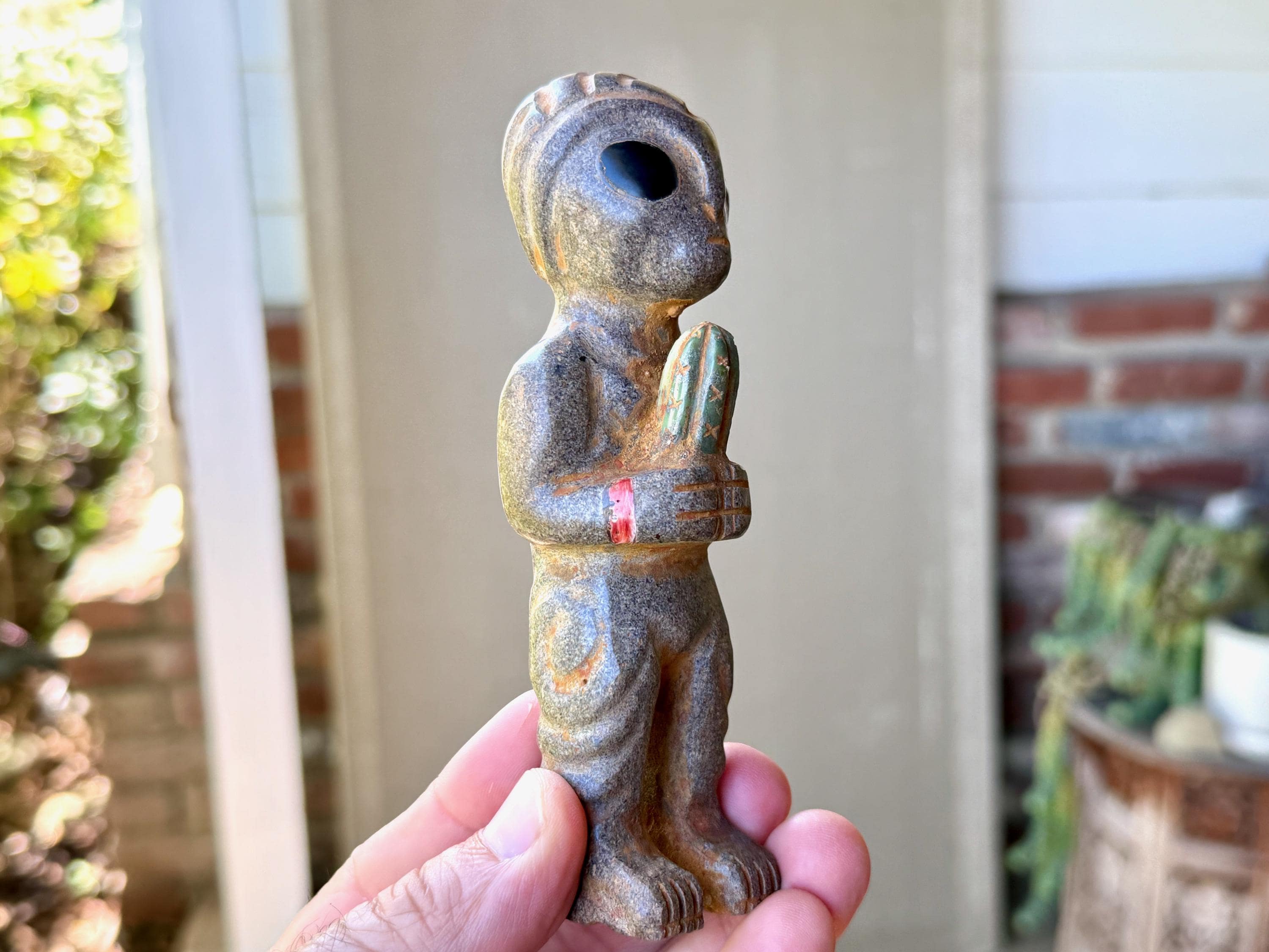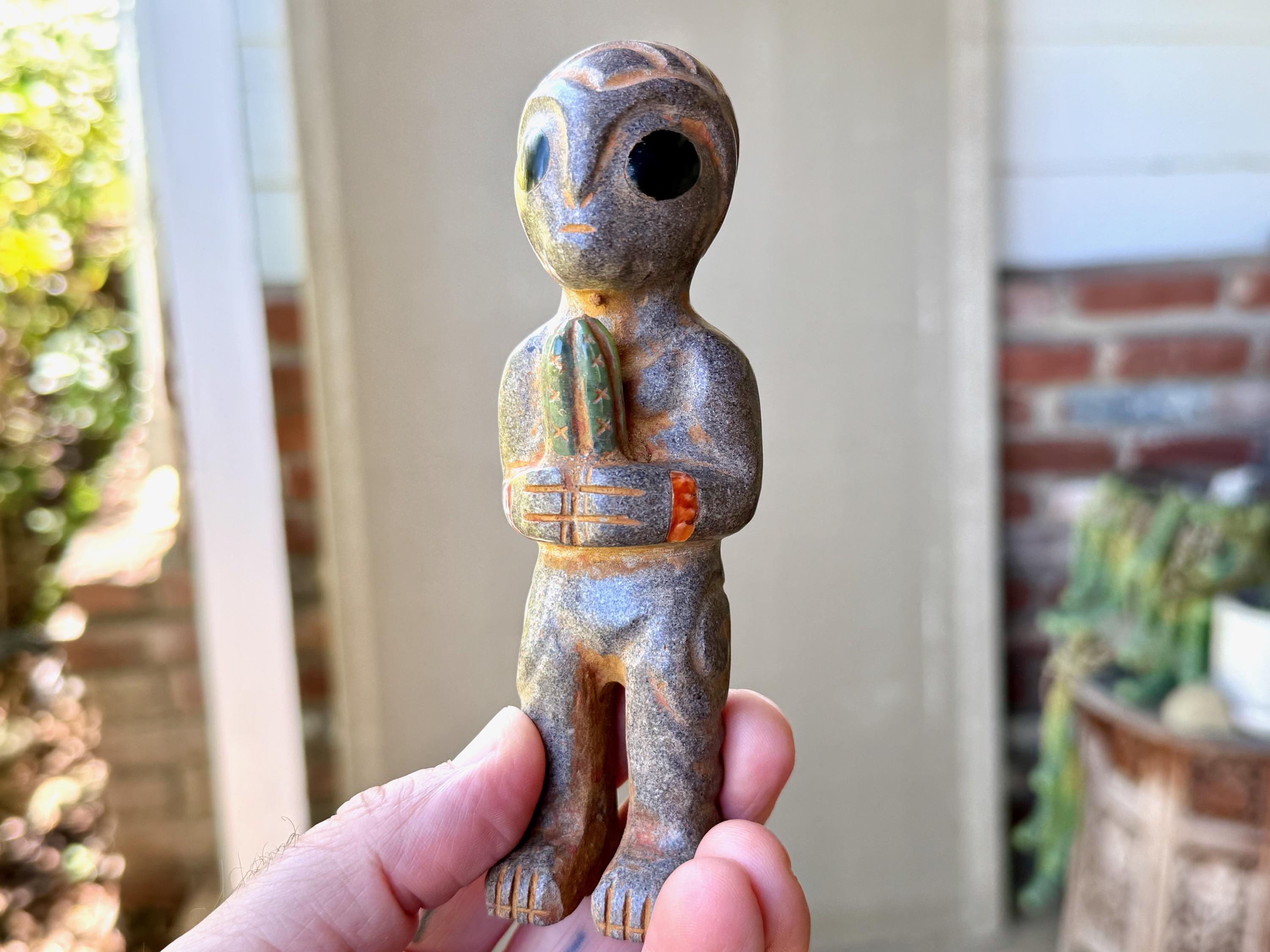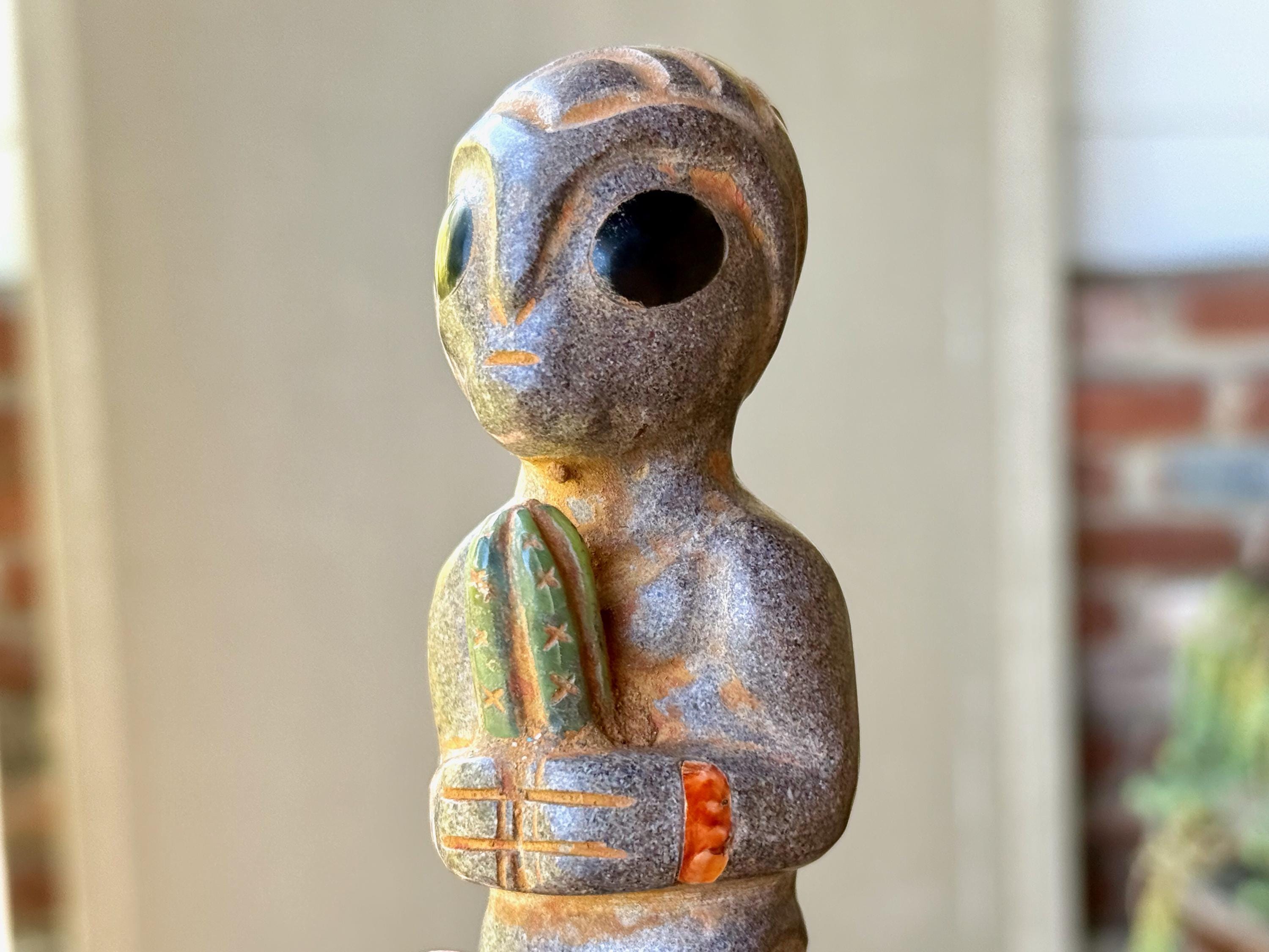 This adorable cosmic traveler is so incredibly well-articulated, blending the ancient Incan art style with a more modern extraterrestrial vision. The piece depicts a classic "Grey" alien carved entirely out of solid Ausungate Stone from the mountains surrounding Peru's Sacred Valley. The eyes are Obsidian inlays, and he holds a "Grandfather" cactus which is carved from Serpentine. On his wrists are bands that appear to be made from some type of opalescent seashell.