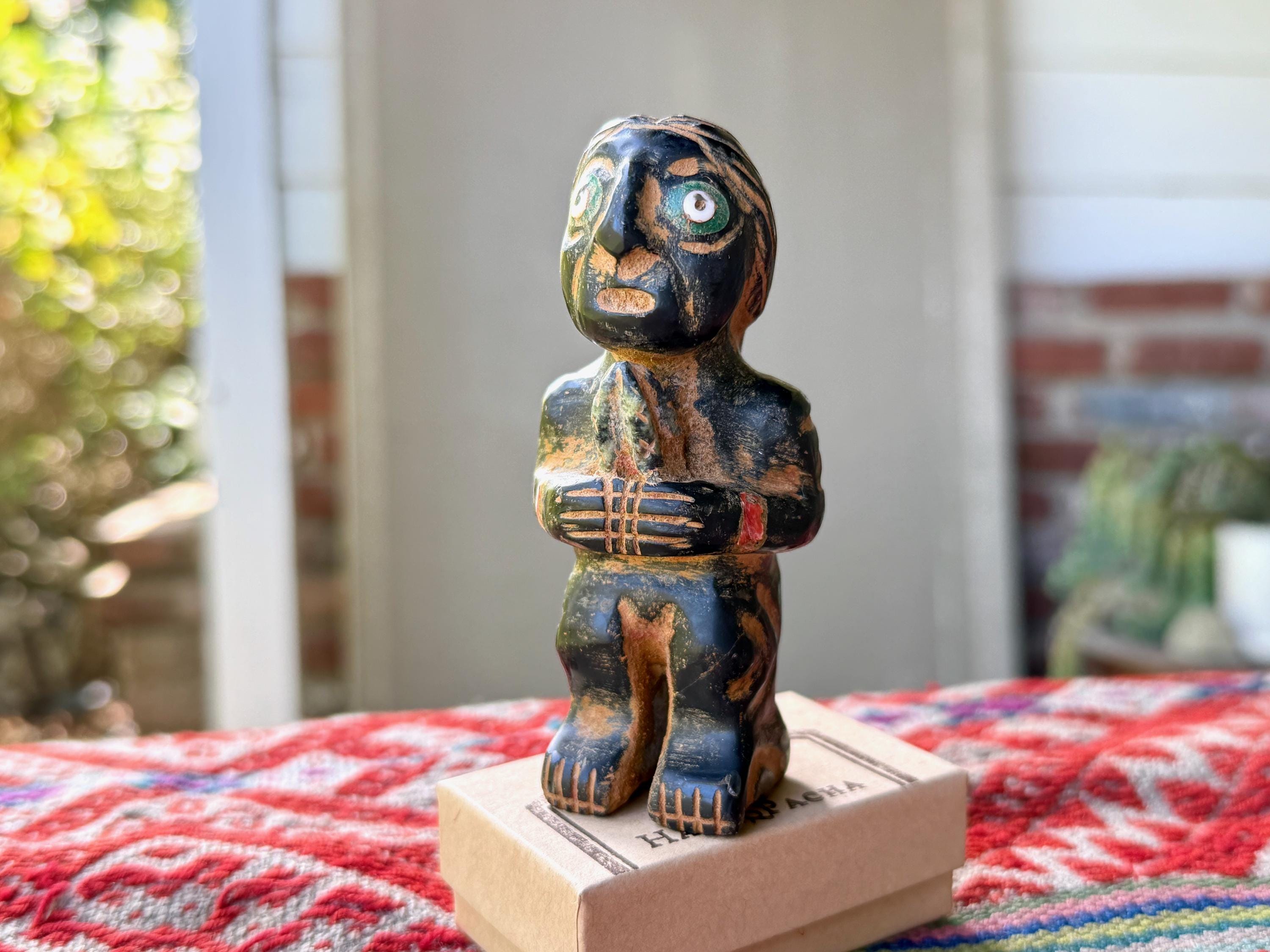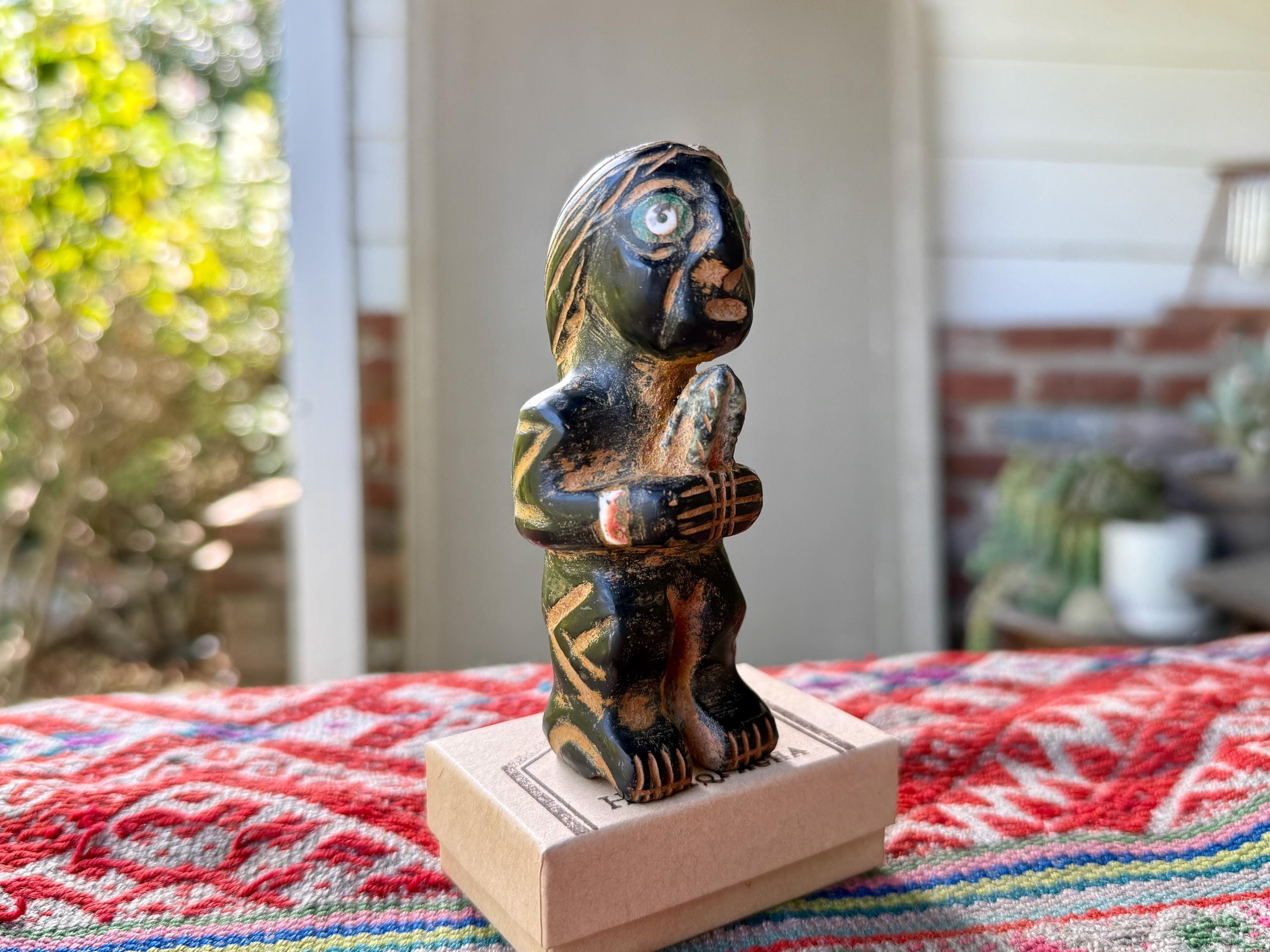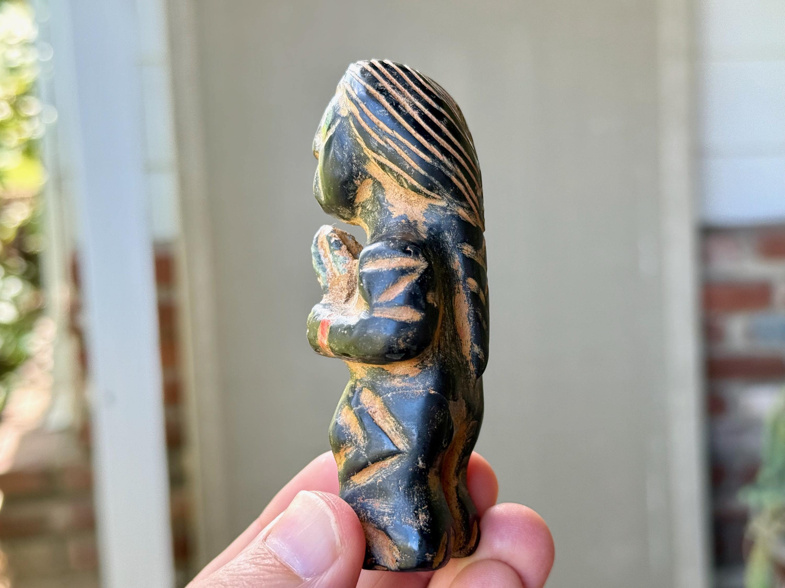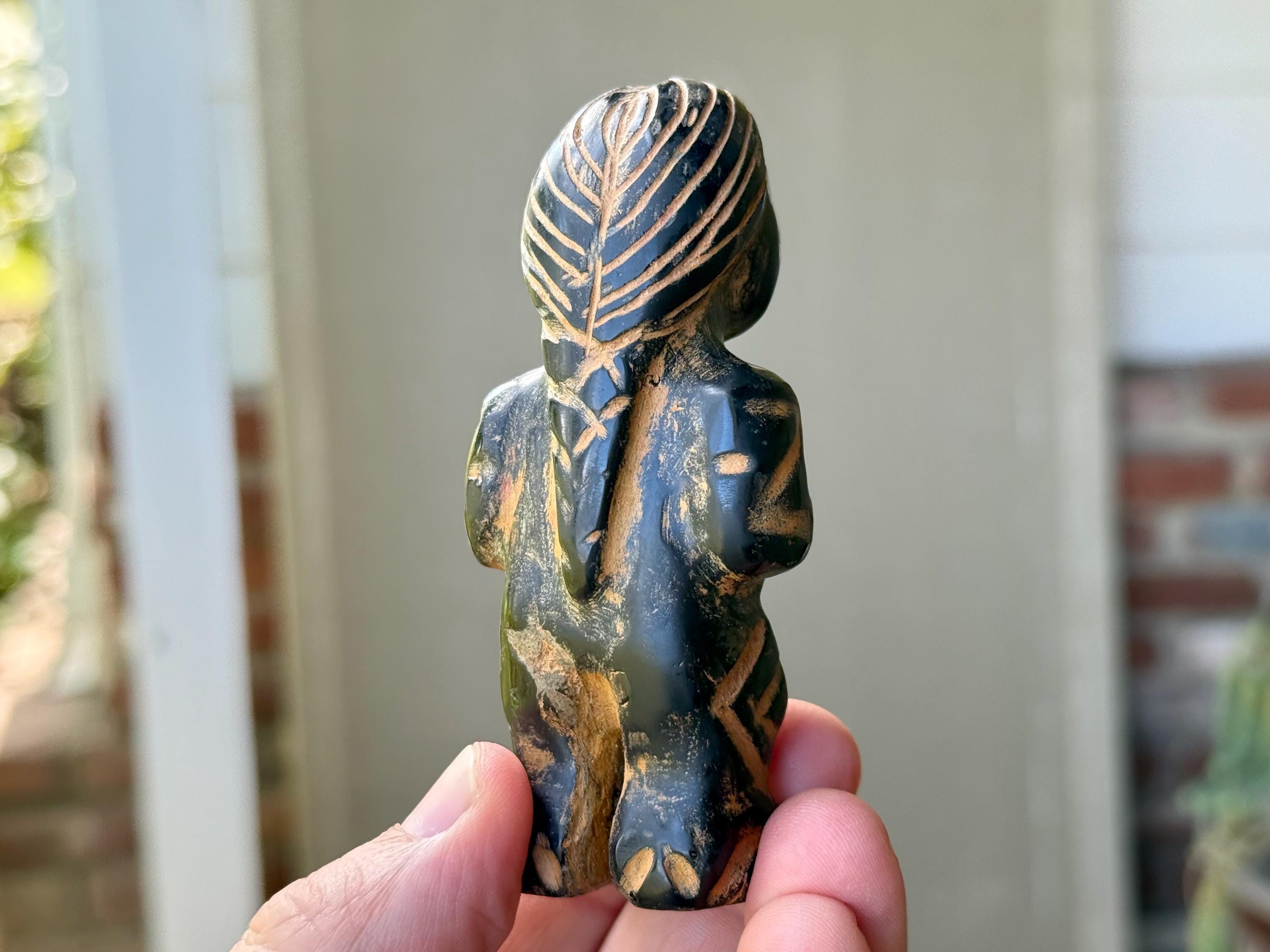 It is masterfully carved from solid Black Obsidian and weathered to perfection to give it an ancient patina. She is holding a "Grandfather" cactus, carved from Serpentine stone. It is a charming and magical characterization, she really comes to life in the details here. This statue stands perfectly upright on its own natural base and would make a powerful statement piece for home, meditation room or plant medicine altar.