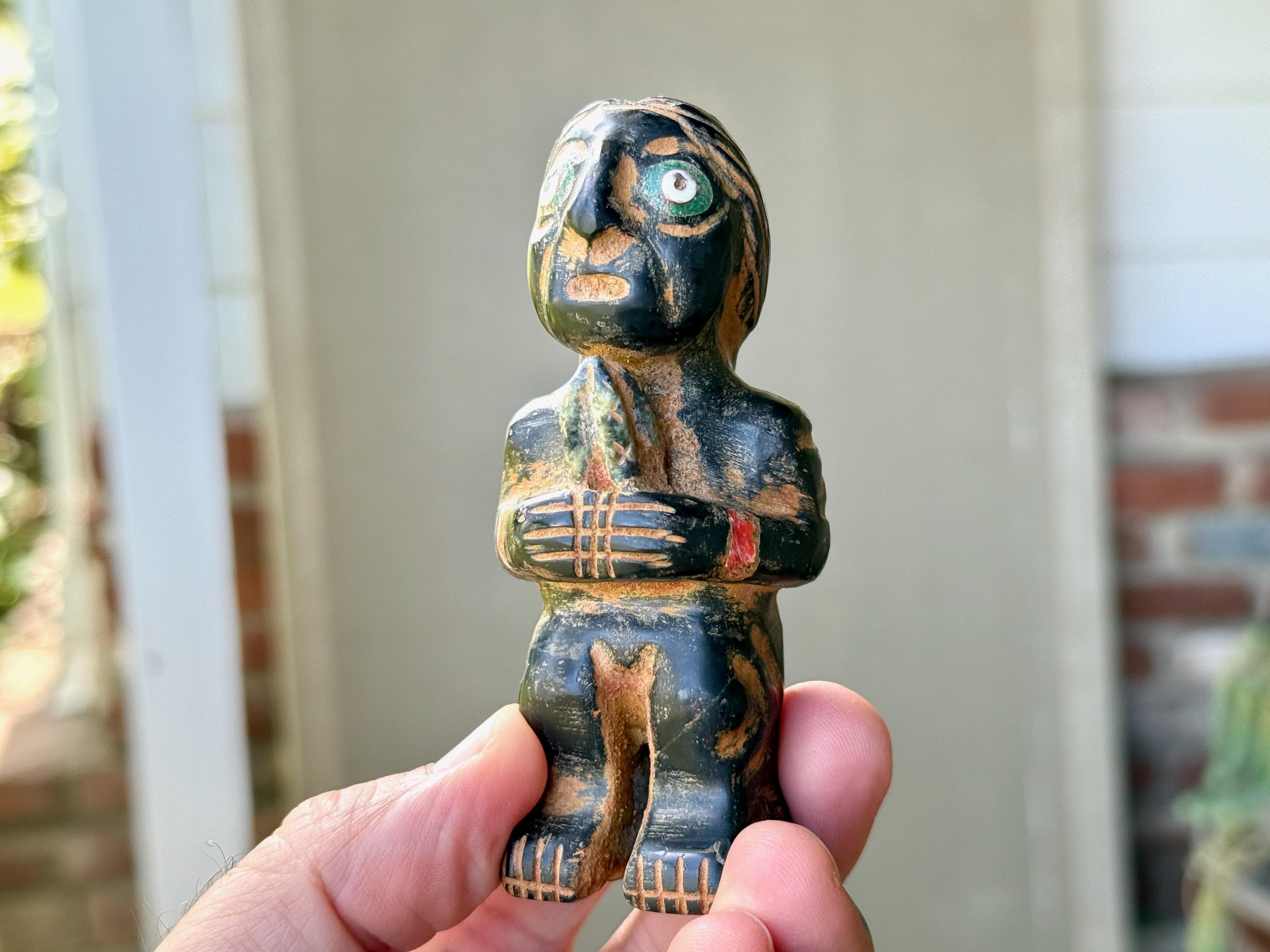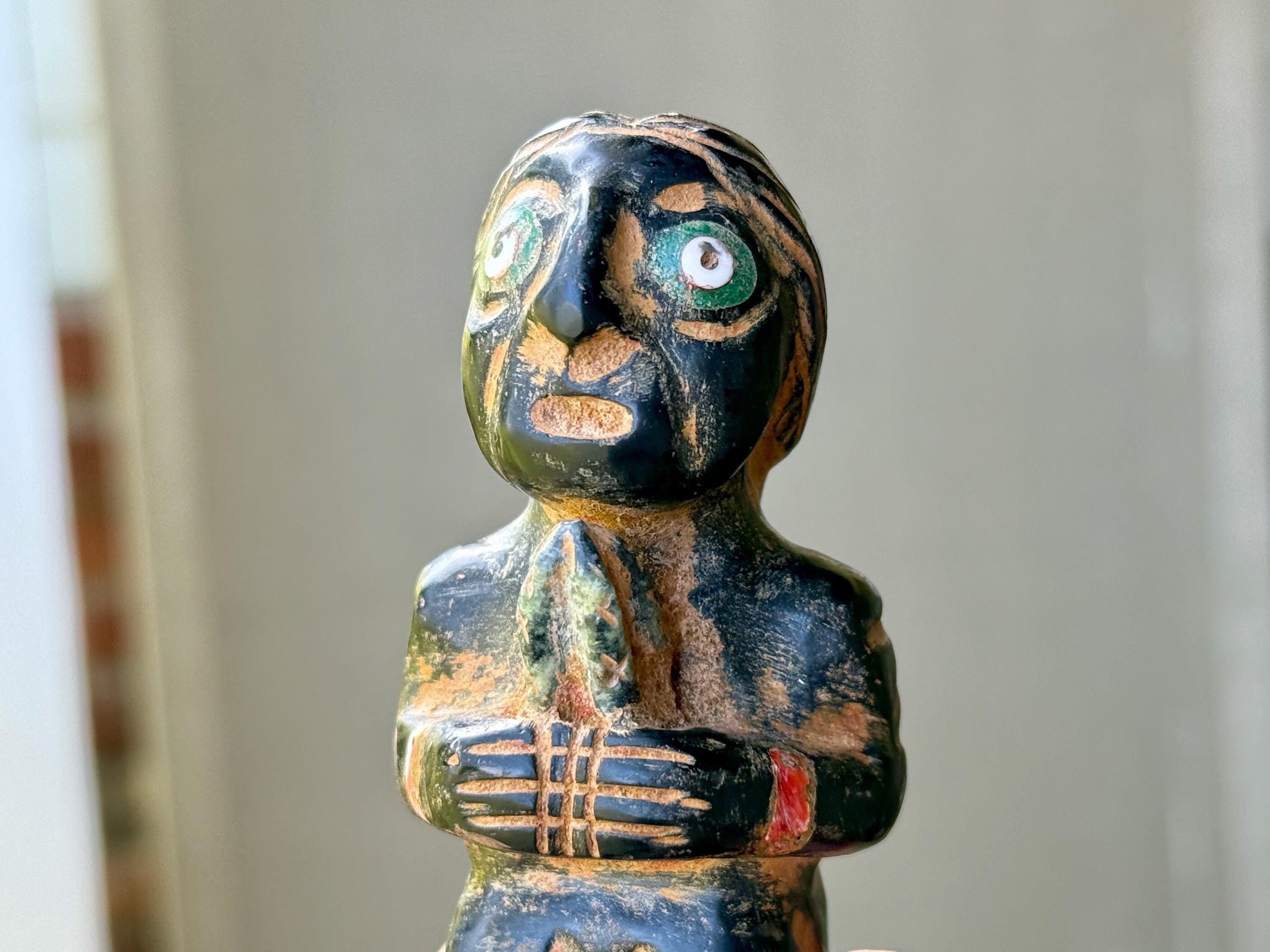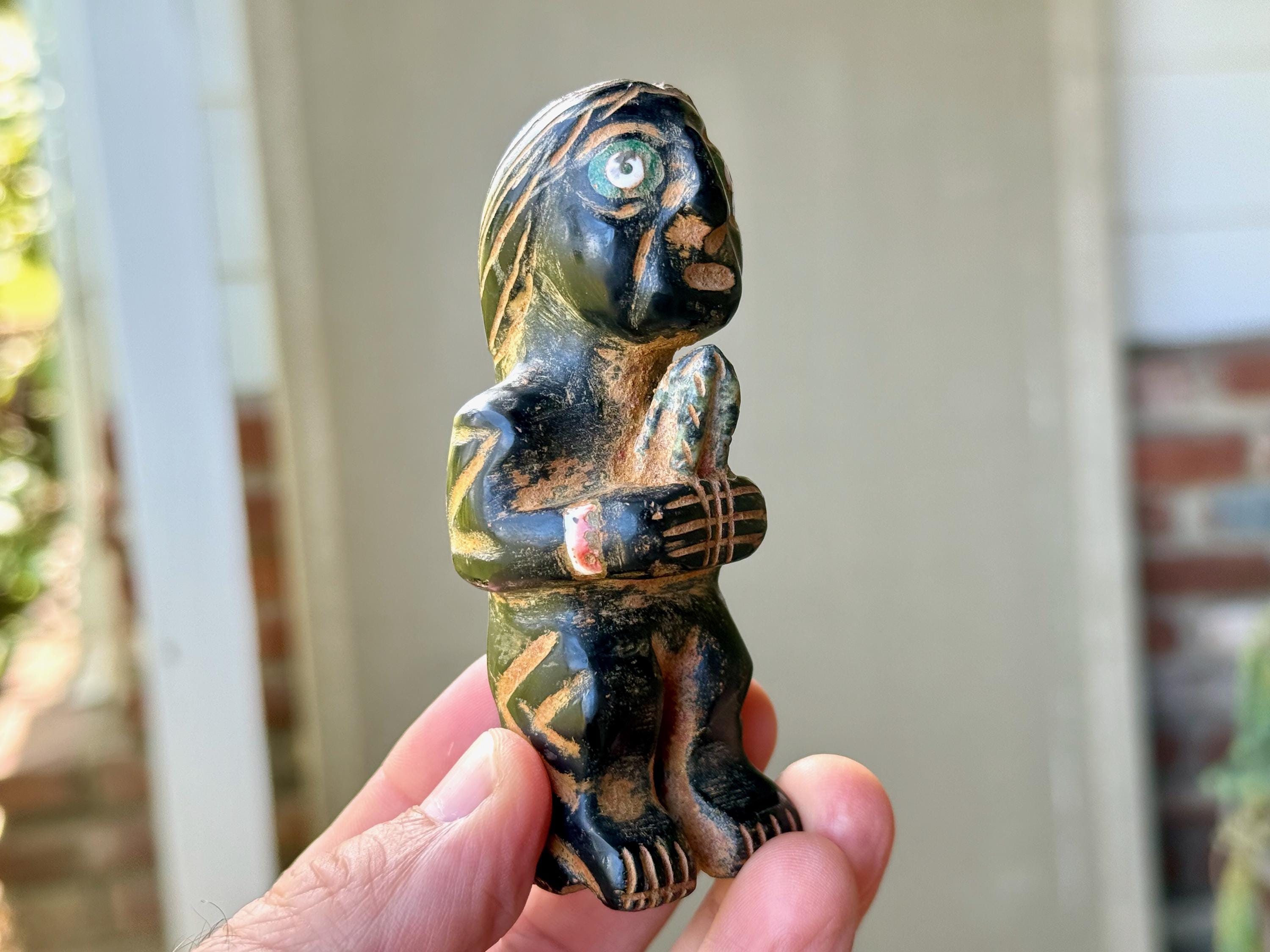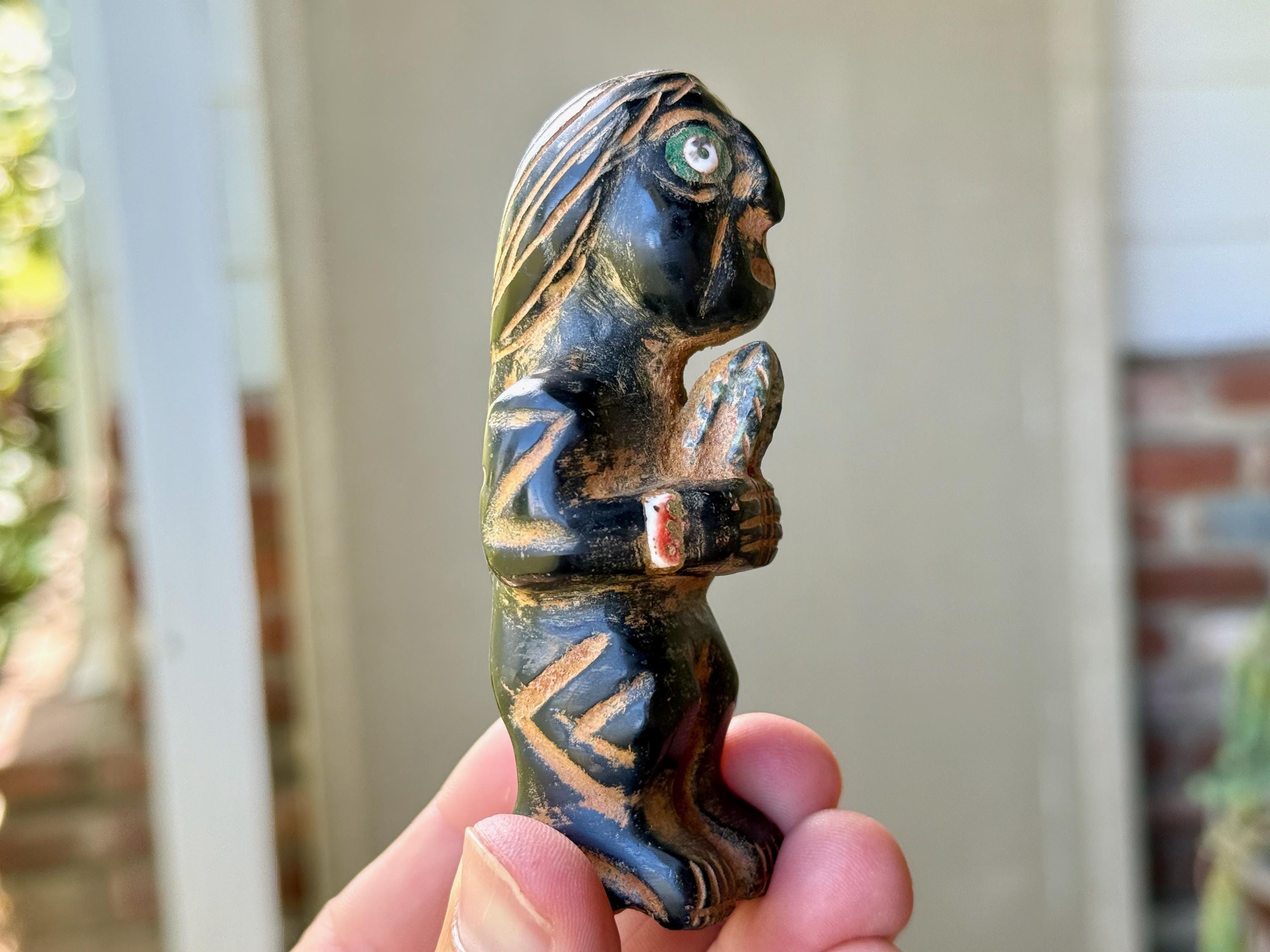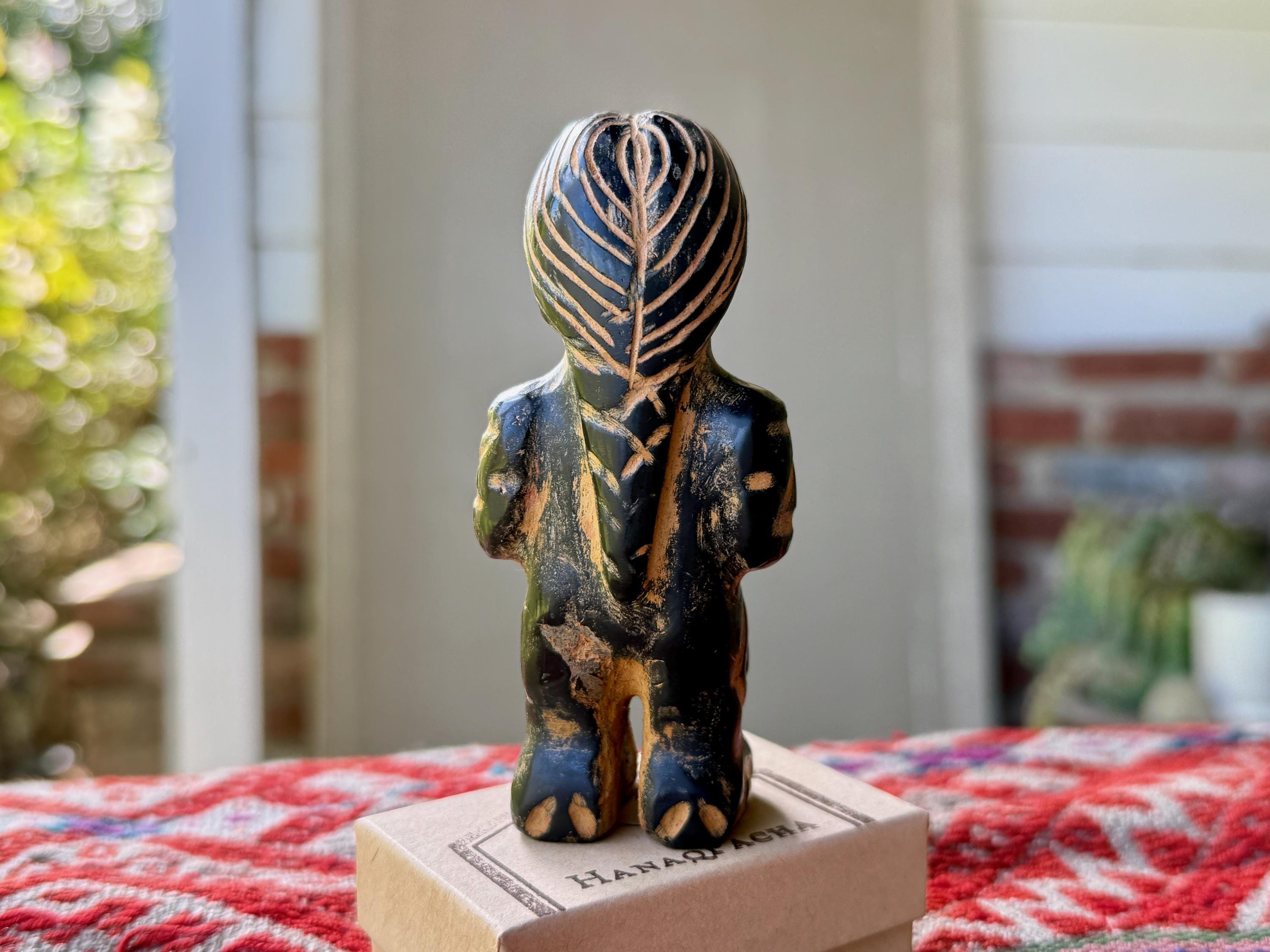 It is masterfully carved from solid Black Obsidian and weathered to perfection to give it an ancient patina. She is holding a "Grandfather" cactus, carved from Serpentine stone. It is a charming and magical characterization, she really comes to life in the details here. This statue stands perfectly upright on its own natural base and would make a powerful statement piece for home, meditation room or plant medicine altar.