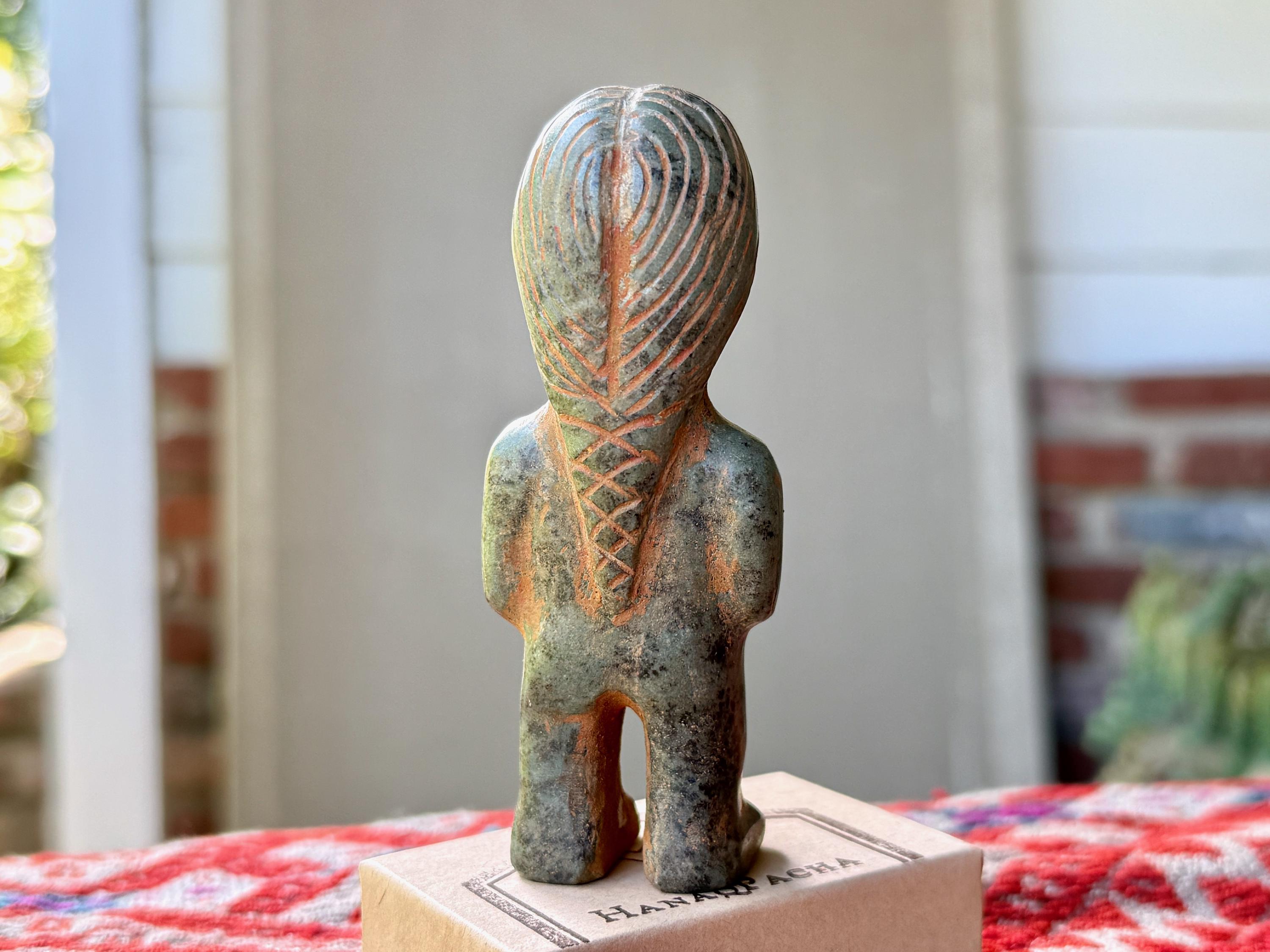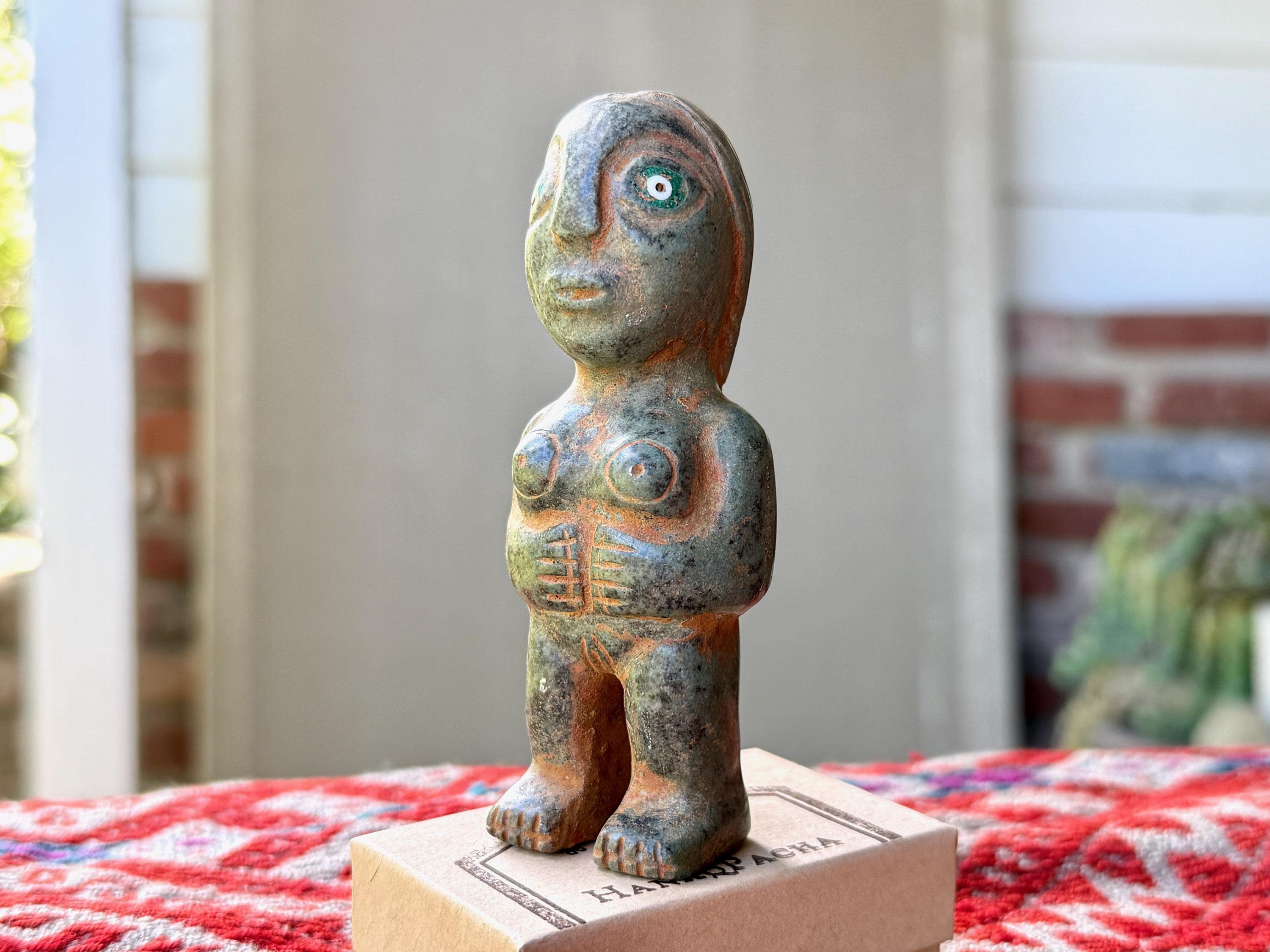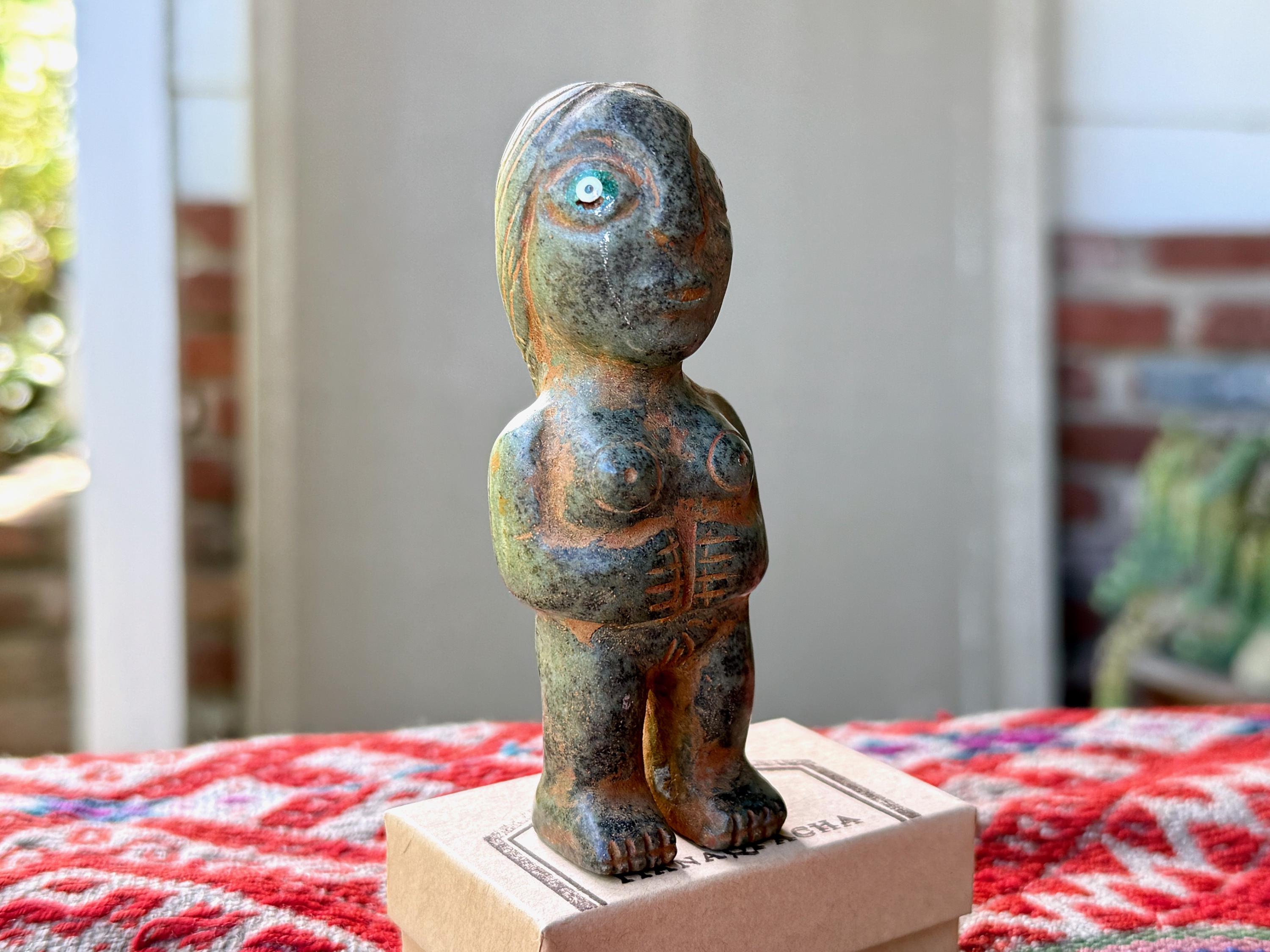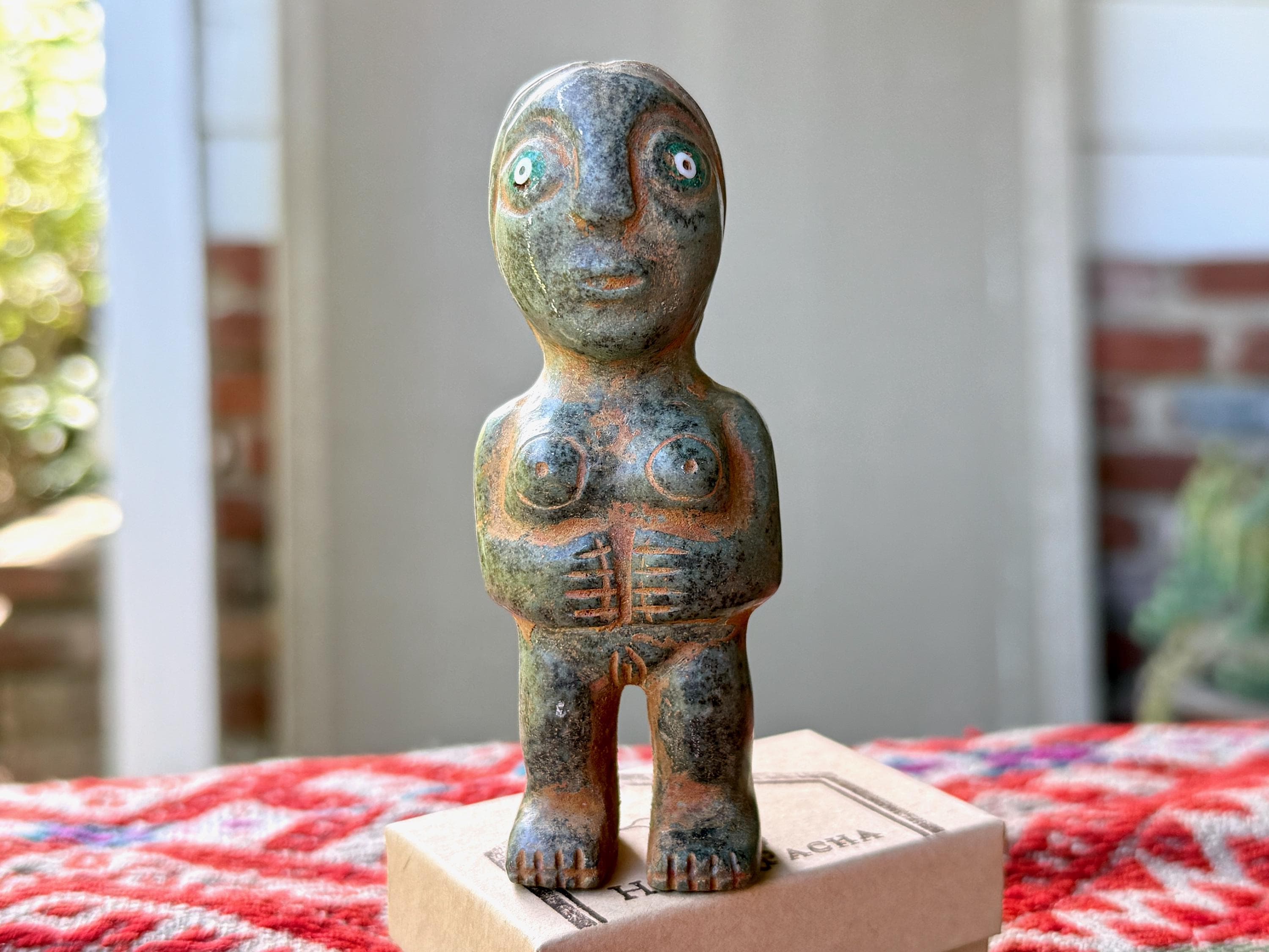 It is masterfully carved from solid native stone, found in the area around Apu Ausungate in Peru's Sacred Valley, and weathered to perfection to give it an ancient patina. It is a charming and magical characterization, she really comes to life in the details here. This statue stands perfectly upright on its own natural base and would make a powerful statement piece for home, meditation room or plant medicine altar.