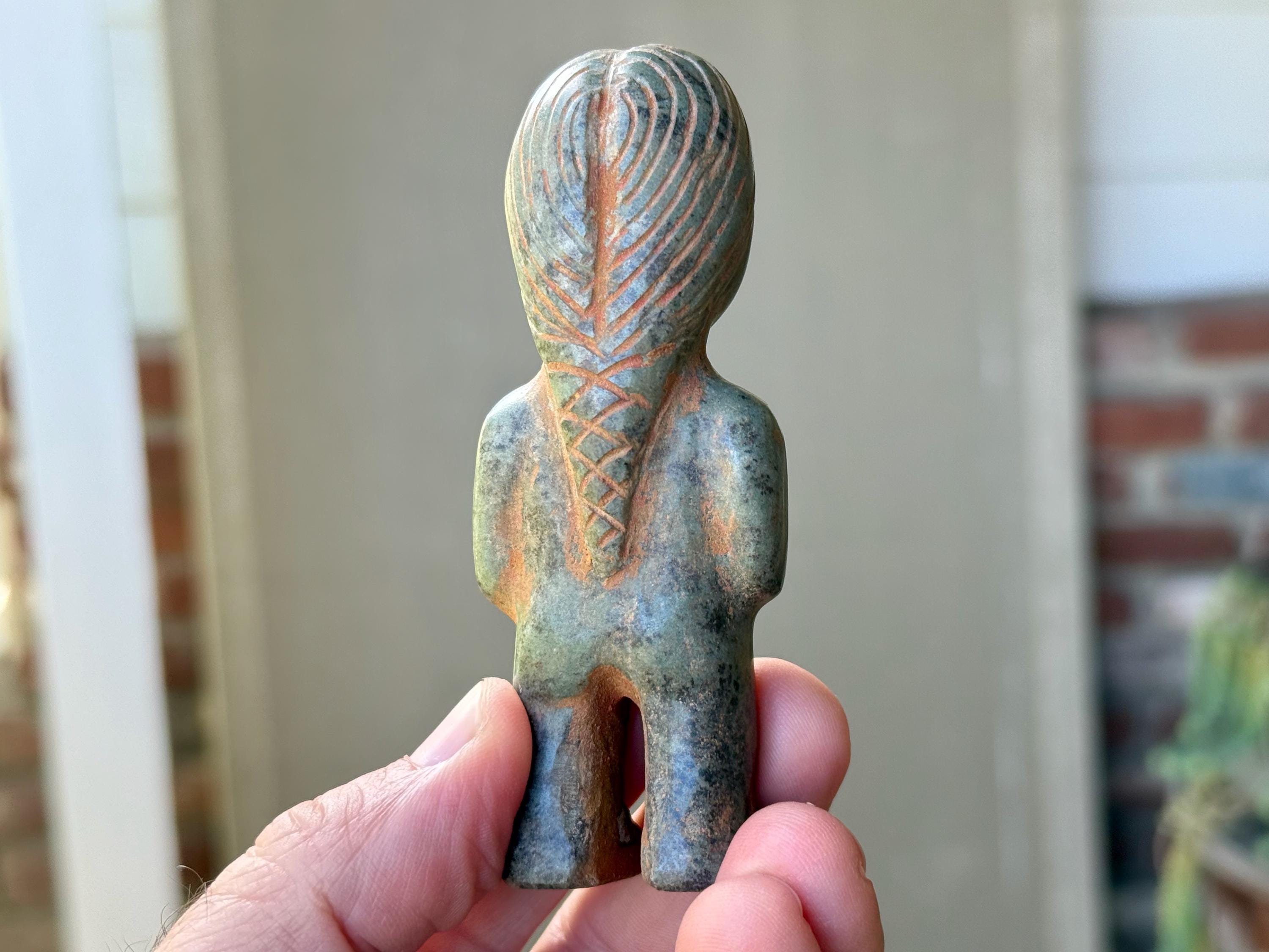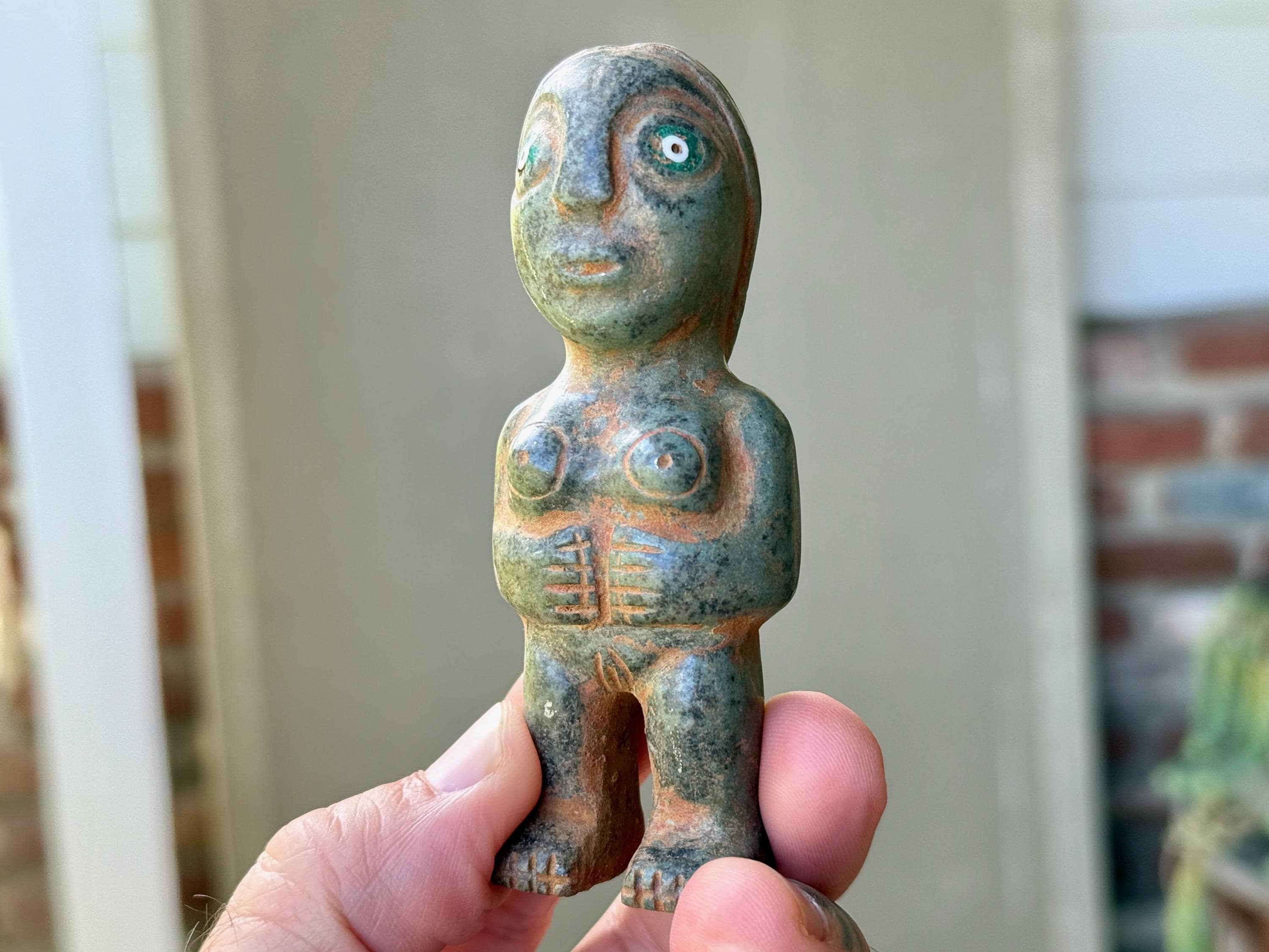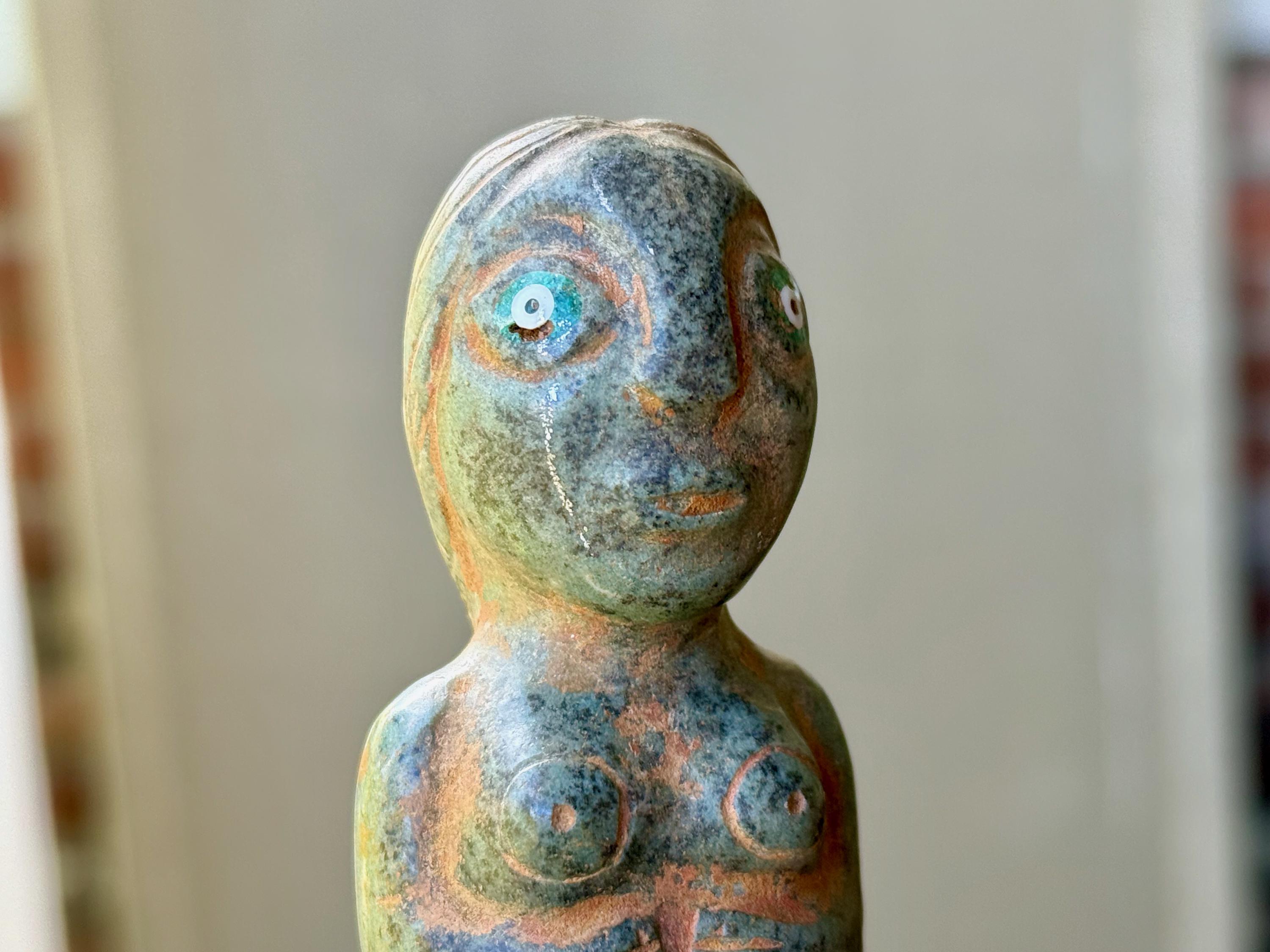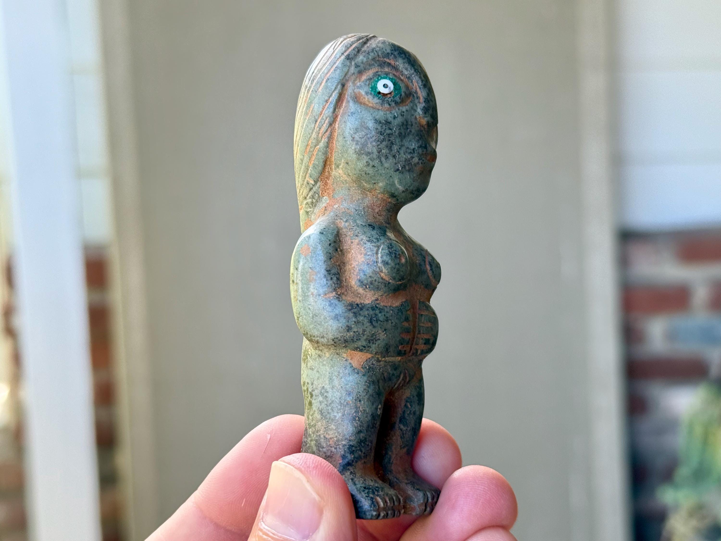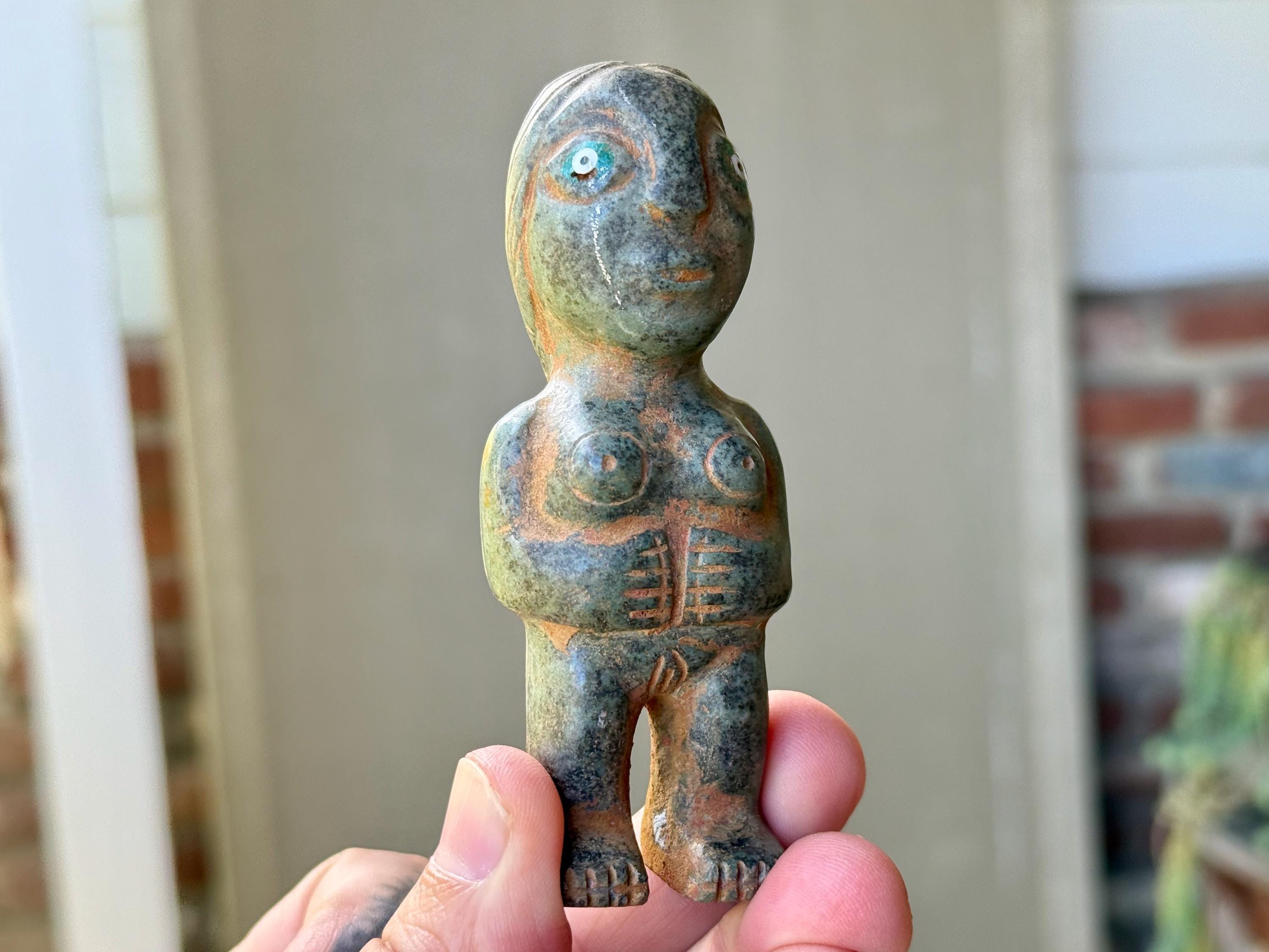 It is masterfully carved from solid native stone, found in the area around Apu Ausungate in Peru's Sacred Valley, and weathered to perfection to give it an ancient patina. It is a charming and magical characterization, she really comes to life in the details here. This statue stands perfectly upright on its own natural base and would make a powerful statement piece for home, meditation room or plant medicine altar.