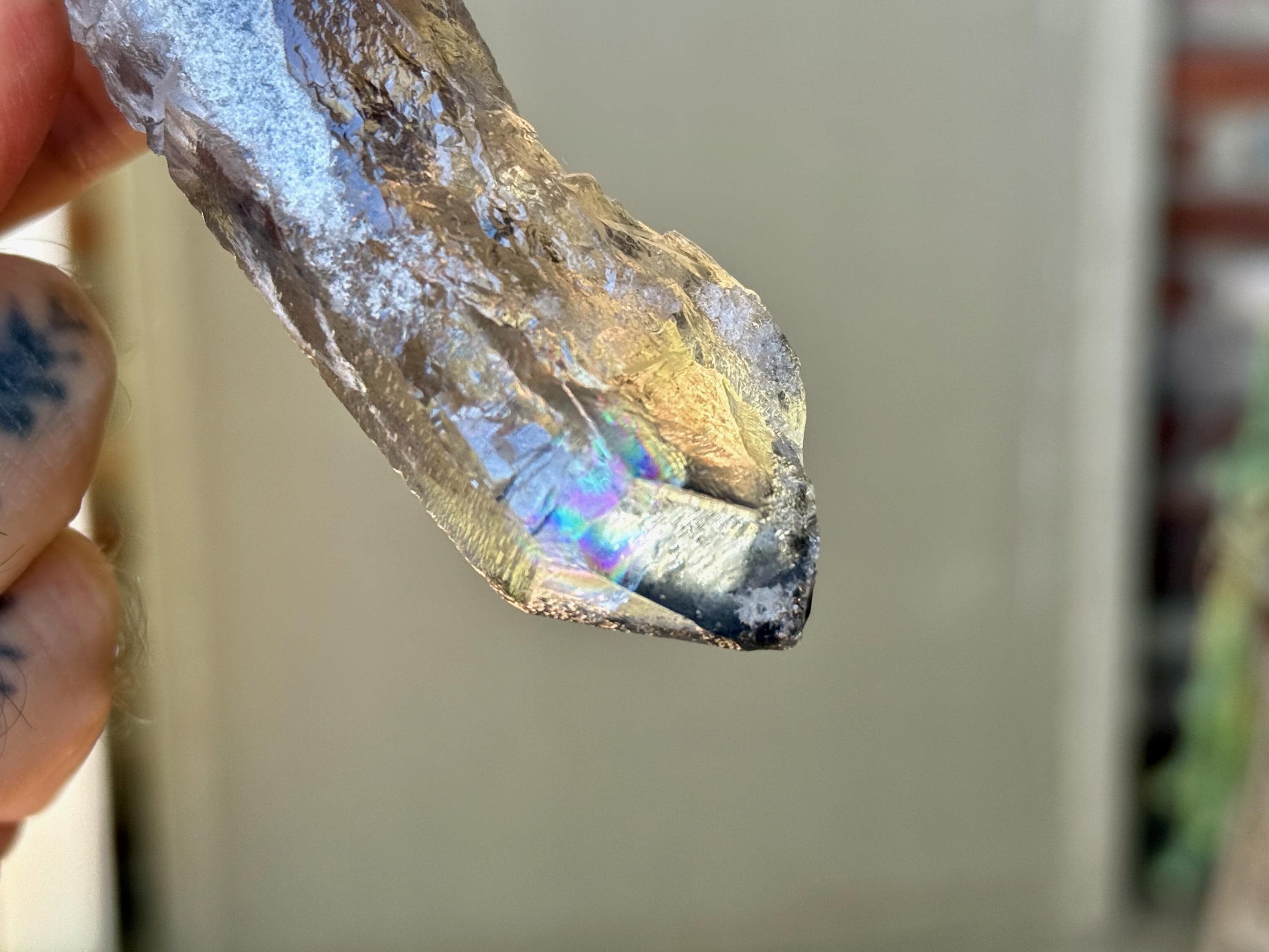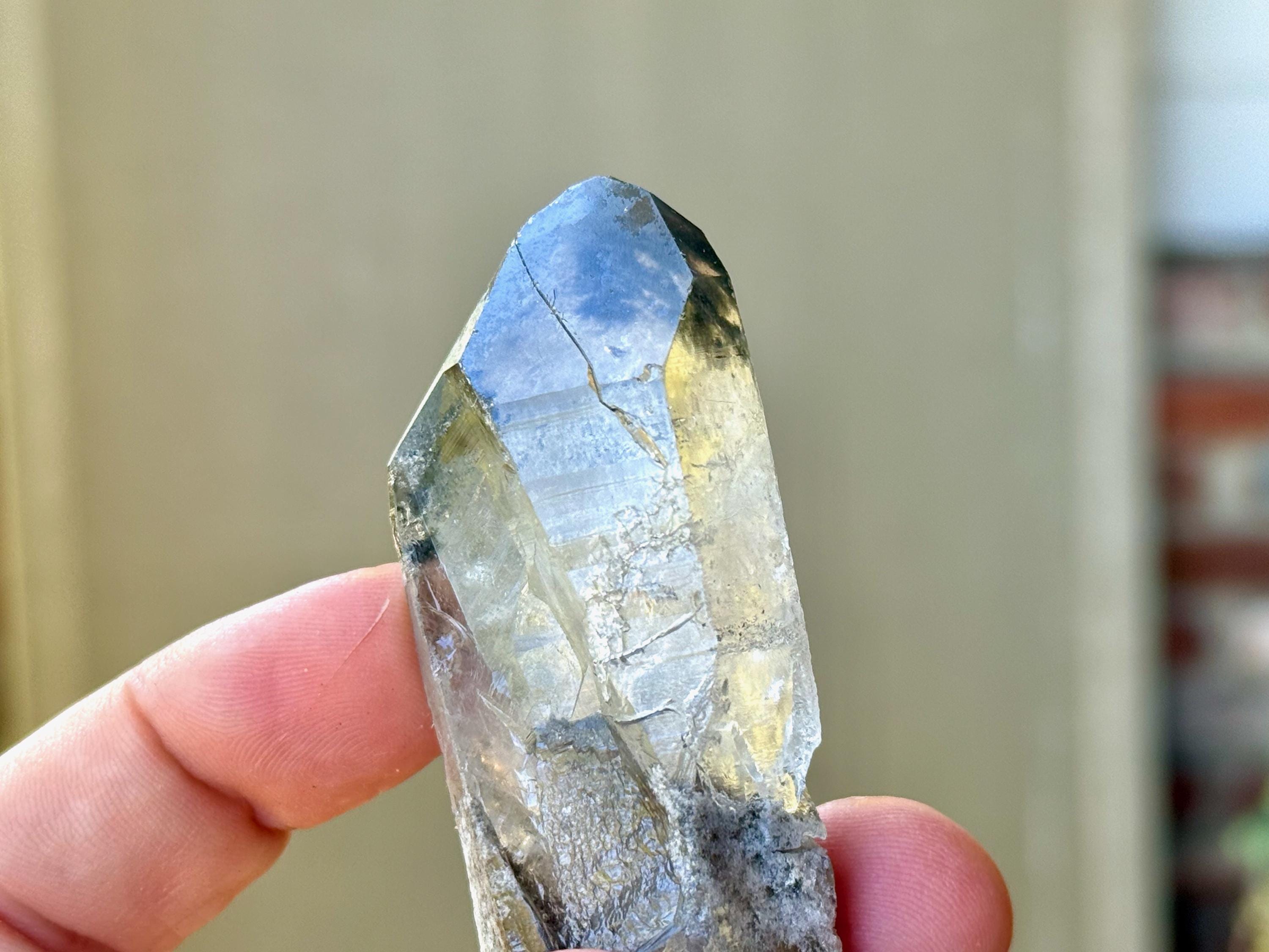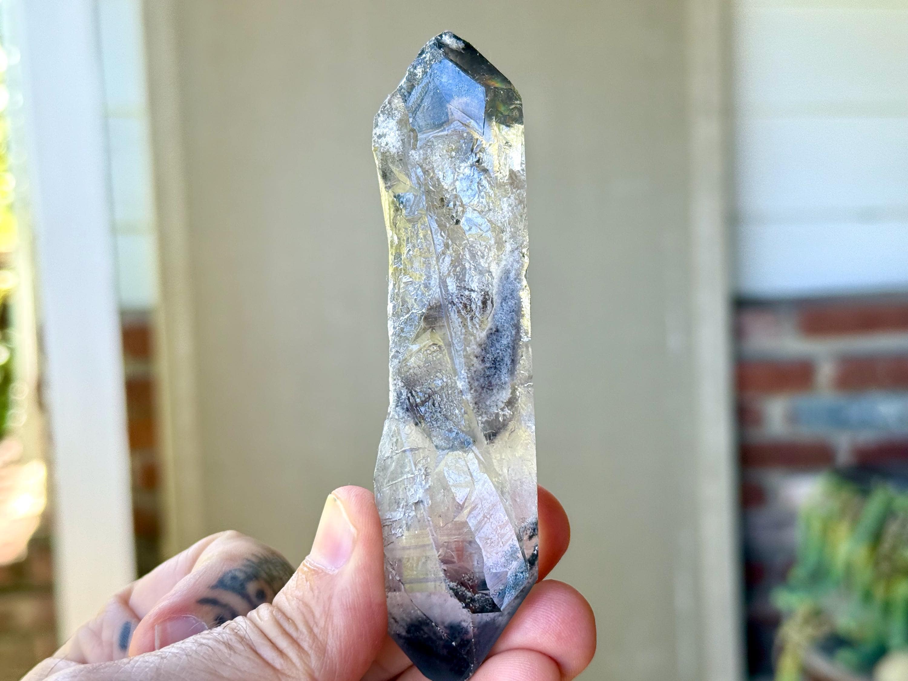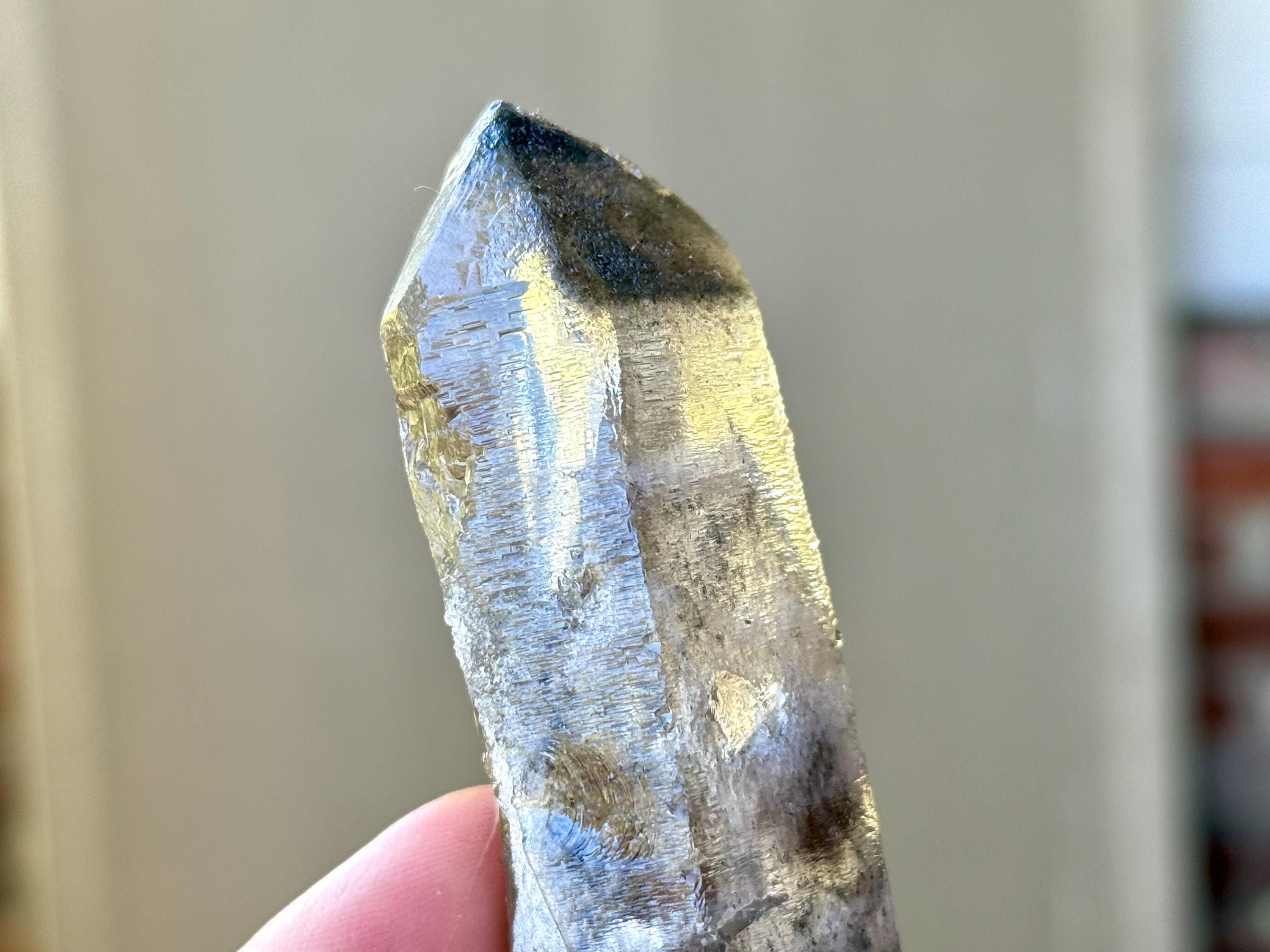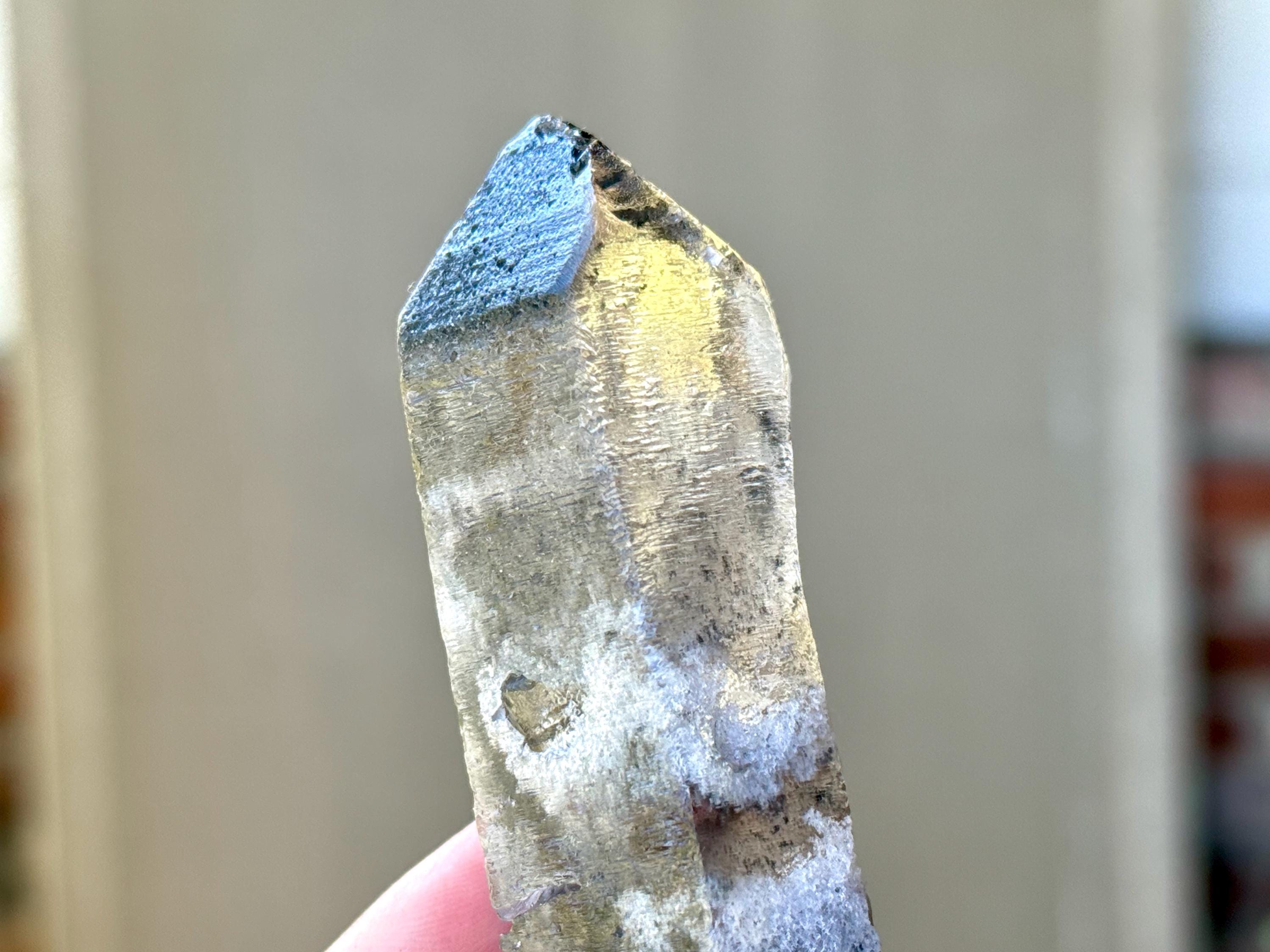 This piece has a subtly "rounded" and "smoothed" feel around the edges of its body, due to the hydrothermal nature of its "birth." This is entirely natural and very unique! There is a deep contact "key" imprint on its body that runs nearly the length, diagonally, of the crystal. This crystal is beautifully Double Terminated, and at one end you'll find a vibrant rainbow inclusion (Photo 4).