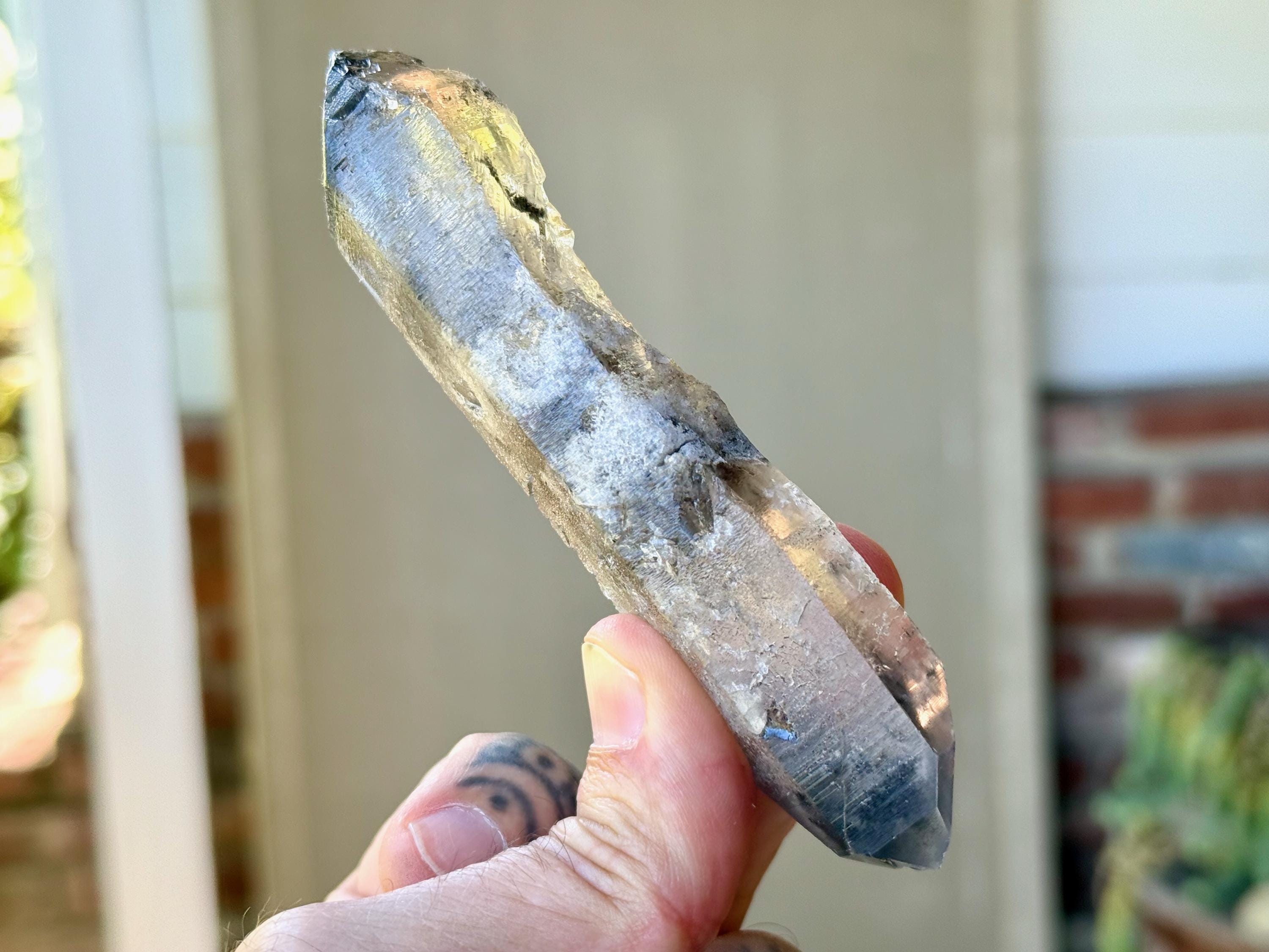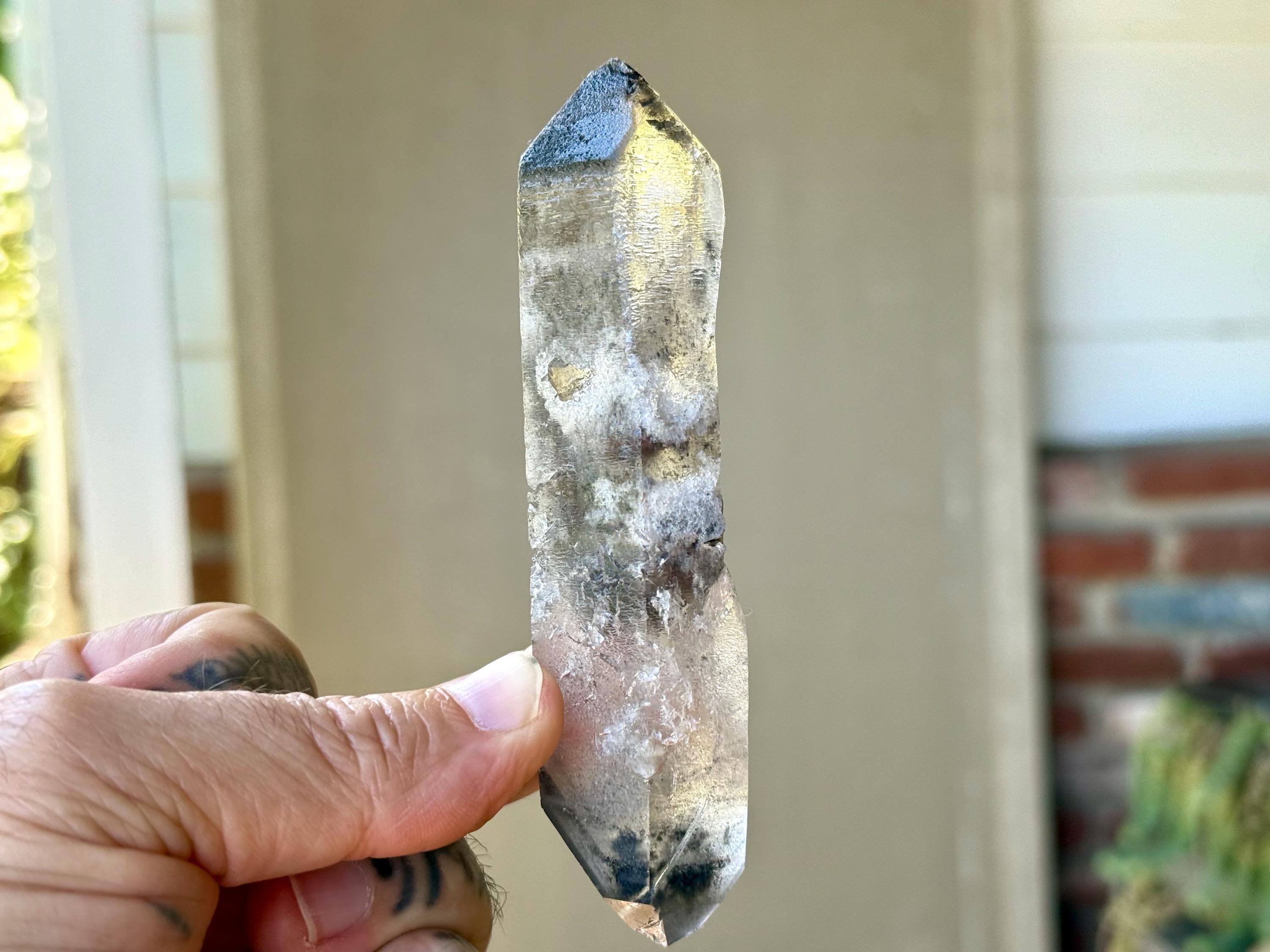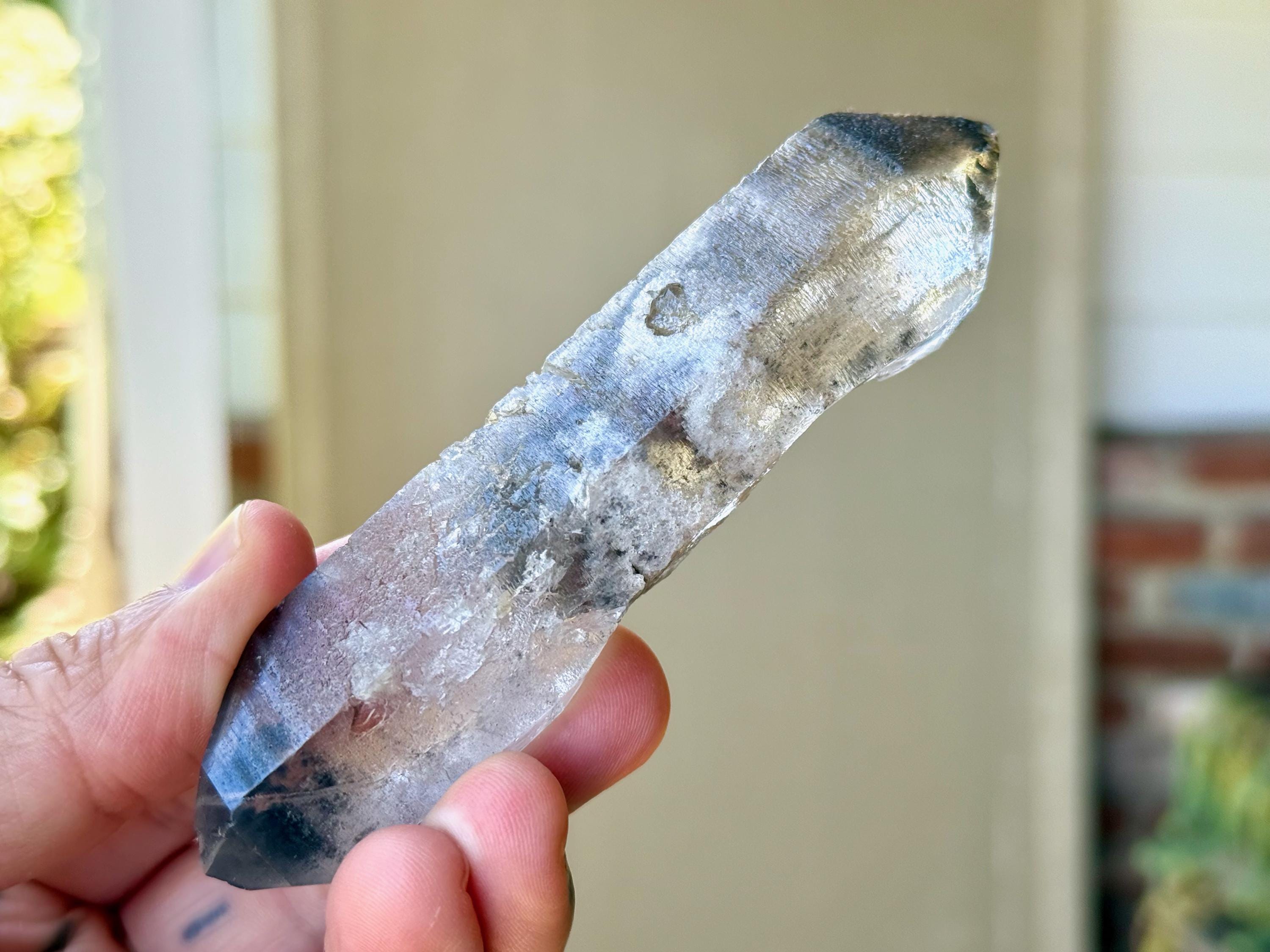 Such a handsome and powerful formation to this elongated Black Phantom Lemurian Dissolution Quartz crystal with mildly etched hydrothermal textures on its body. This crystal has beautiful inclusions of both black Anthraxolite at the tips and frosty white Kaolinite in the center.
