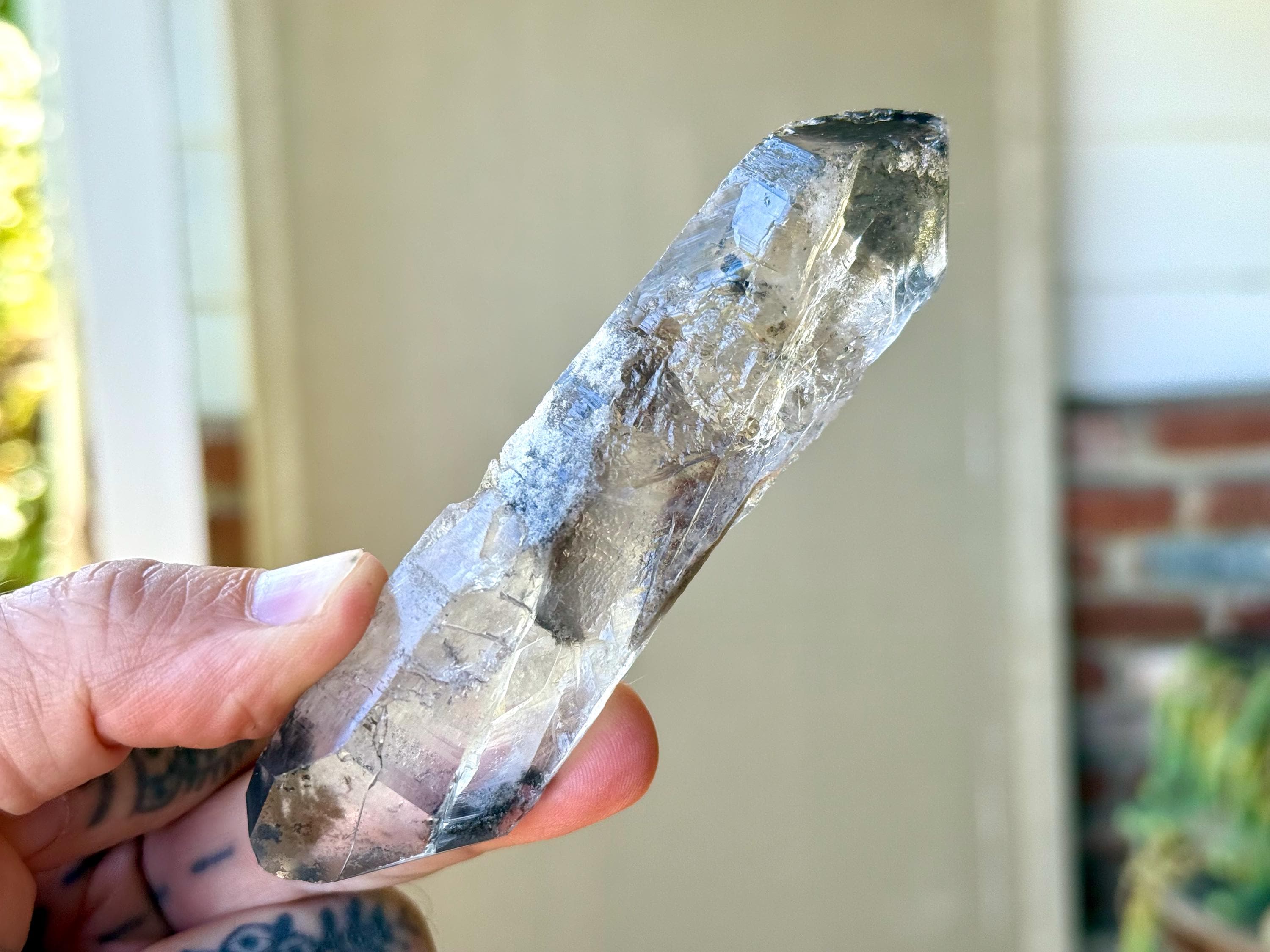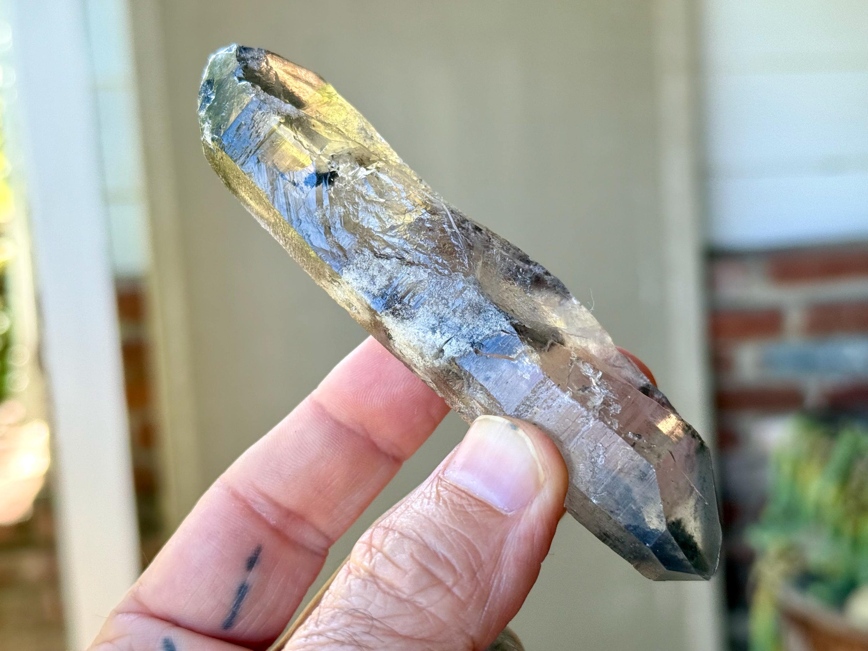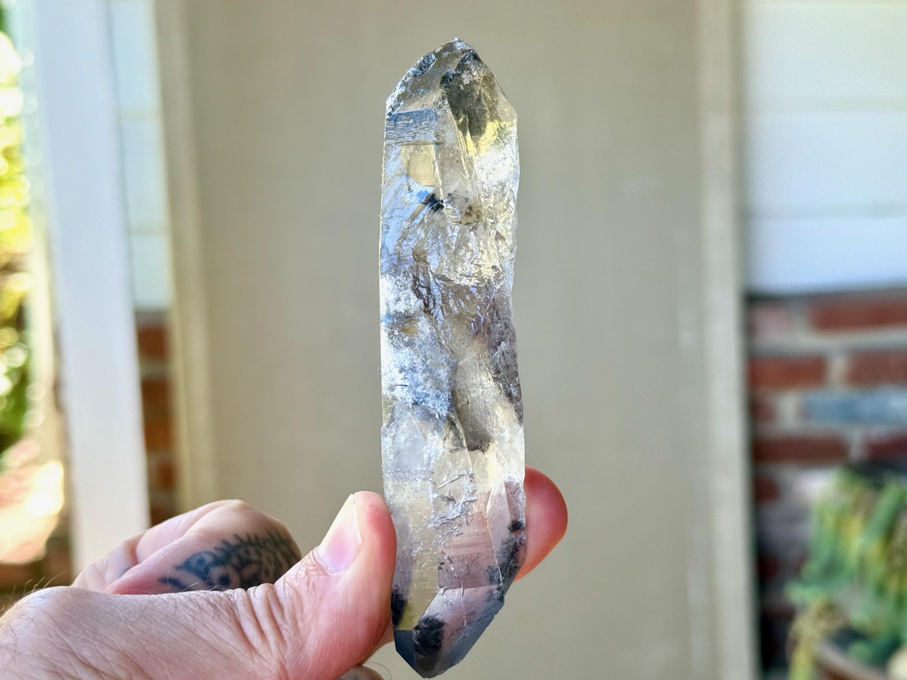 Such a handsome and powerful formation to this elongated Black Phantom Lemurian Dissolution Quartz crystal with mildly etched hydrothermal textures on its body. This crystal has beautiful inclusions of both black Anthraxolite at the tips and frosty white Kaolinite in the center.