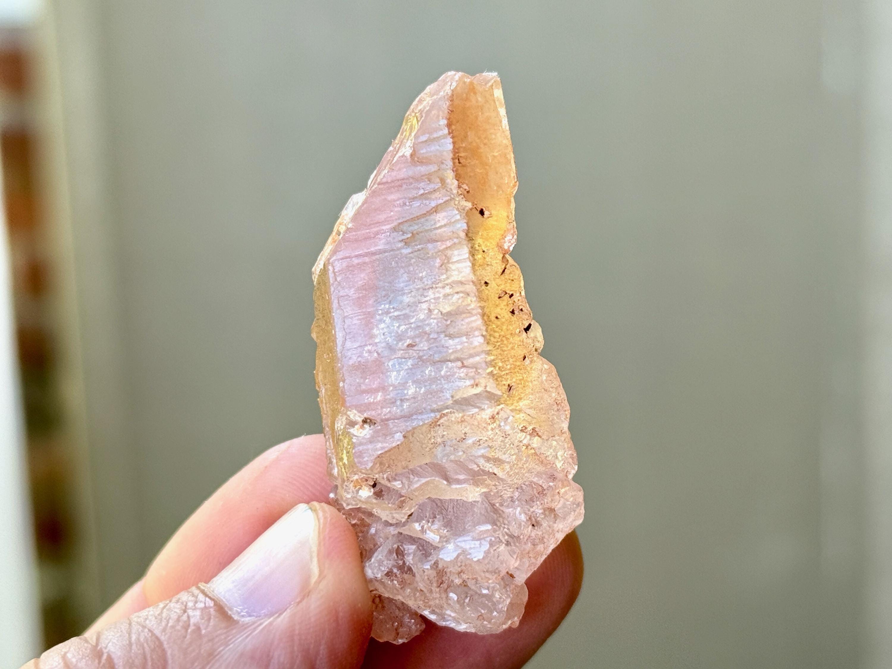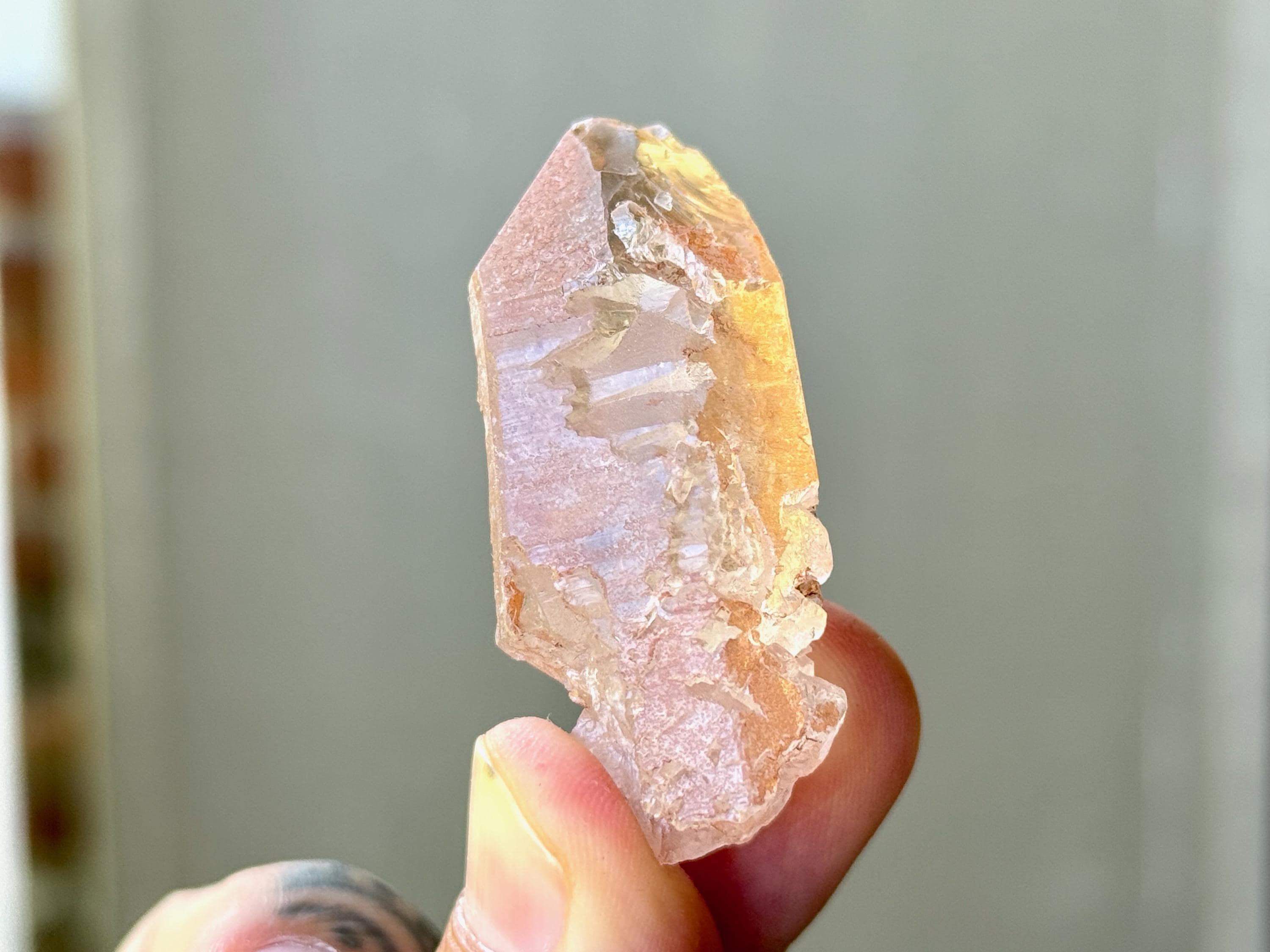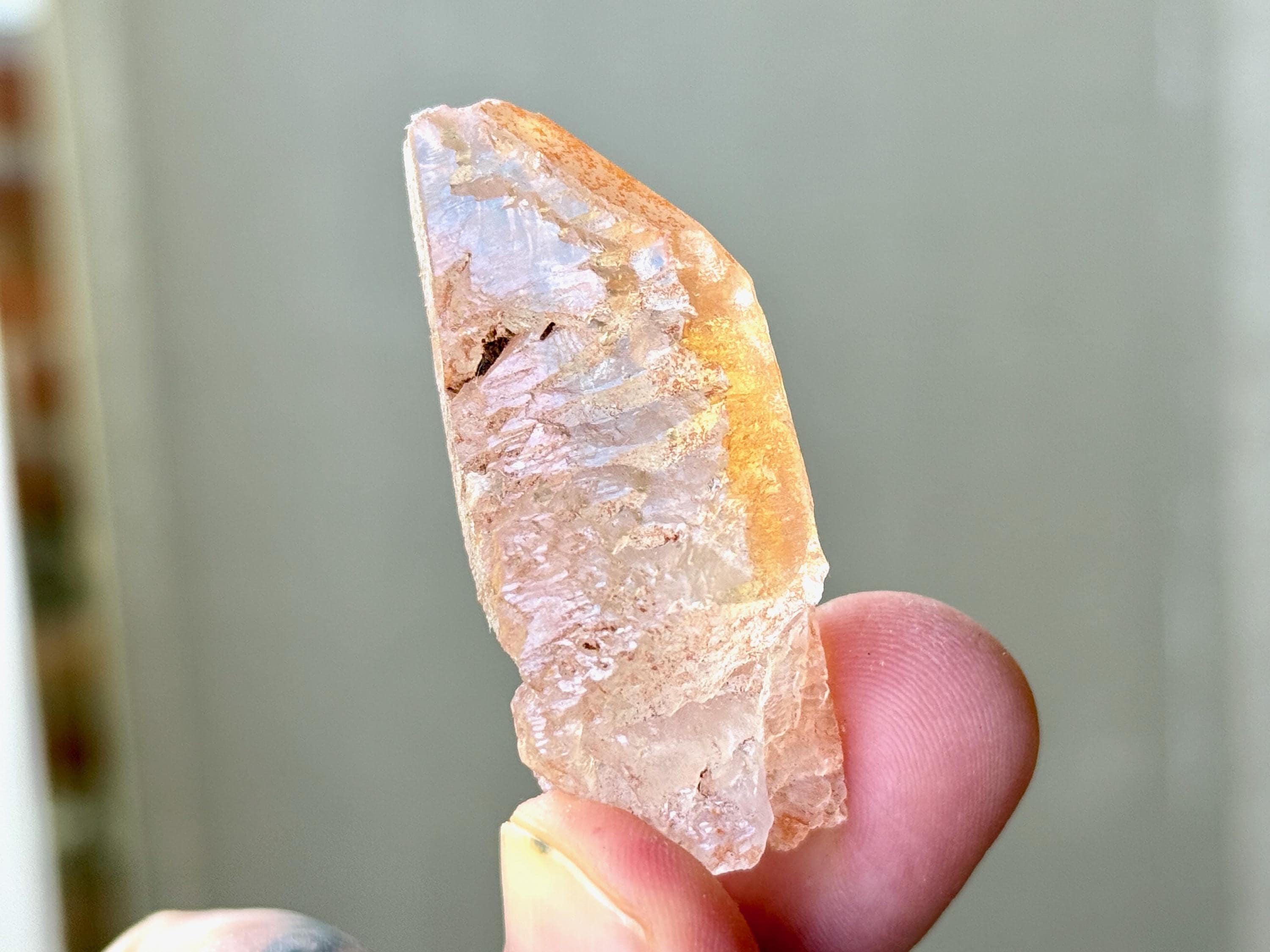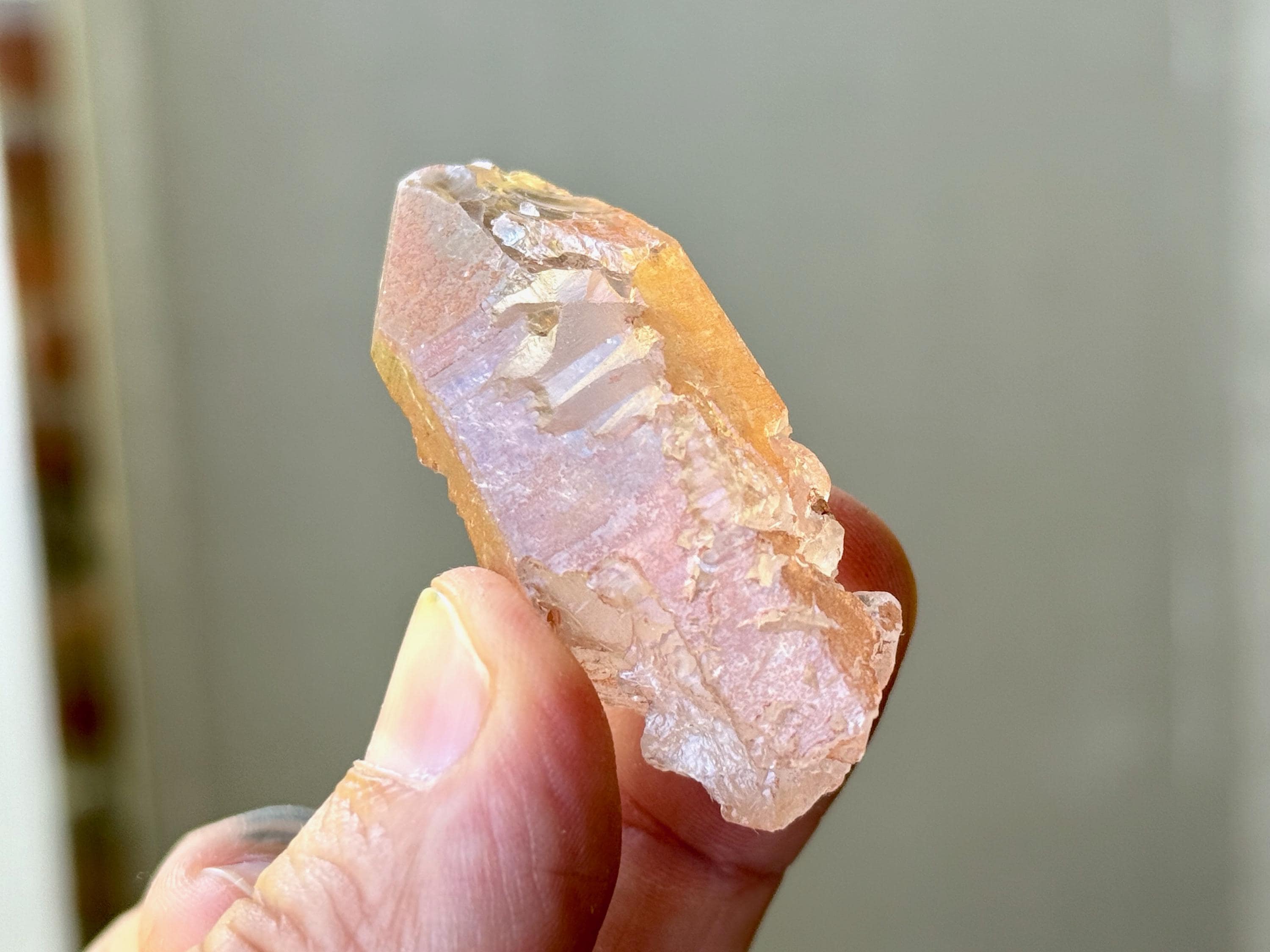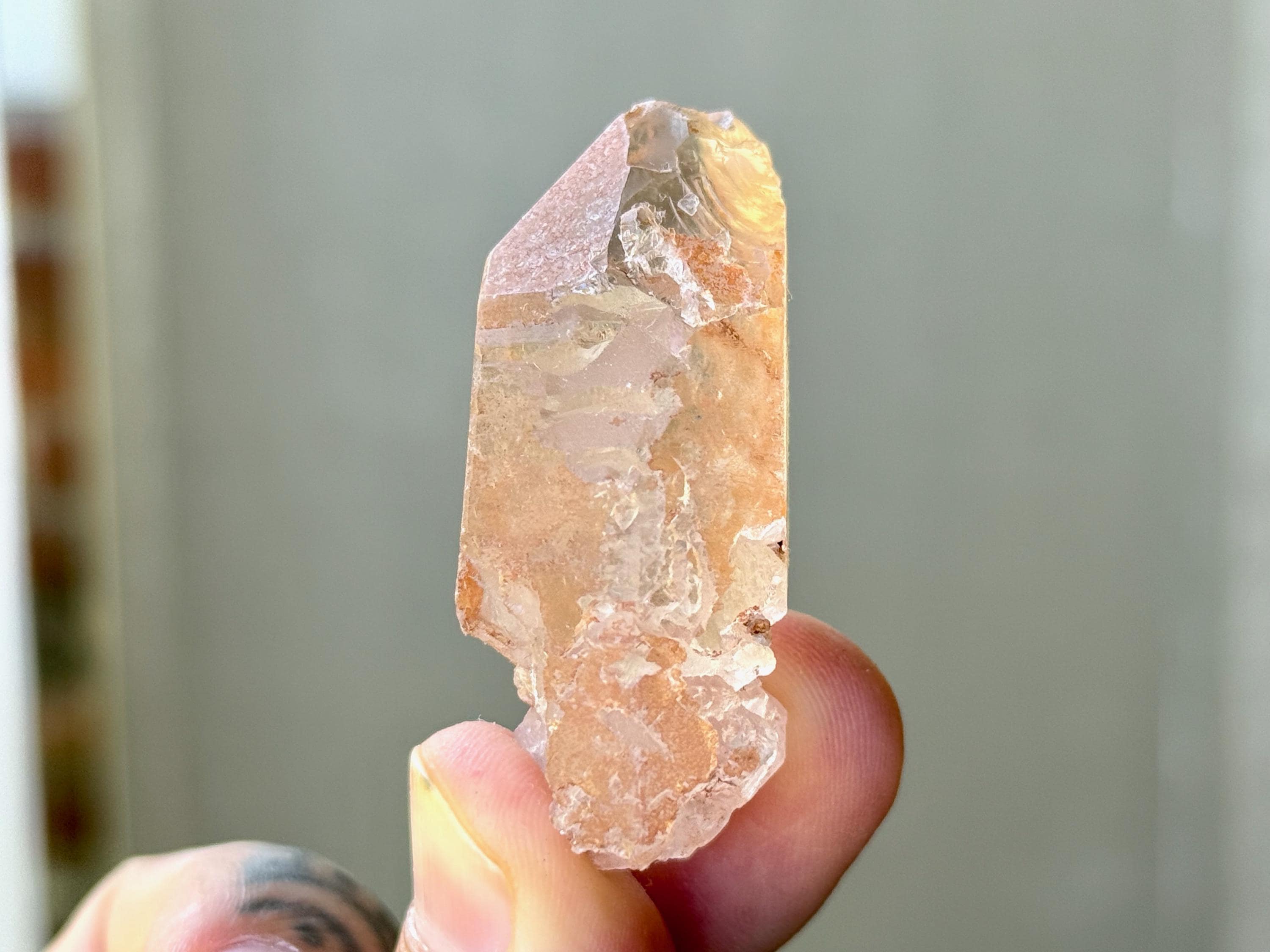 A very sweet tangerine color to this lustrous Ancient Sage Quartz with outstanding clarity and a multitude of hydrothermally etched textures covering its sides.