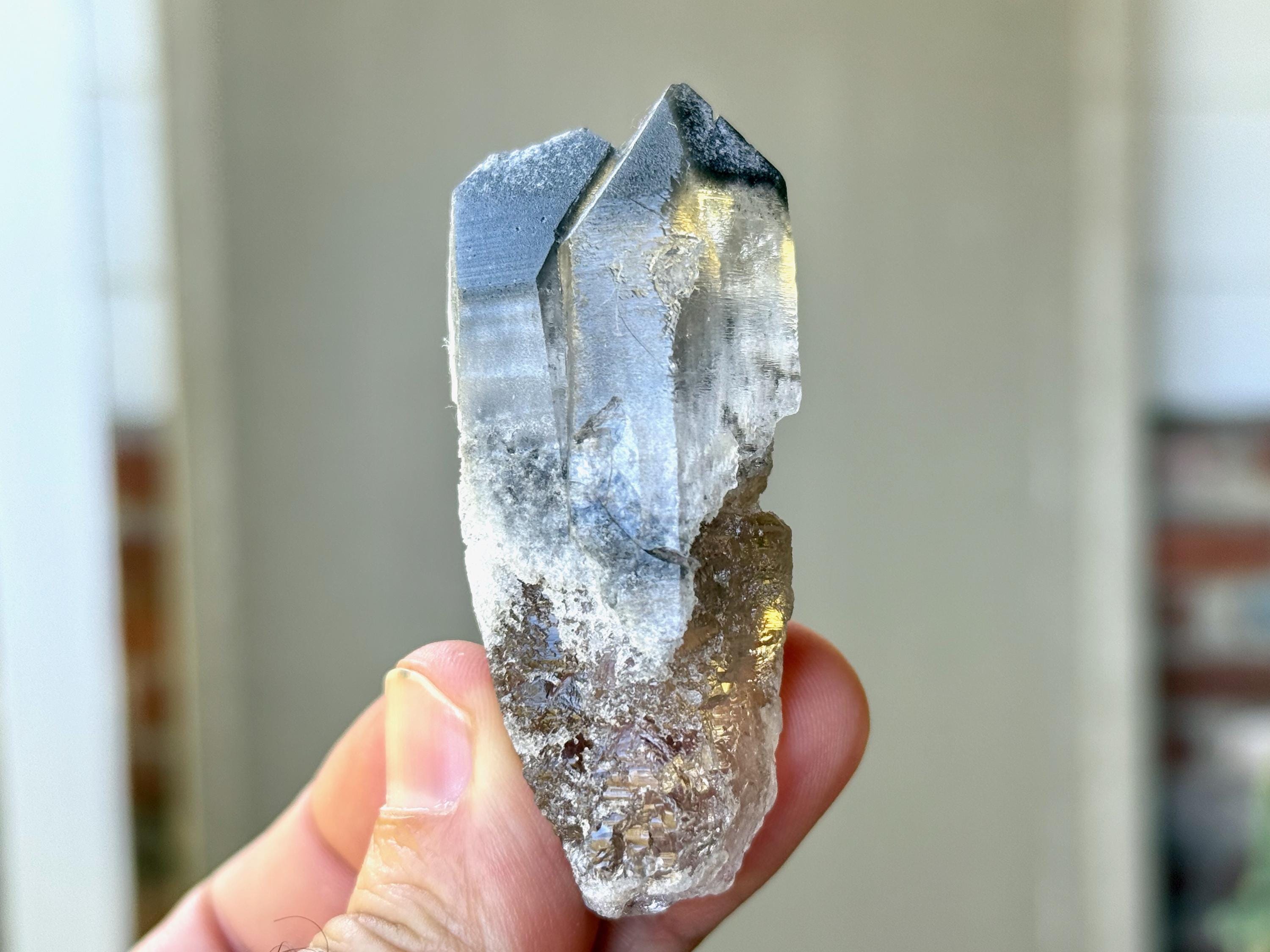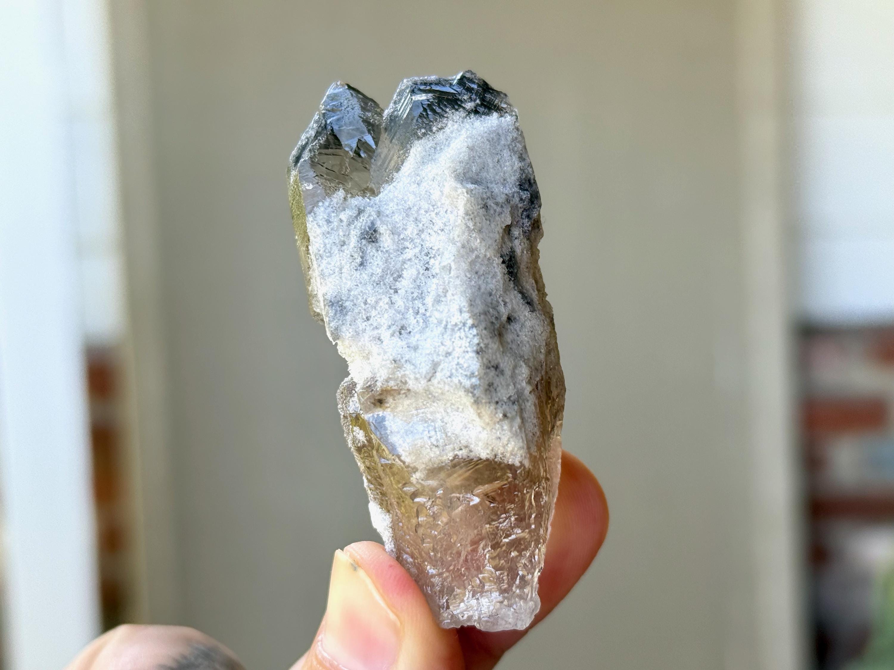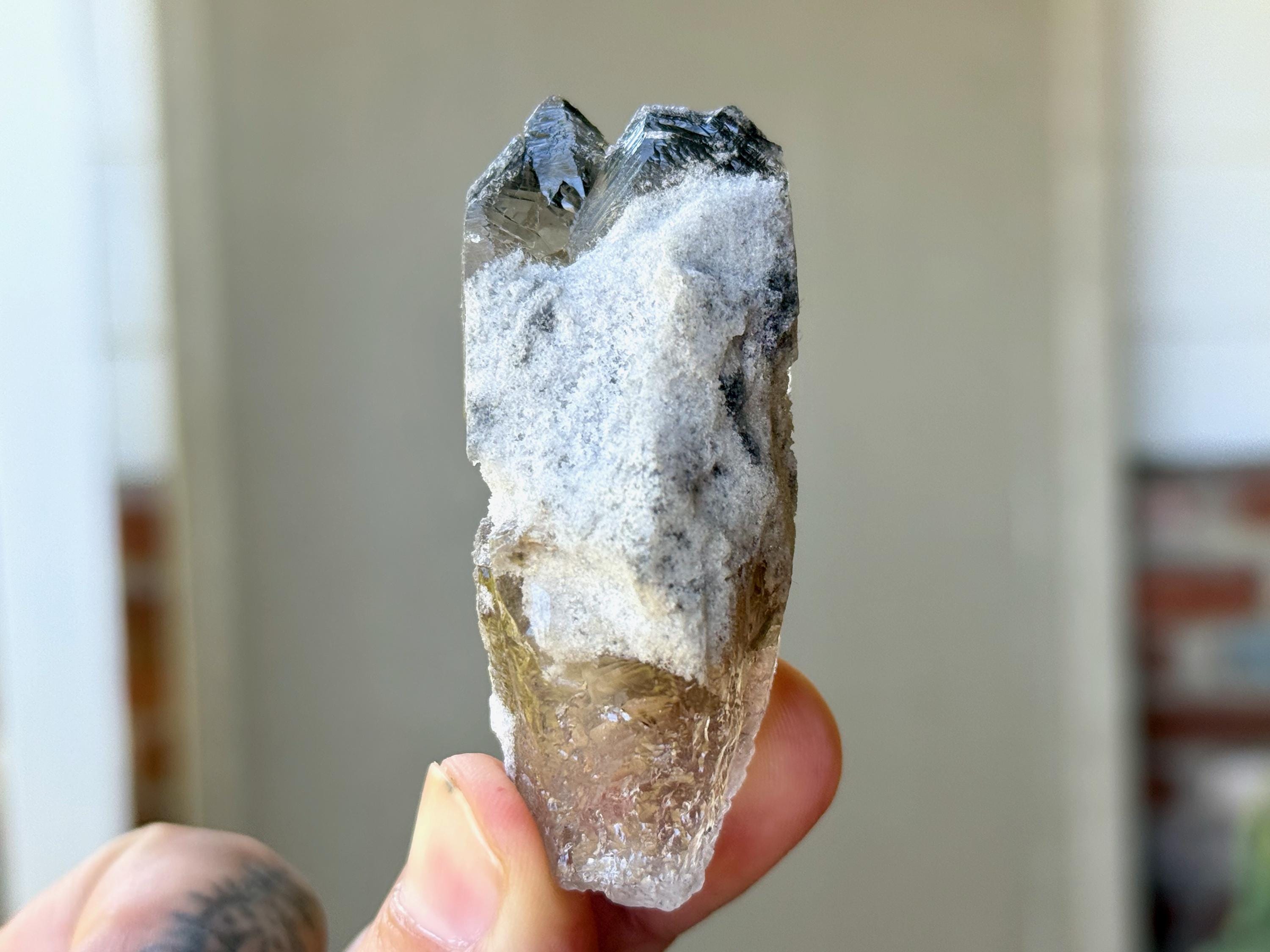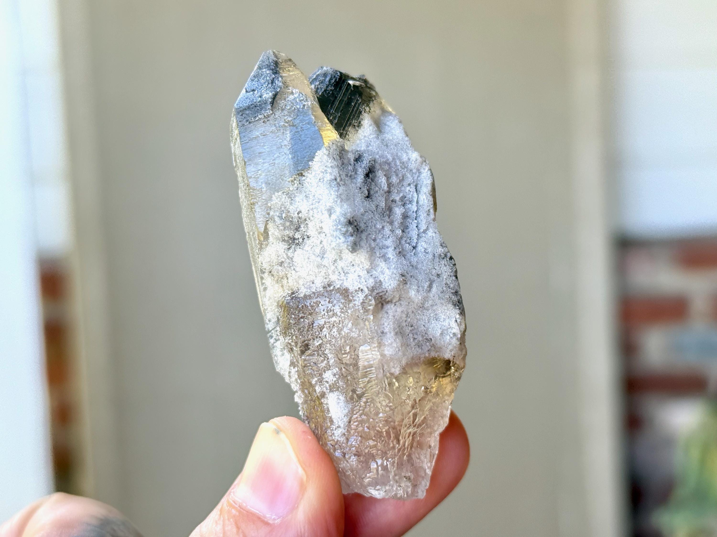 Gorgeous textures and hydrothermally etched imprints to this lustrous Black Phantom Lemurian in a perfect Tantric Twin formation. You'll notice this crystal has slightly "rounded" or "soft" edges, the result of its hydrothermal nature. We love the dense black inclusions of Anthraxolite at the top and the frosty white Kaolinite in the midsection. Great terminations as well to this one.