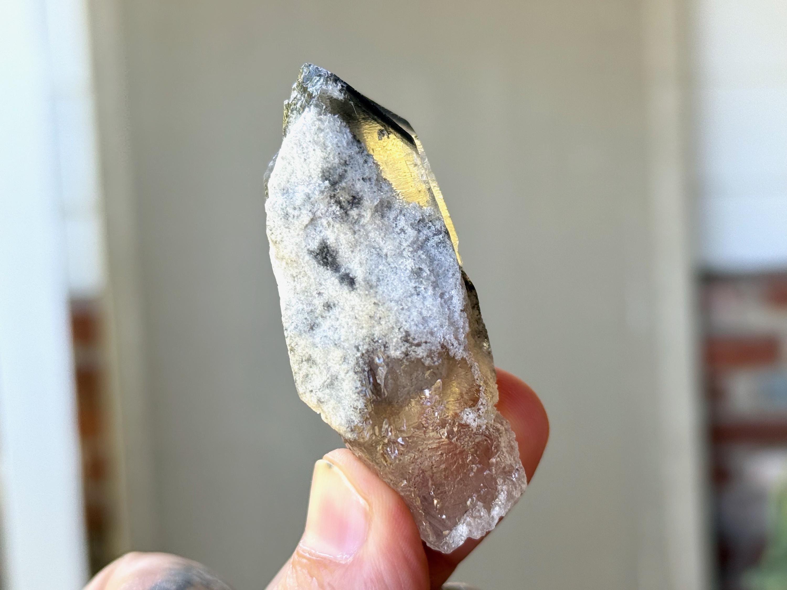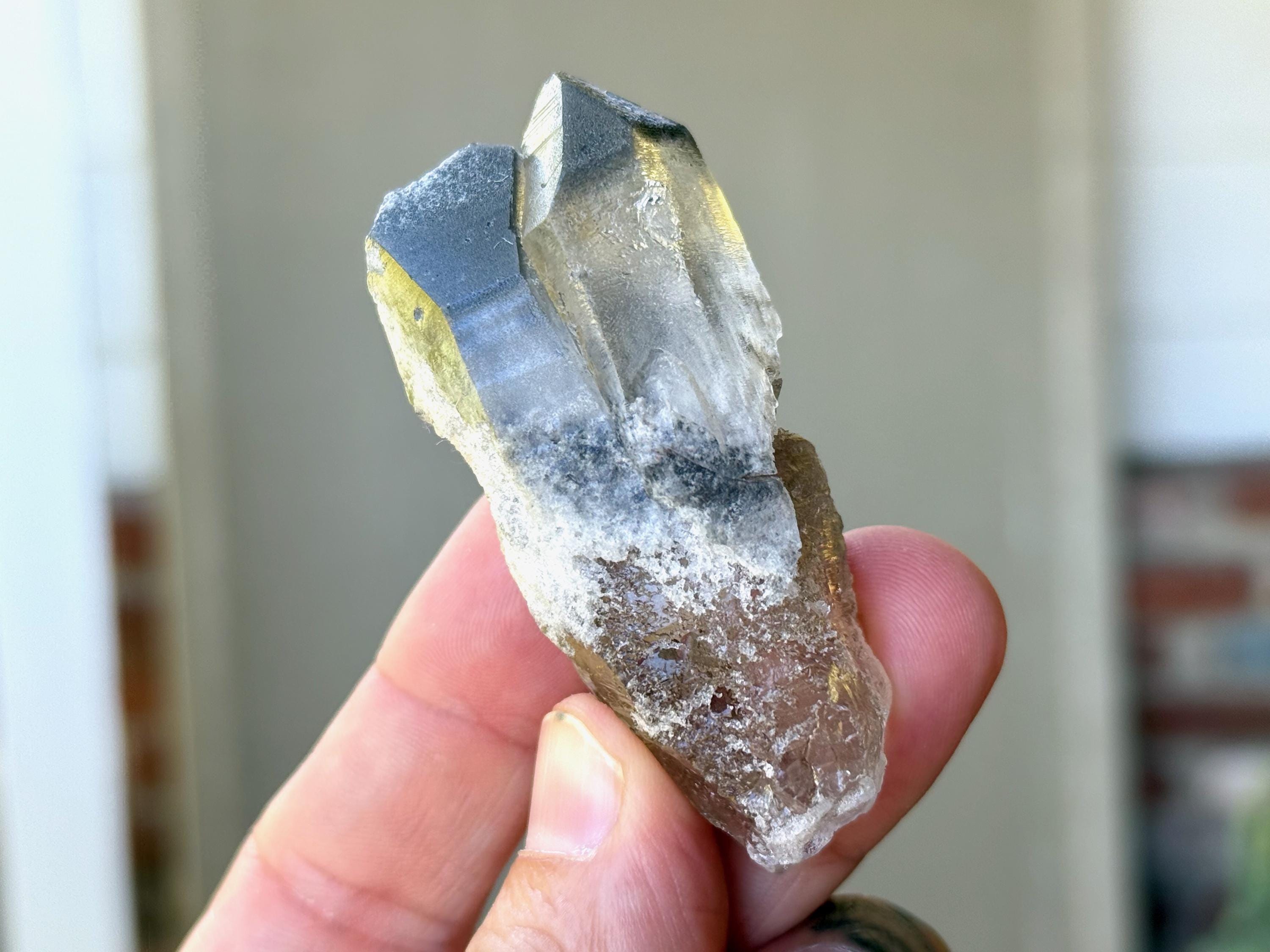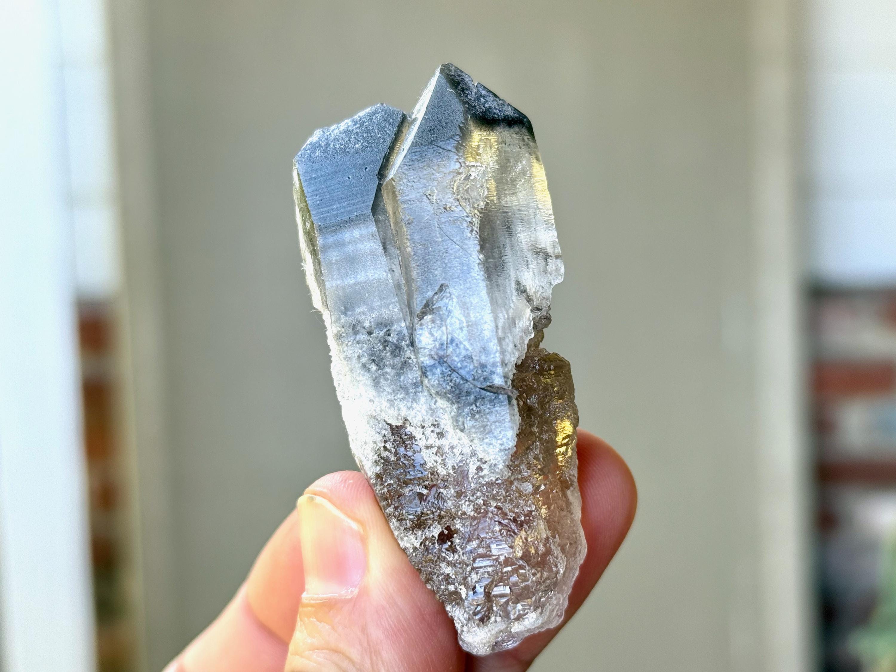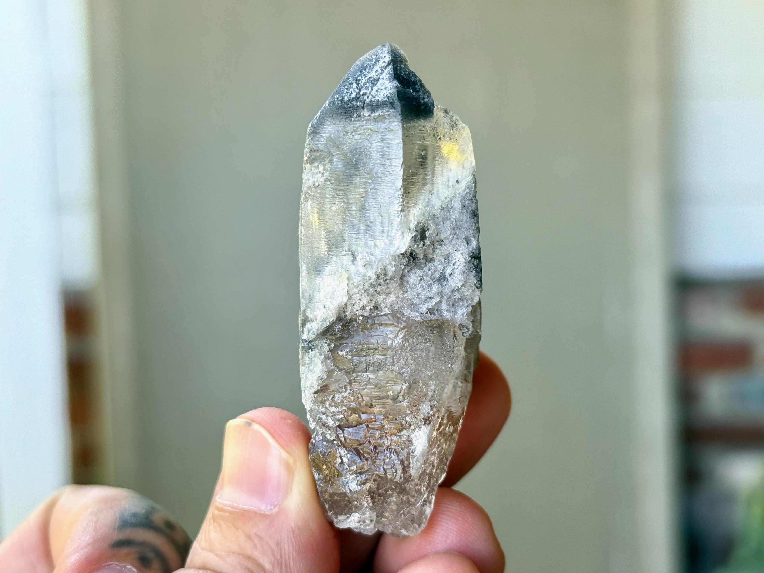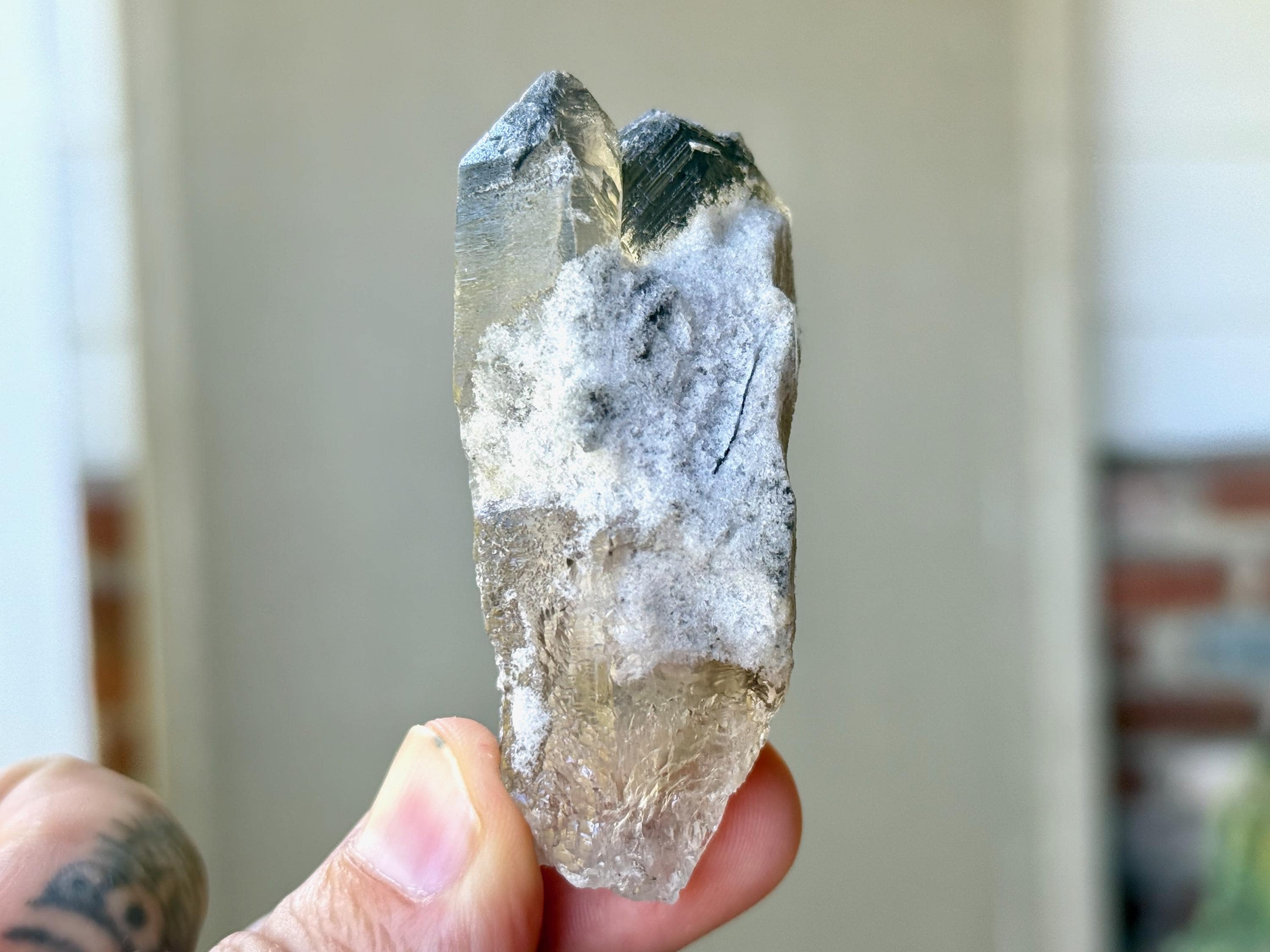Gorgeous textures and hydrothermally etched imprints to this lustrous Black Phantom Lemurian in a perfect Tantric Twin formation. You'll notice this crystal has slightly "rounded" or "soft" edges, the result of its hydrothermal nature. We love the dense black inclusions of Anthraxolite at the top and the frosty white Kaolinite in the midsection. Great terminations as well to this one.