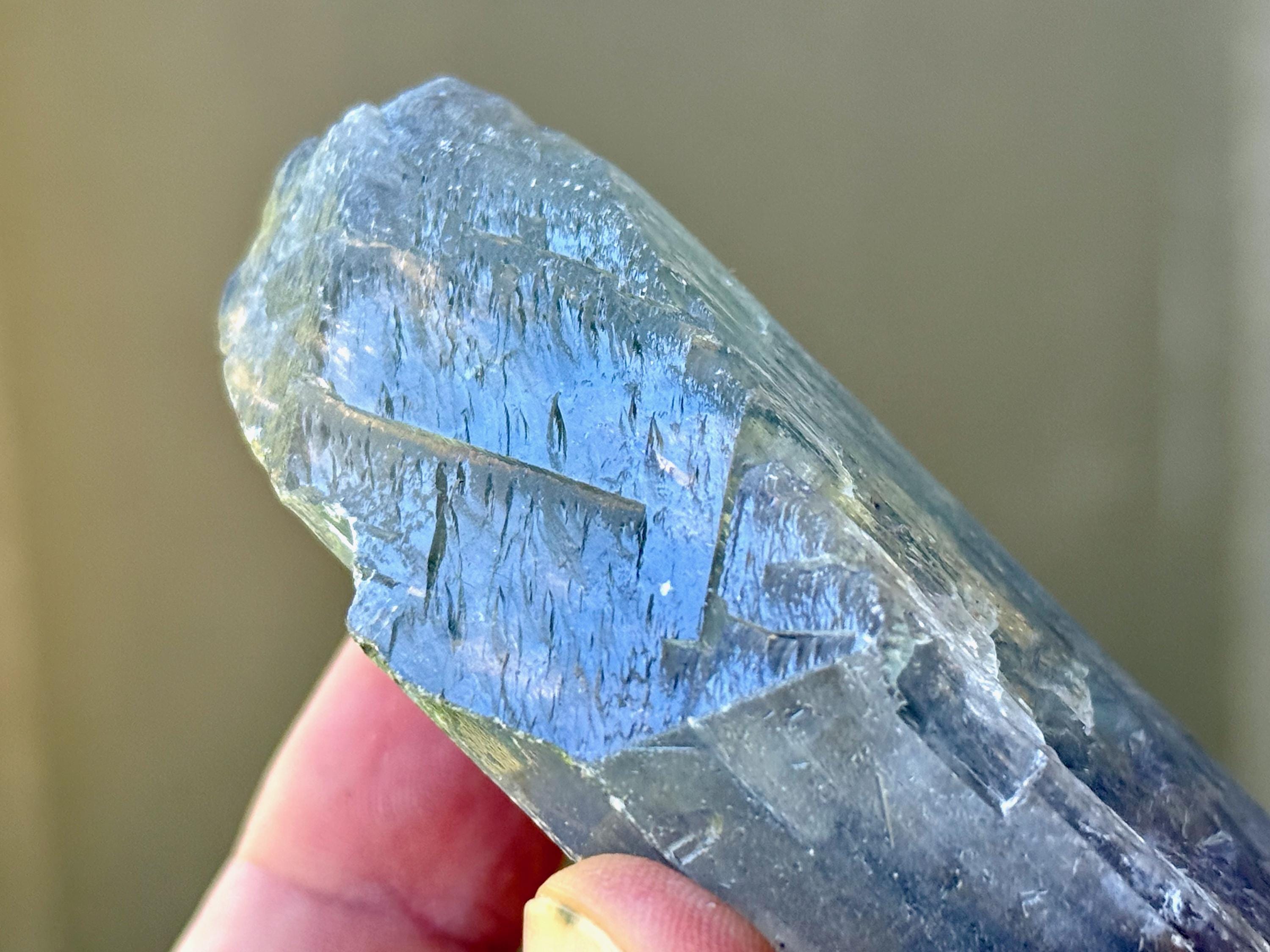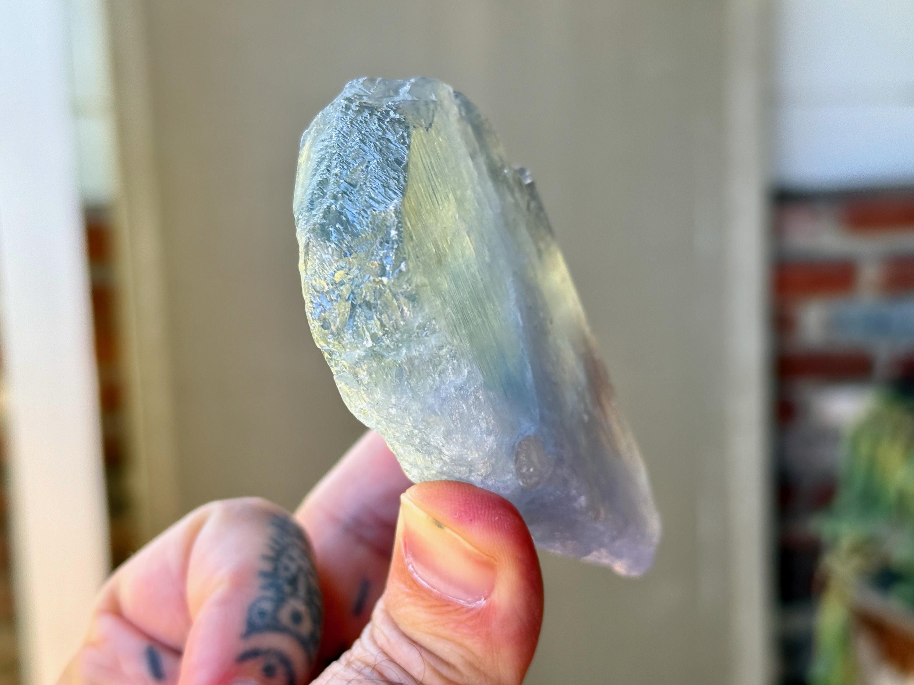 This crystal possesses magnificent luster and captivating, gradient pastel hues. It features an ethereal combination of purple and blue-green, at some angles creating pretty pale blues and grays as well. When backlit, as in Photos 7-8 we can see how brilliantly it lights up.