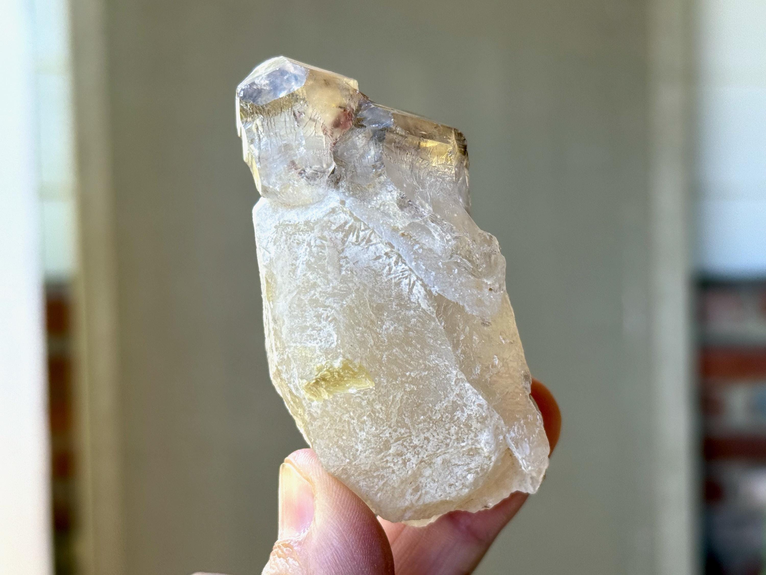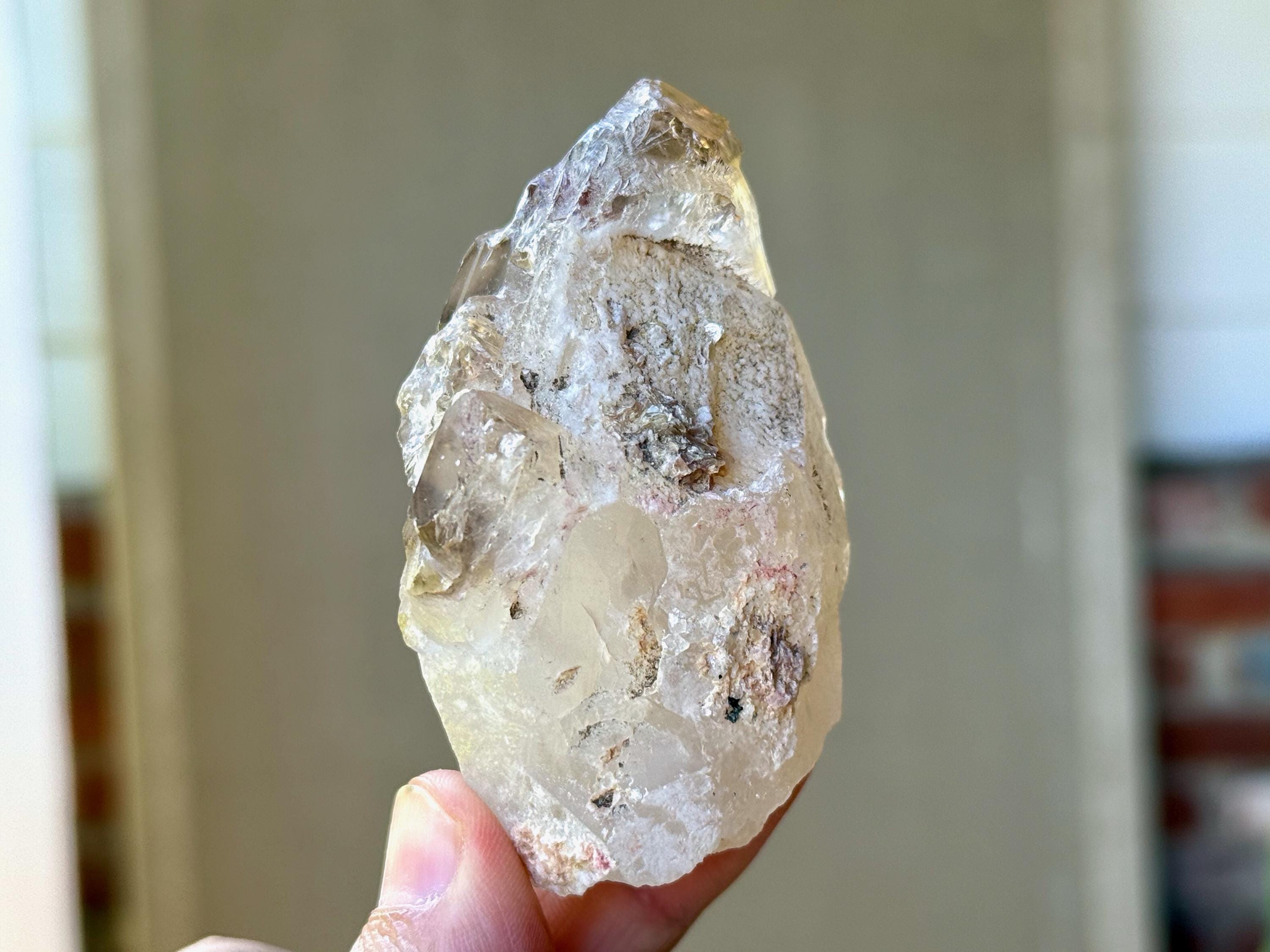 This pretty Elestial Smoky Quartz has a dense and milky complexion at the base that blends up into a highly lustrous and very clear Quartz toward the top, with smoky highlights and several different "spires" of growth.