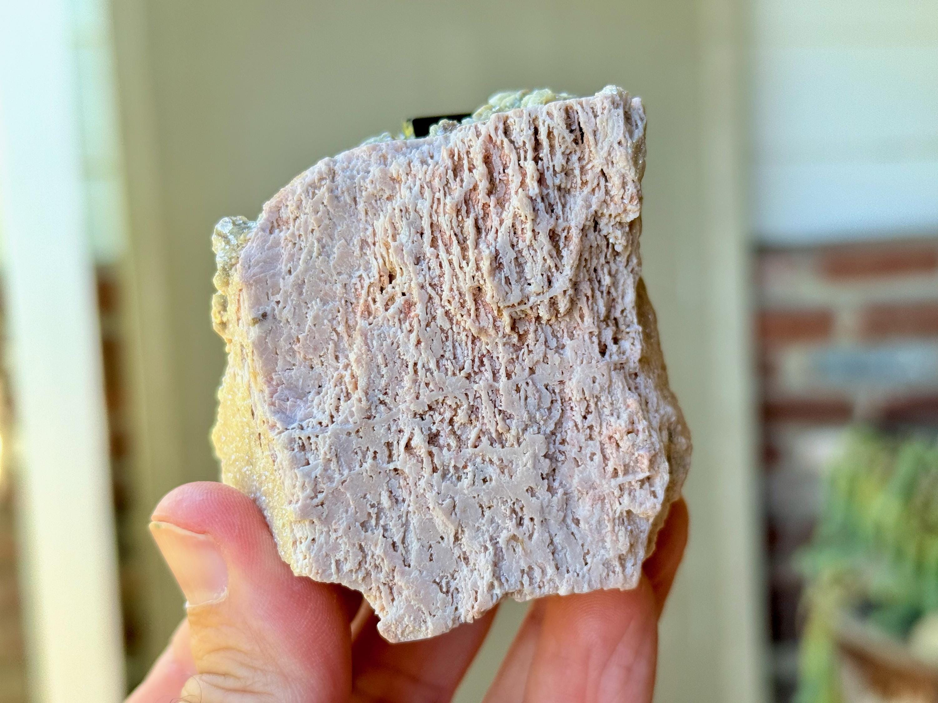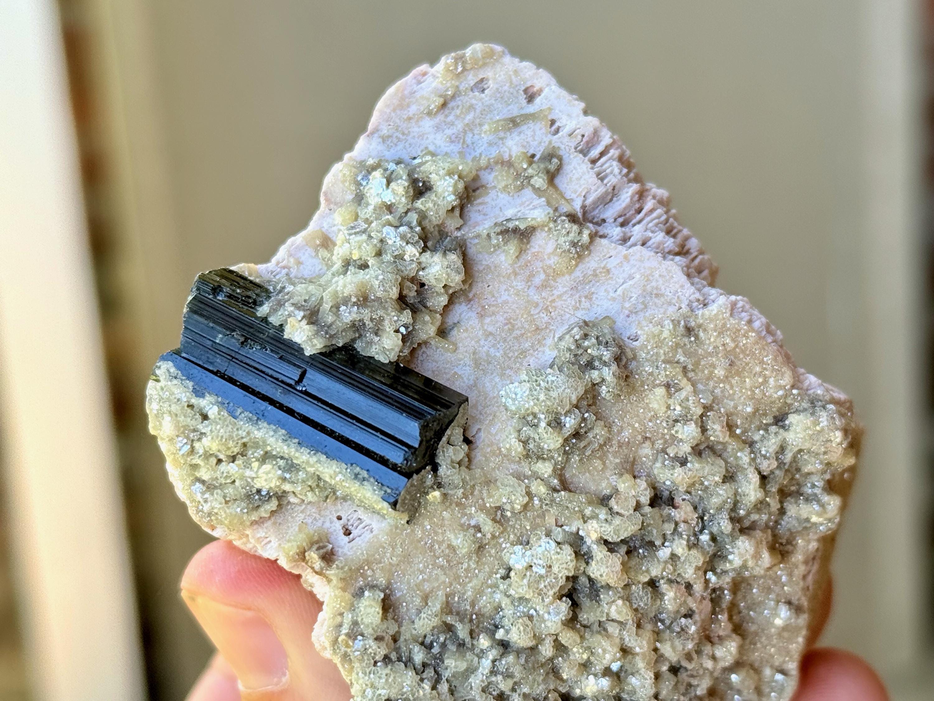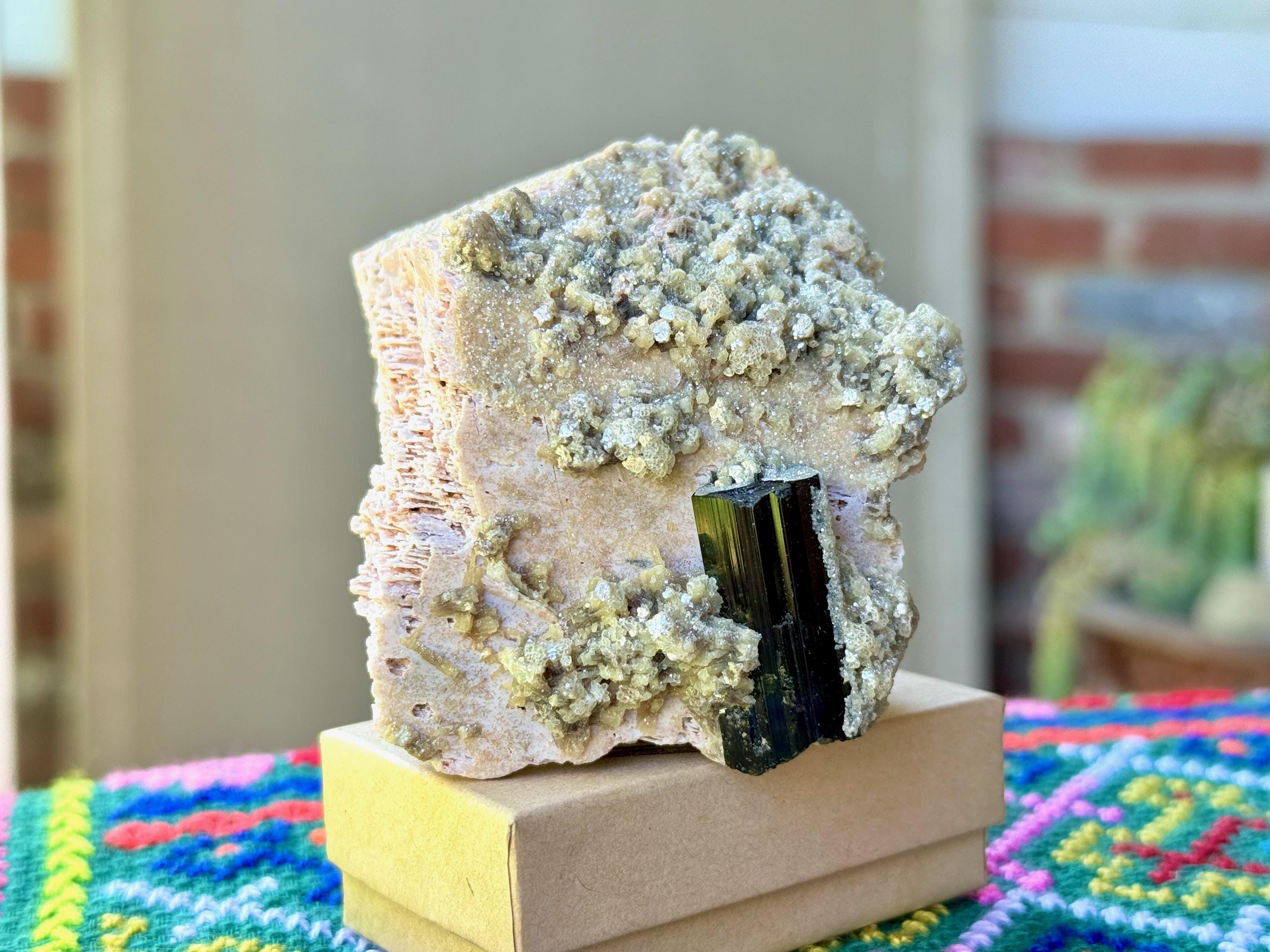 This unique Pink Feldspar crystal with Green Tourmaline & Golden Mica comes from an old find (2020) in Ouro Fino, Minas Gerais, Brazil. Feldspar helps us to find unconventional and exciting ways to reach our goals. It supports us in issues relating to self-awareness and self-love.