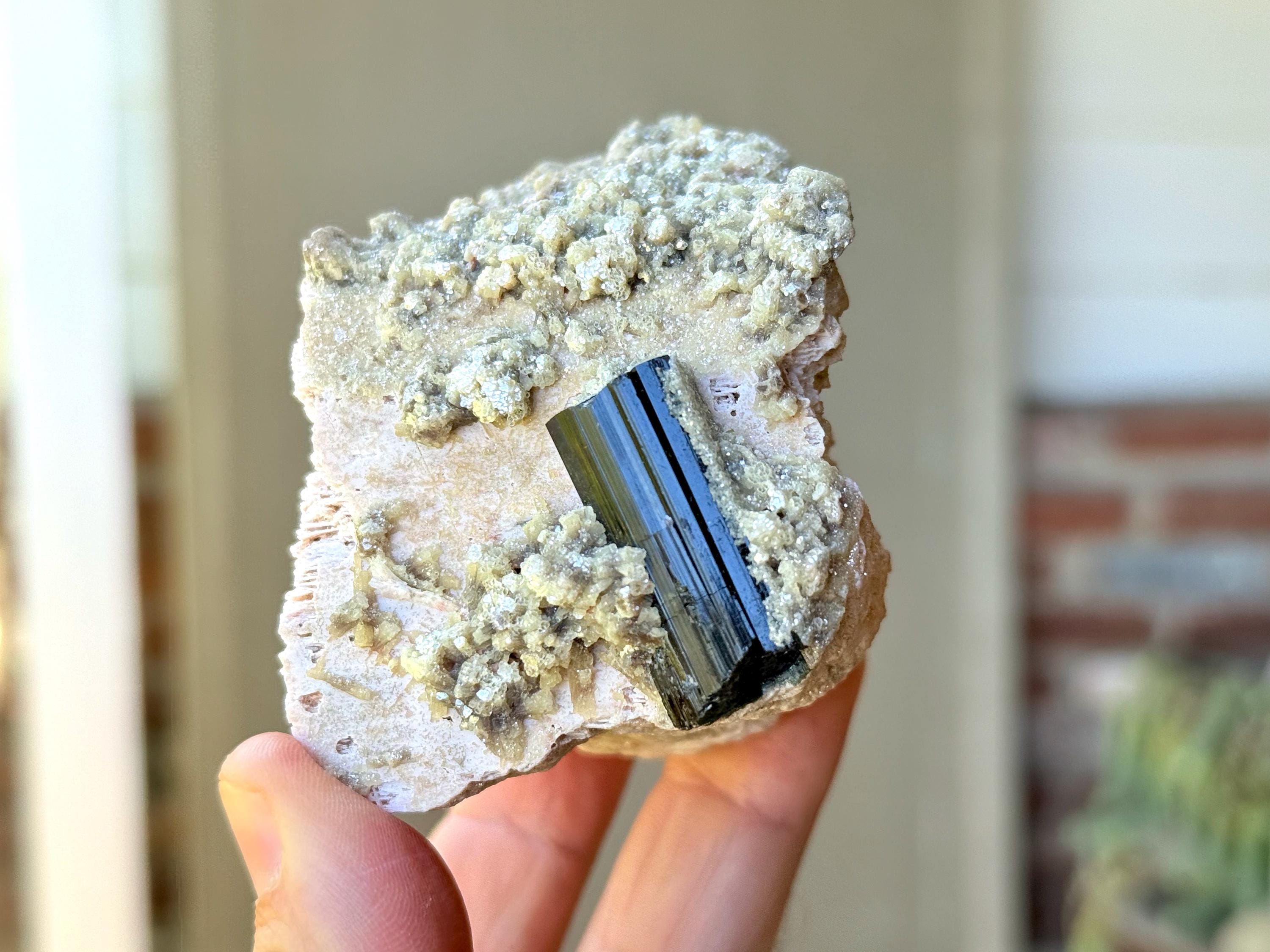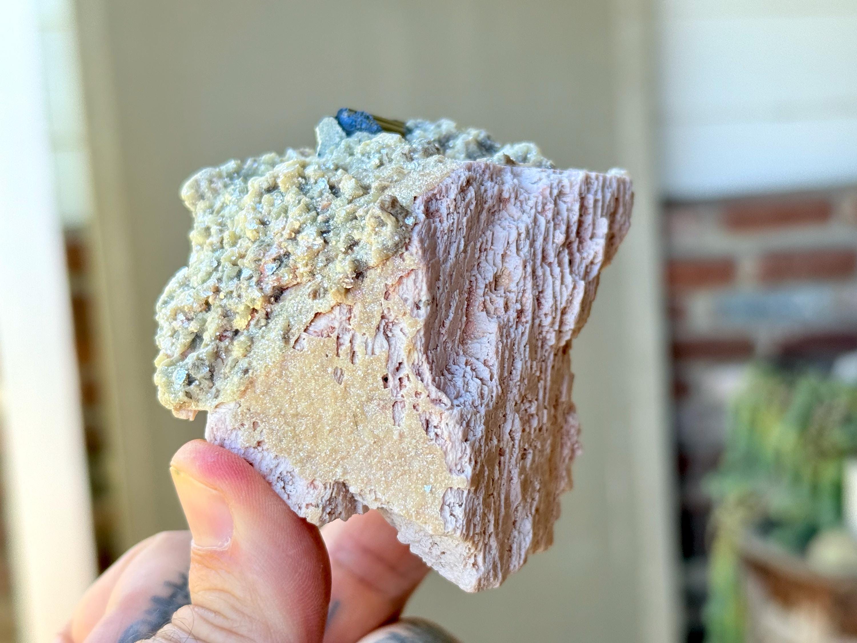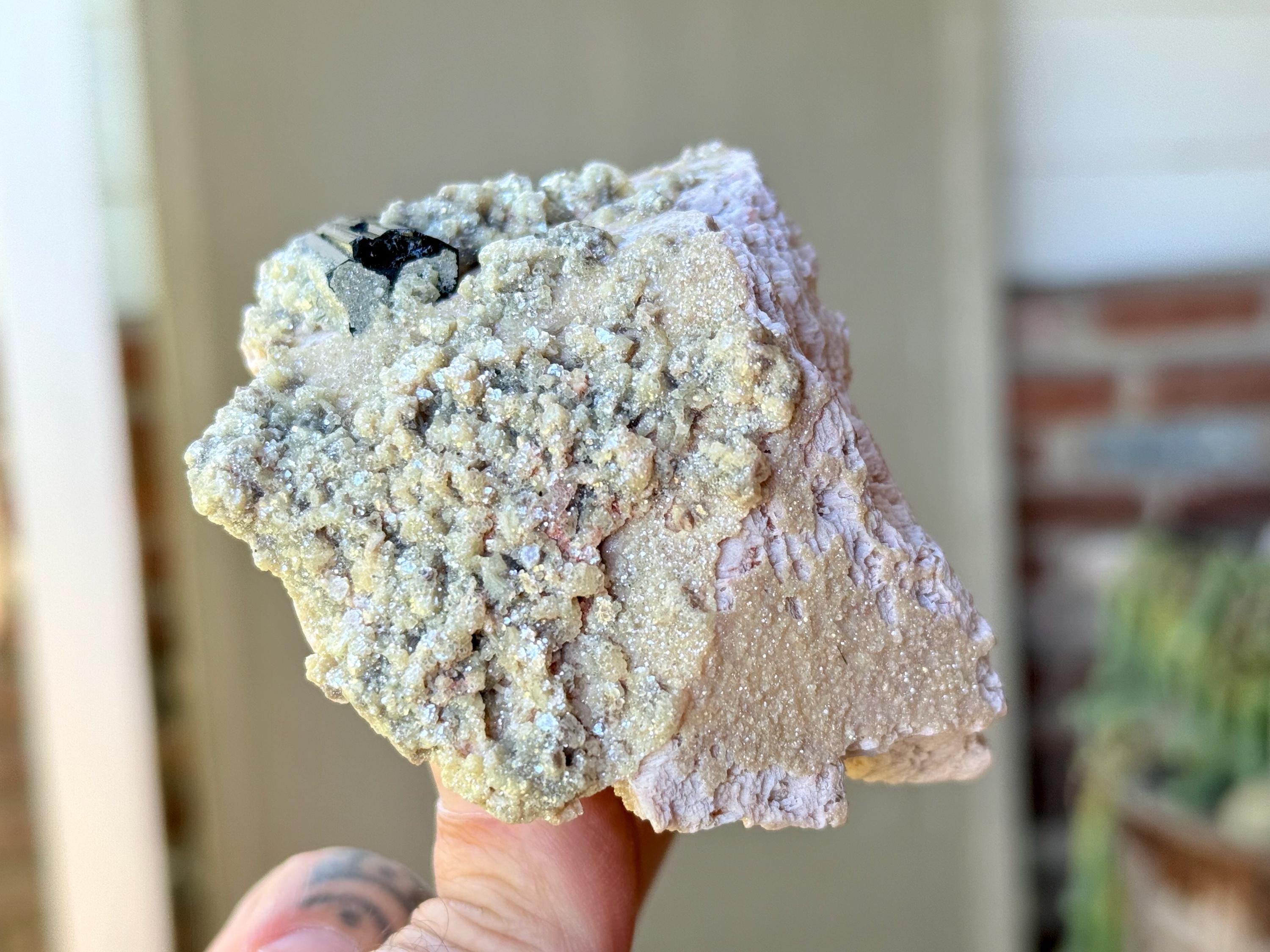 This unique Pink Feldspar crystal with Green Tourmaline & Golden Mica comes from an old find (2020) in Ouro Fino, Minas Gerais, Brazil. Feldspar helps us to find unconventional and exciting ways to reach our goals. It supports us in issues relating to self-awareness and self-love.
