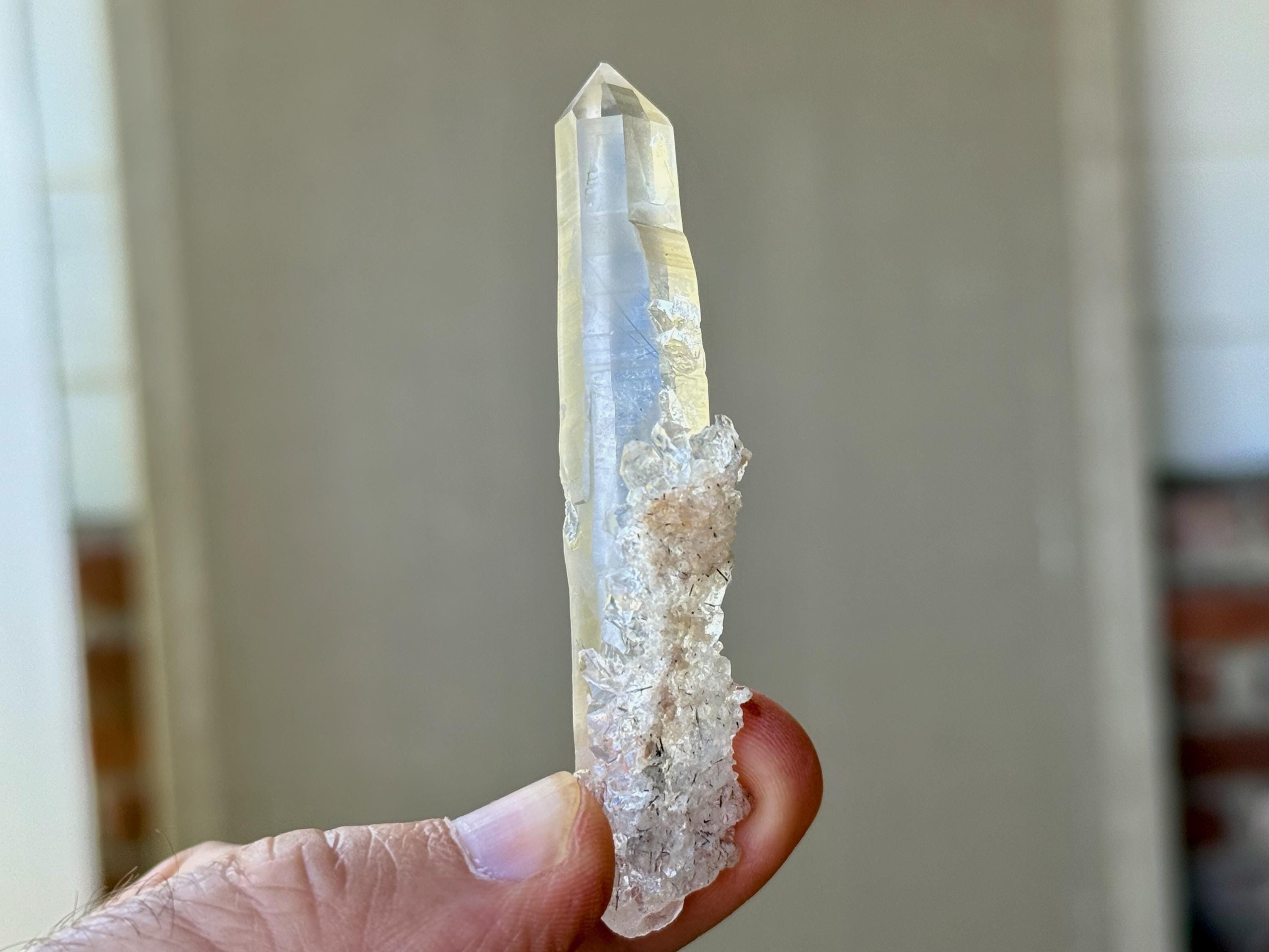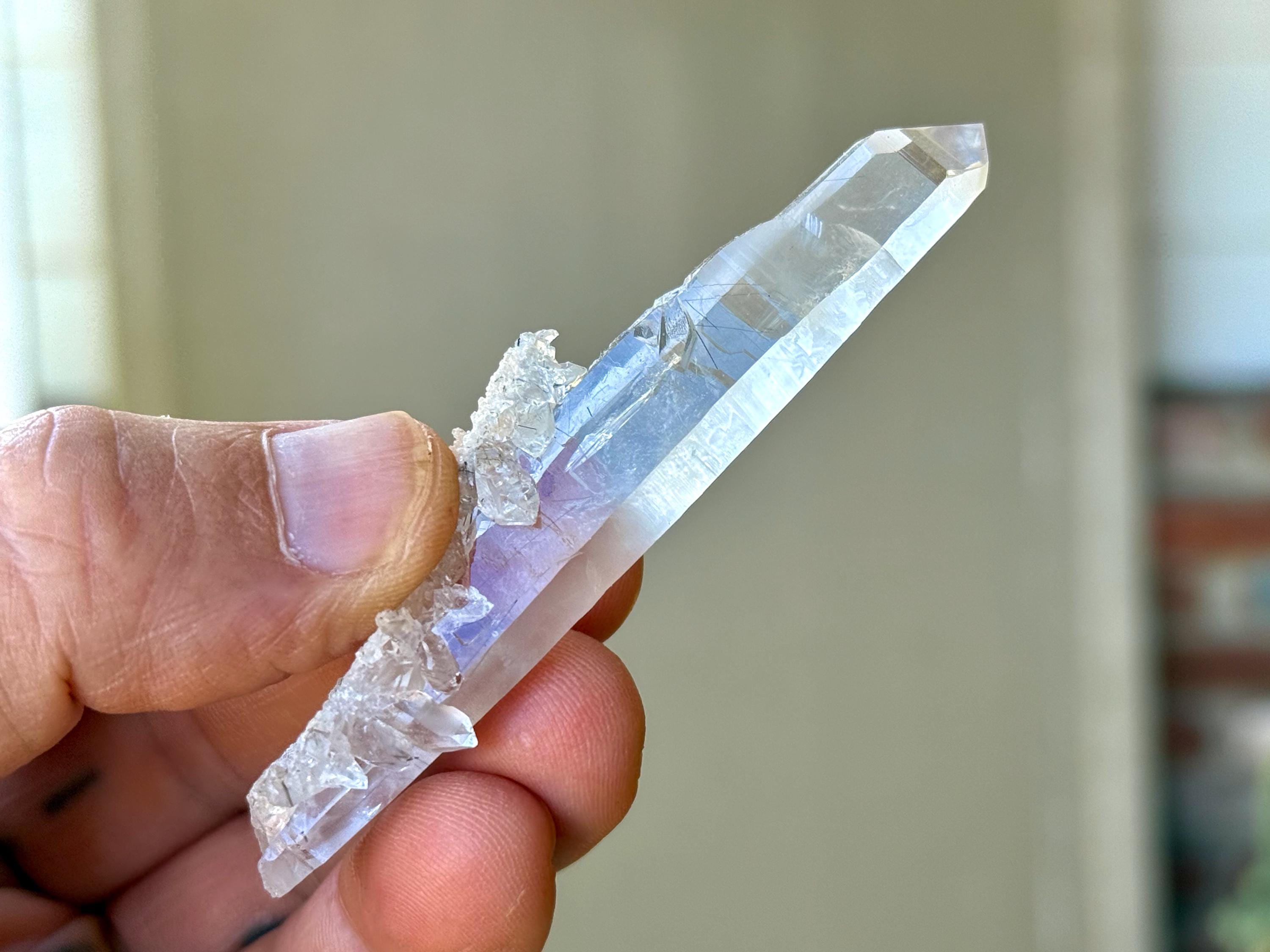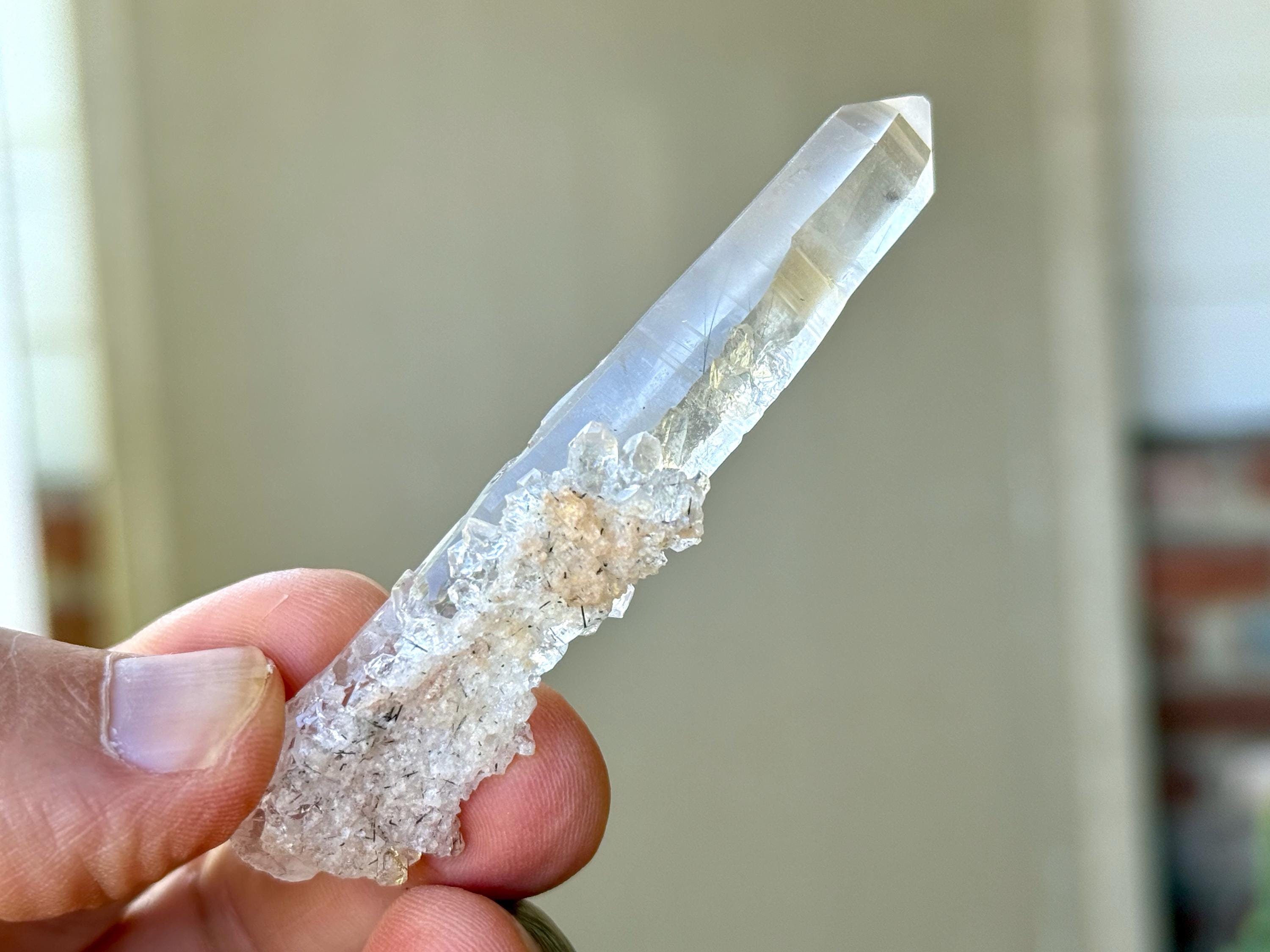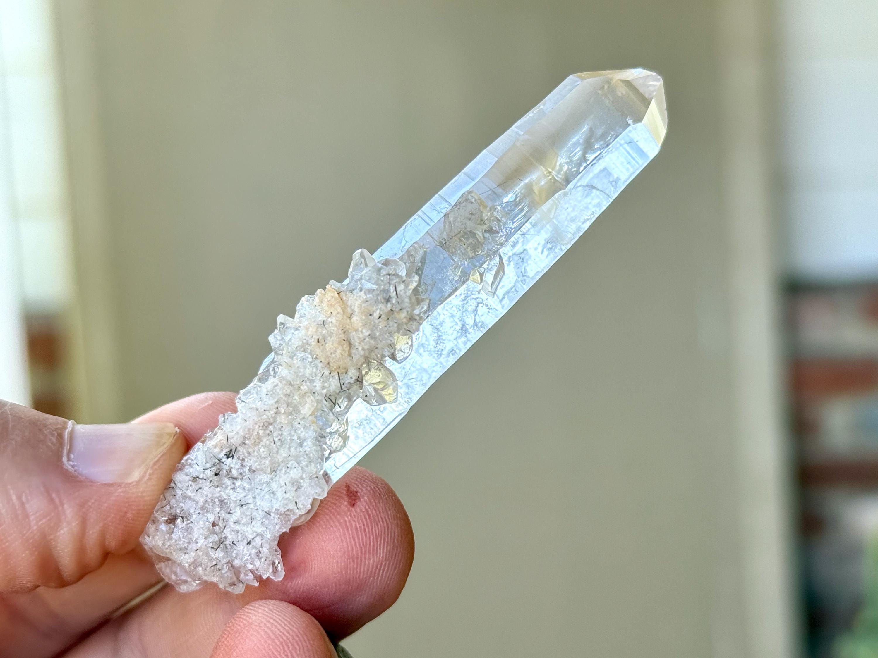 Water clear clarity to this superb, elongated Laser Quartz crystal with mild inclusions of Black Tourmaline "needles" at the base. We love the druzy cluster attached at the base as well. Excellent termination to this one!