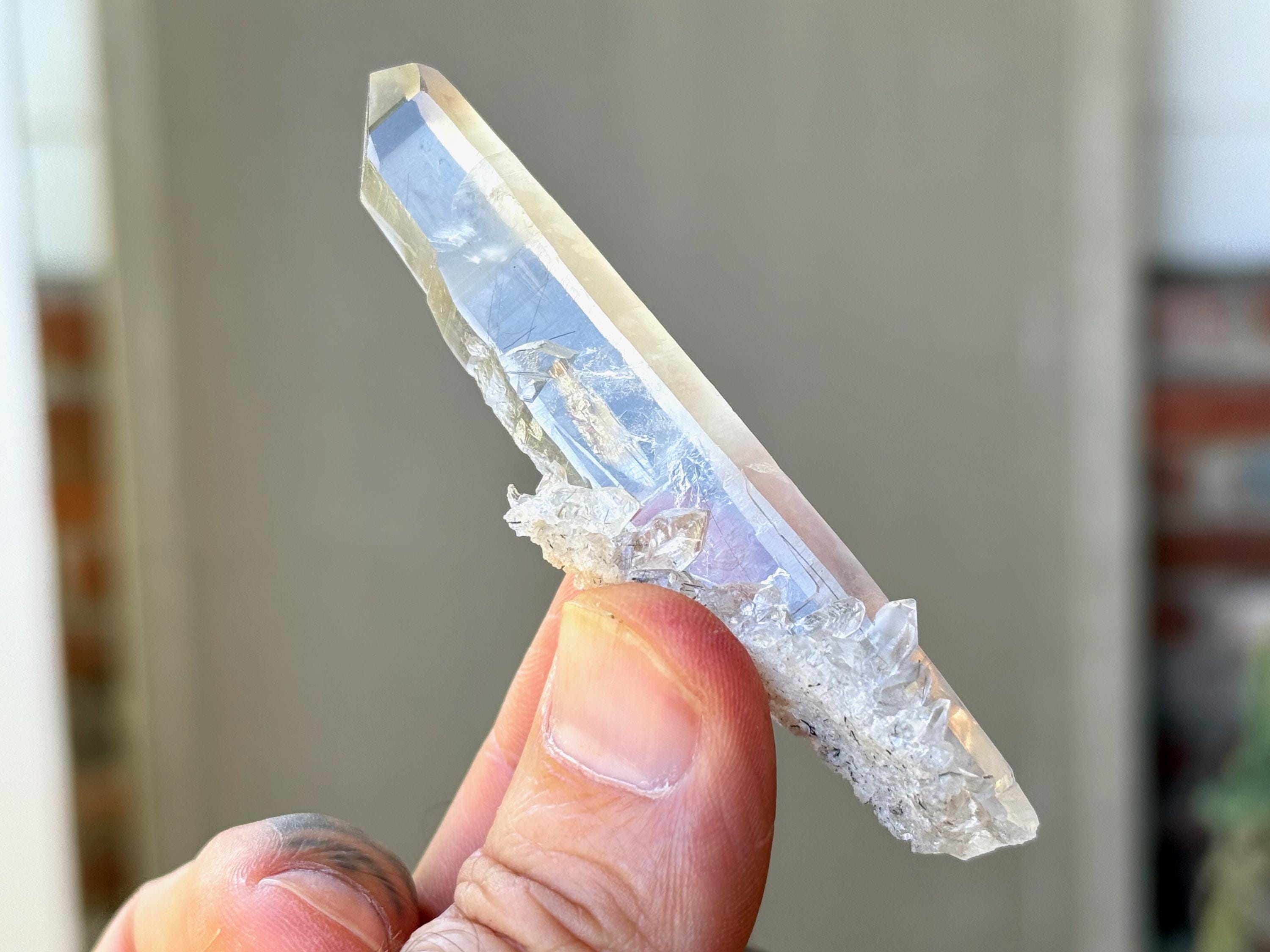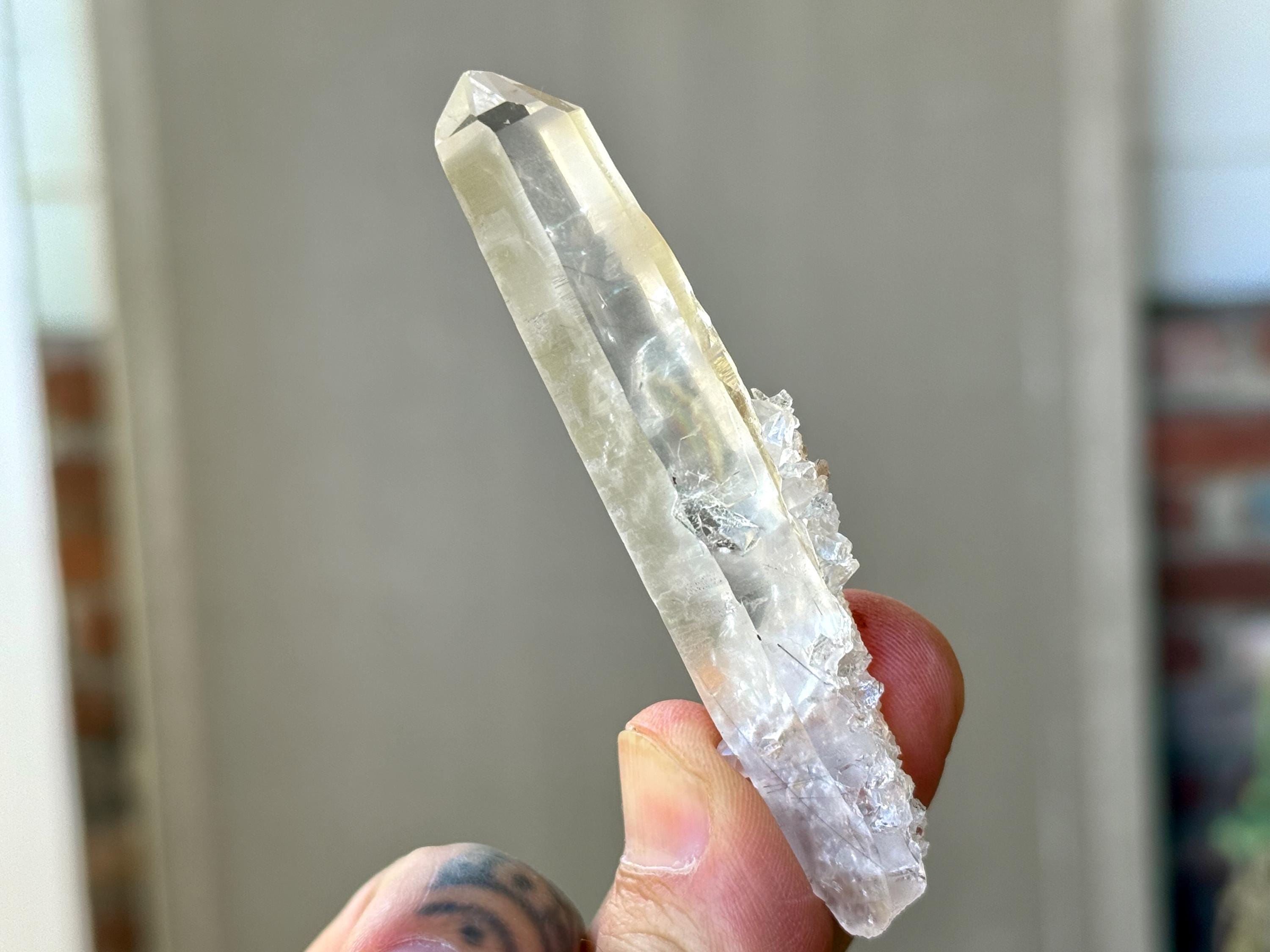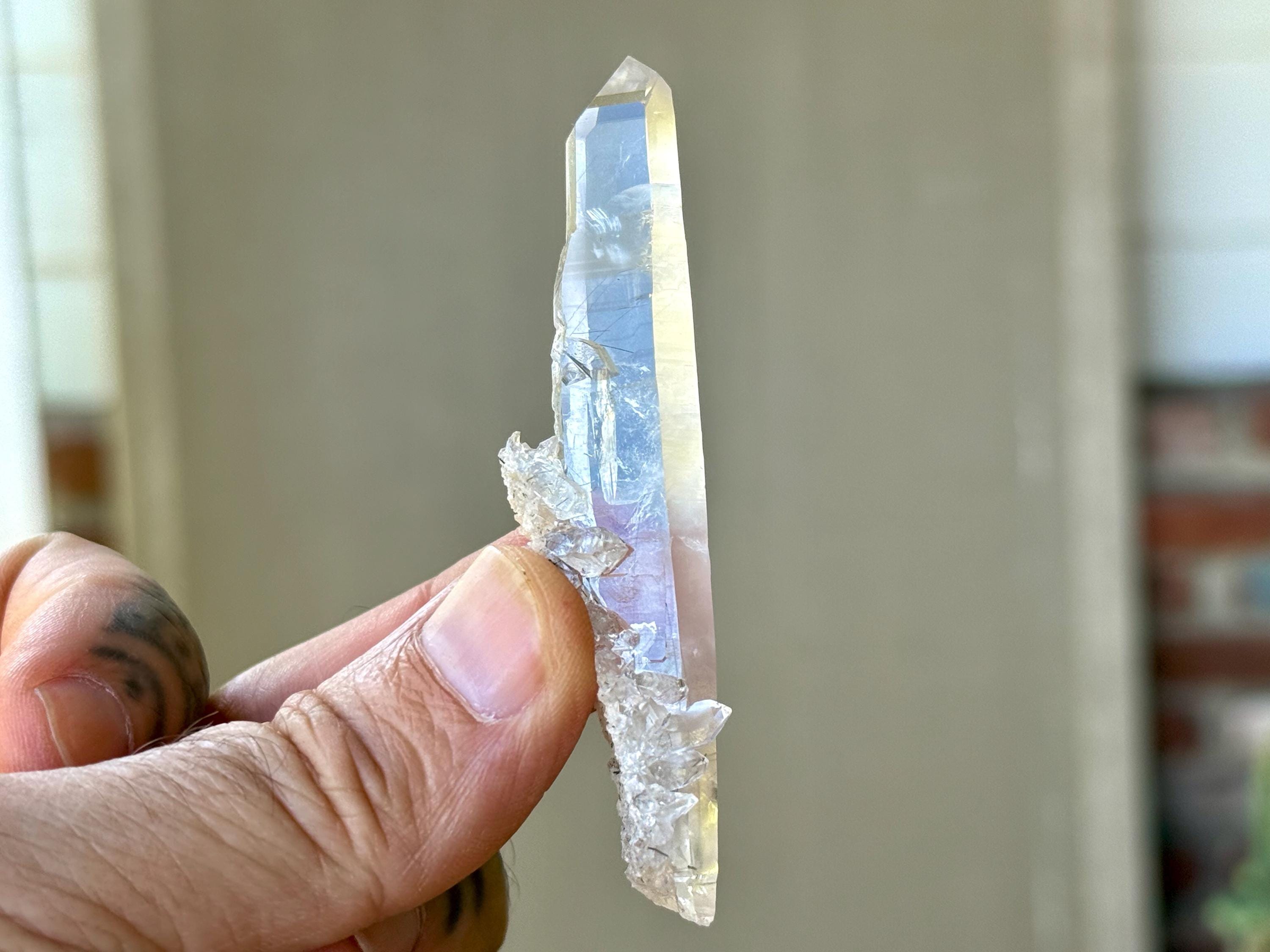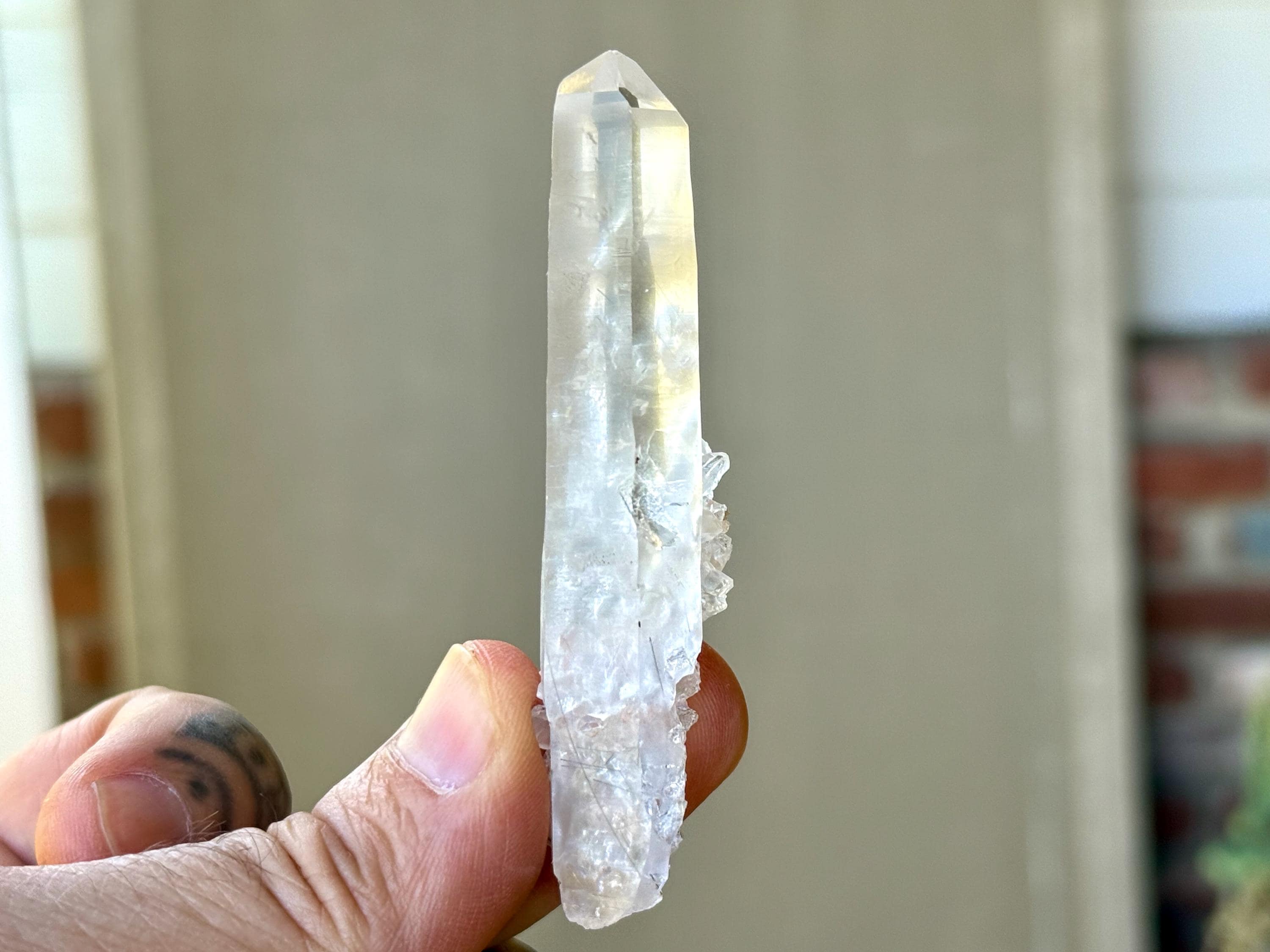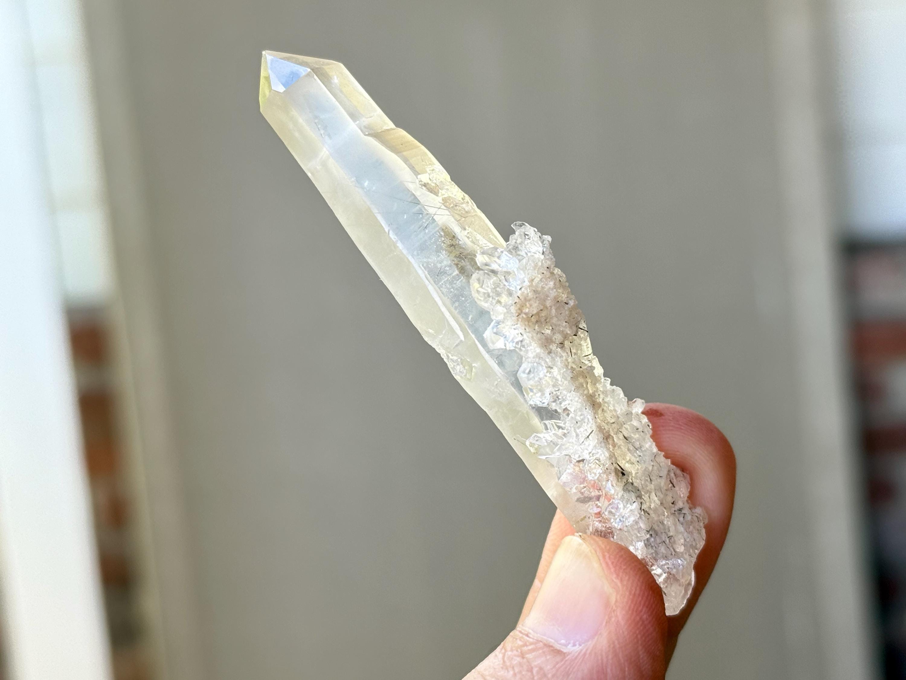 Water clear clarity to this superb, elongated Laser Quartz crystal with mild inclusions of Black Tourmaline "needles" at the base. We love the druzy cluster attached at the base as well. Excellent termination to this one!