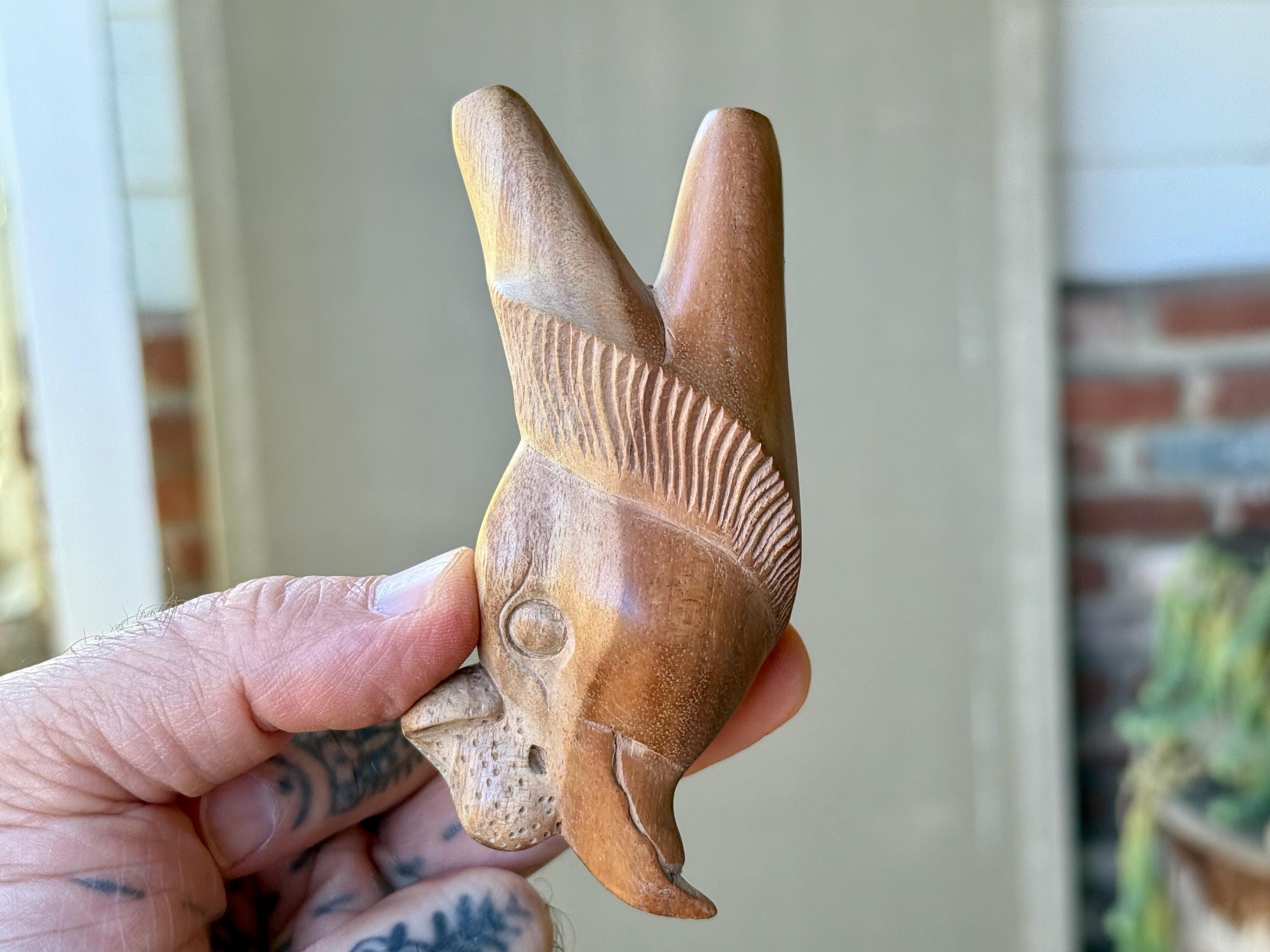 This beautiful Condor Kuripe for self-administering hapé was hand carved from solid tropical hardwood. **PLEASE NOTE this is a Minor Scratch & Dent item and has been discounted. The tip of the beak on this kuripe was mildly cracked (Photo 6). We have repaired it here in our workshop and the mild hairline crack is barely noticeable and does not affect functionality. However we have discounted it due to this imperfection.
