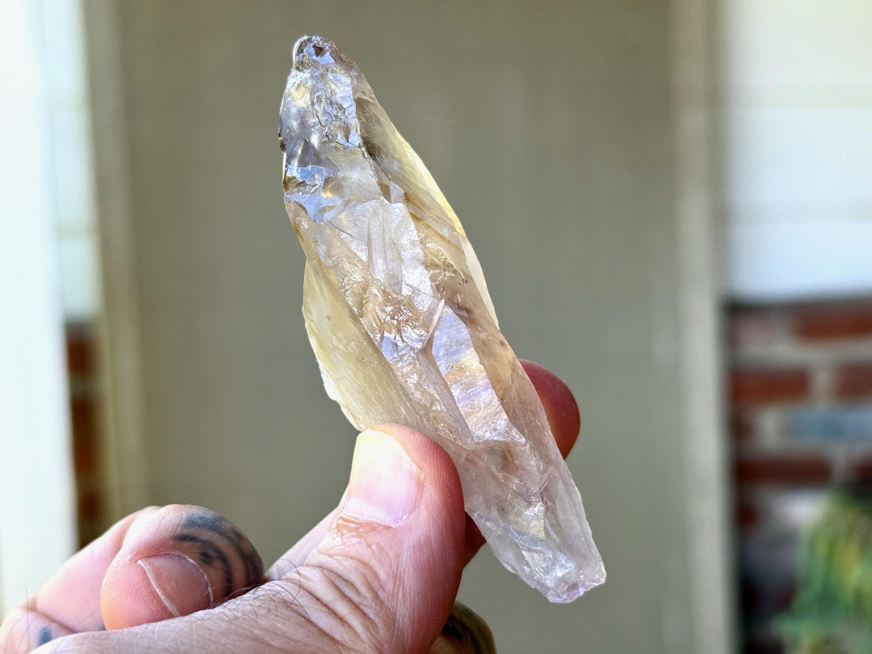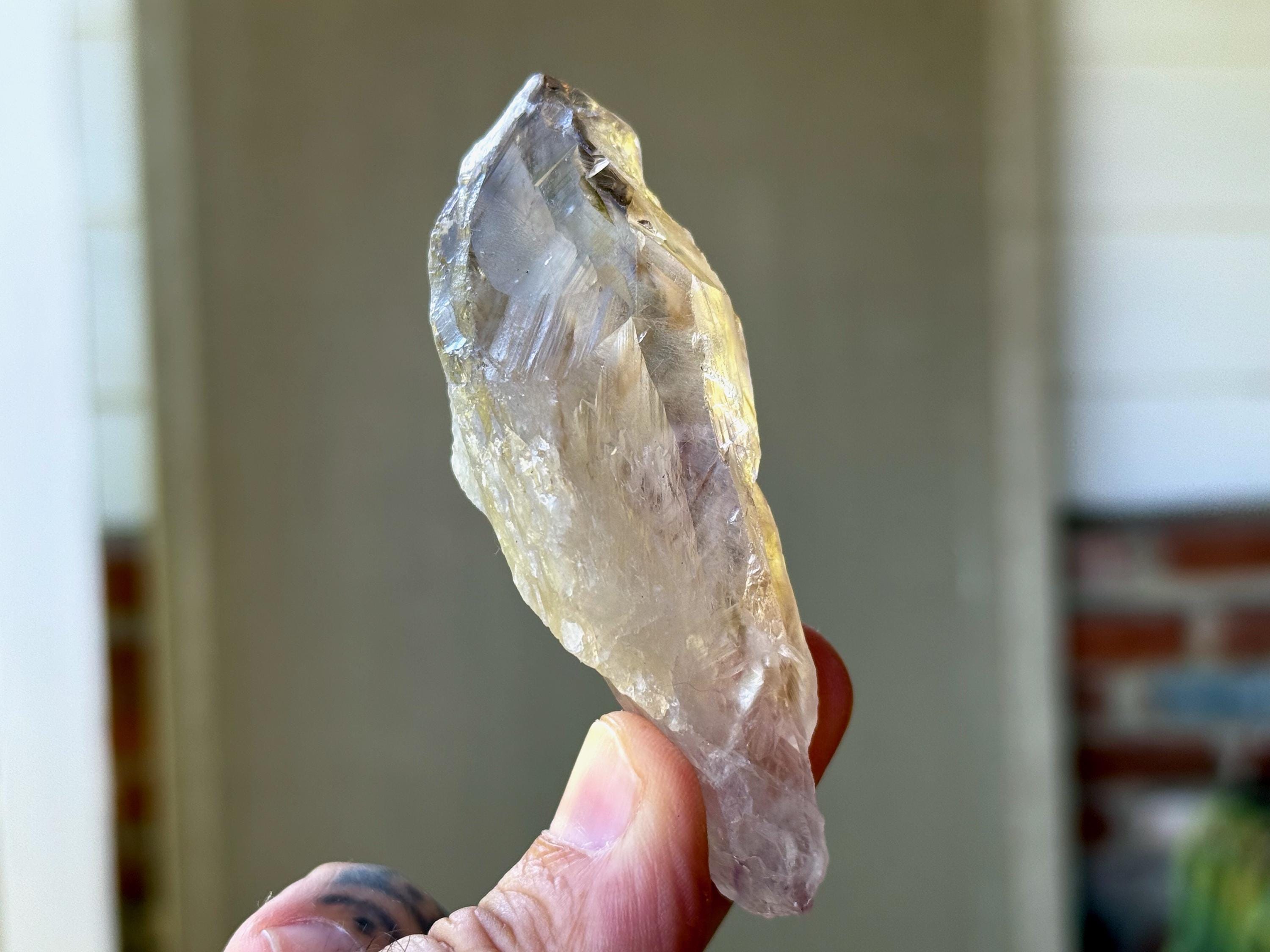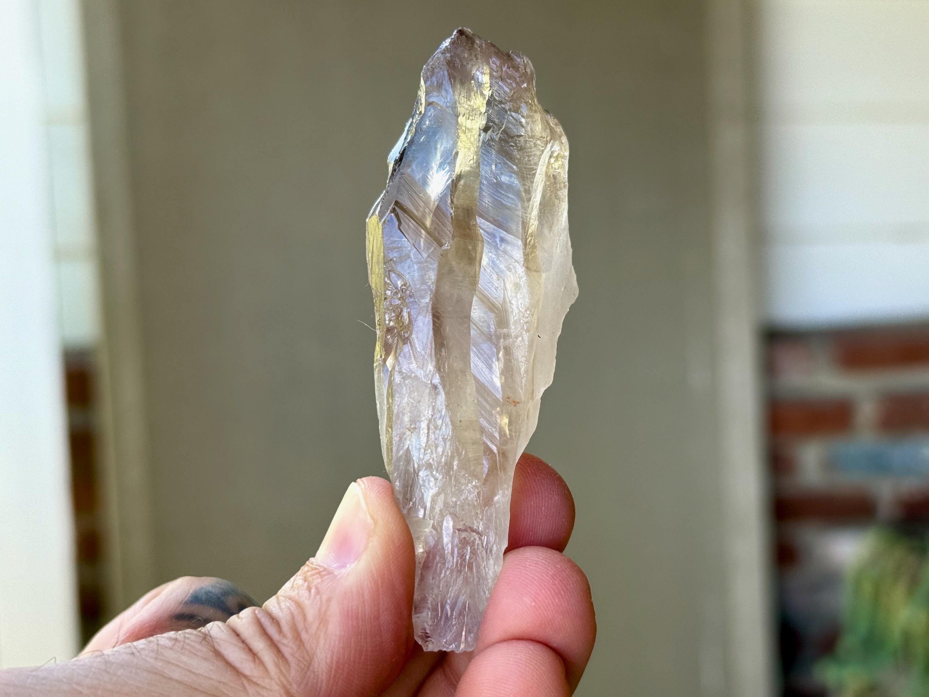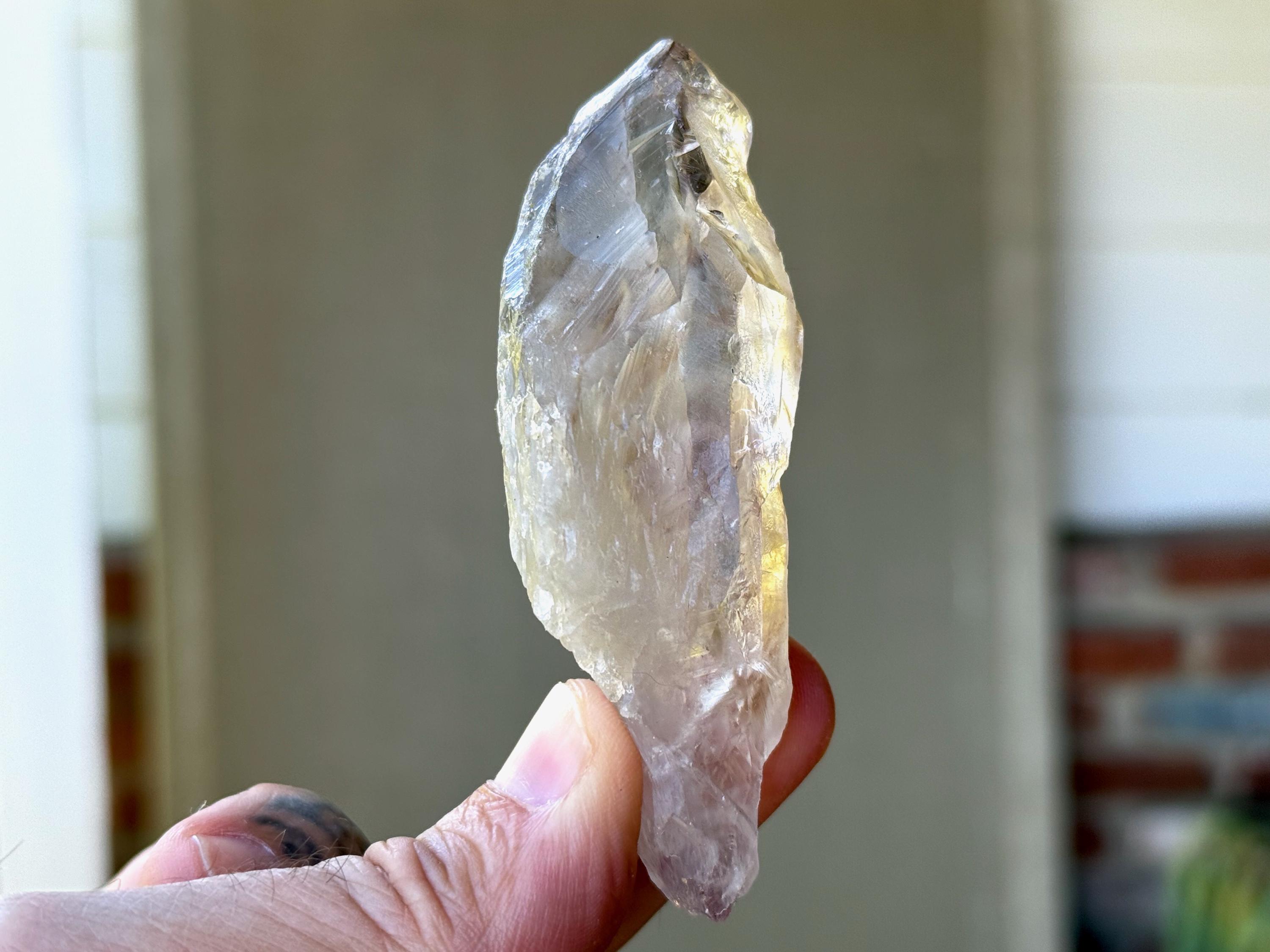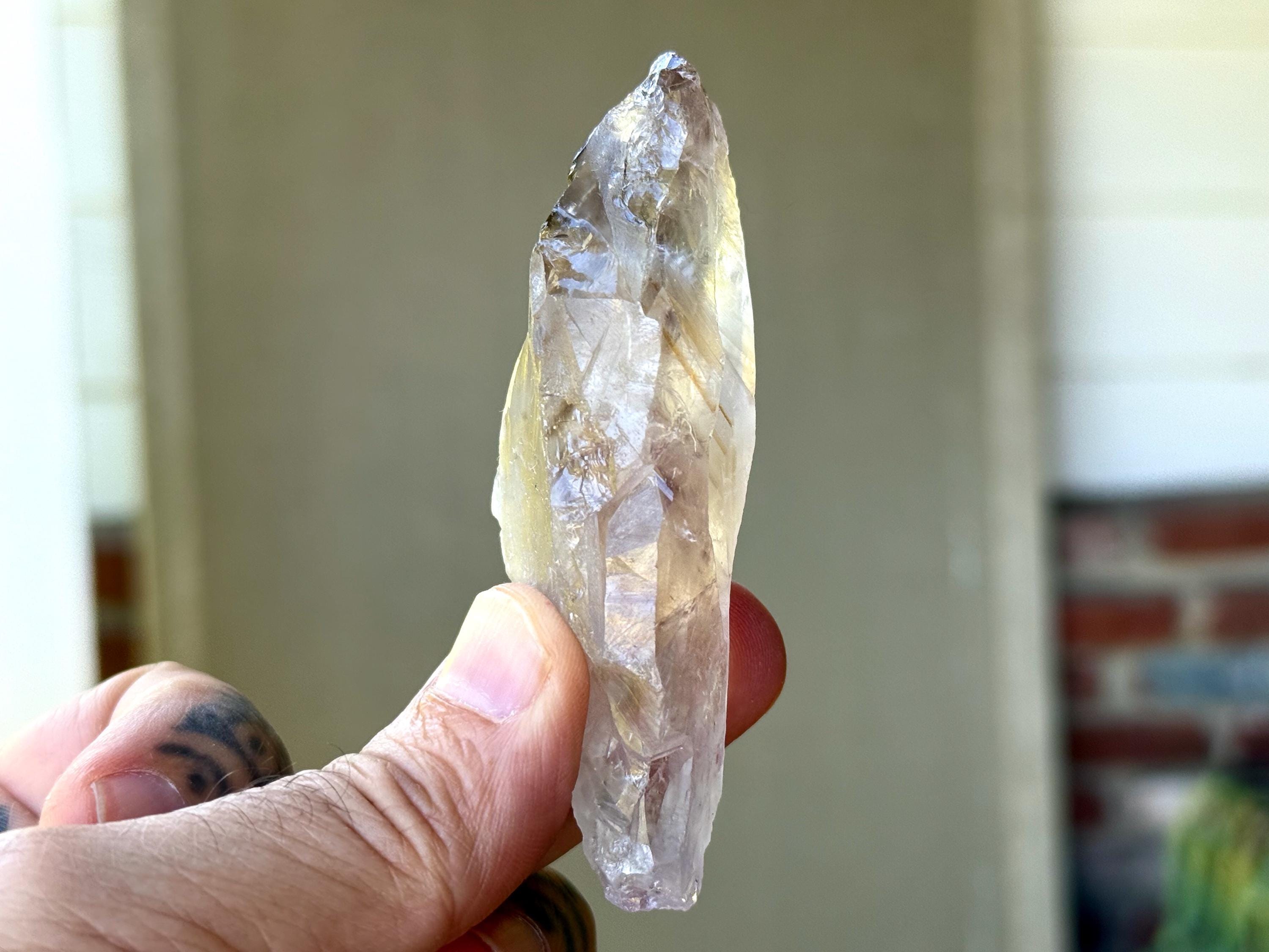 A superb, elongated "root" formation to this Powellite Phantom Quartz crystal, with very nice clarity and interesting textural contact impressions covering its body. If you hold this up in the light you'll see some very mild hints of purple and gold, indicating some possible Ametrine inclusion.