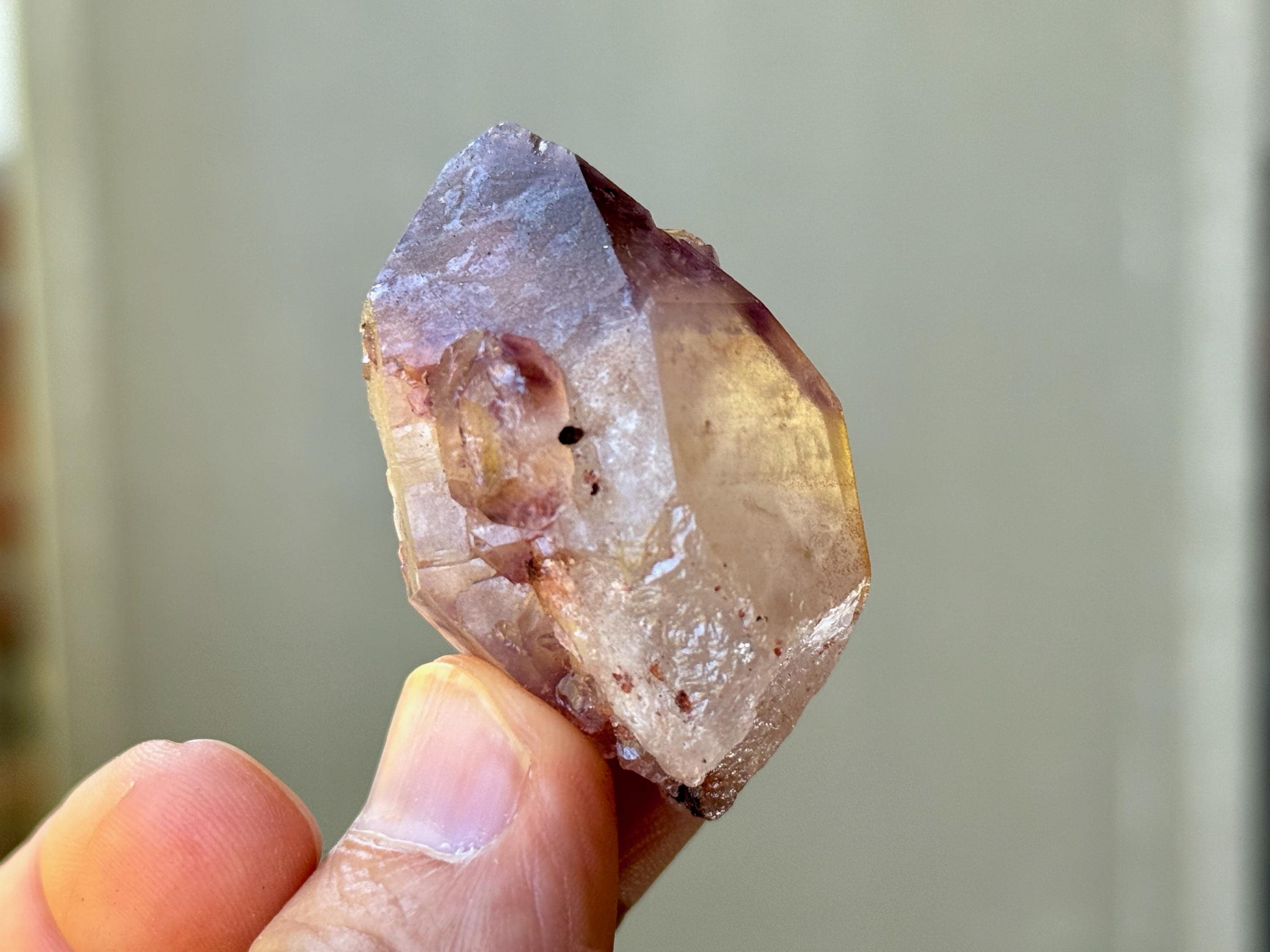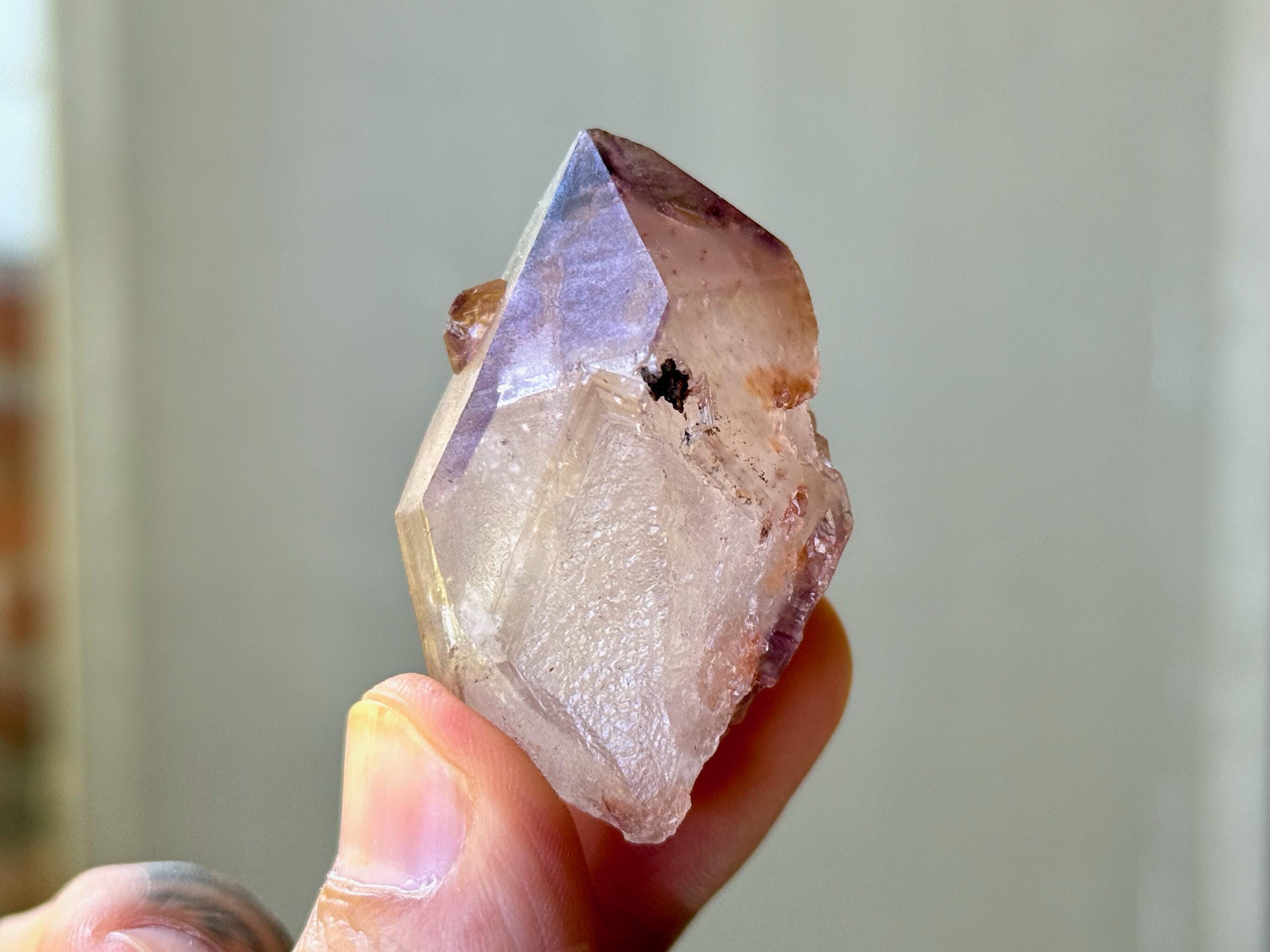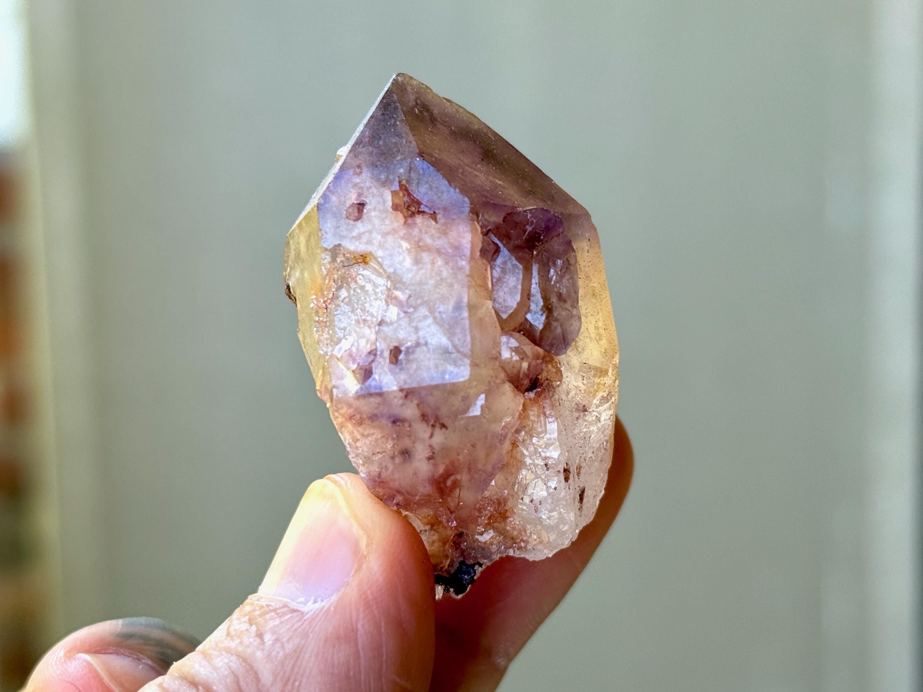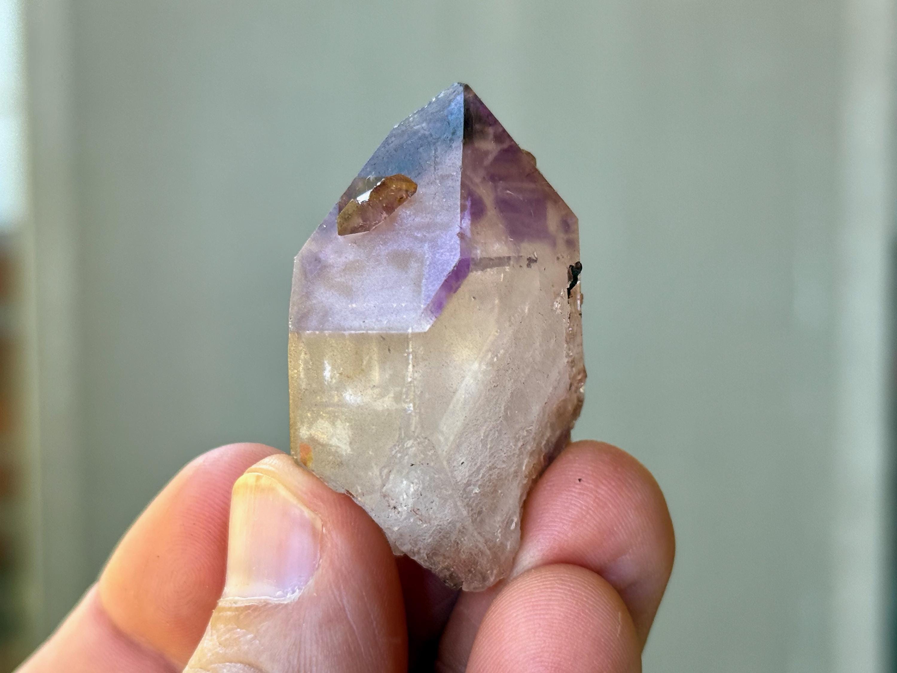 Beautiful purple Amethyst cap to this lovely Dreamcoat Lemurian! The primary growth is mostly clear and colorless on this piece, with just a very mild tinge of golden hue. Wonderful luster and purple color, with an excellent termination.