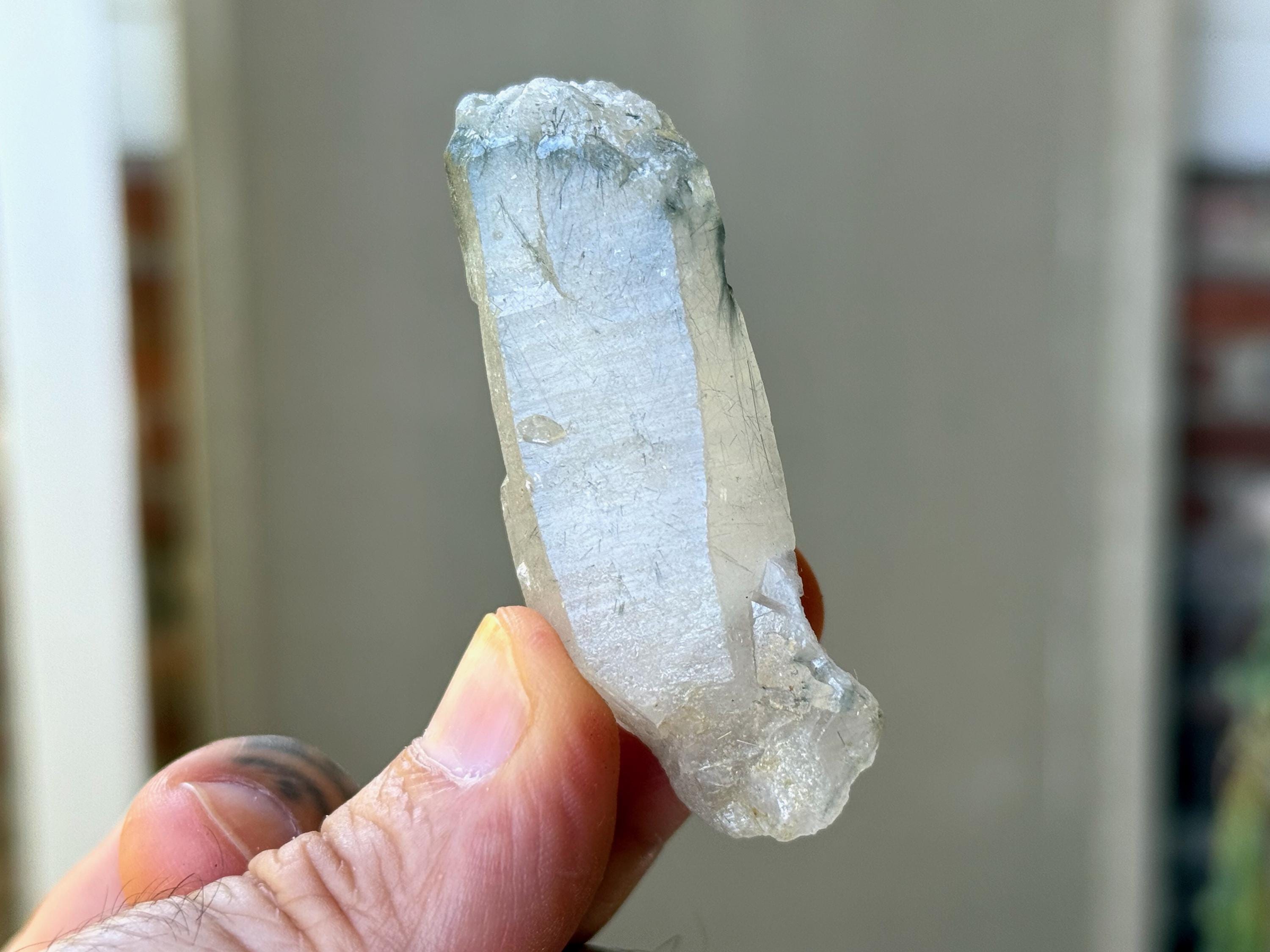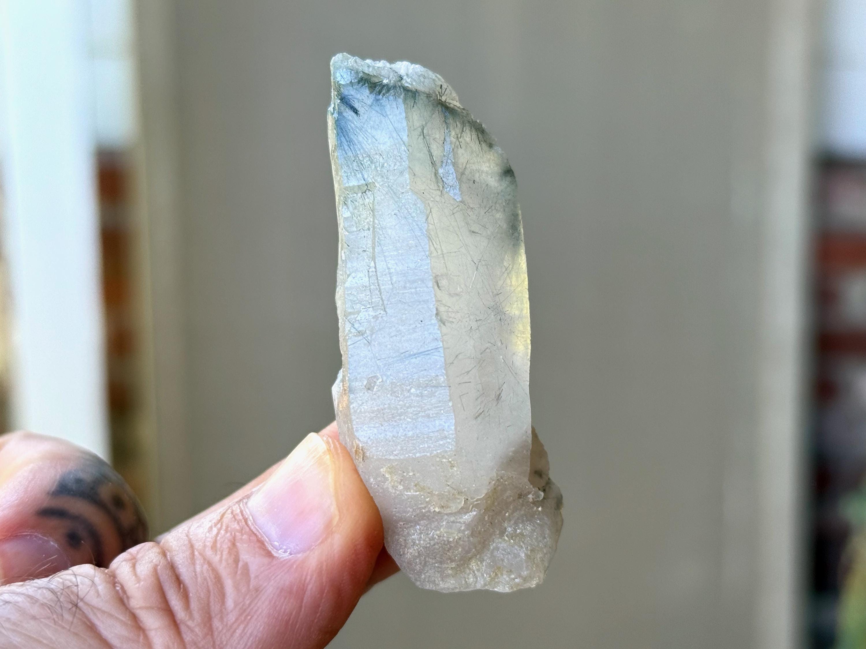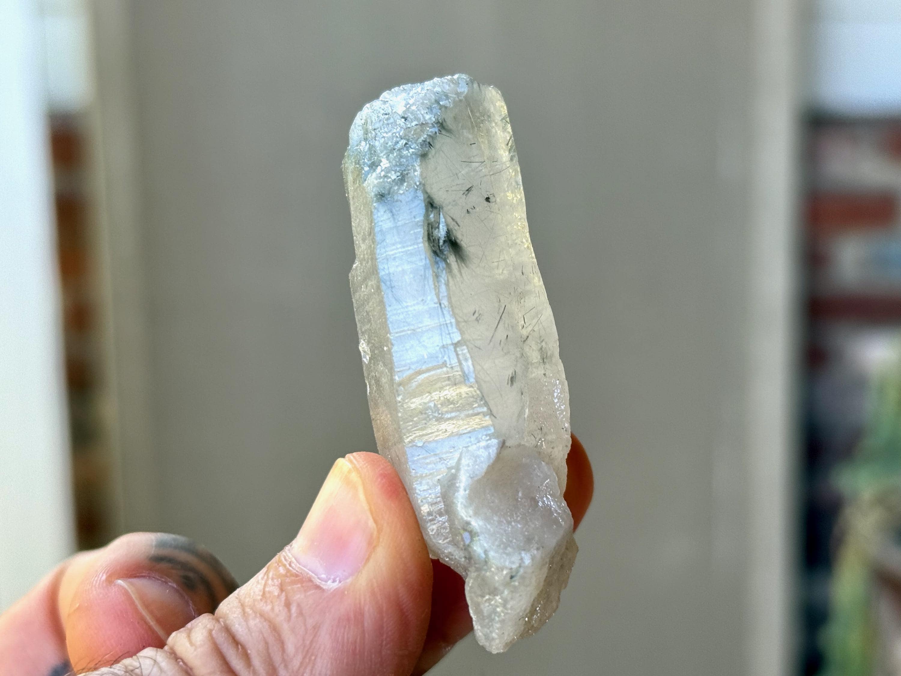 Marvelous, glassy luster to this this Indicolite Quartz crystal with a mildly milky complexion. When backlit, as in Photos 4-5, we can see how beautifully it lights up.