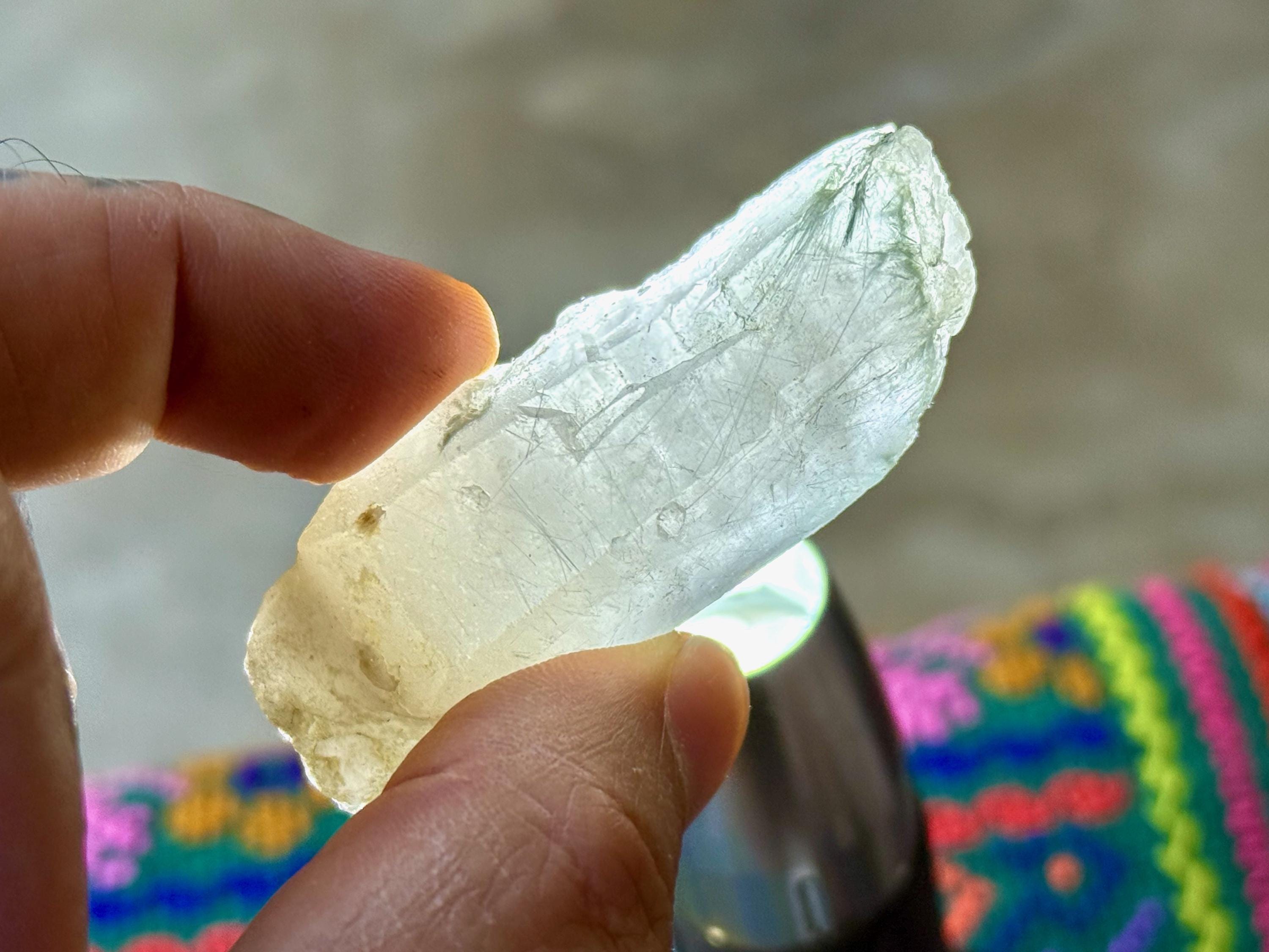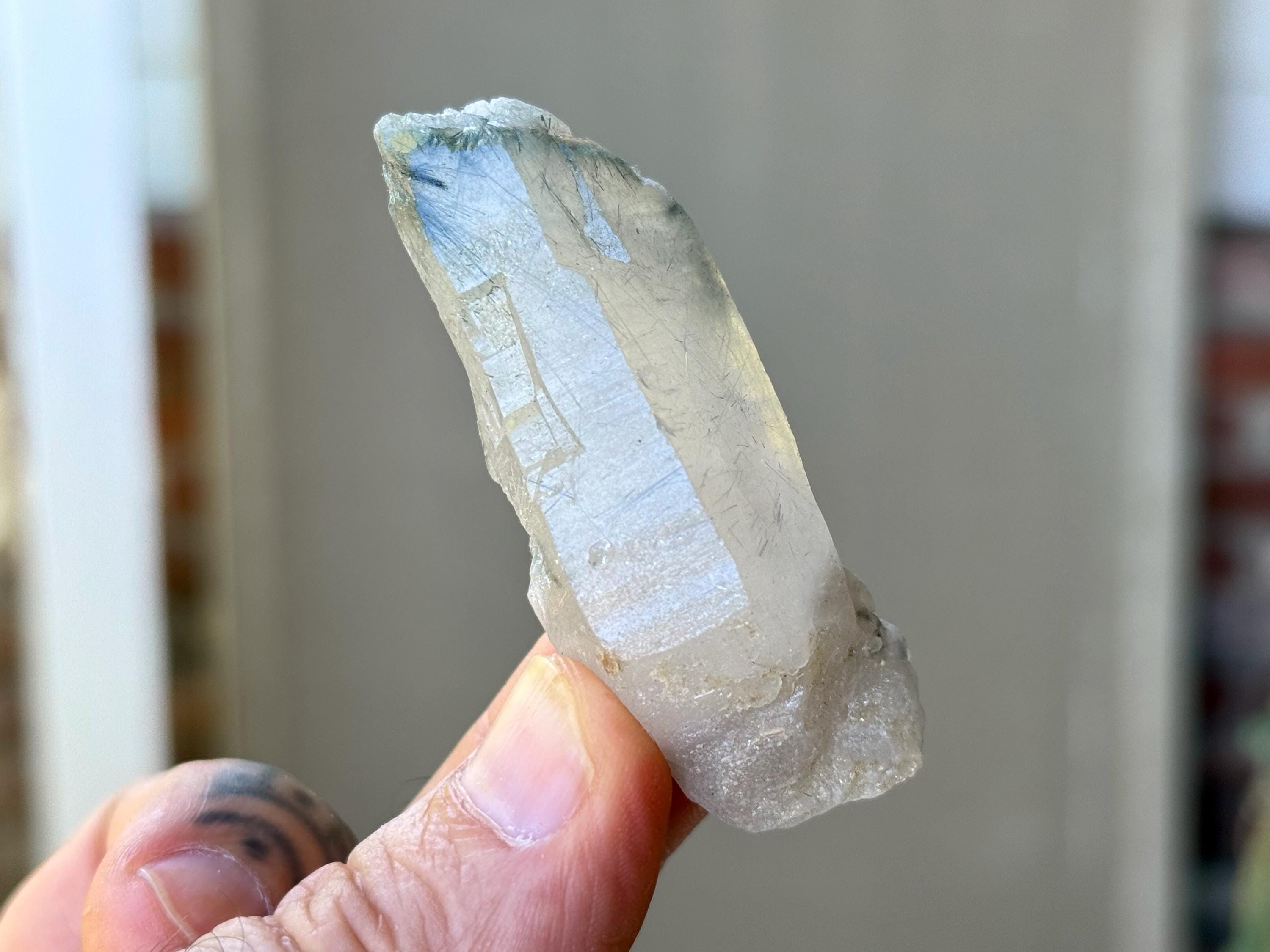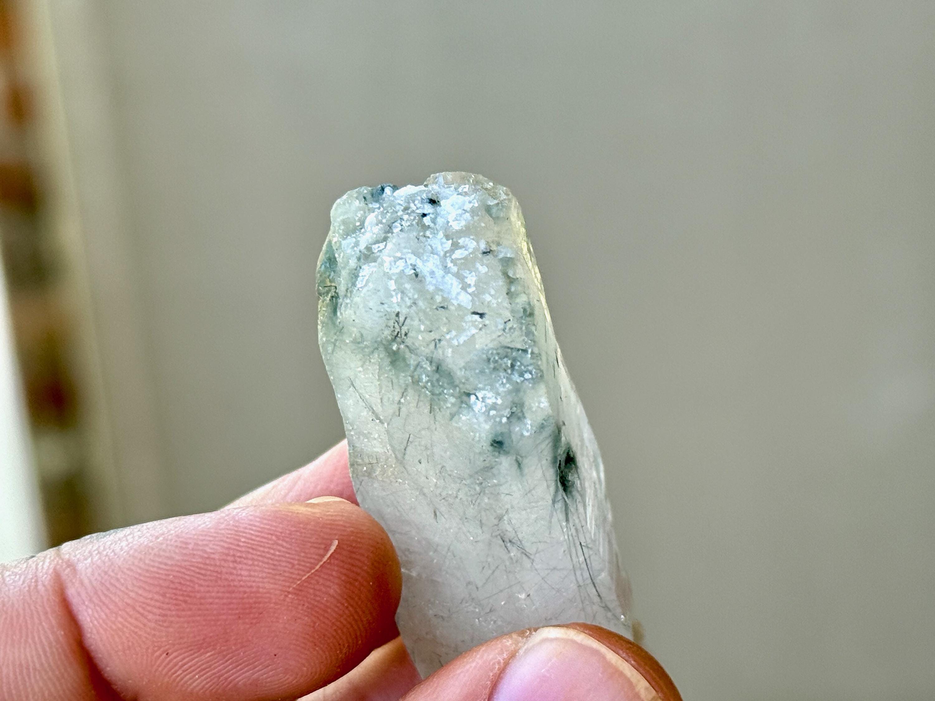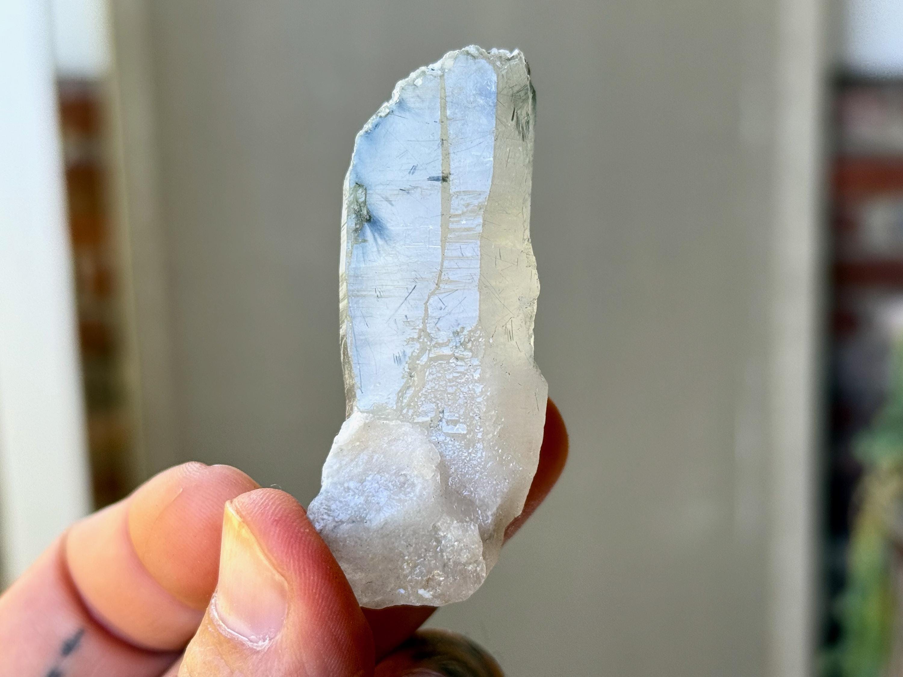 Marvelous, glassy luster to this this Indicolite Quartz crystal with a mildly milky complexion. When backlit, as in Photos 4-5, we can see how beautifully it lights up.
