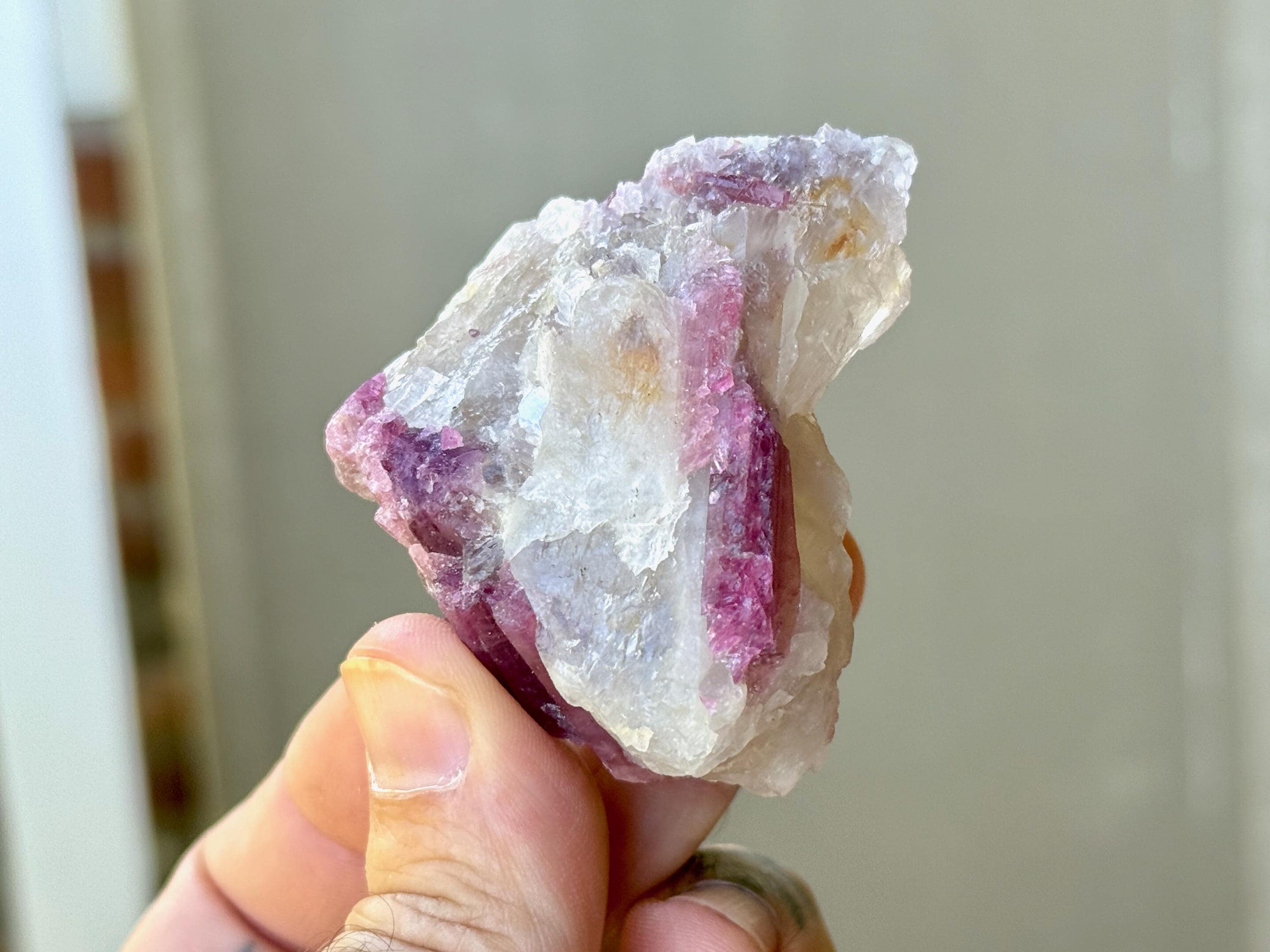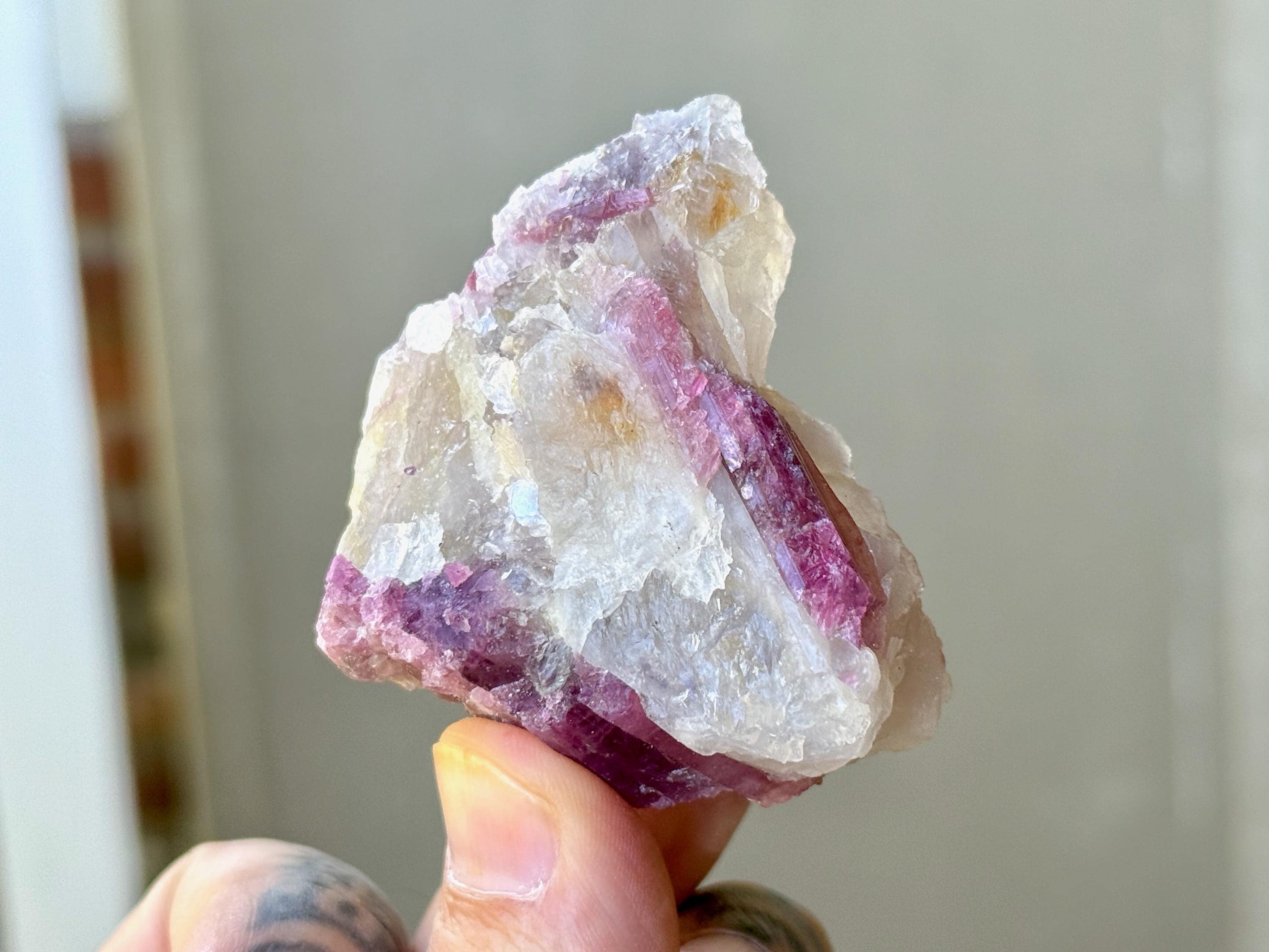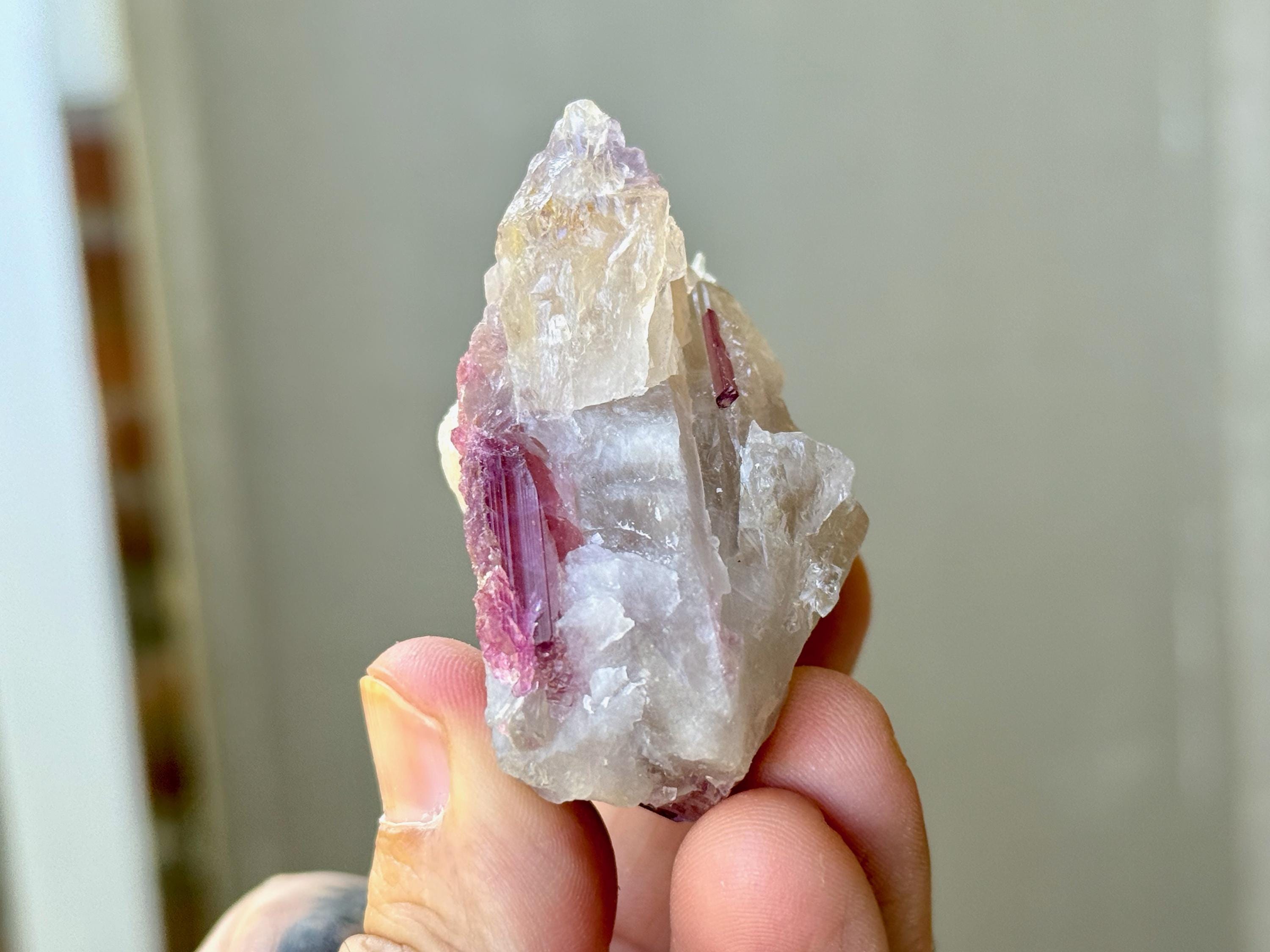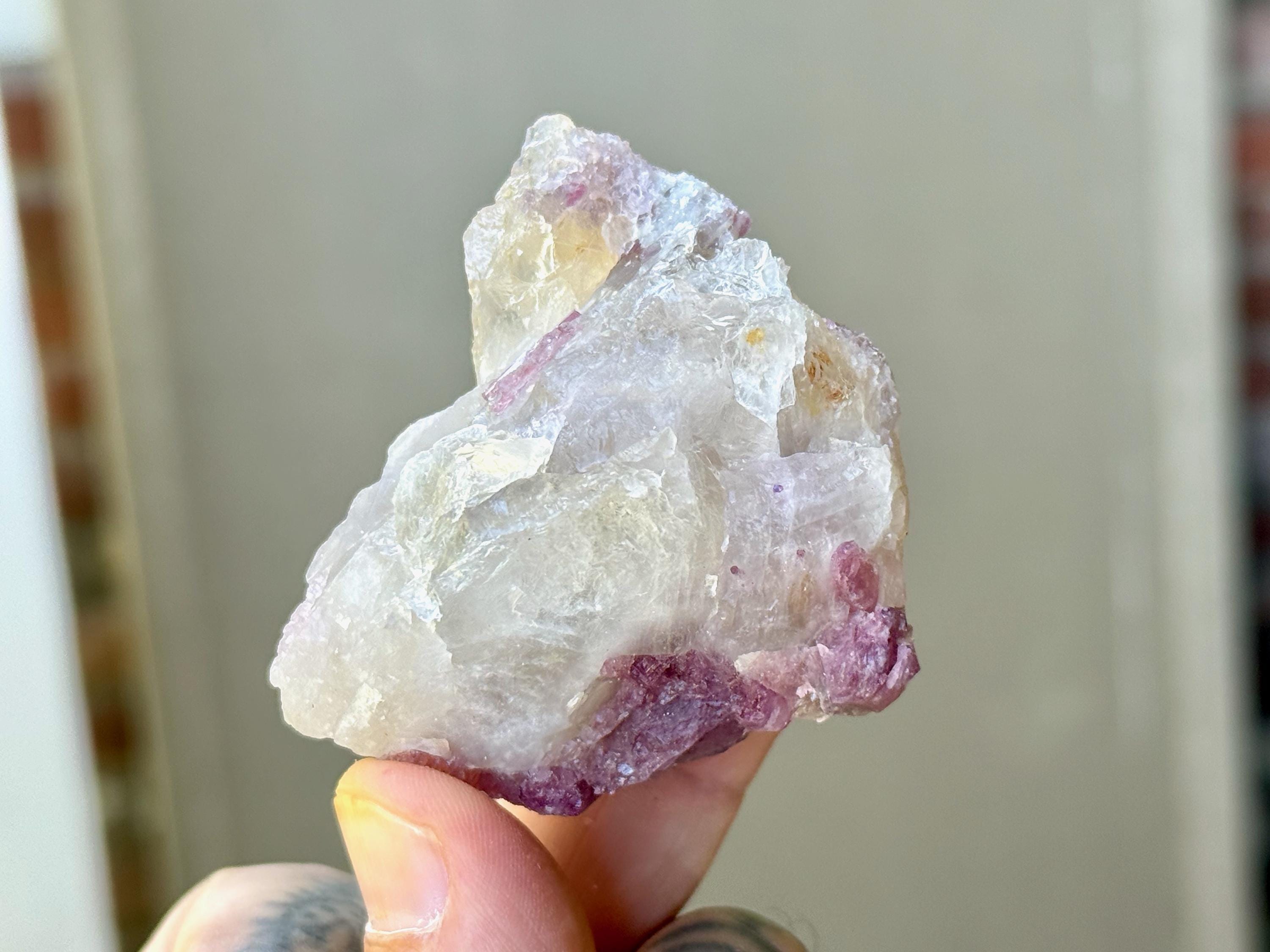 This sweet Unicorn Stone Quartz crystal features a Quartz matrix with some very mild hints of Golden Citrine, embedded into which is a vibrant array of Pink Tourmaline. When backlit, as in Photos 1, 3-4, it lights up brilliantly!