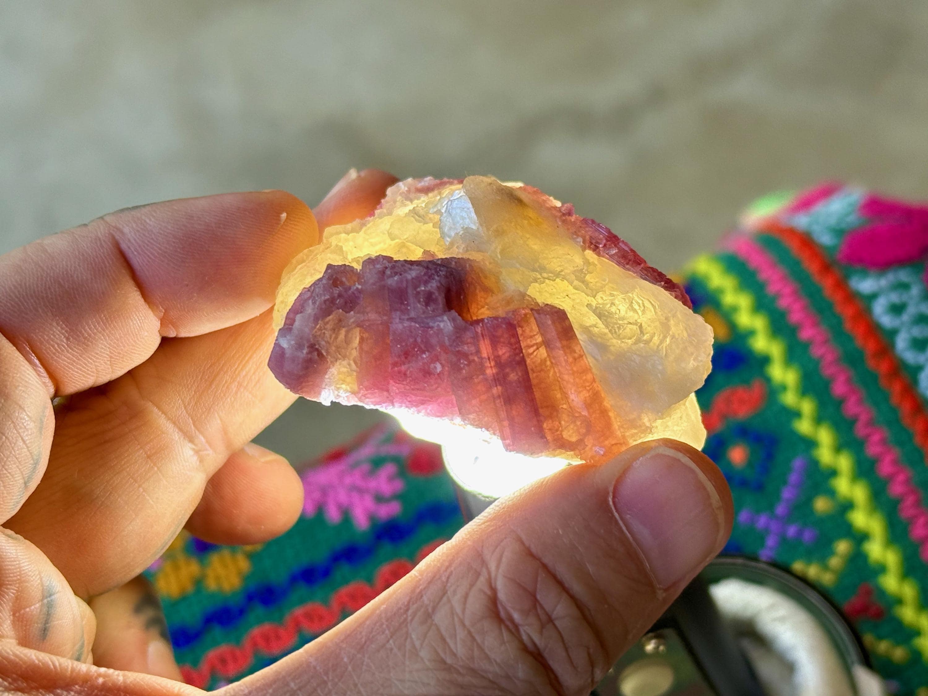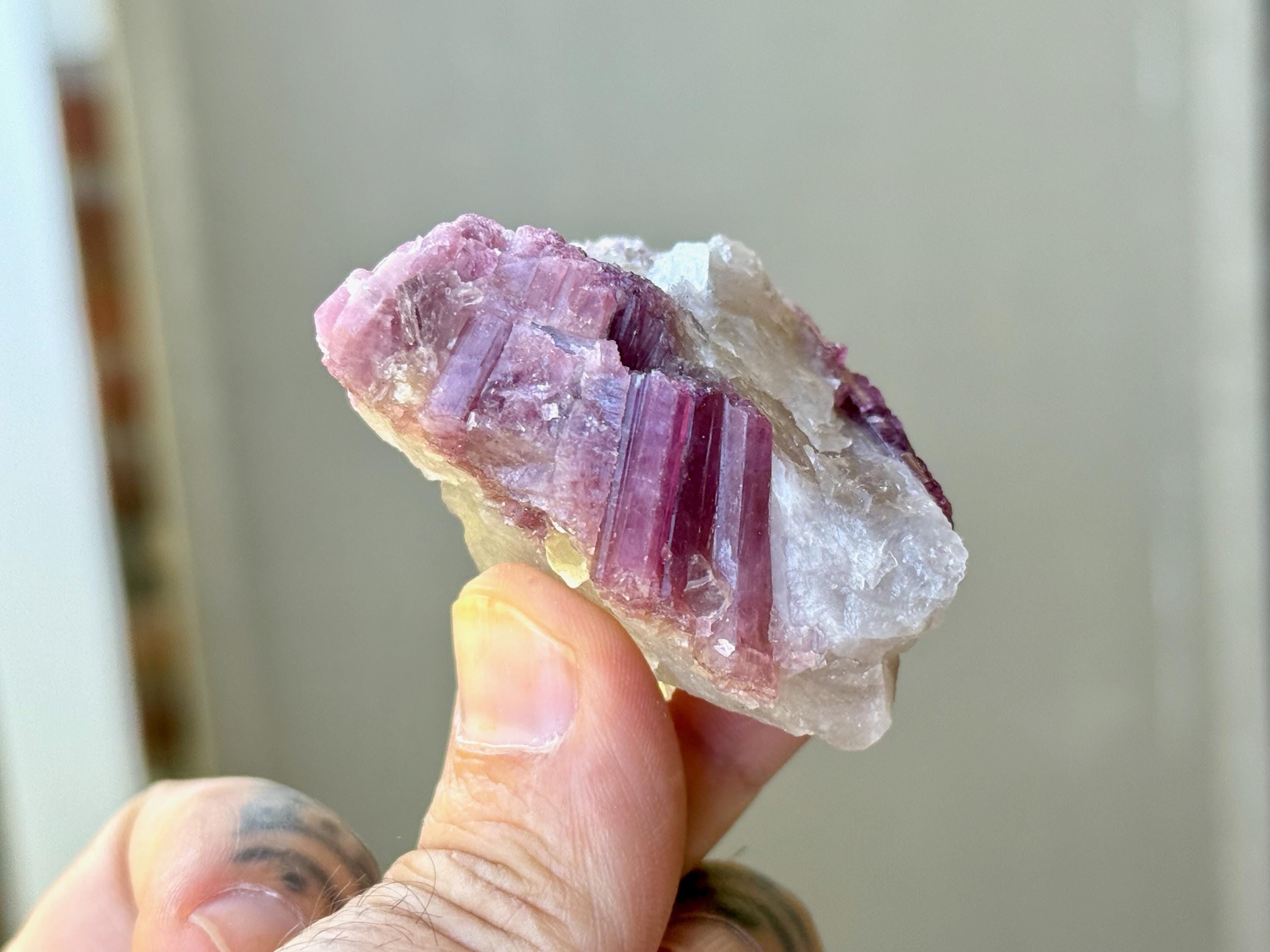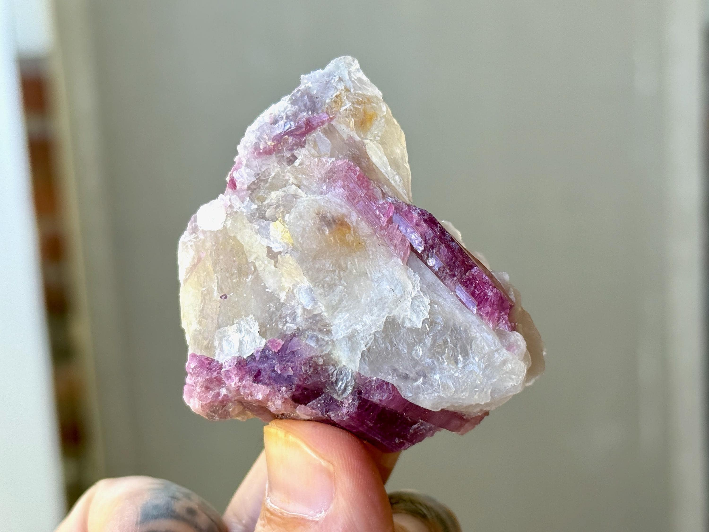 The crystals from this find include unique combinations of Quartz, Citrine, Lepidolite, Albite, Cleavelandite and Feldspar, with vividly colored Tourmalines in lovely hues of green, pink, purple and blue. Crystals with combinations of these minerals are sometimes referred to as "Unicorn Stones."