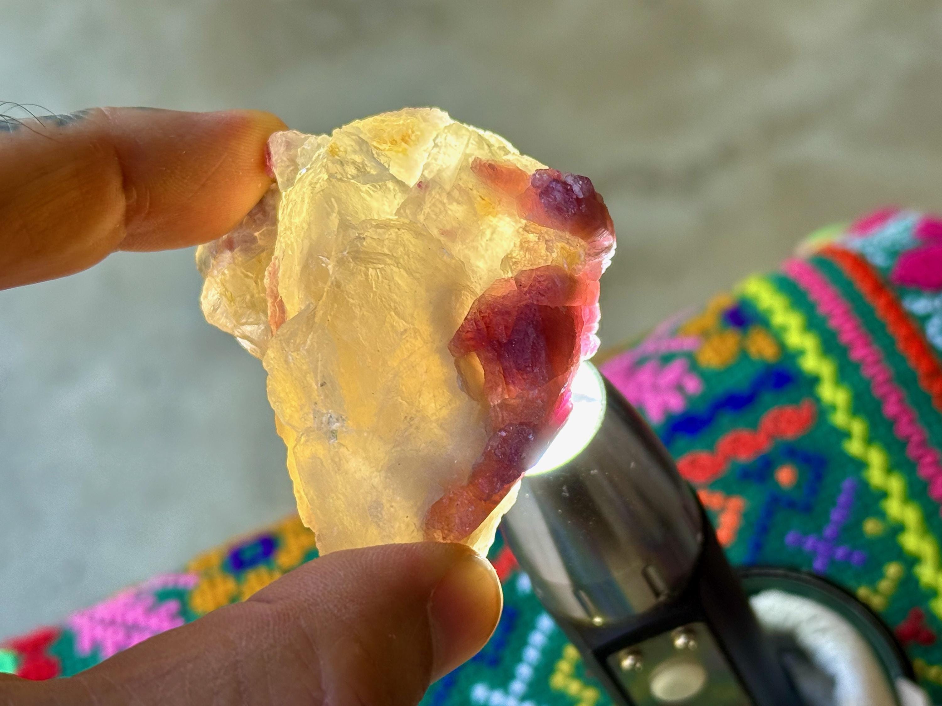 This piece is a chunky, non-traditional formation, but it is mostly self-healed all around. Very colorful and beautiful!