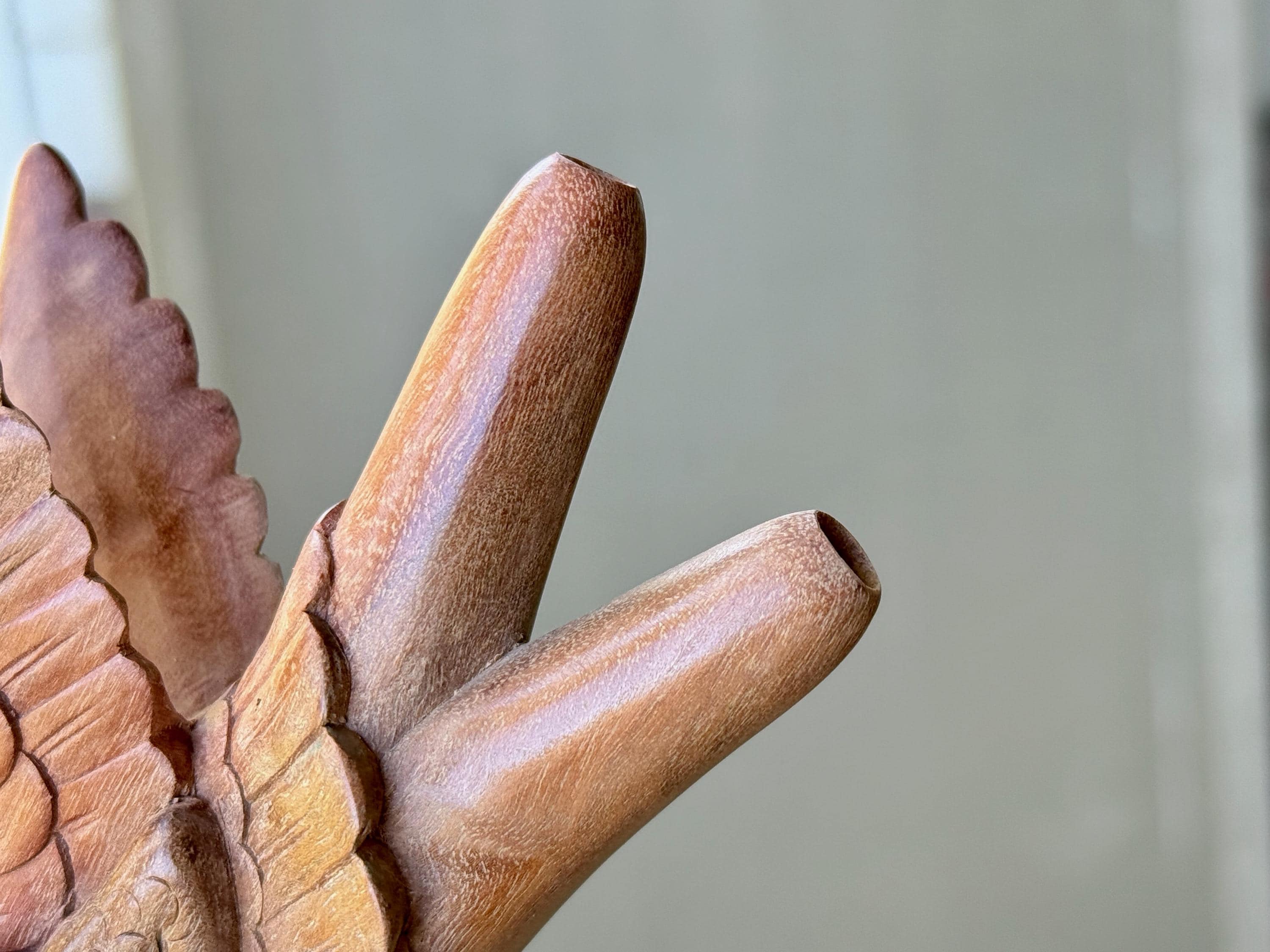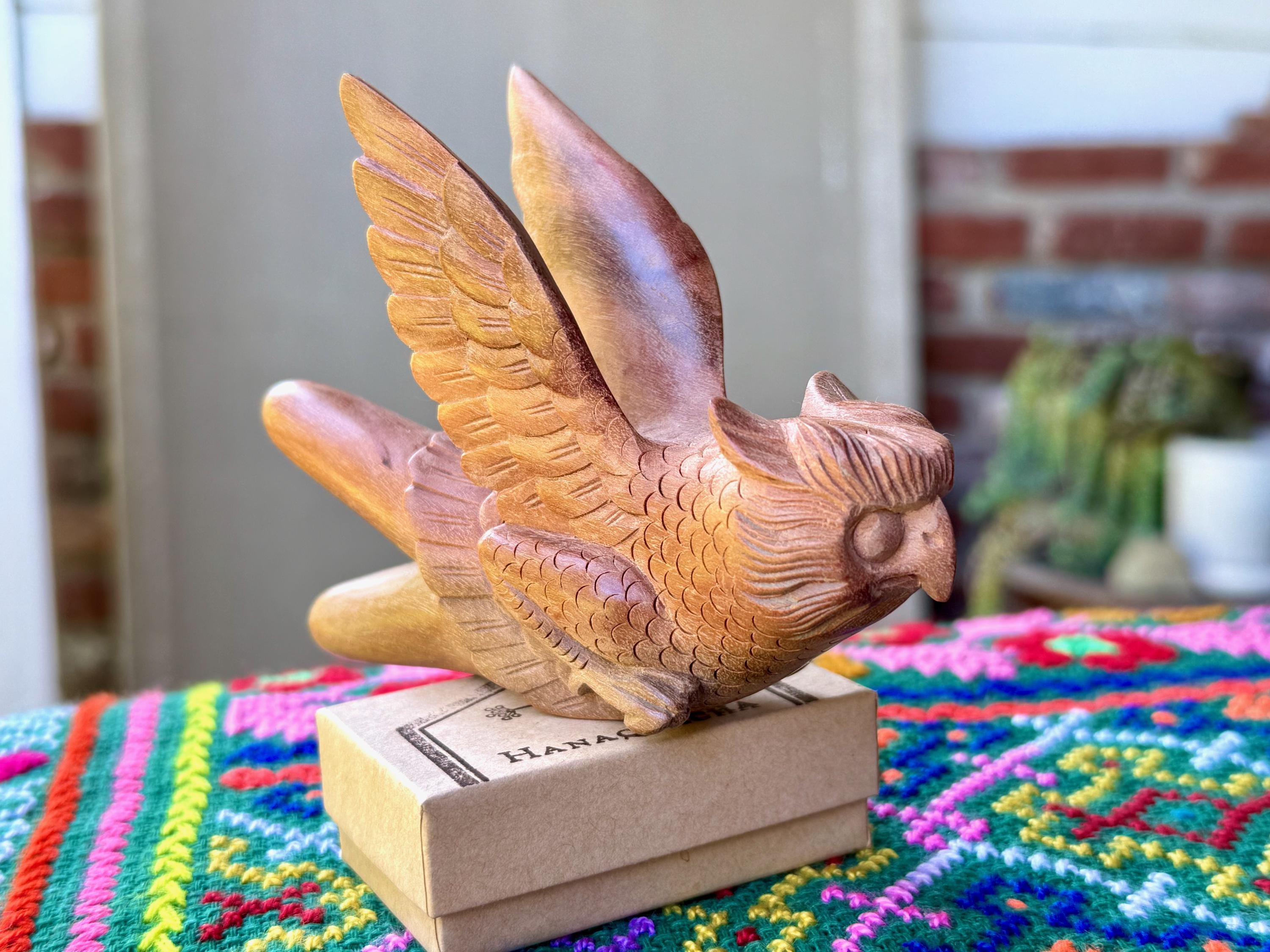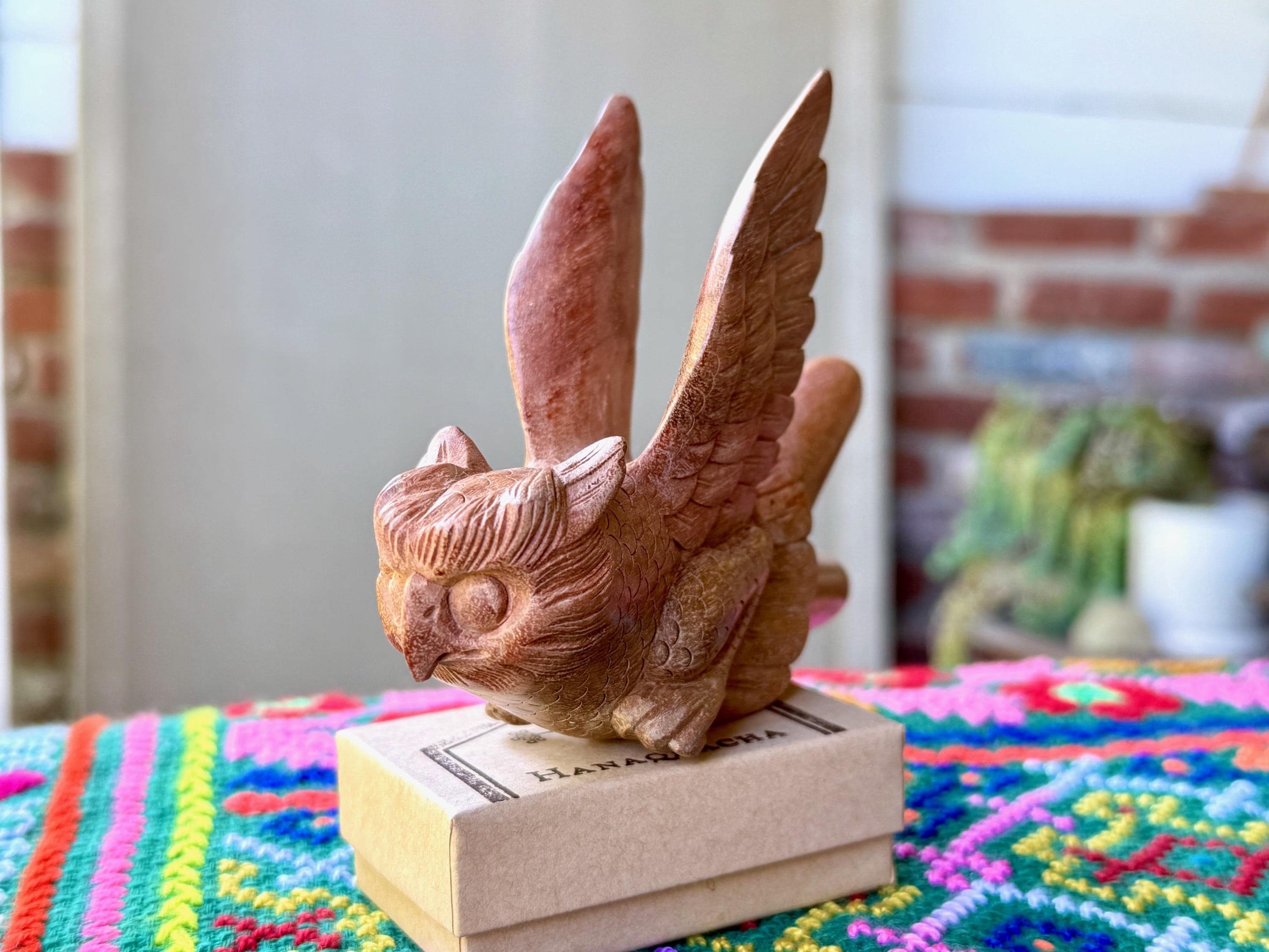 The wise and fierce protector, this Owl in flight is absolutely stunning! We love the warmth of the light tan Sawo Wood with just a tinge of reddish hue. The attention to detail is extraordinary, every feather in the wings is hand carved! A powerful and beautiful medicine tool.