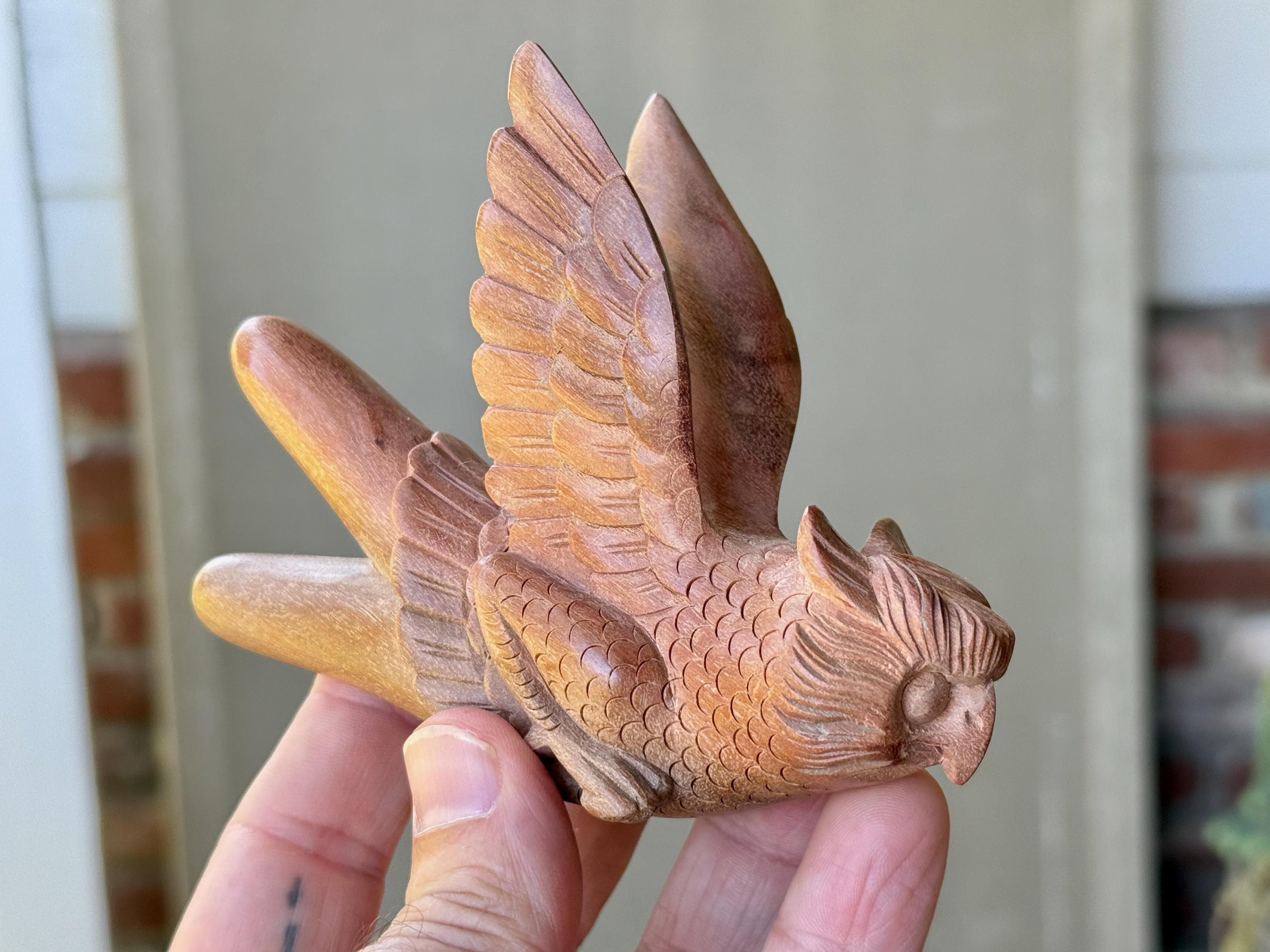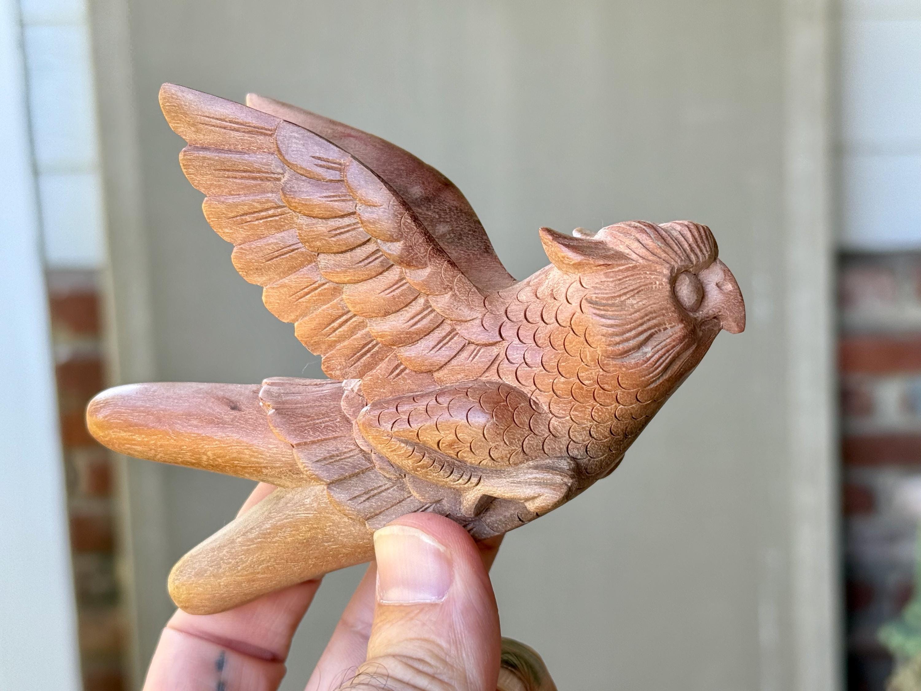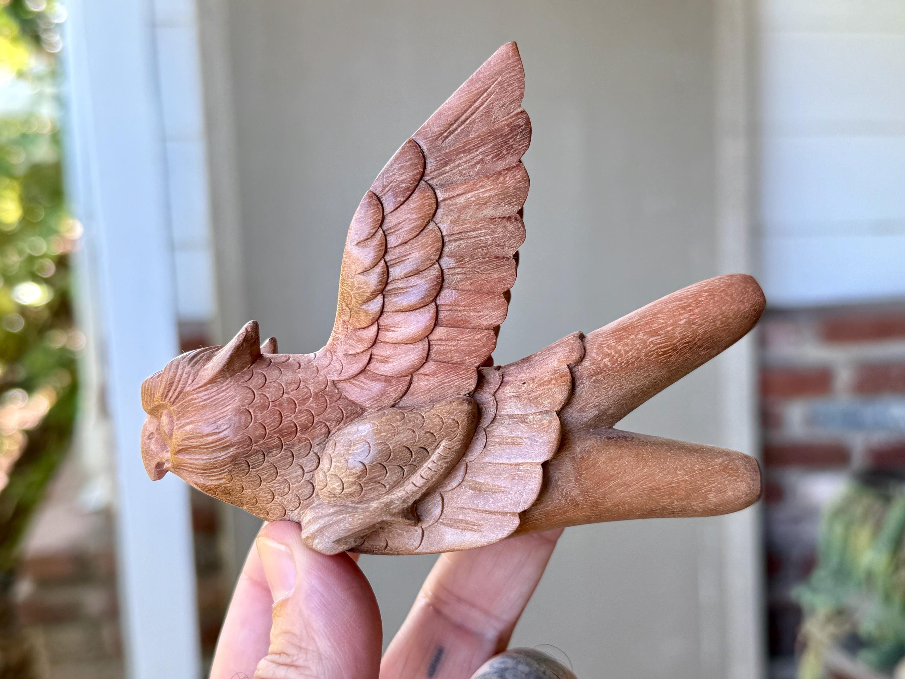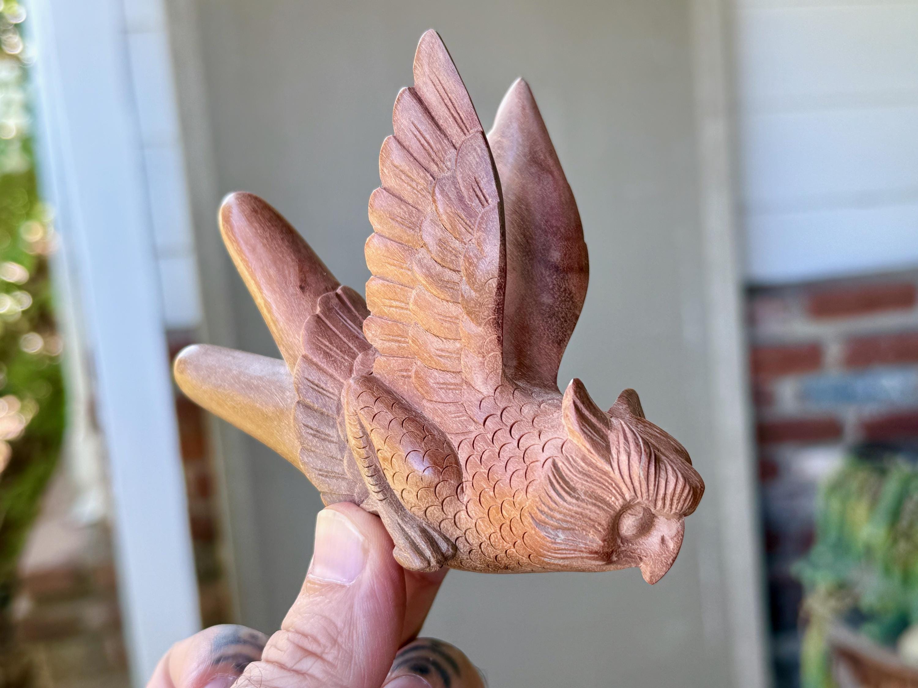 The wise and fierce protector, this Owl in flight is absolutely stunning! We love the warmth of the light tan Sawo Wood with just a tinge of reddish hue. The attention to detail is extraordinary, every feather in the wings is hand carved! A powerful and beautiful medicine tool.