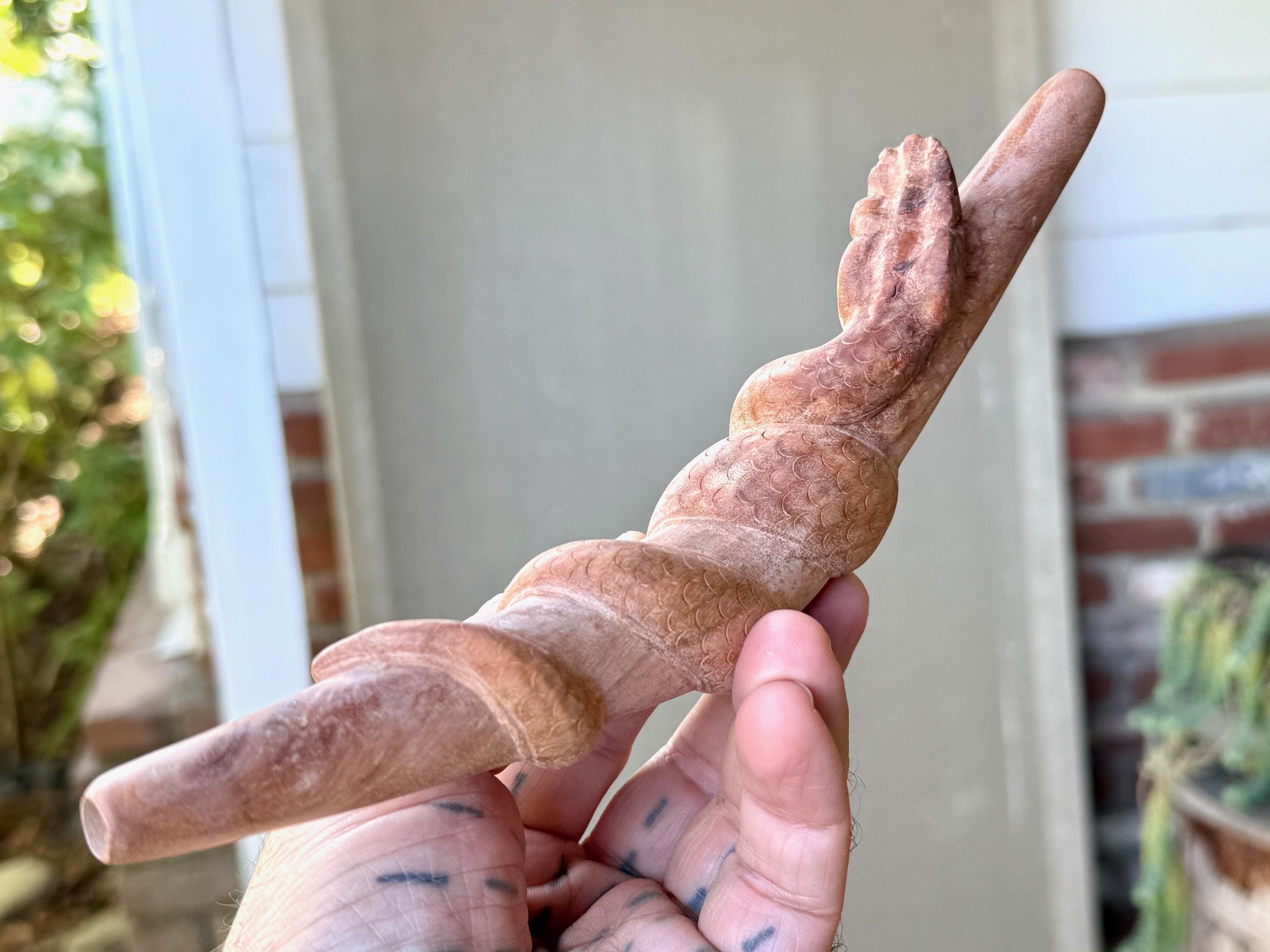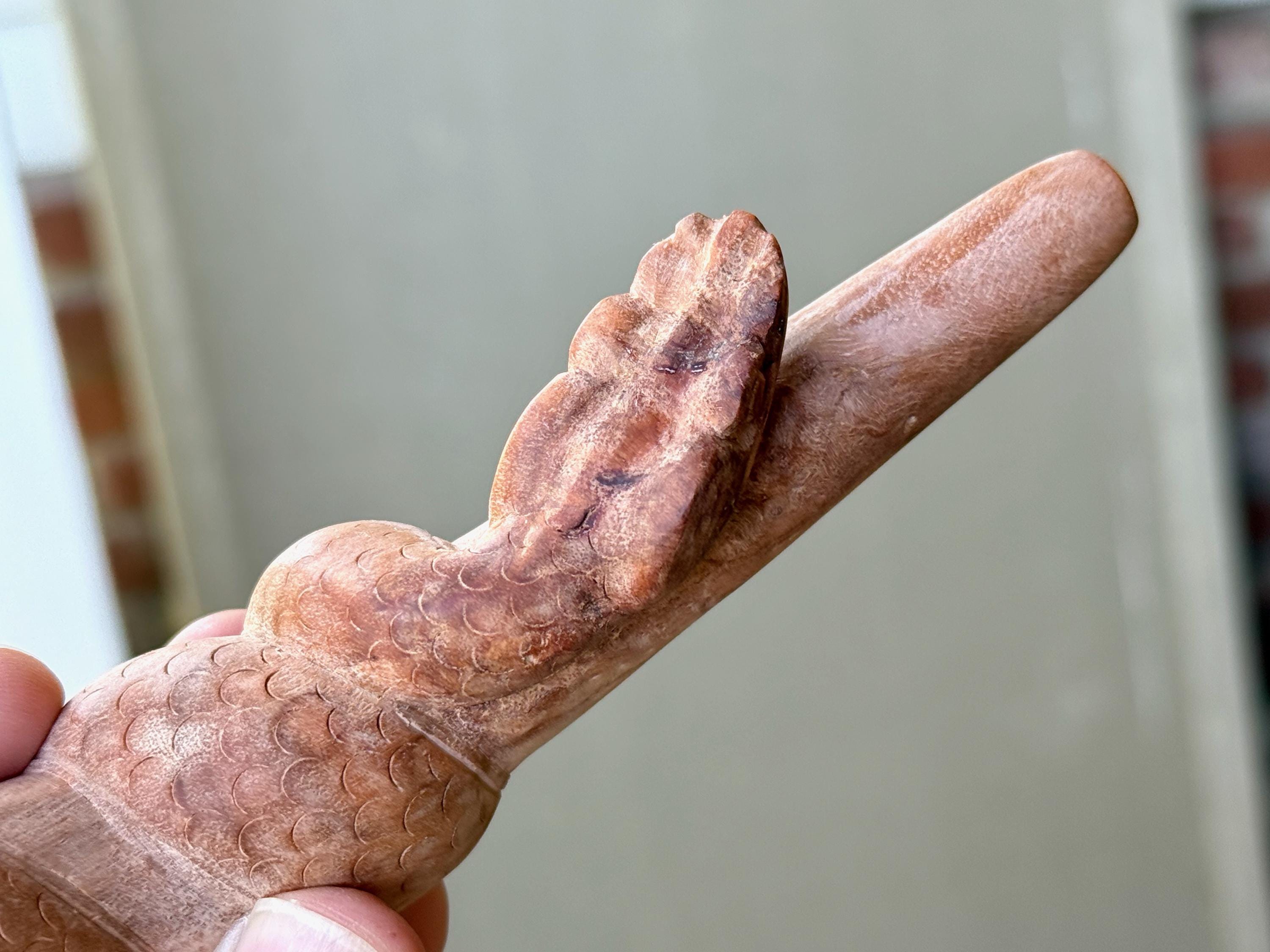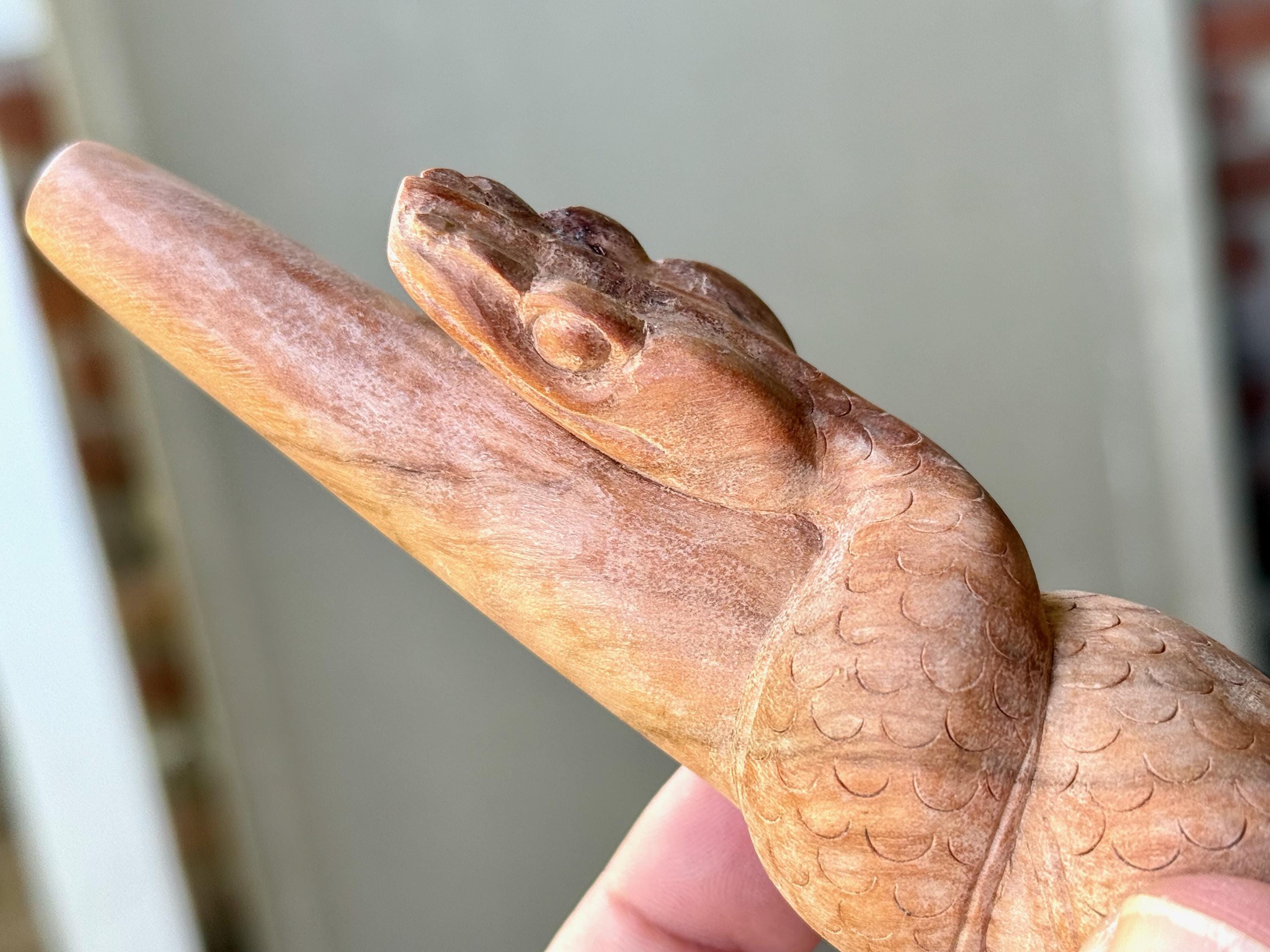 One of our favorite tepi designs because of its simple elegance, and also because it features the Mama Serpent! Beautiful lines and lovely detail to this powerful medicine tool carved from a single piece of natural, tropical hardwood. We love the natural finish of the wood and the subtle marbling. A powerful tool for shamanic ceremony.