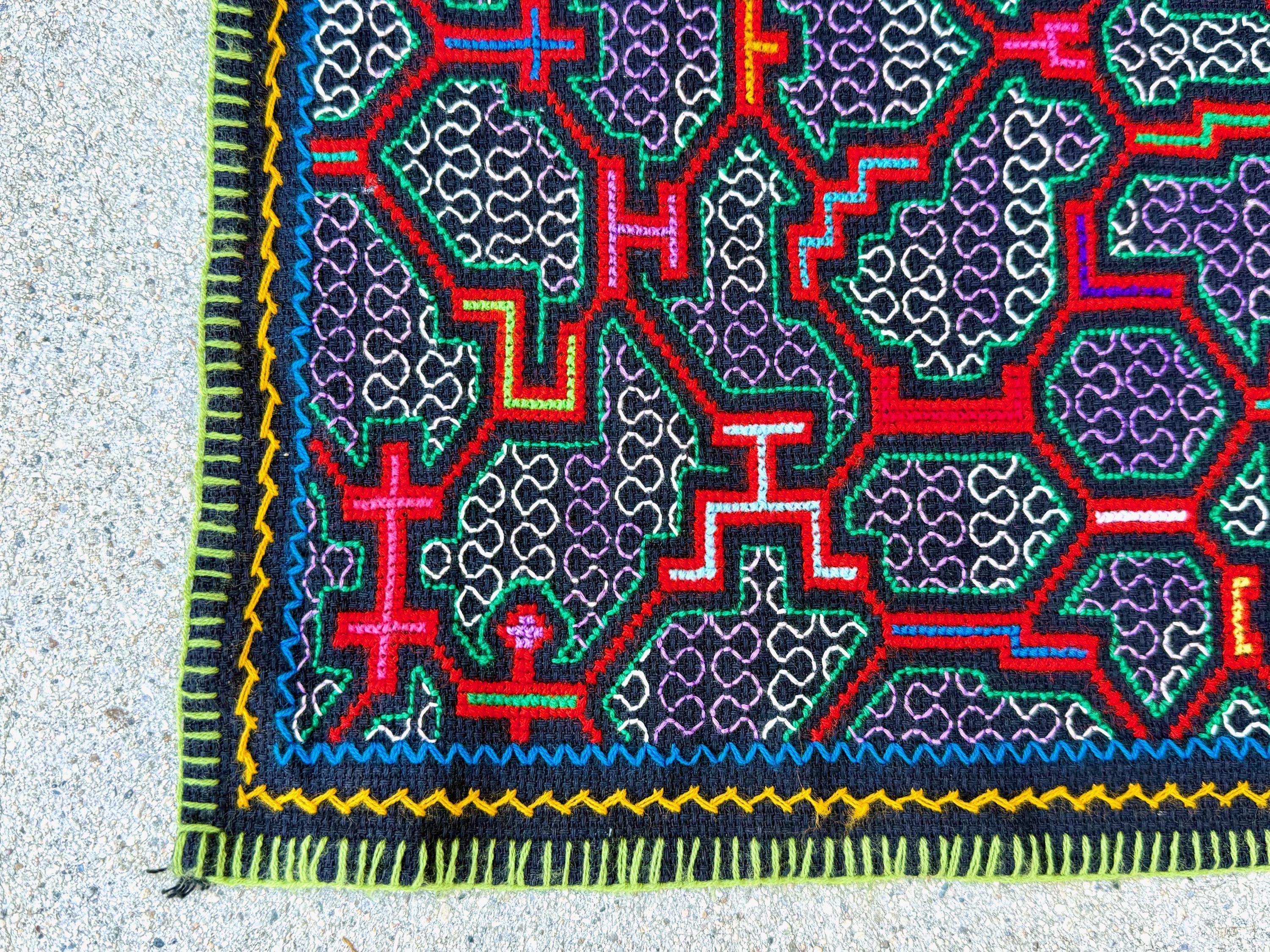 Gorgeous design and intricate kene embroidery to this beautiful manta cloth! We love the fiery orange and red embroidery against the black background!