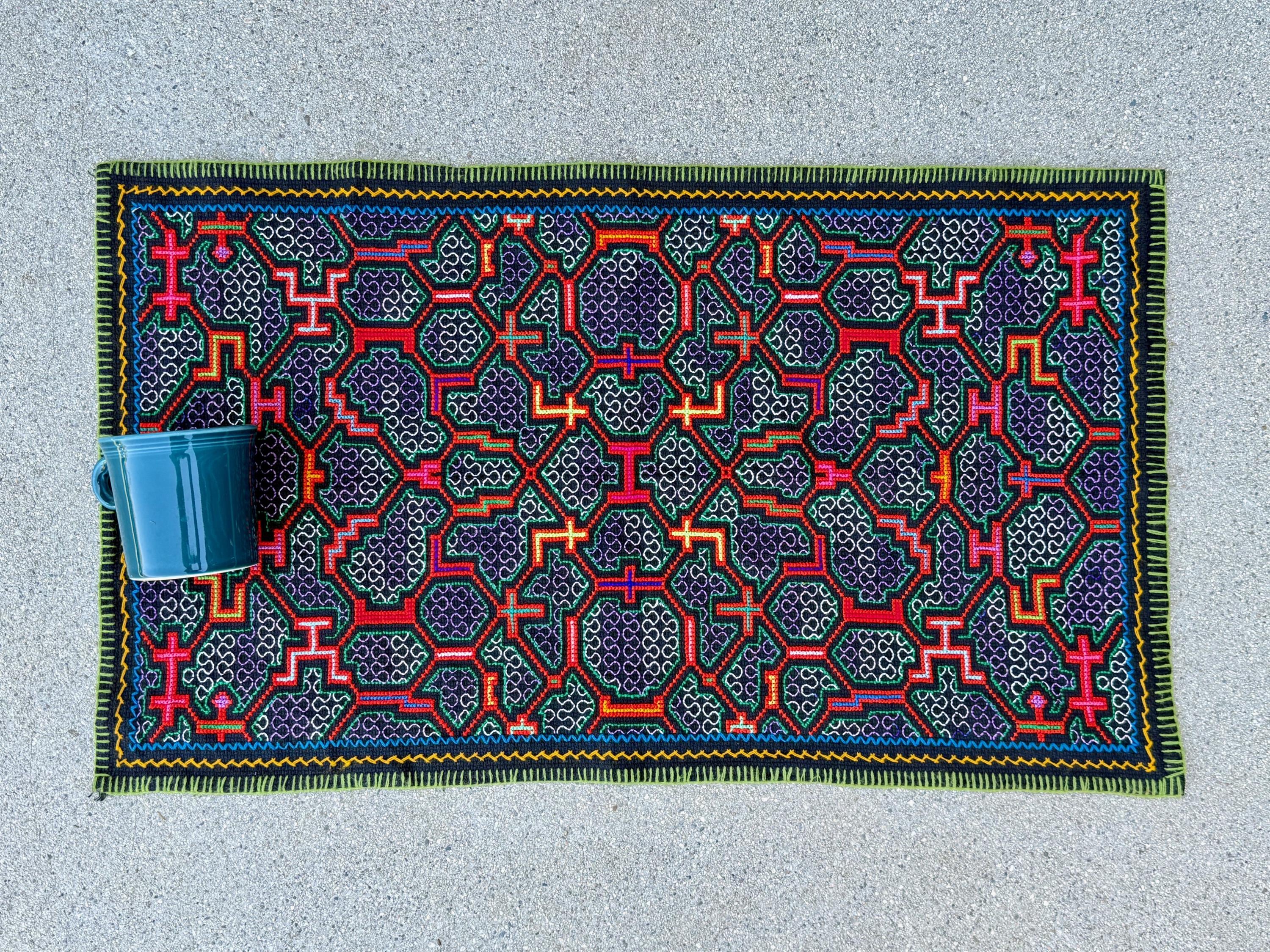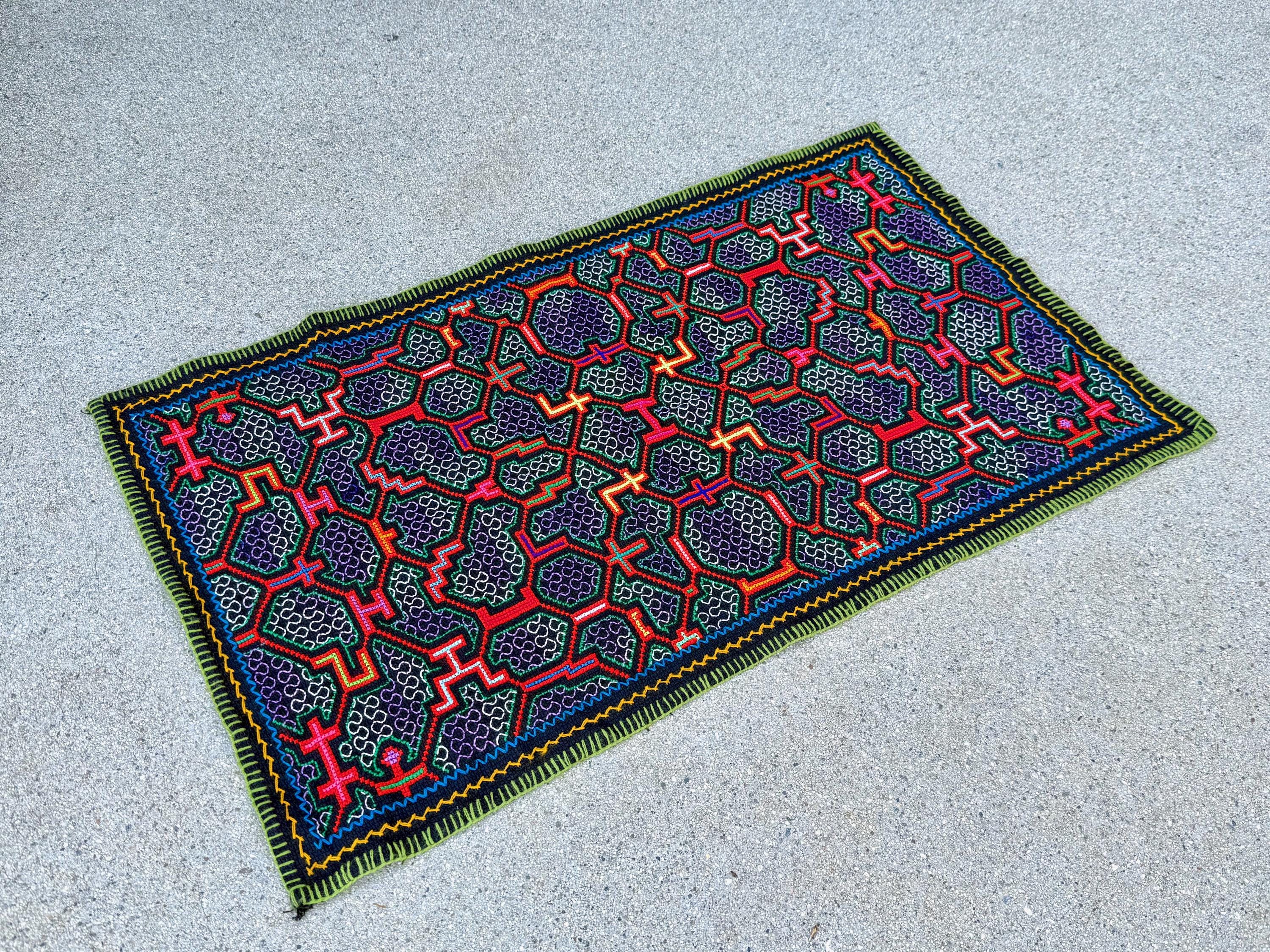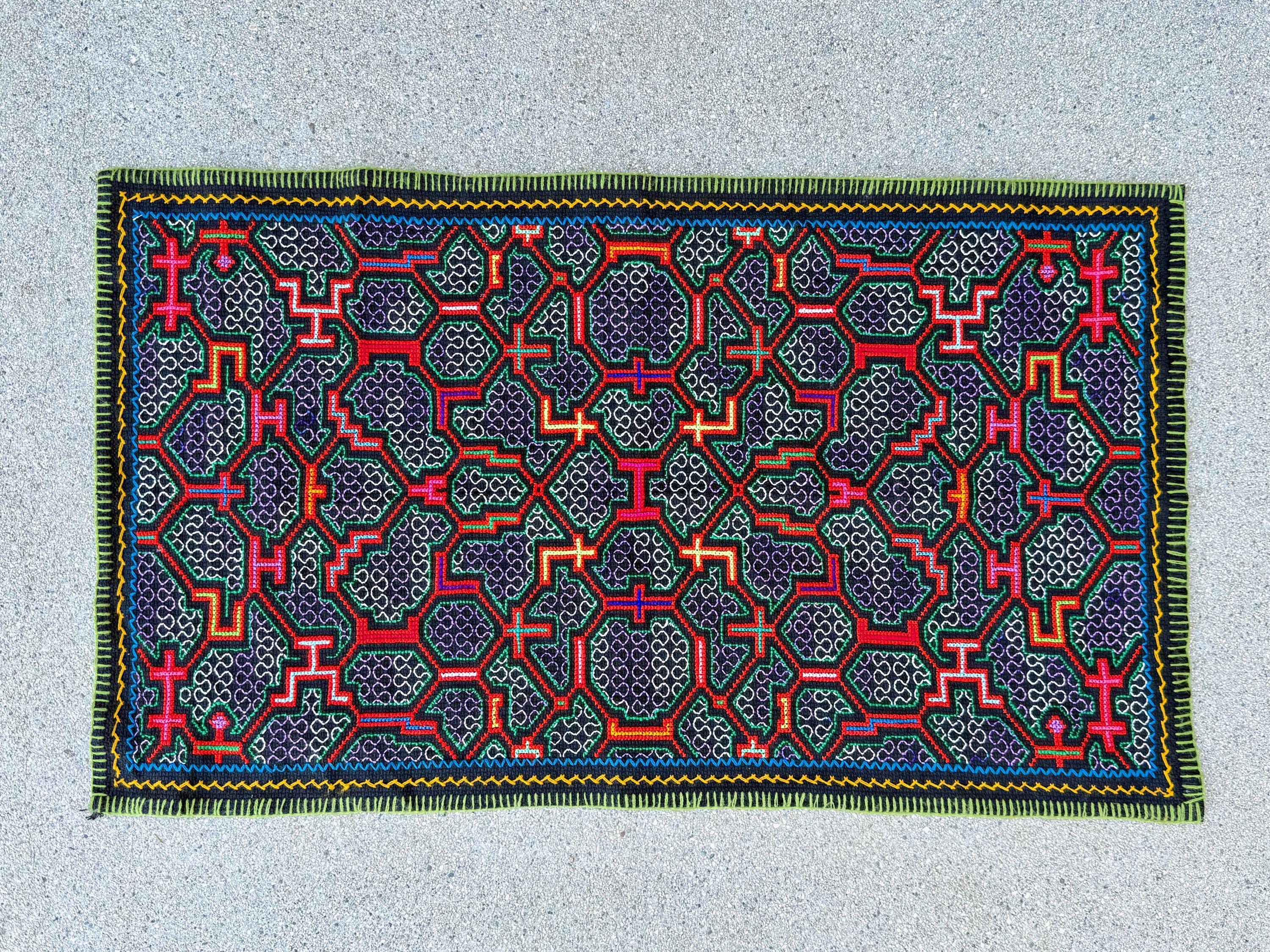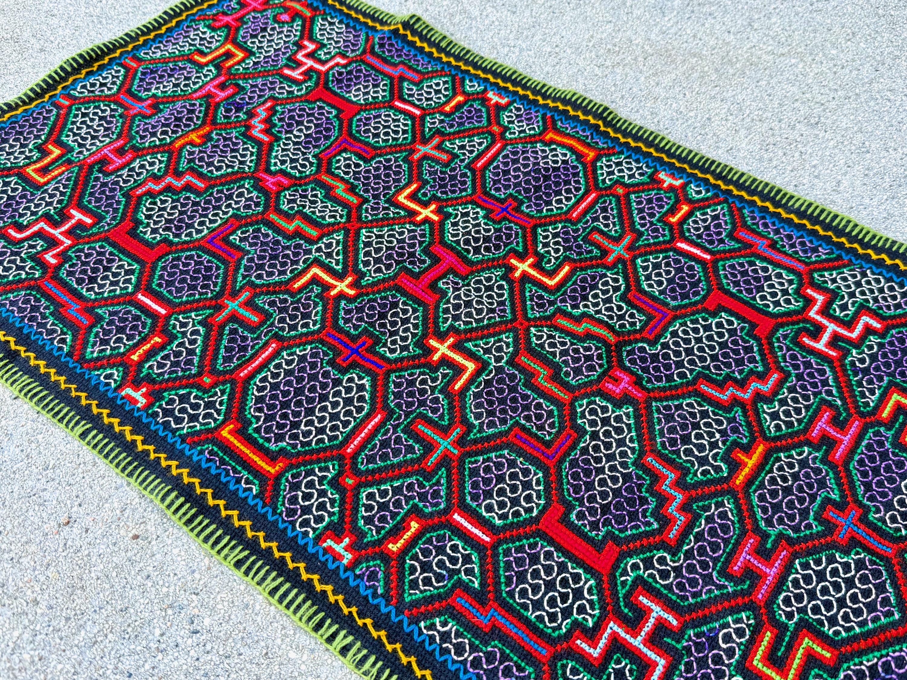 This beautiful manta cloth was hand-embroidered by the talented Peruvian artisan Laura Rengifo in Pucallpa, Peru.
