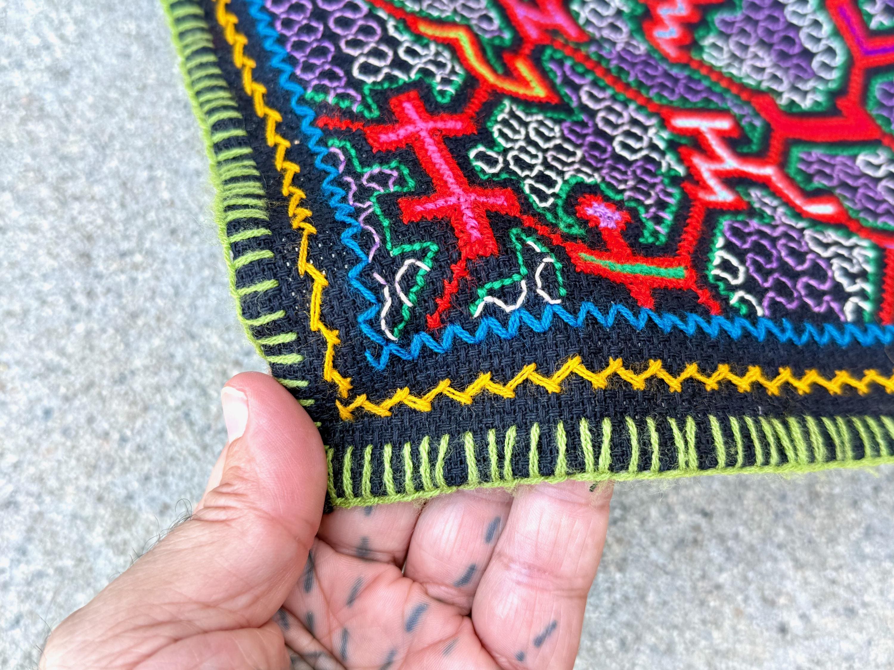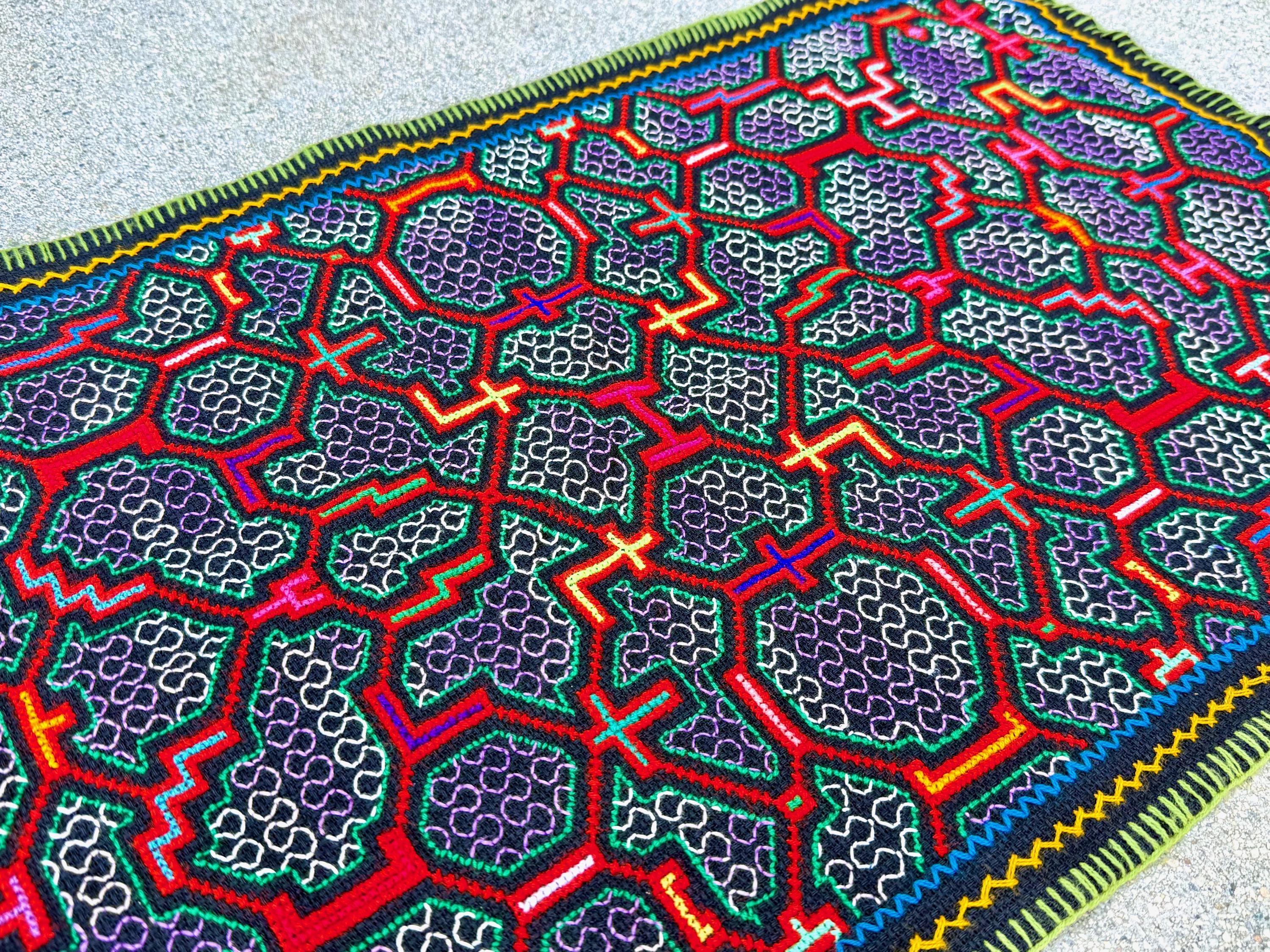 These embroidered cloths are traditional to the Shipibo-Conibo and are artistic expressions of medicine songs (icaros), that bring the energies of the plants they represent to life with their exquisite patterning and designs (kene). These powerful songs are sung during their creation, imbuing each stitch with the beauty and energy of the plant icaro.