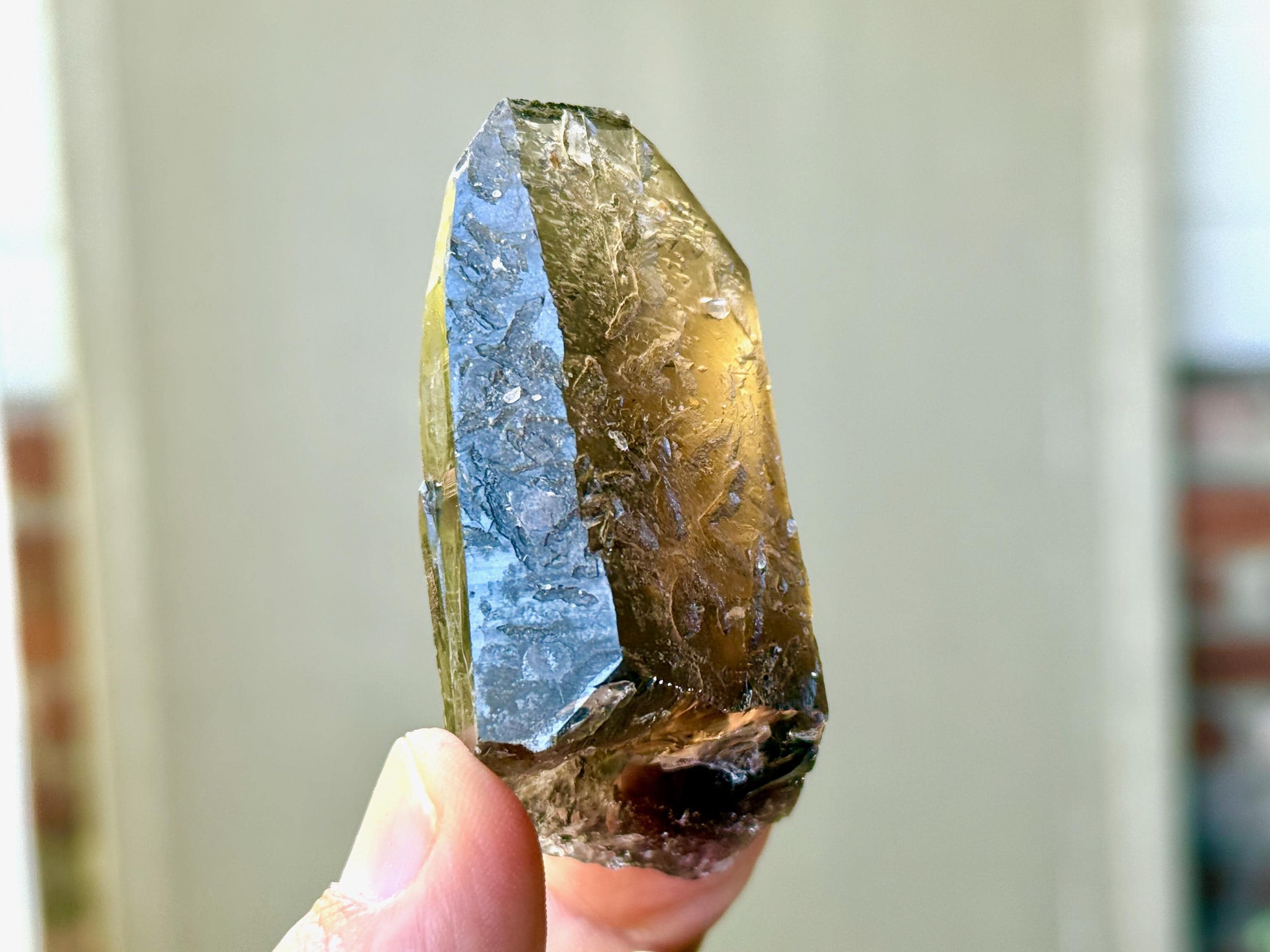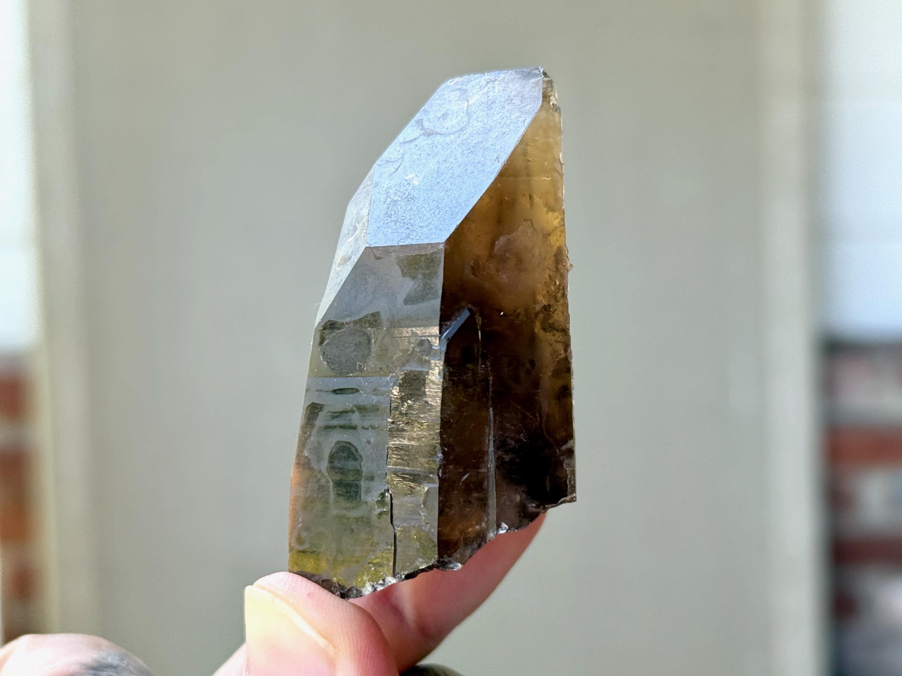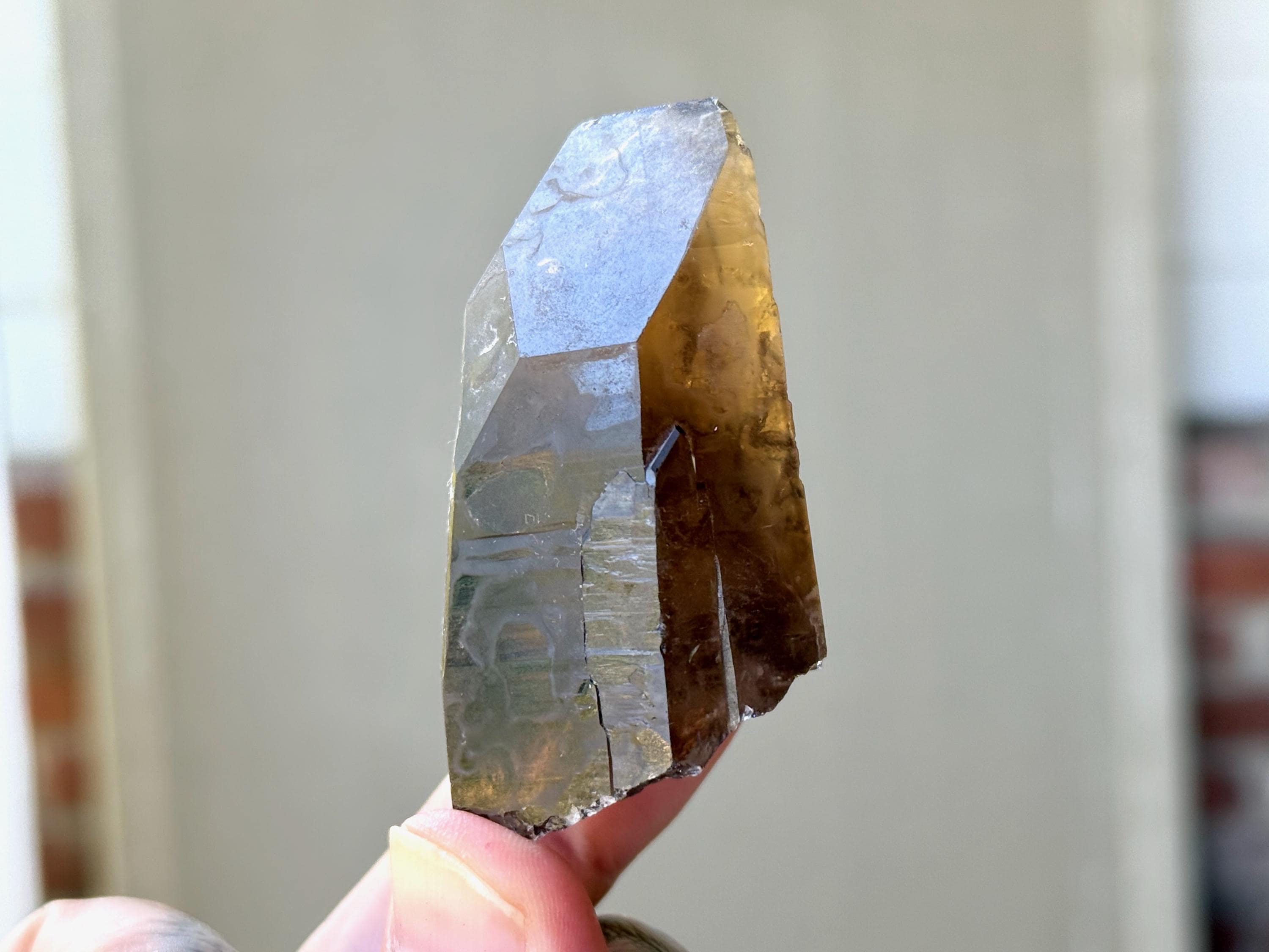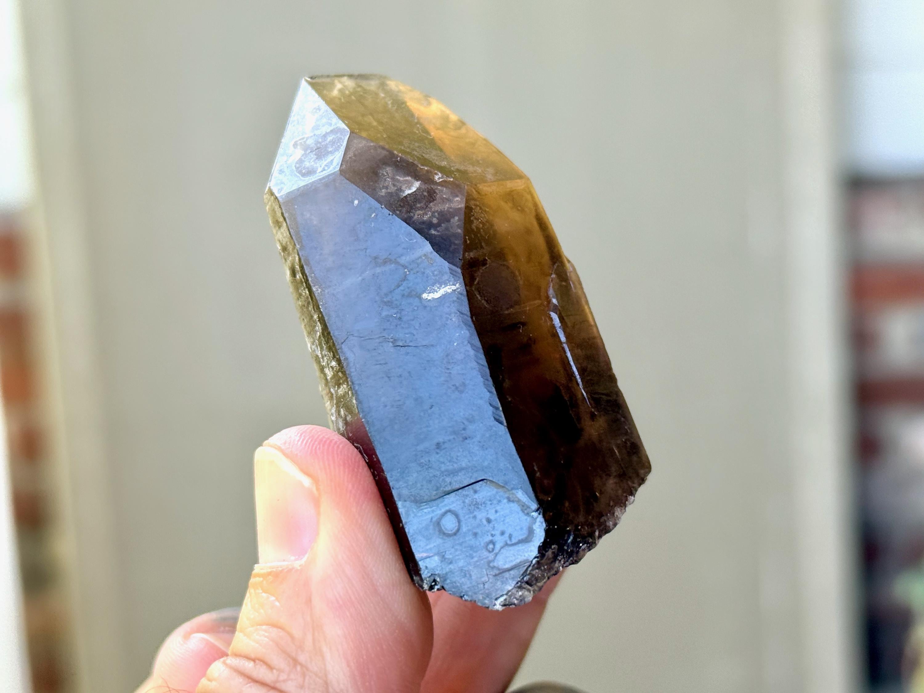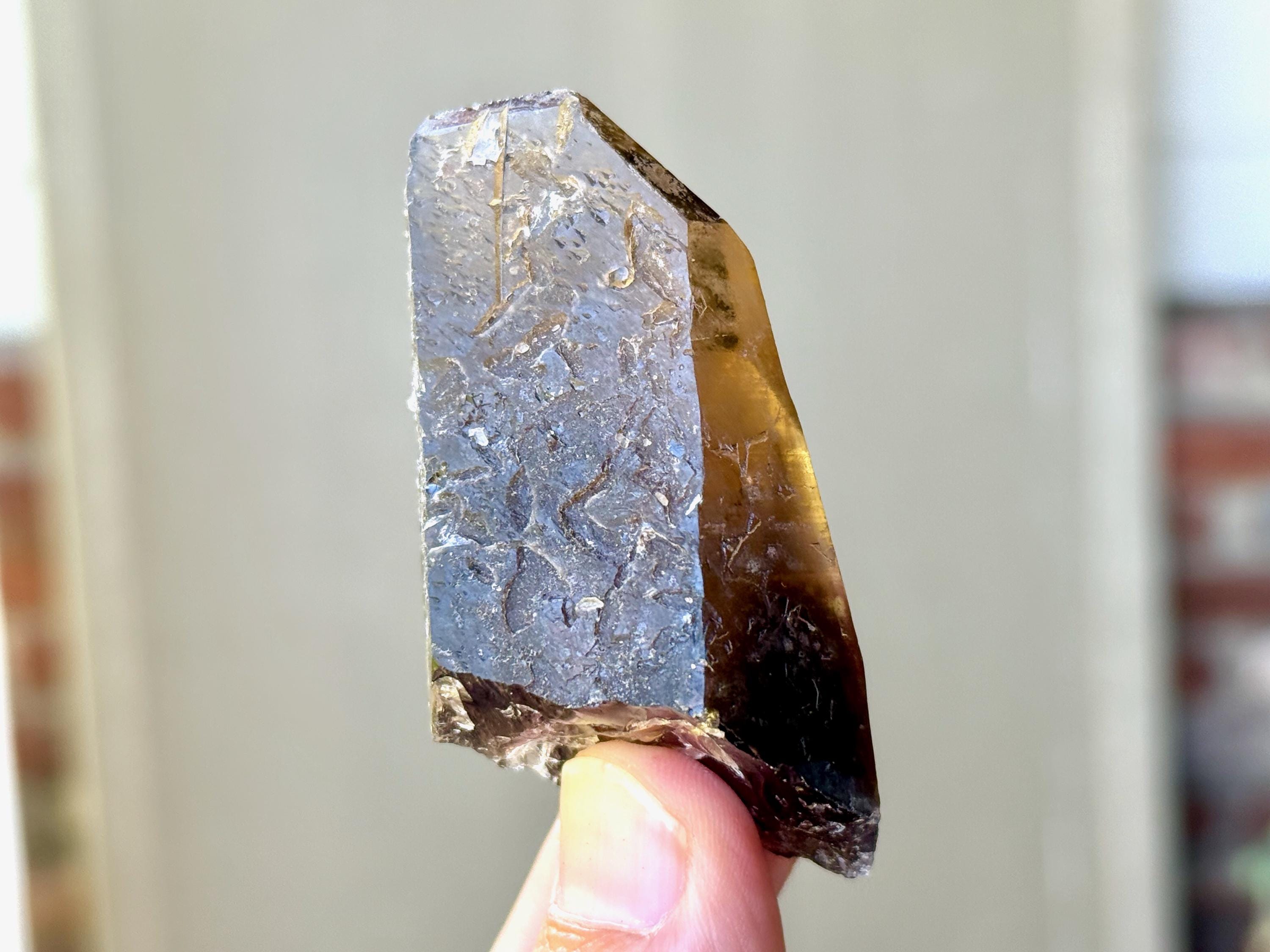 This crystal possesses the gradient hue we love to see on these crystals, with a dark smokiness at the base that becomes more clear and golden toward the top. It features mild horizontal striations on the front and left sides, and textural imprints on the back that are characteristic of these crystals.