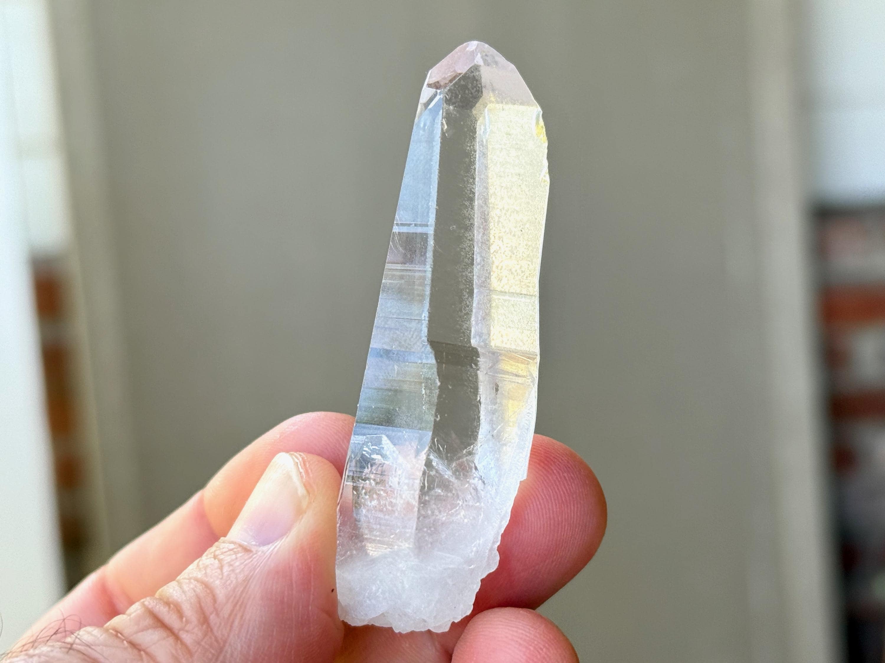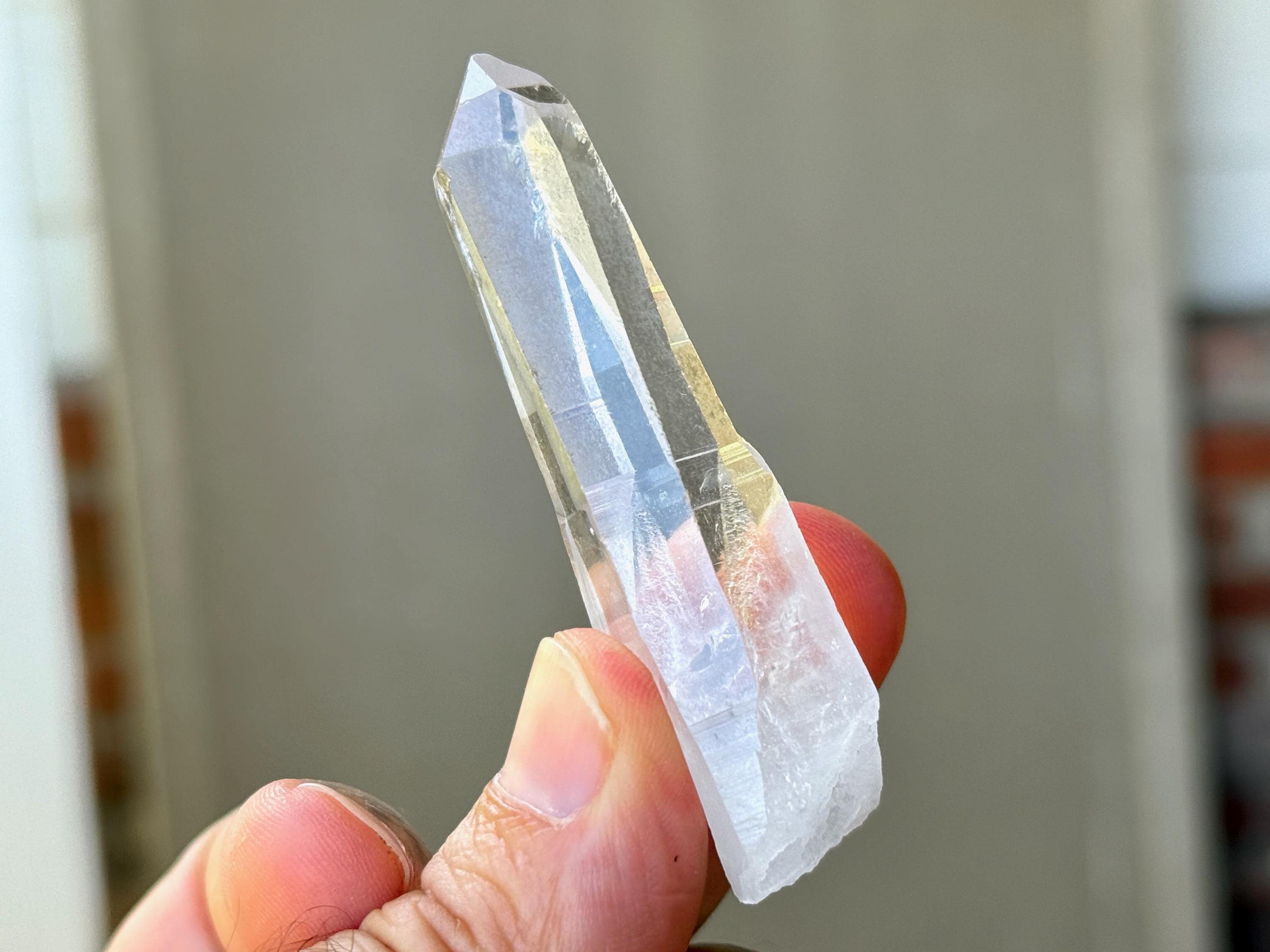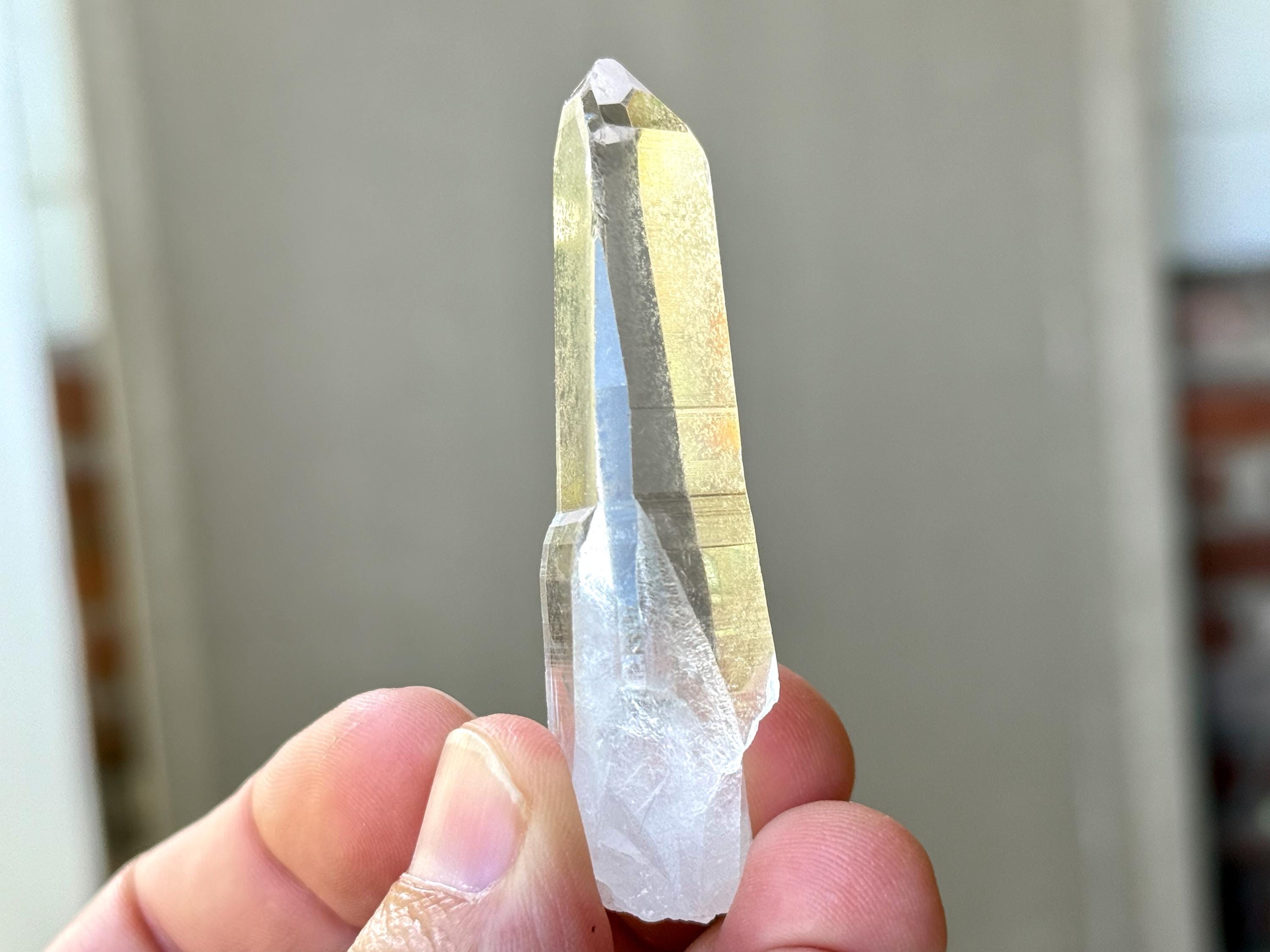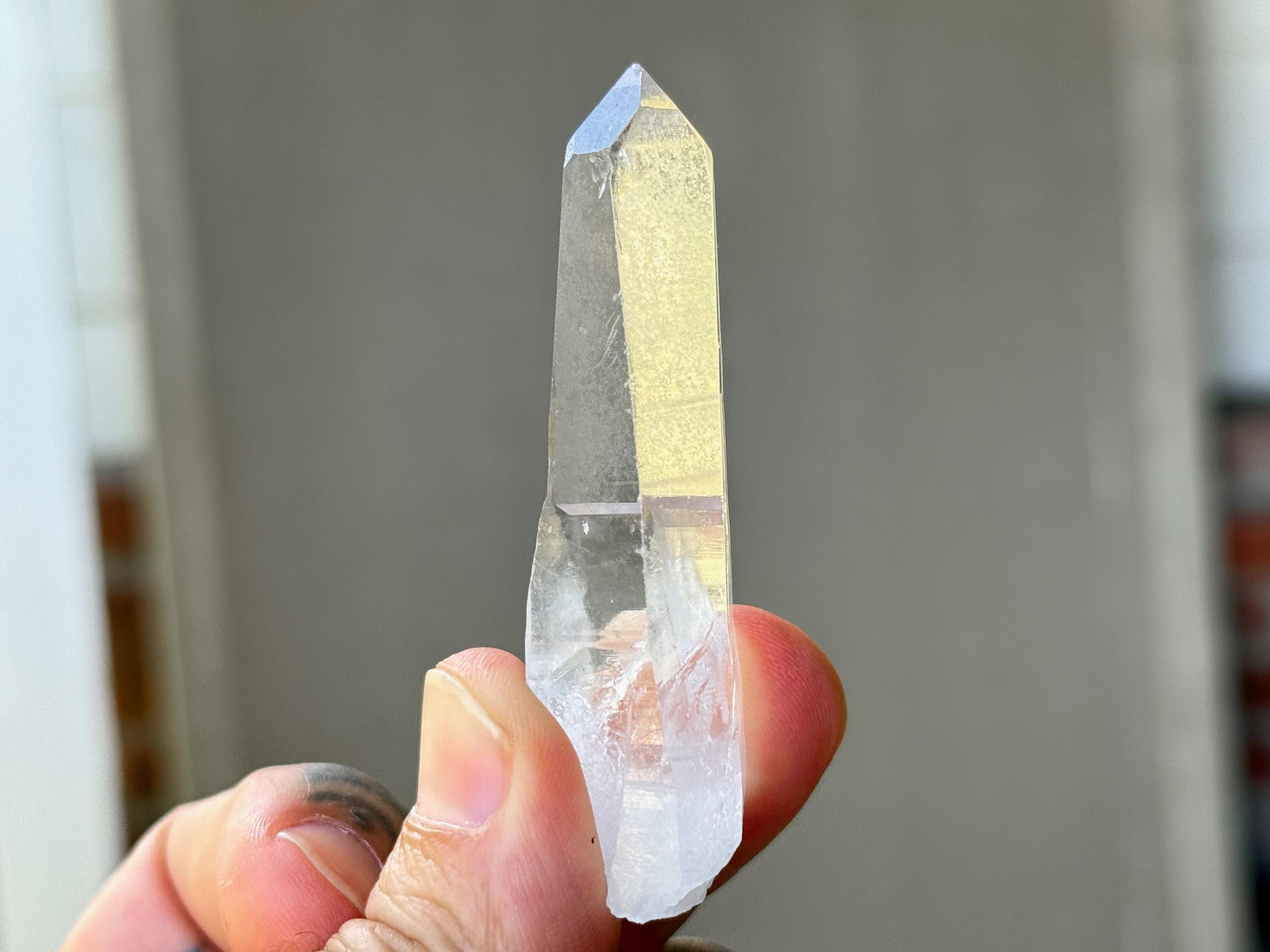 *Please note this crystal is clear and colorless. Any yellow hues in the photos are due to the natural sunlight reflecting off the crystal.