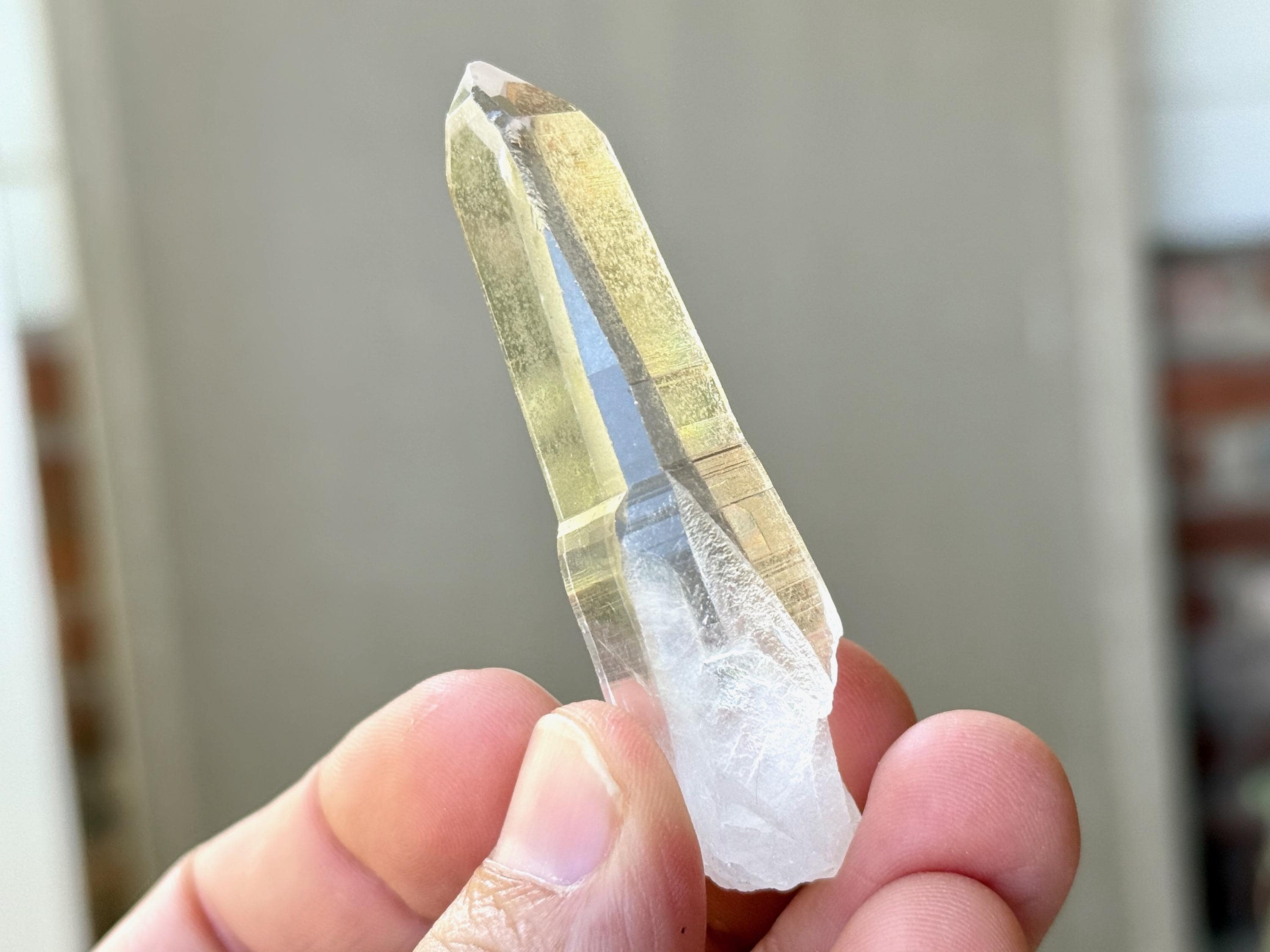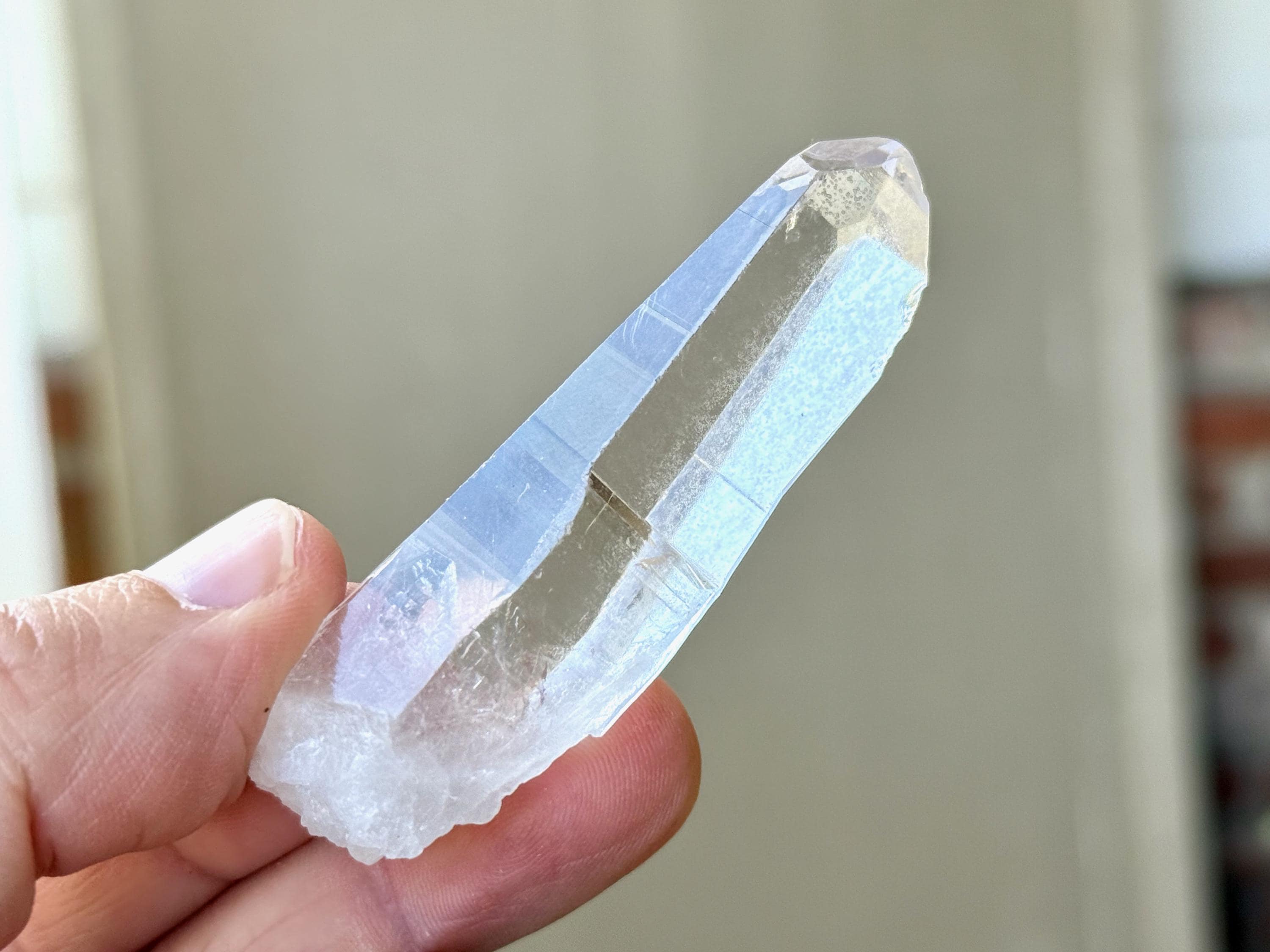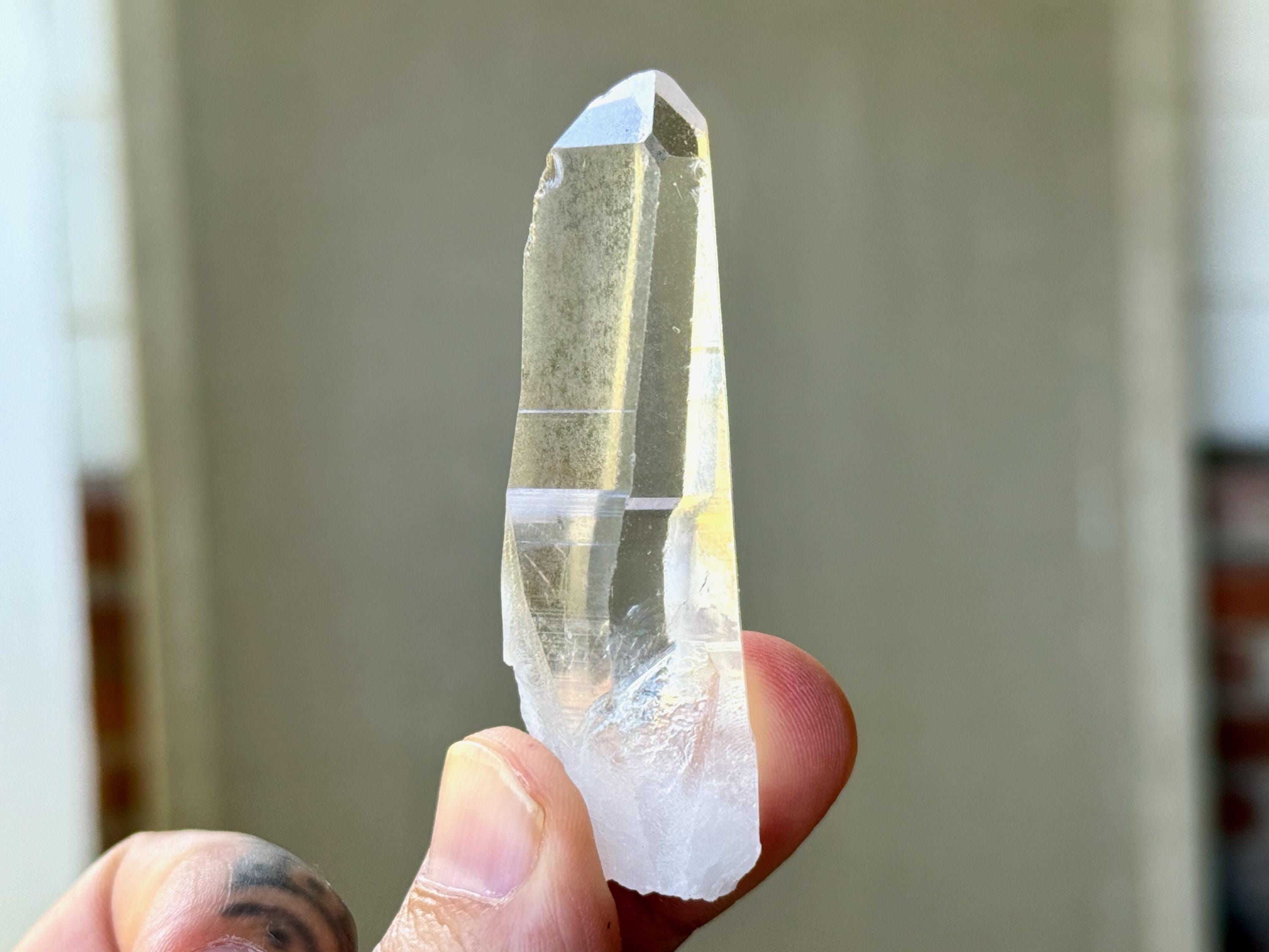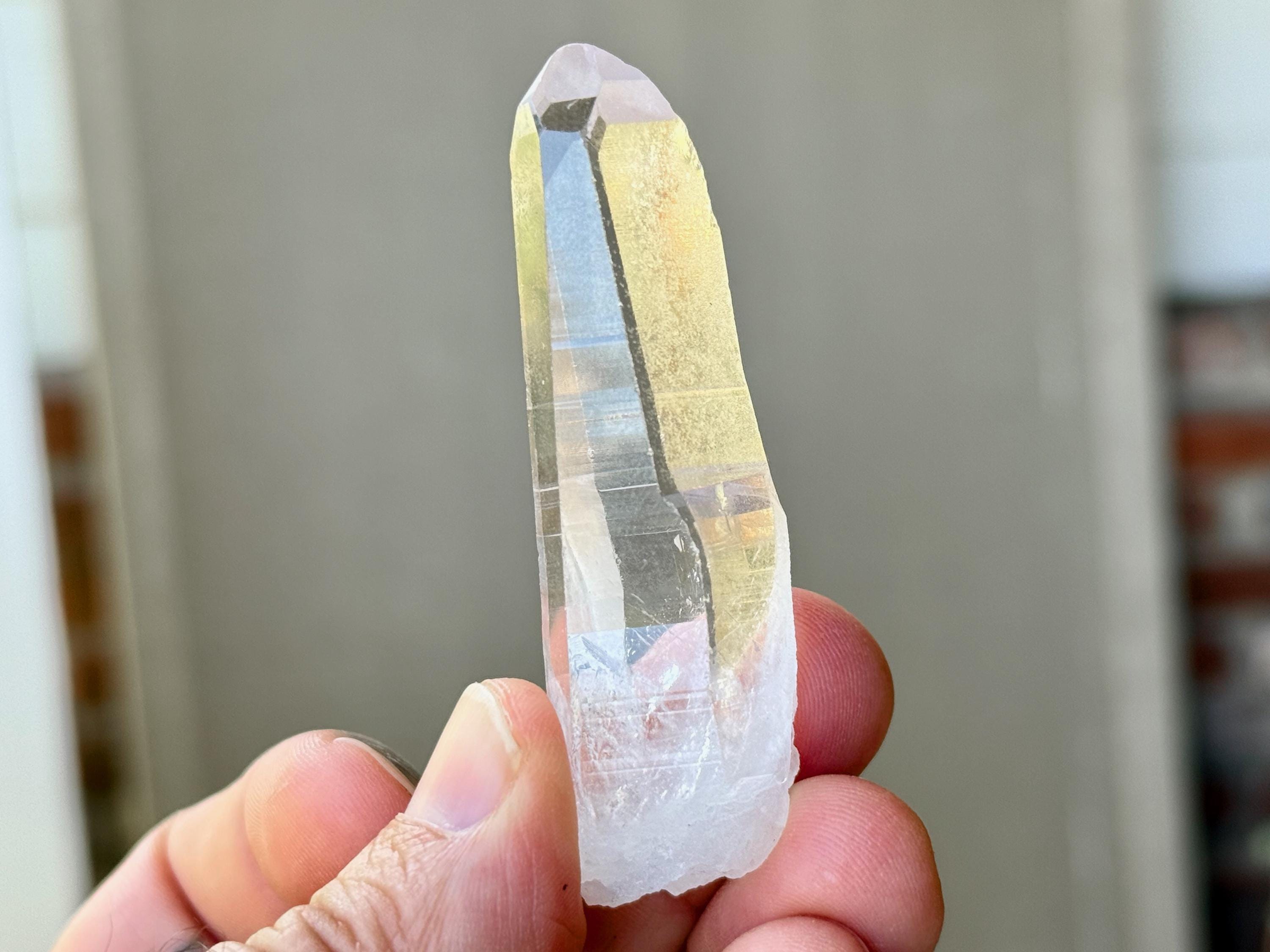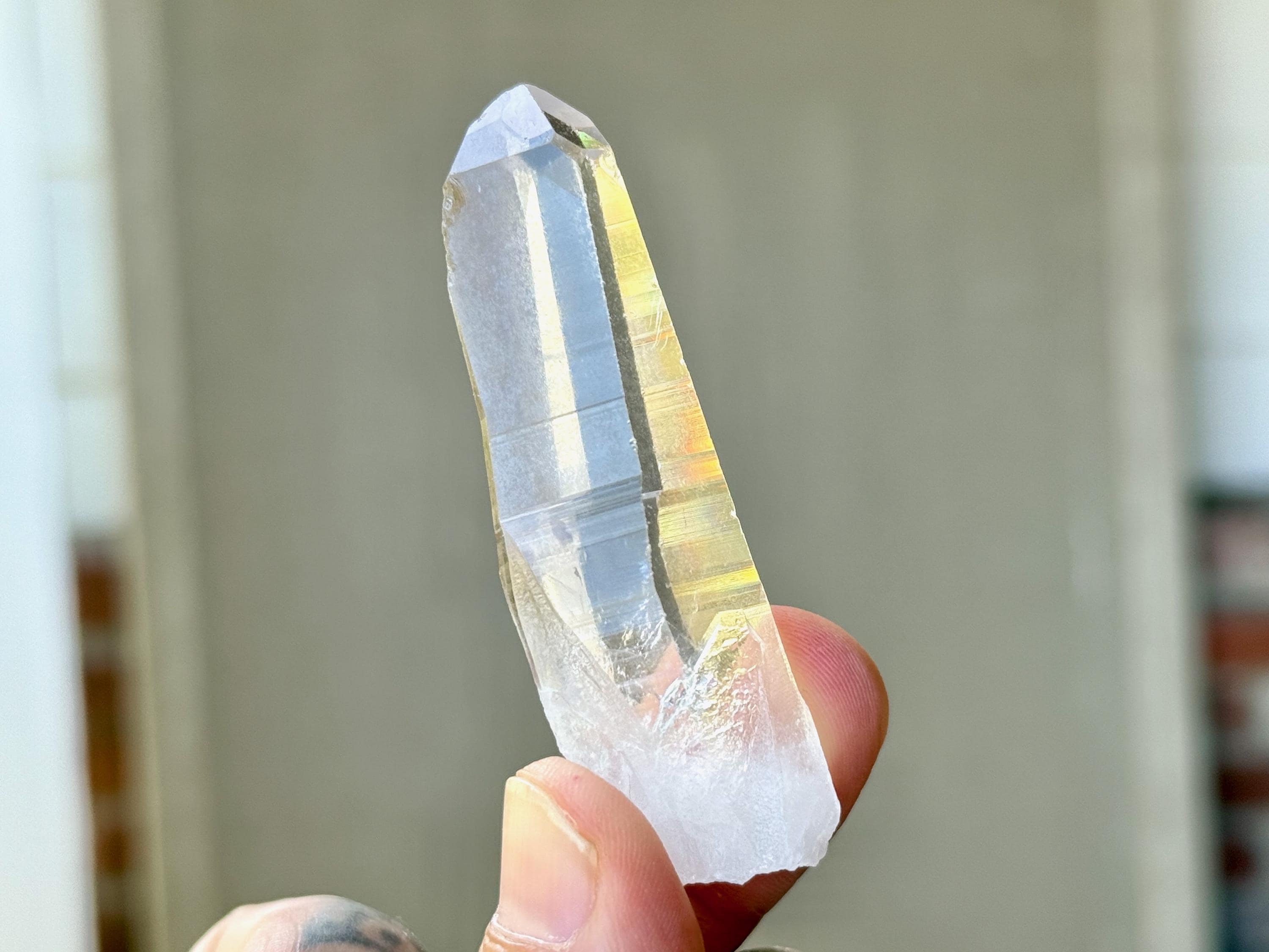*Please note this crystal is clear and colorless. Any yellow hues in the photos are due to the natural sunlight reflecting off the crystal.