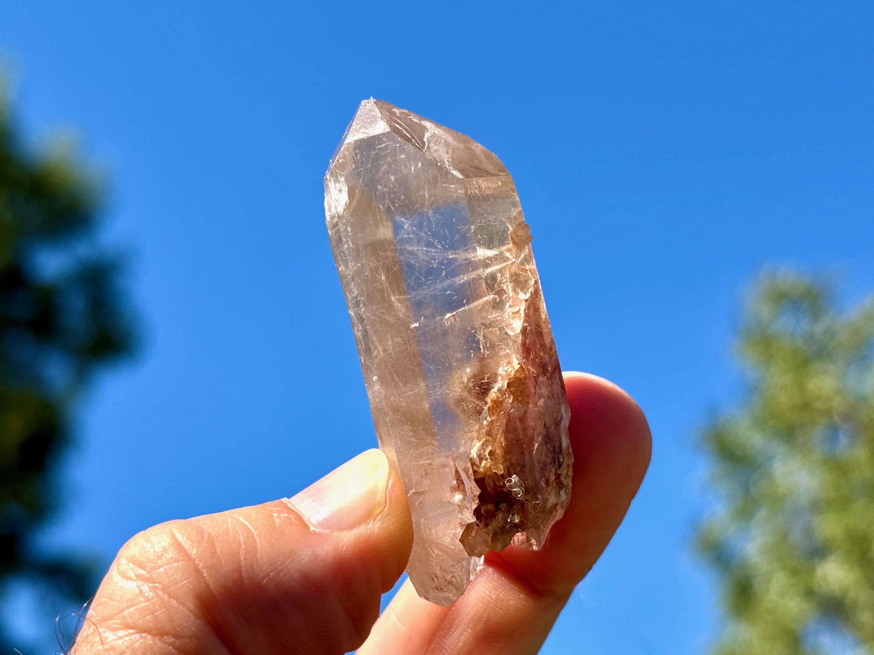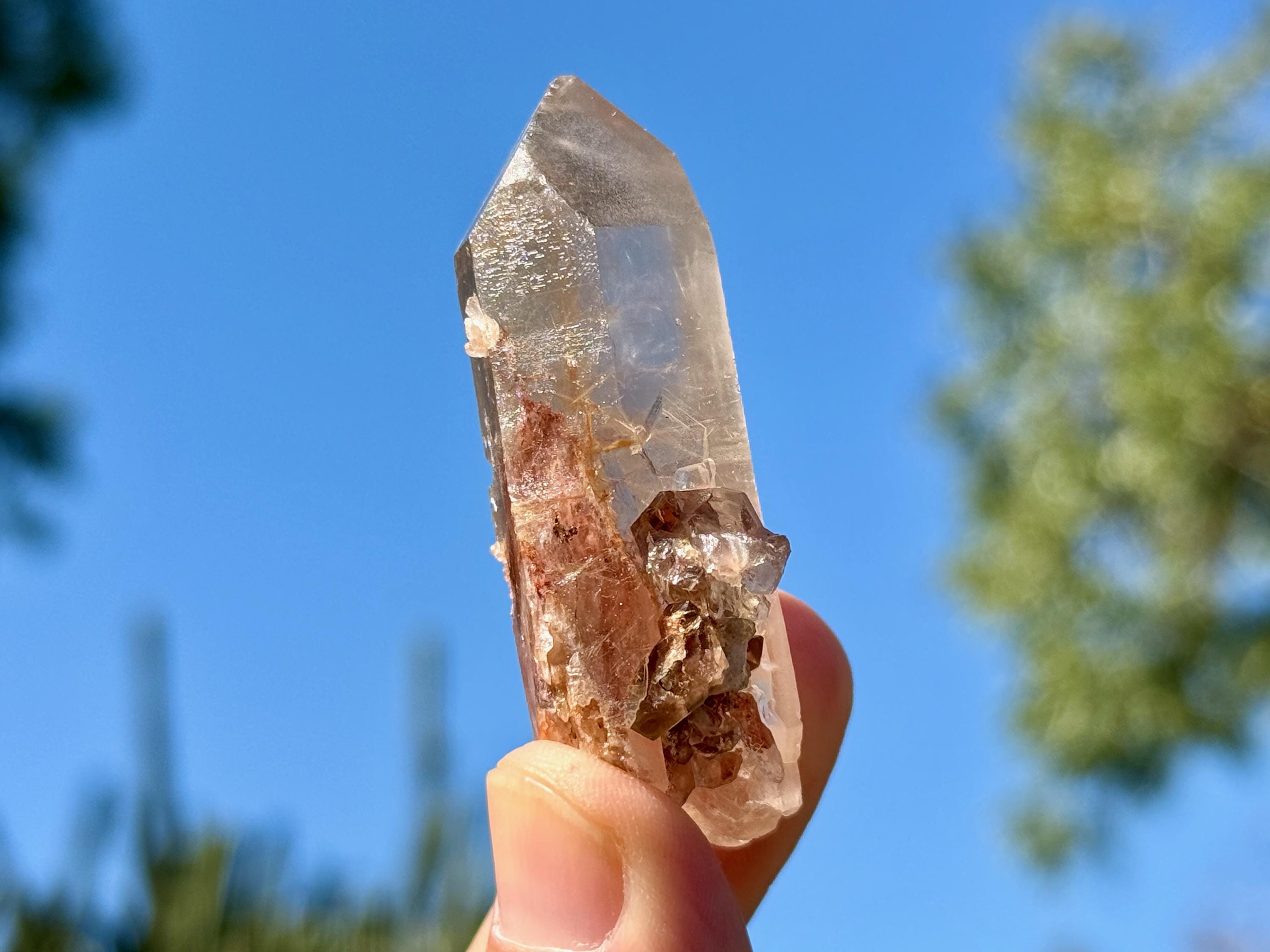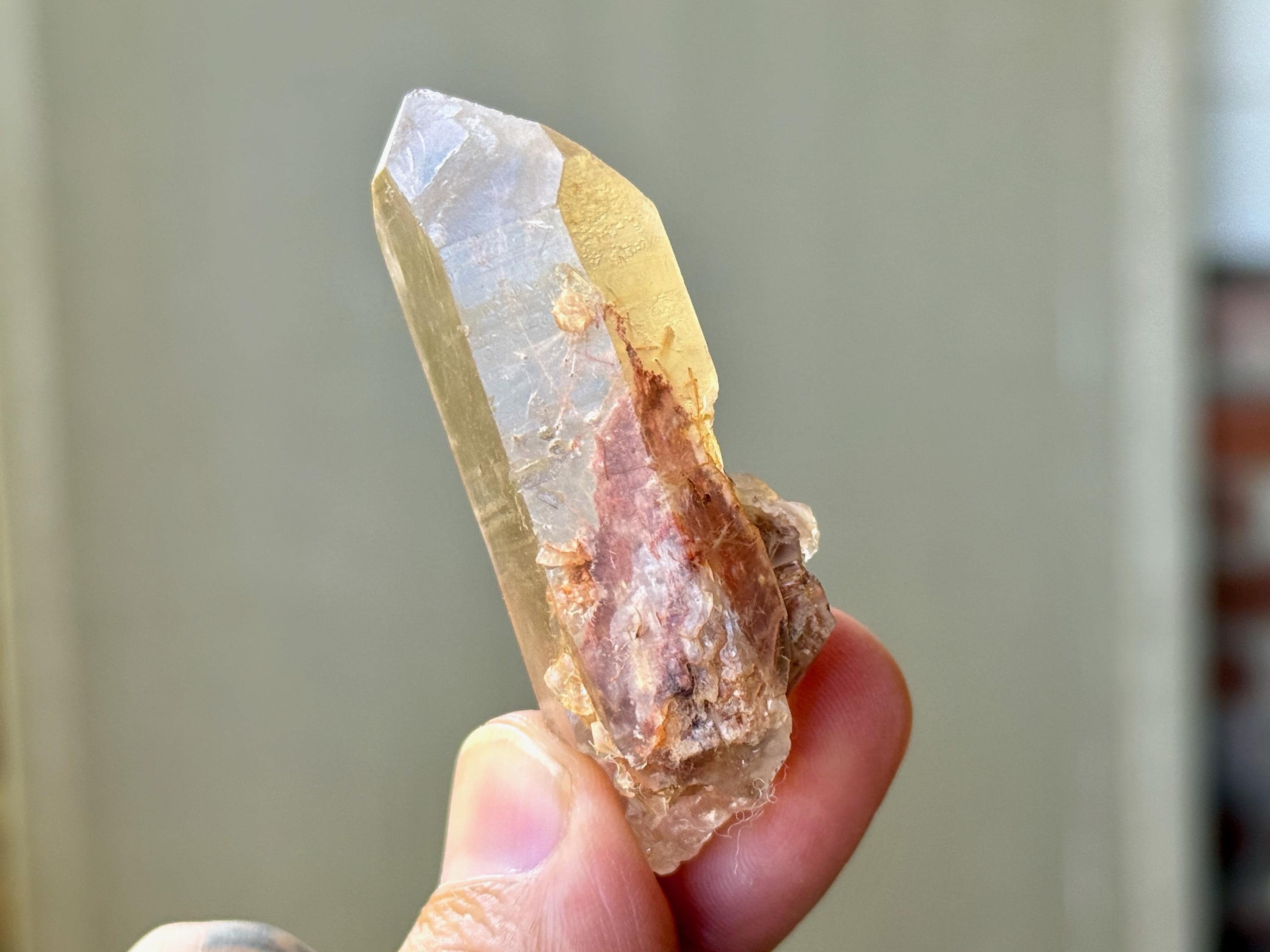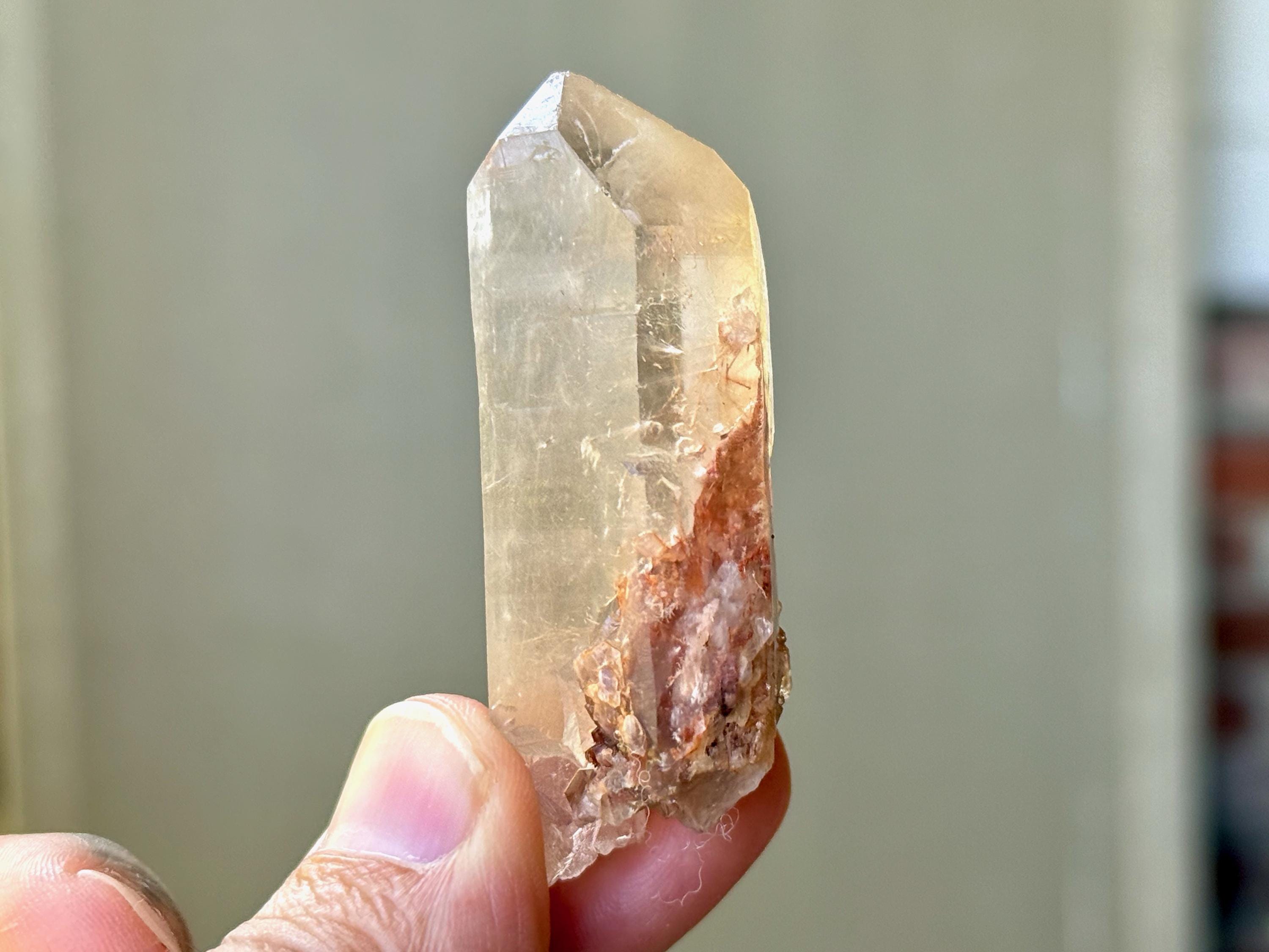 This crystal has lovely clarity and very nice luster, with a mild smoky golden hue. When we look inside we can see some sparse inclusions of very thin, fibrous rutile inclusions. Some of these wispy Angel Hair inclusions are white or golden in color, though there is a large concentration of red Hematite at the base. I believe the rutile are most likely White Amphibole inclusions, due to their fineness and fibrousness, that have taken on a bit of golden and red color due to the Hematite content in the crystal and in the soil where it was found.