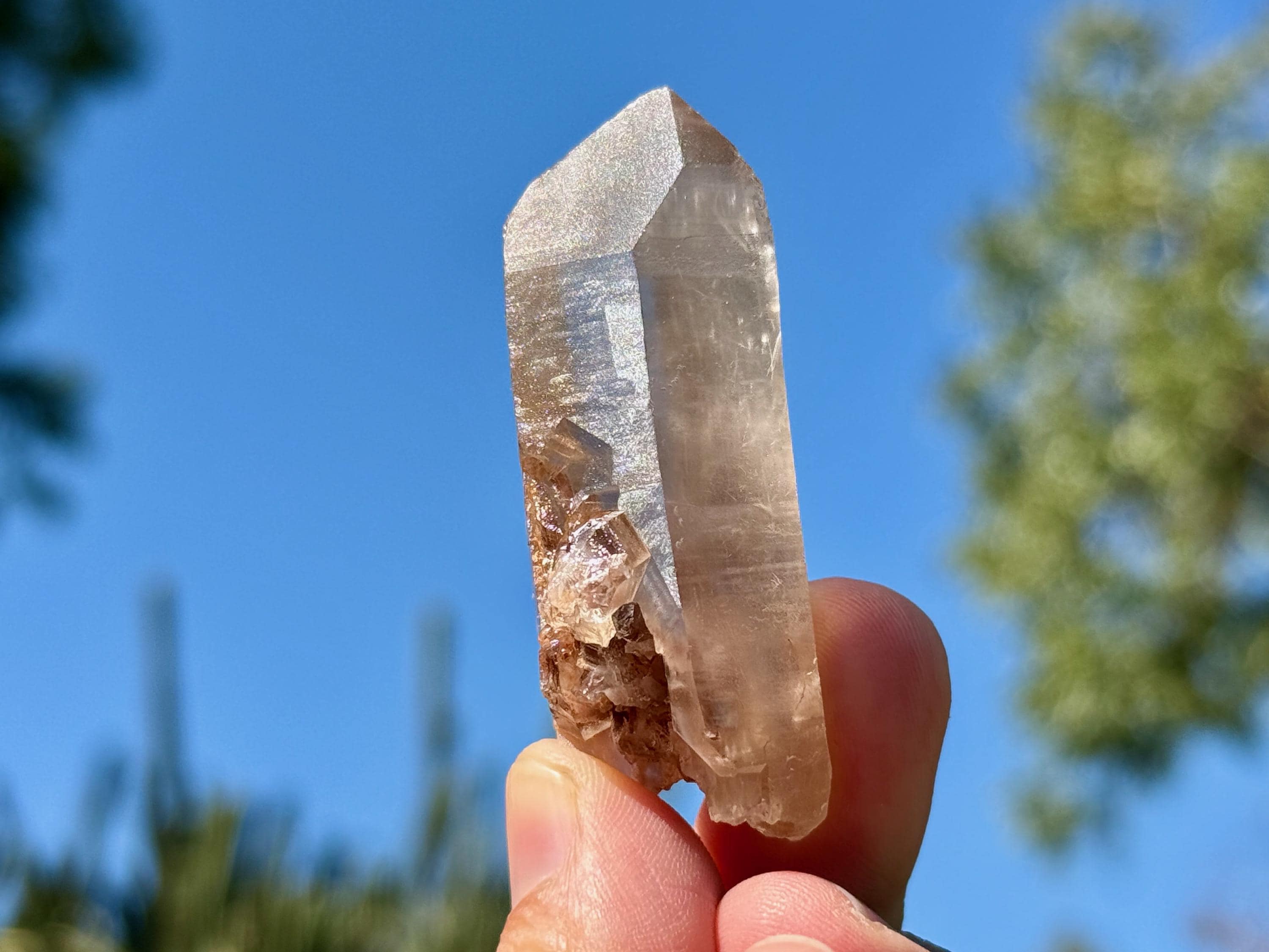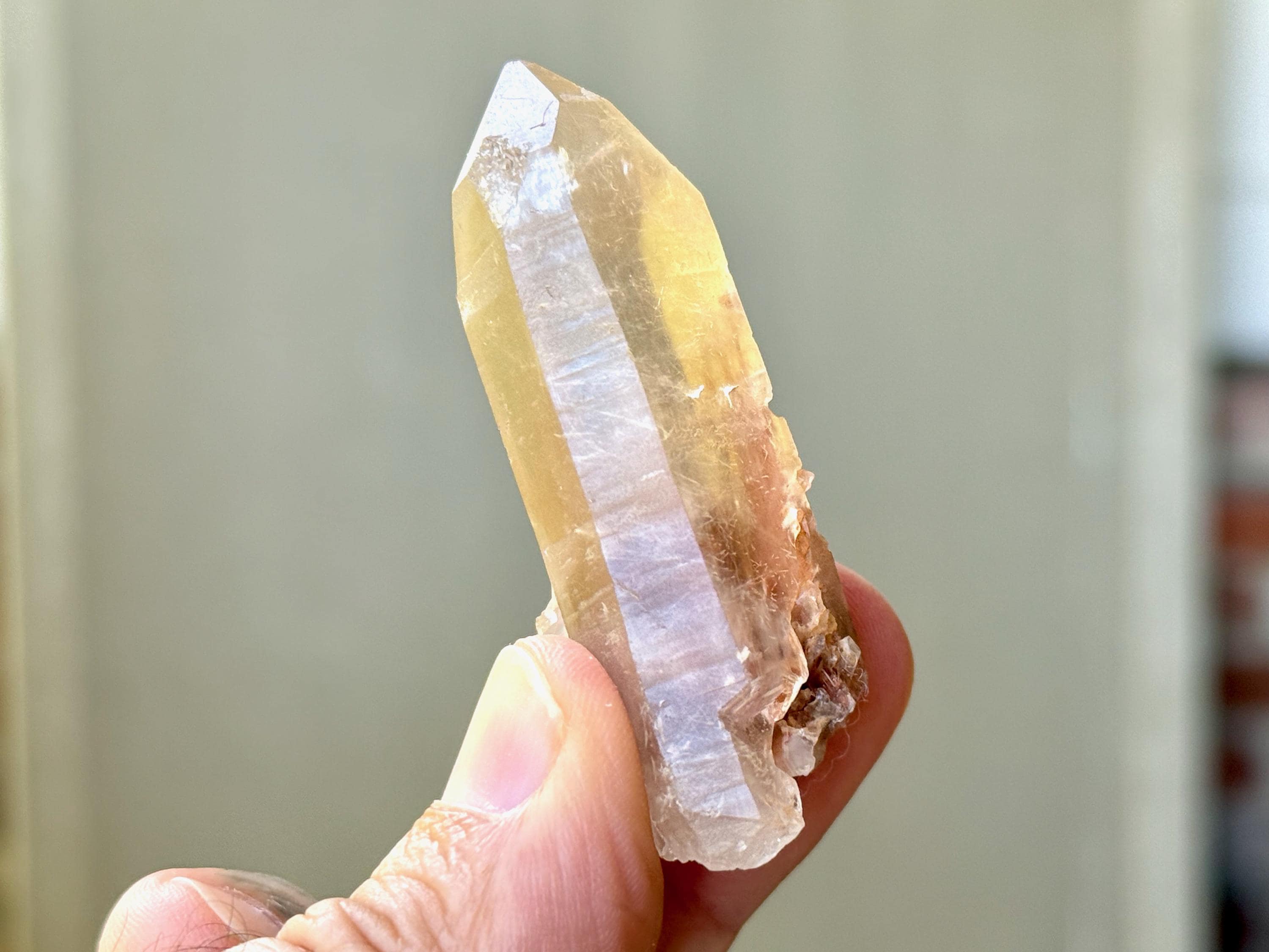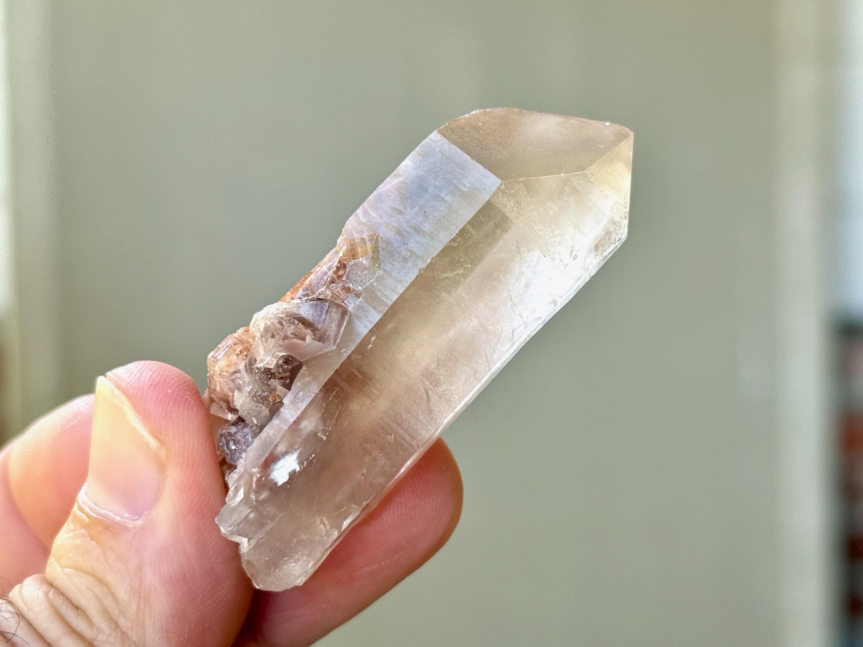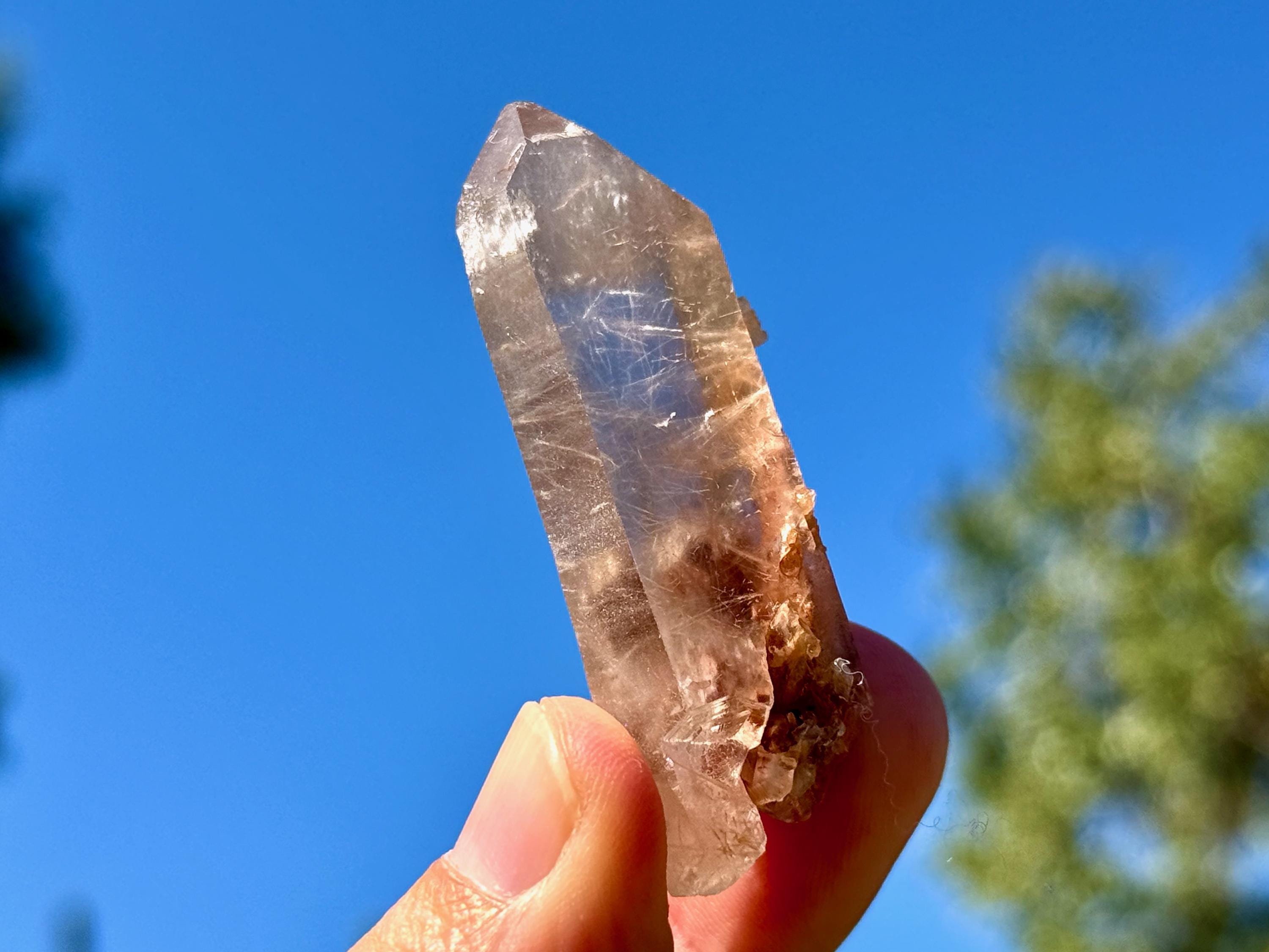 This crystal has lovely clarity and very nice luster, with a mild smoky golden hue. When we look inside we can see some sparse inclusions of very thin, fibrous rutile inclusions. Some of these wispy Angel Hair inclusions are white or golden in color, though there is a large concentration of red Hematite at the base. I believe the rutile are most likely White Amphibole inclusions, due to their fineness and fibrousness, that have taken on a bit of golden and red color due to the Hematite content in the crystal and in the soil where it was found.