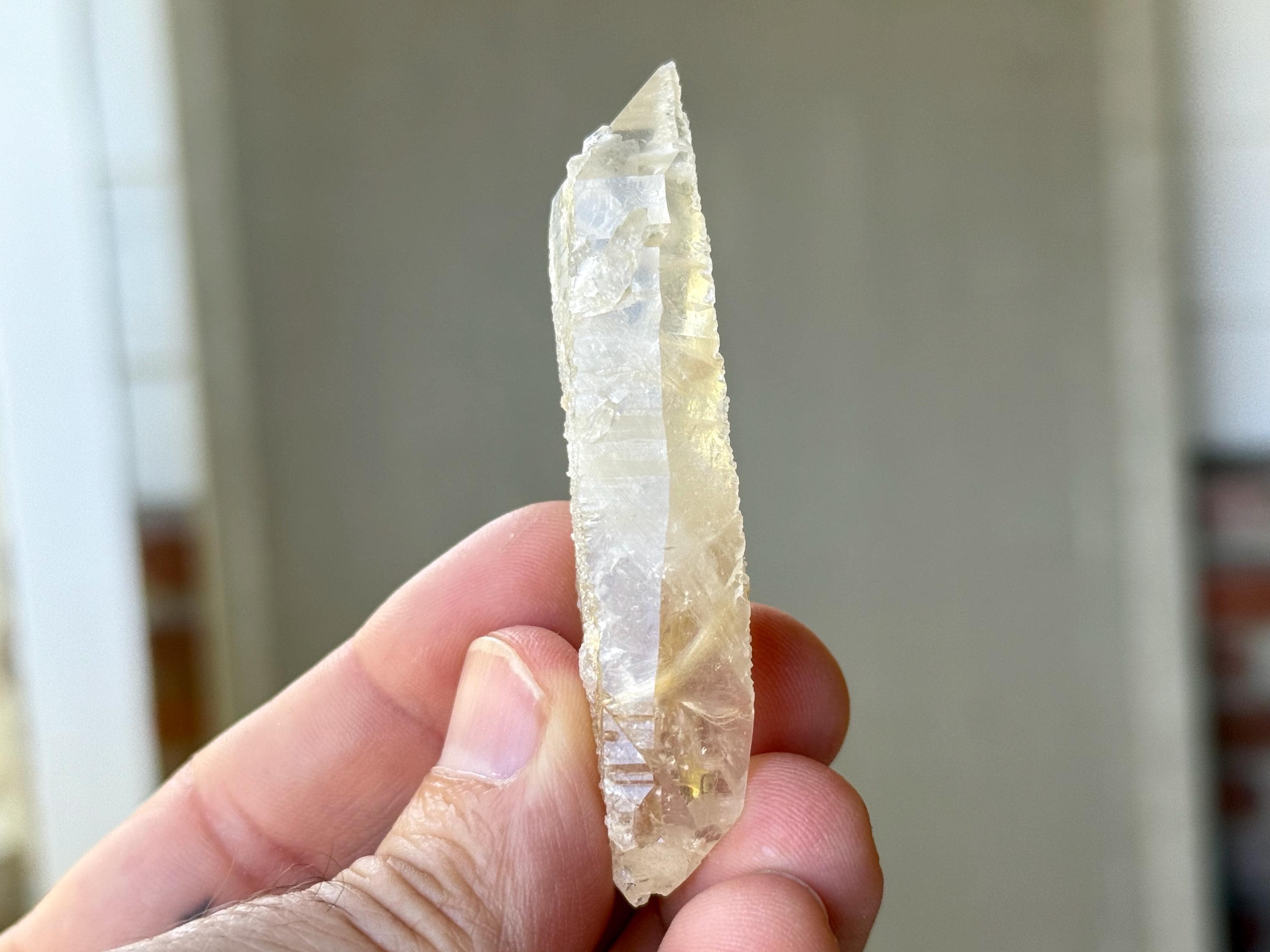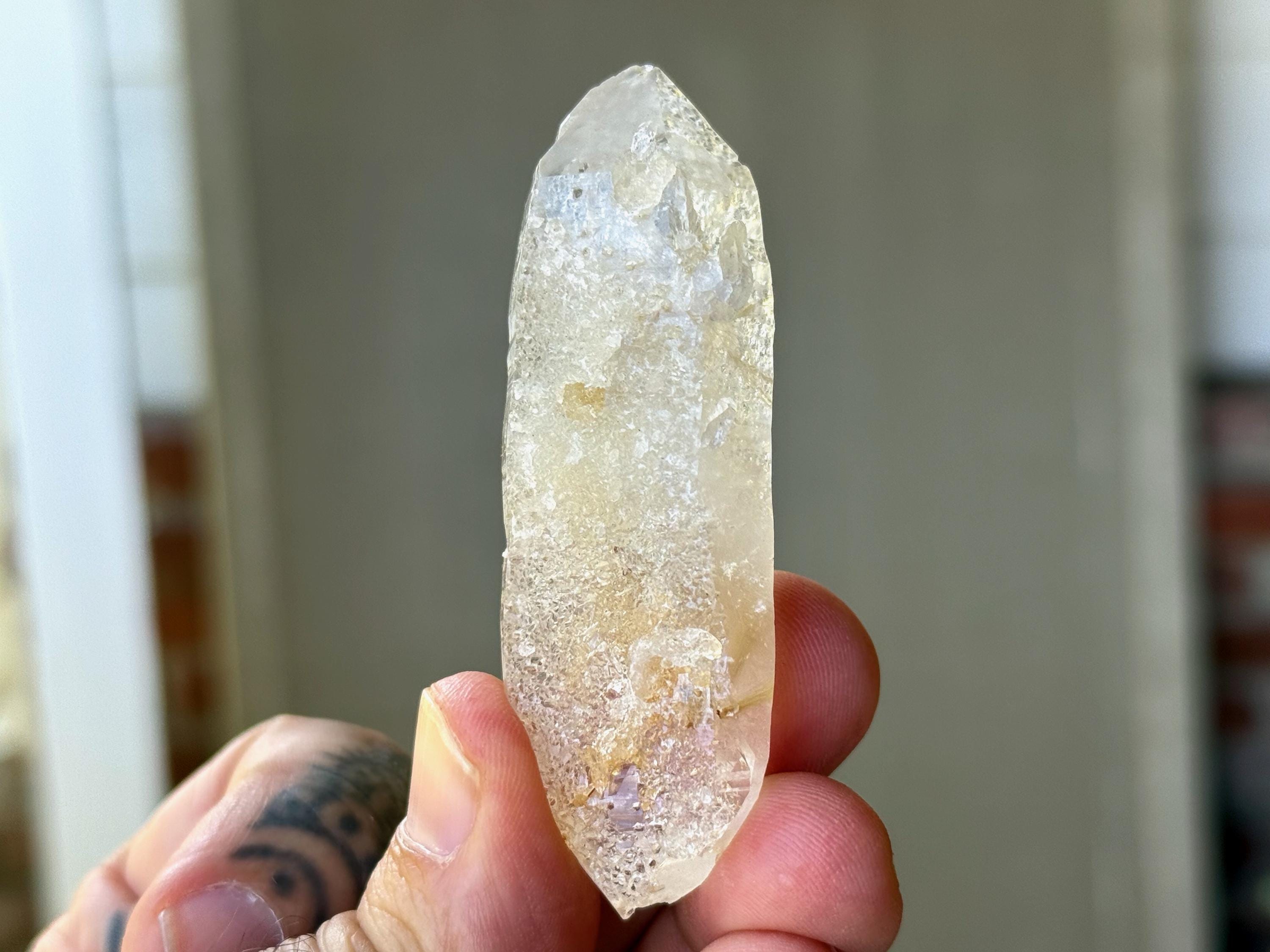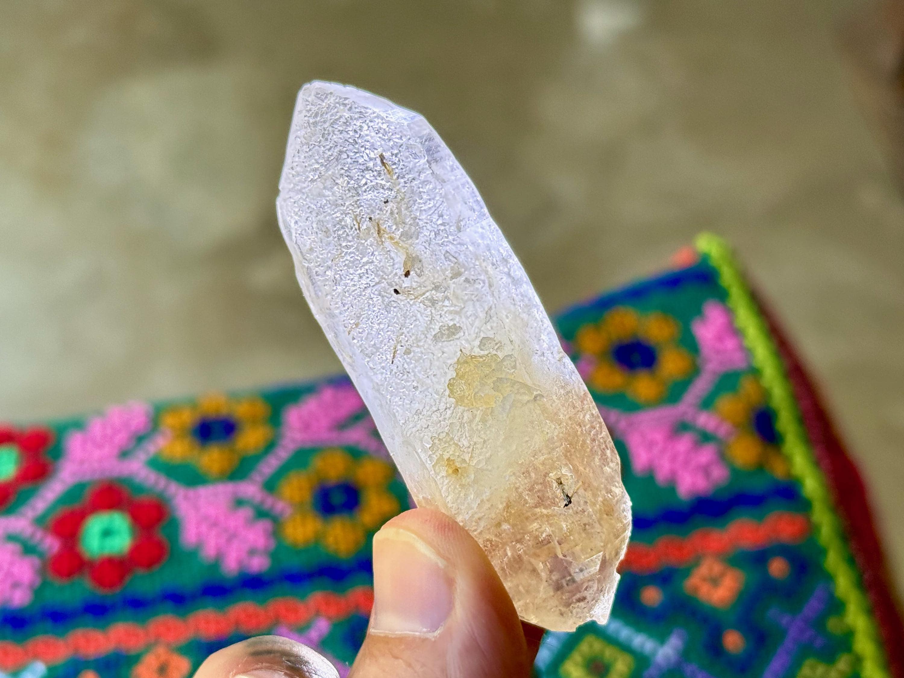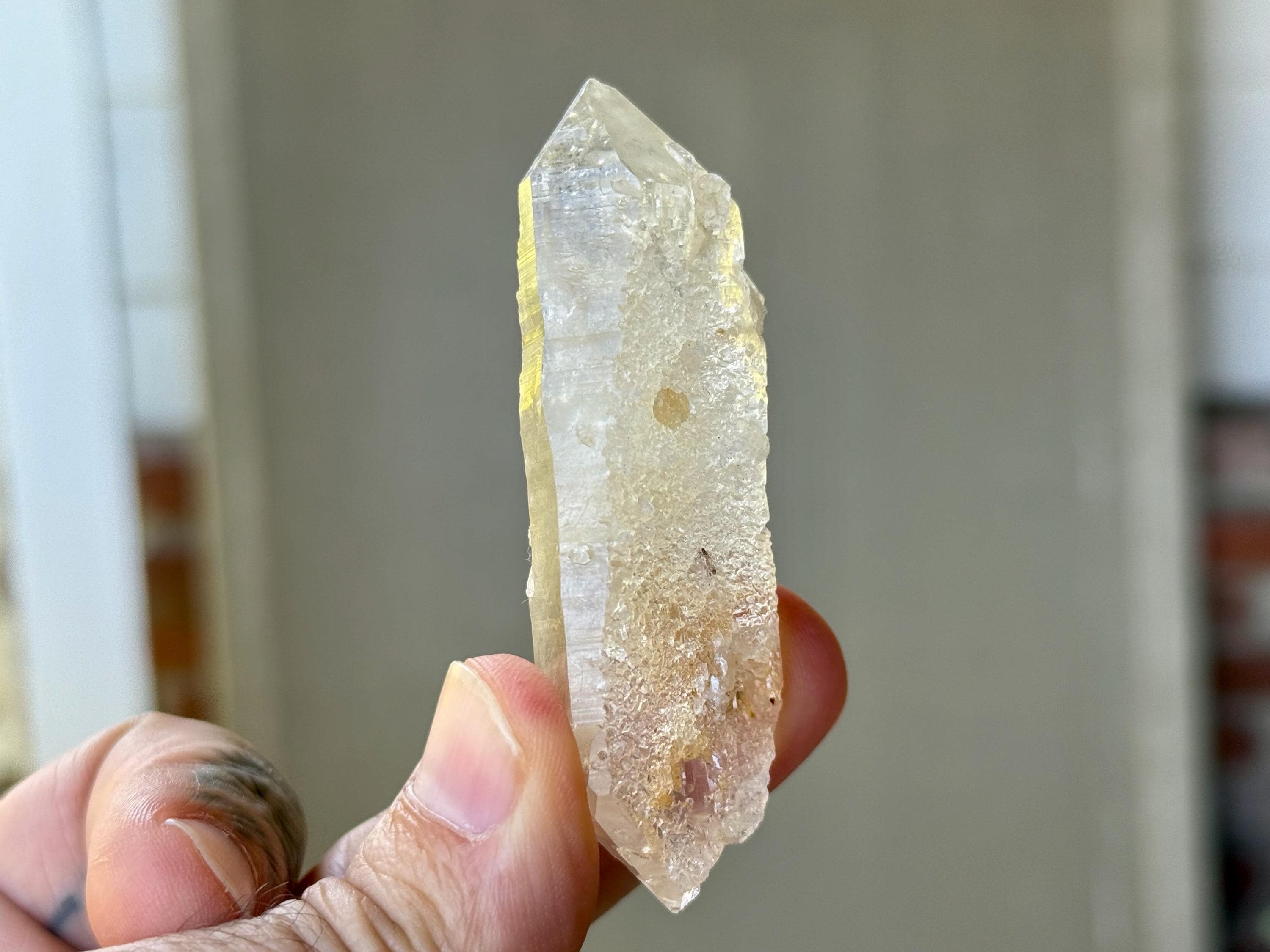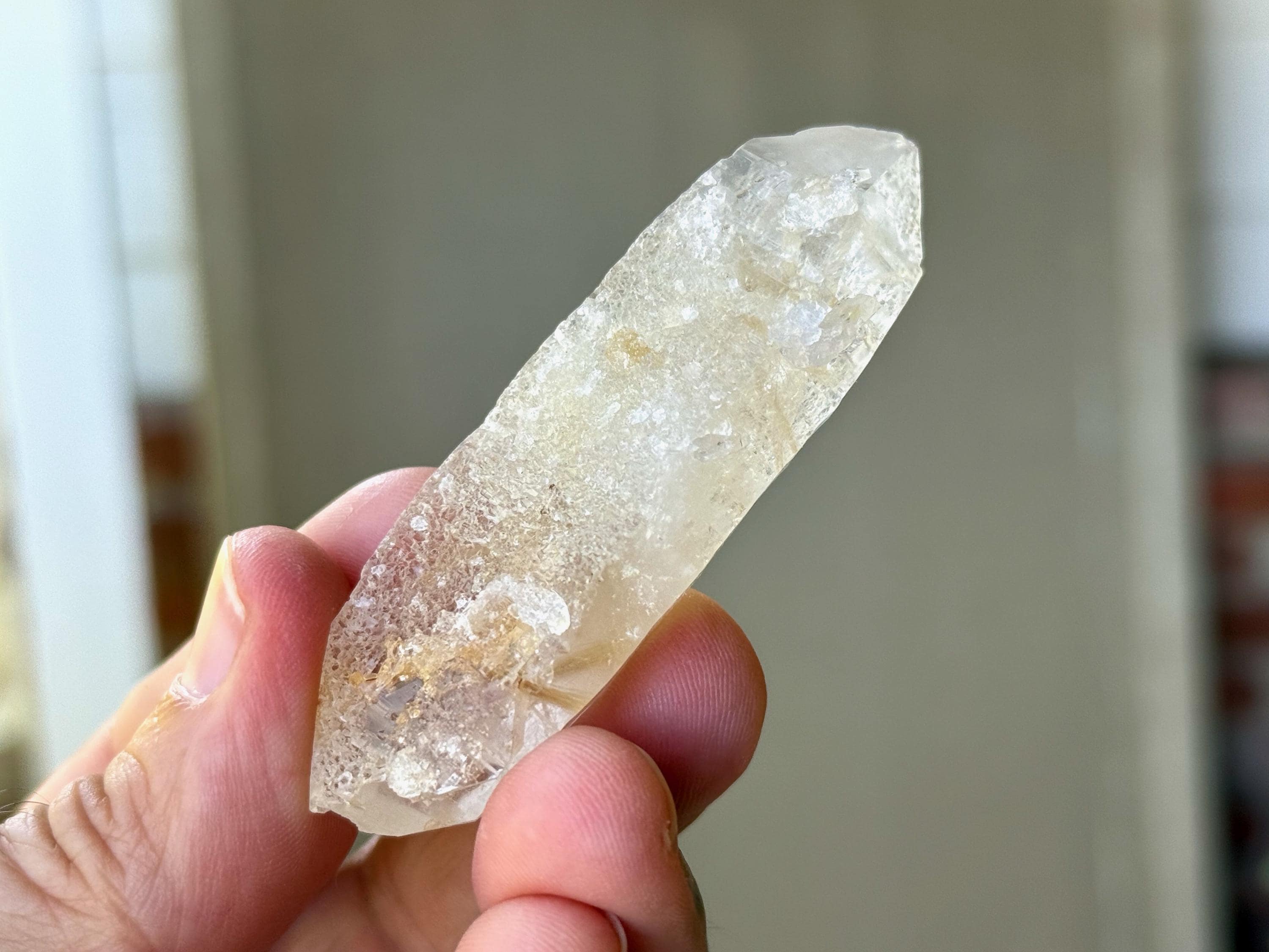 A gorgeous, ethereal complexion to this Lemurian Quartz crystal with tinges of Golden Healer inclusions, as well as sprays of Golden Angel Hair Rutile within.