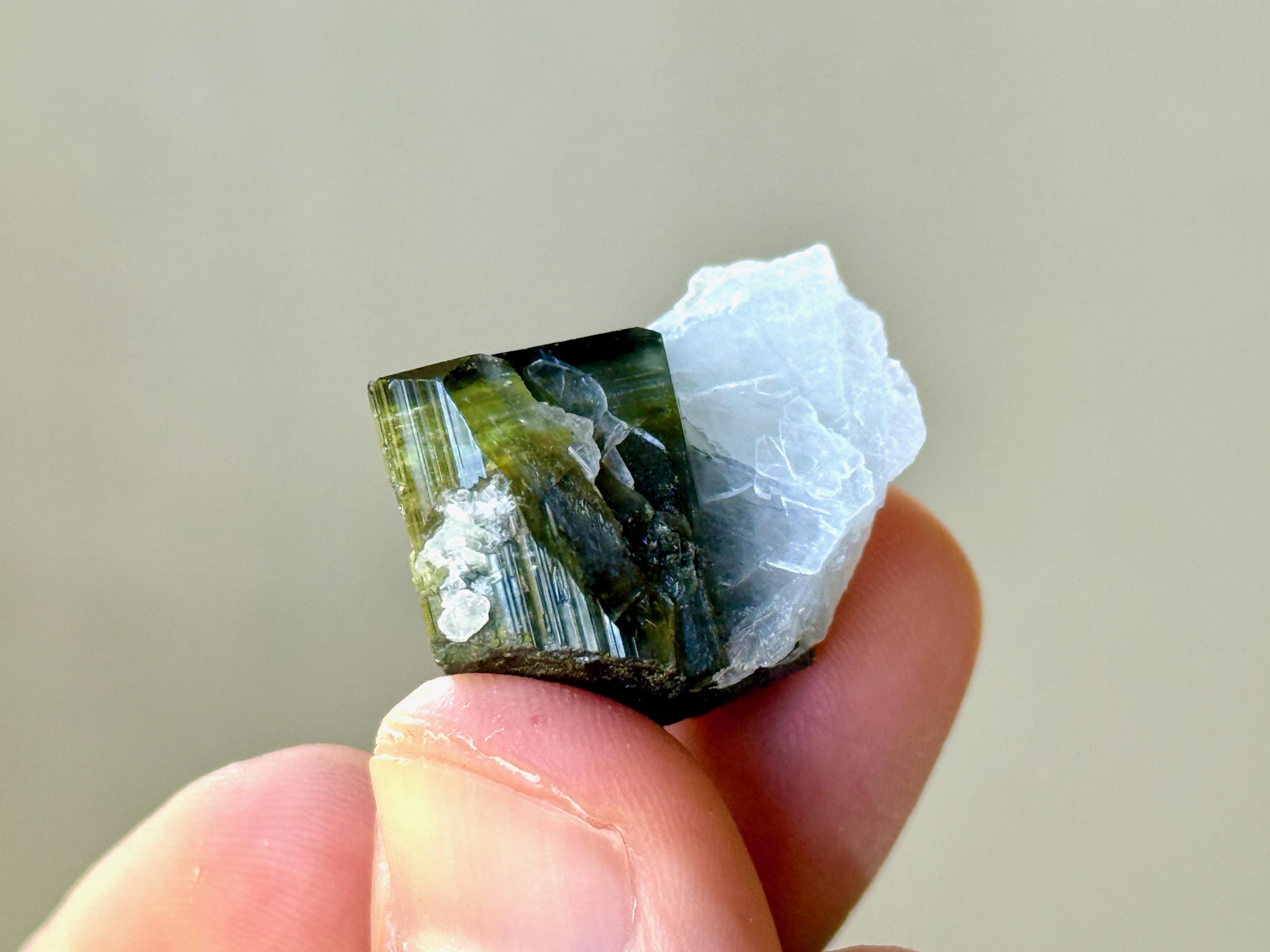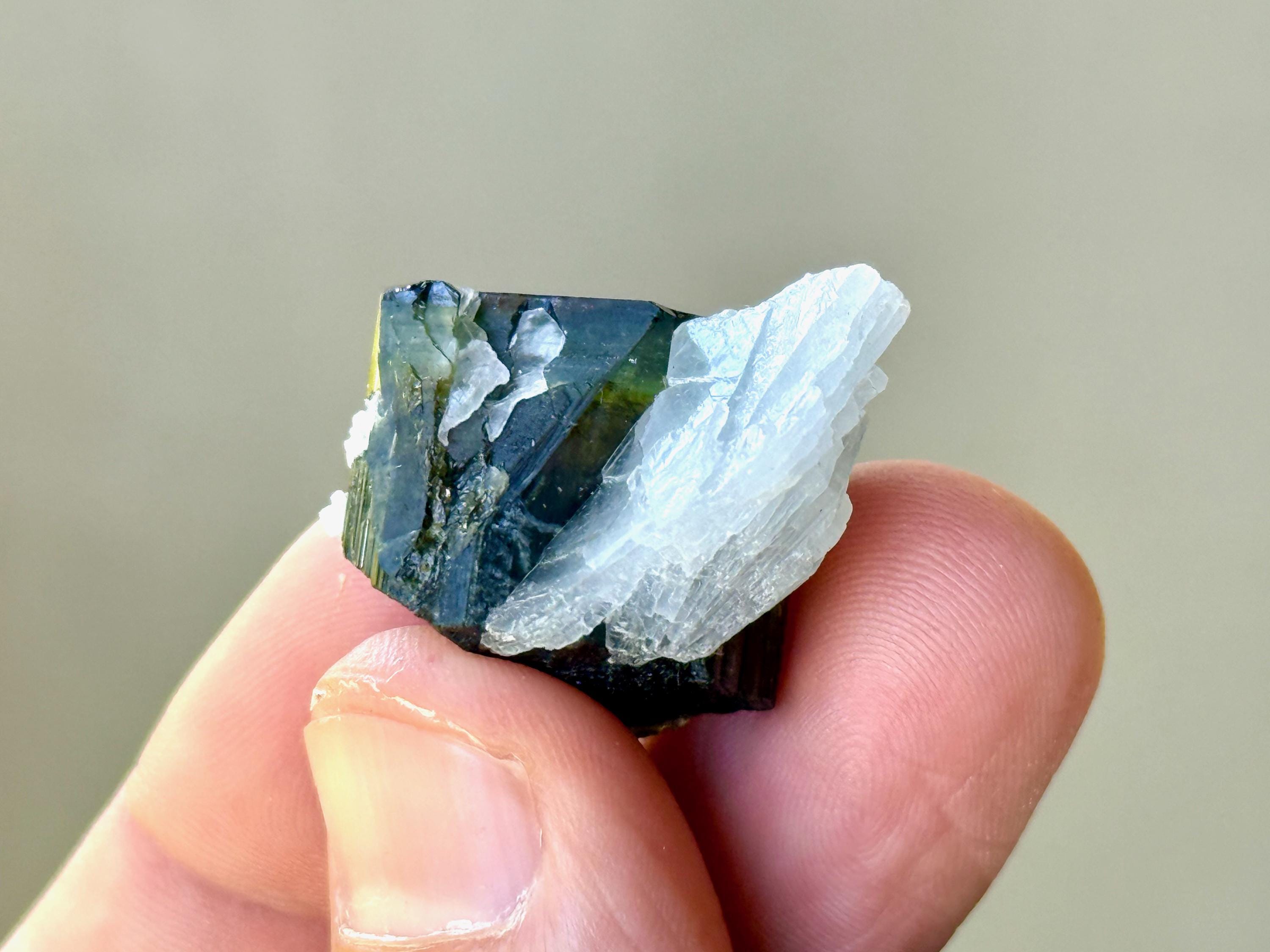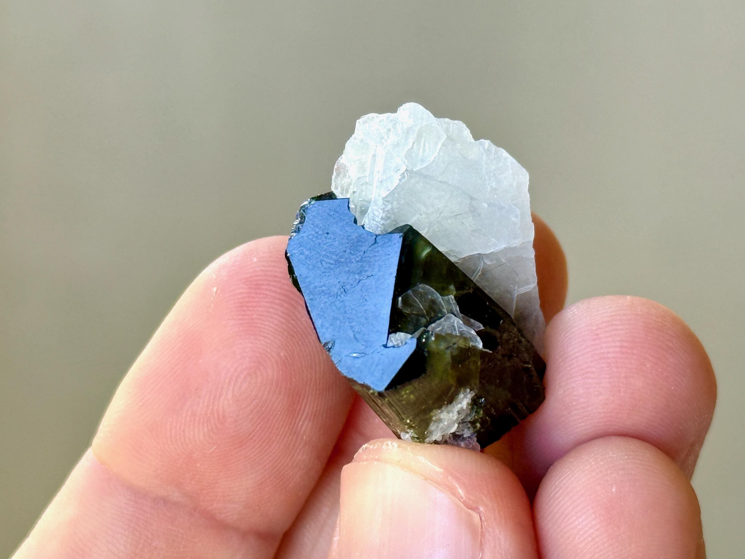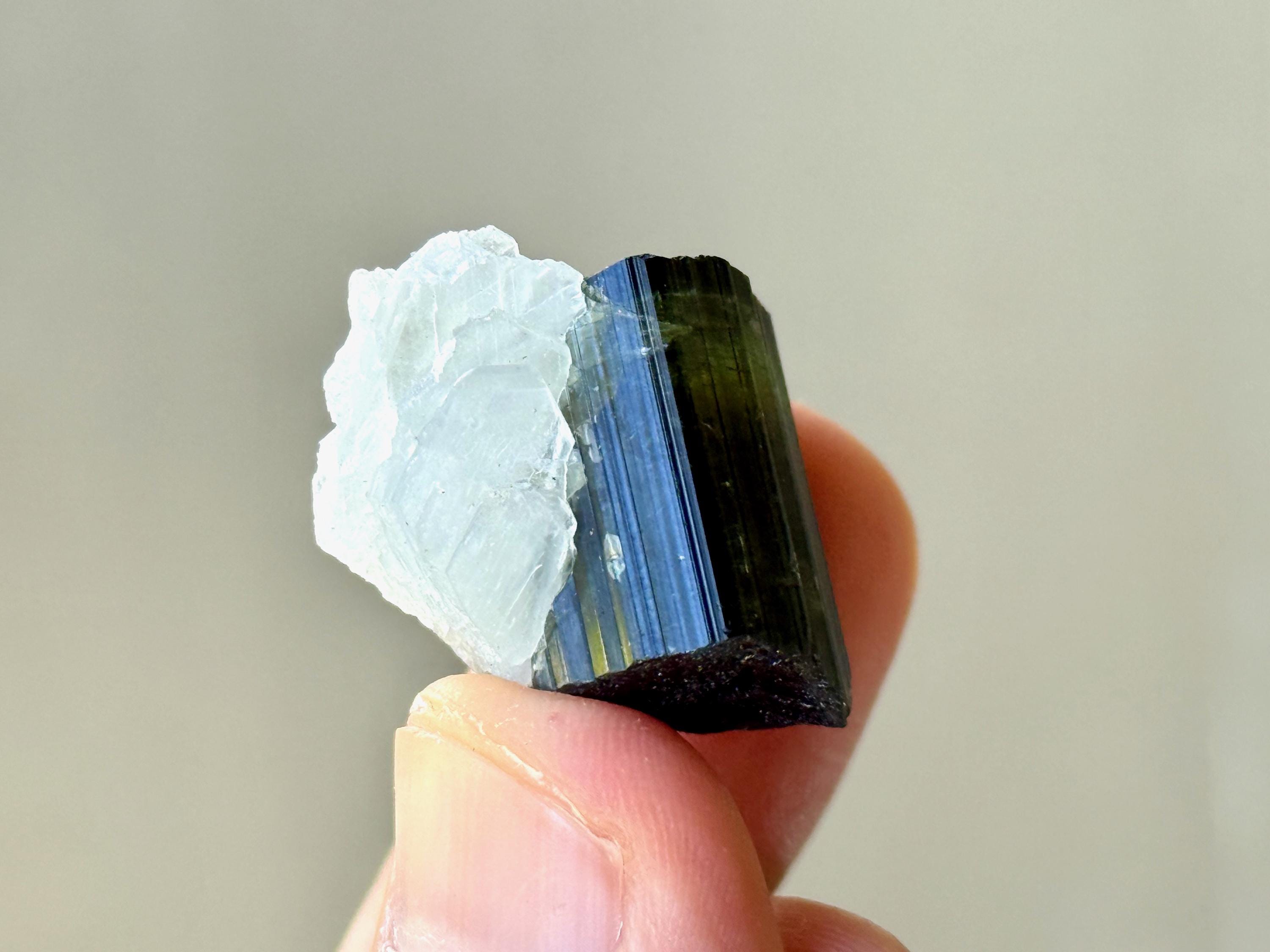 This crystal is beautifully terminated on top (Photo 4). The base is not terminated. There's an inclusion of either Quartz or Calcite (I believe it's Calcite) embedded on one side. Just an extraordinary Tourmaline with such vibrant colors!