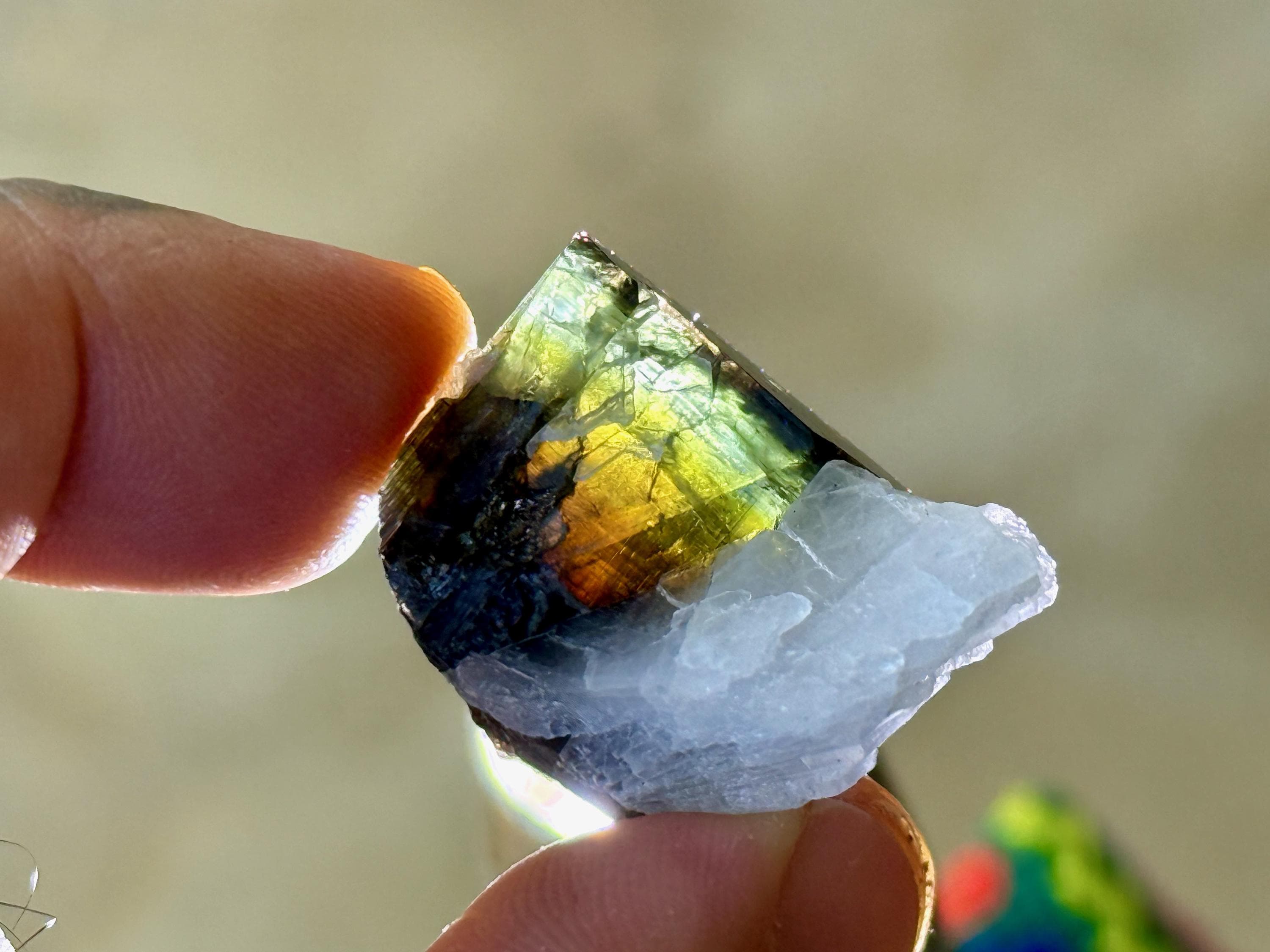 When backlit, however, this crystal comes to life in a spectacular way, displaying banded colors of orange, yellow, green and light blue in the top portion. What's very cool about this piece is that the thin layer at the top is pink if you backlight it and hold it at the right angle.