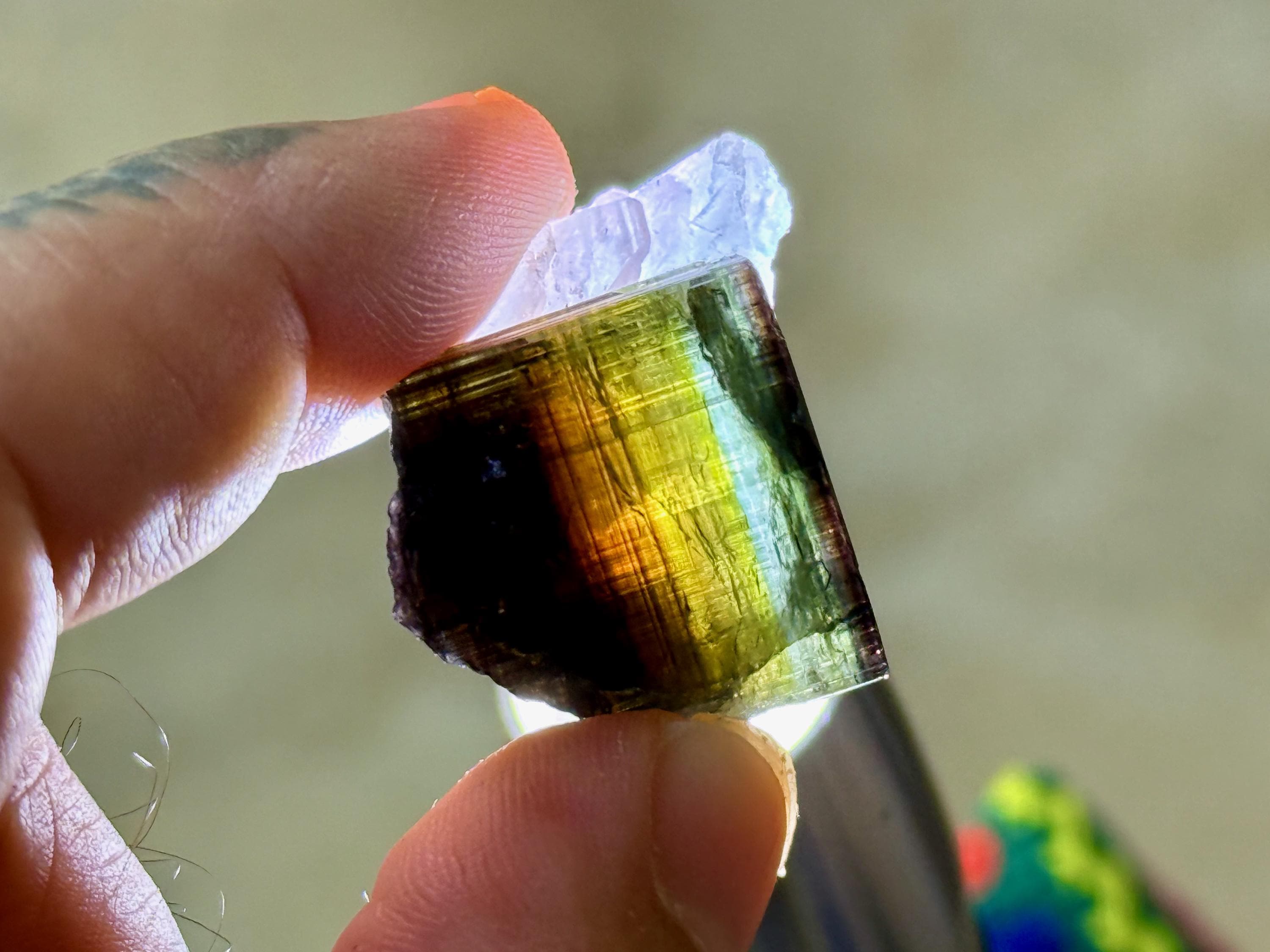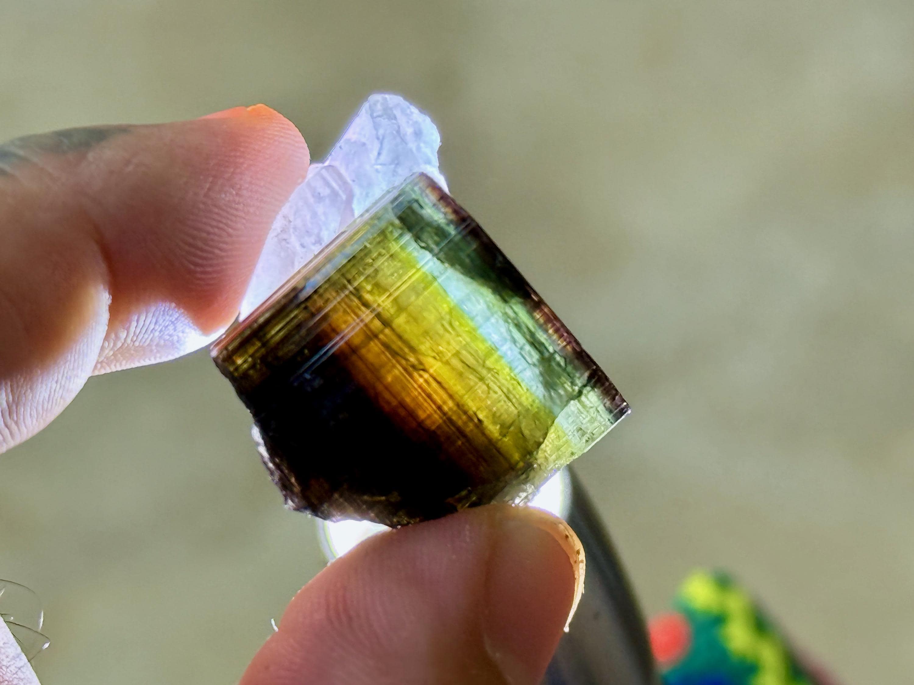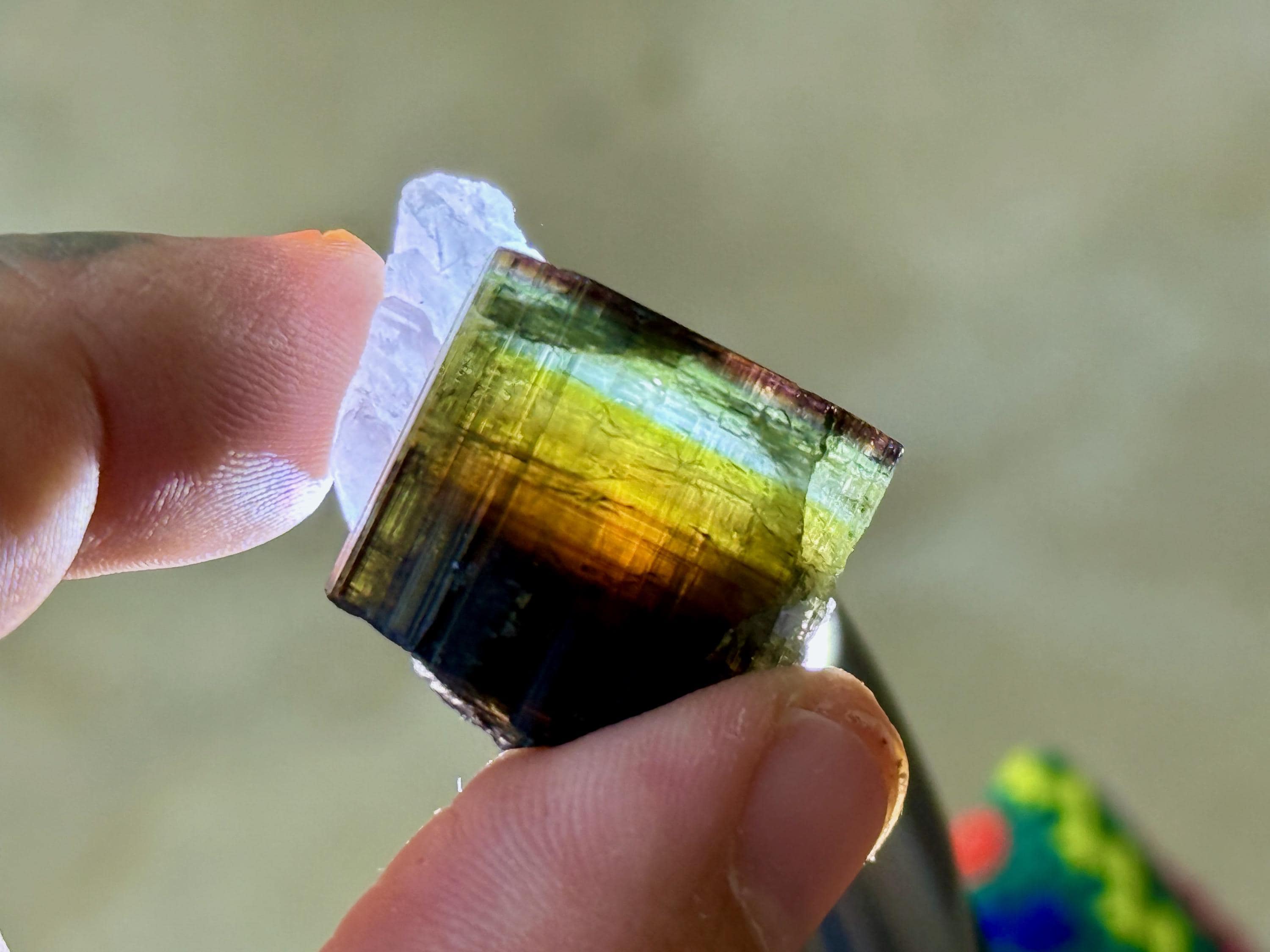 This exceptional Multicolor Tourmaline comes from a new (2025) find in Coronel Murta, Minas Gerais, Brazil. This crystal is all-natural and possesses banded colors of Orange, Yellow, Blue, Green & Pink.