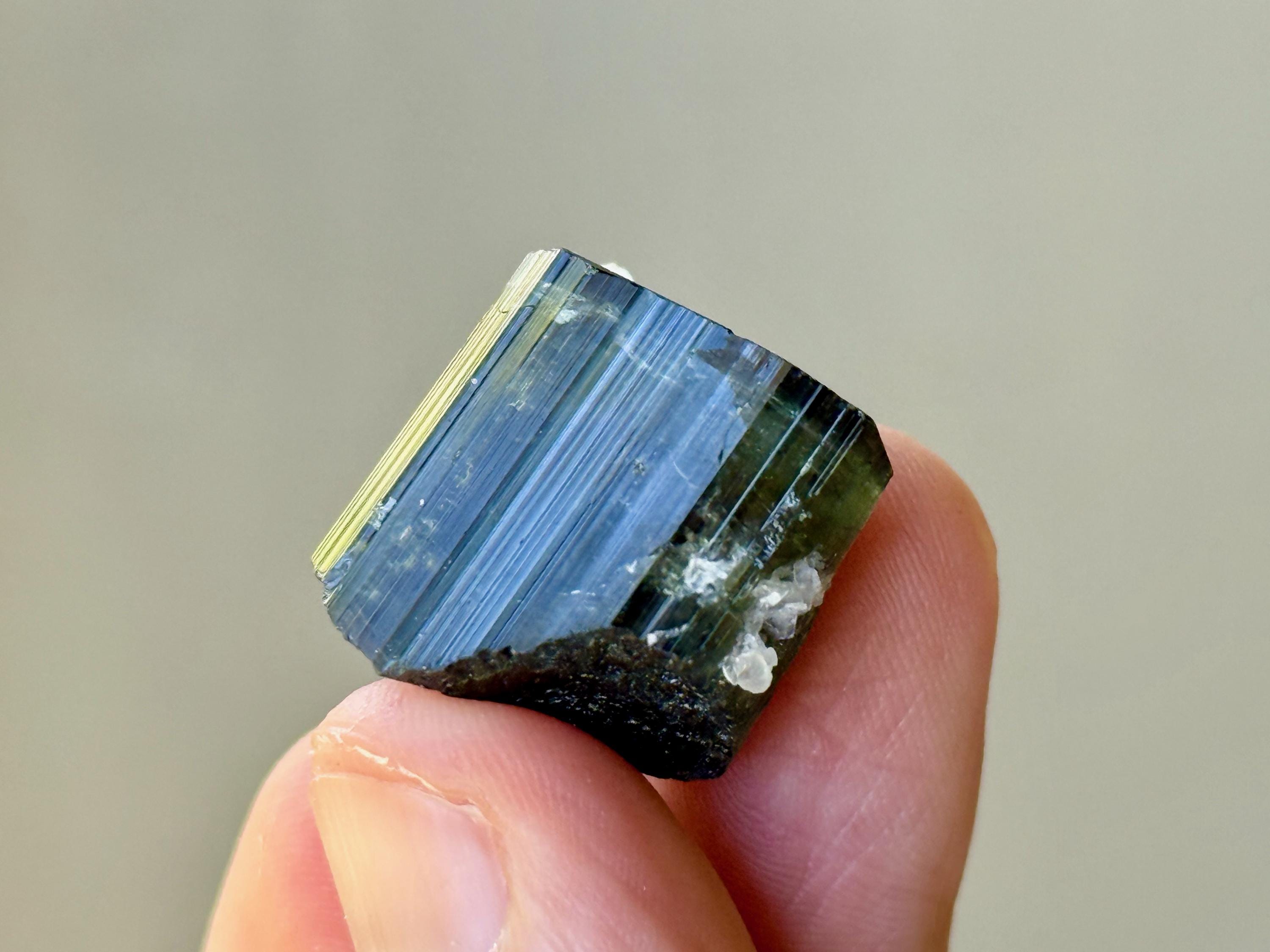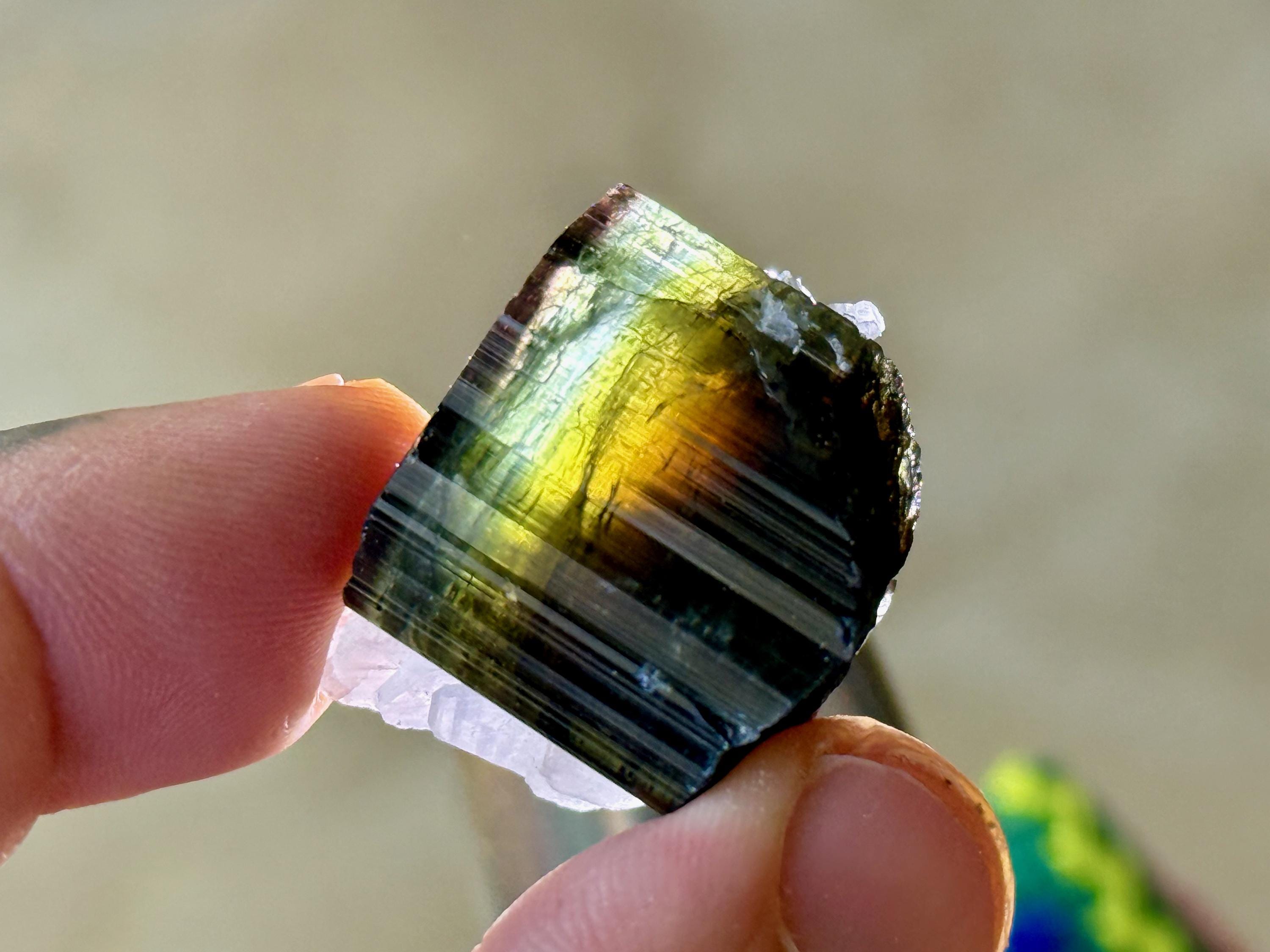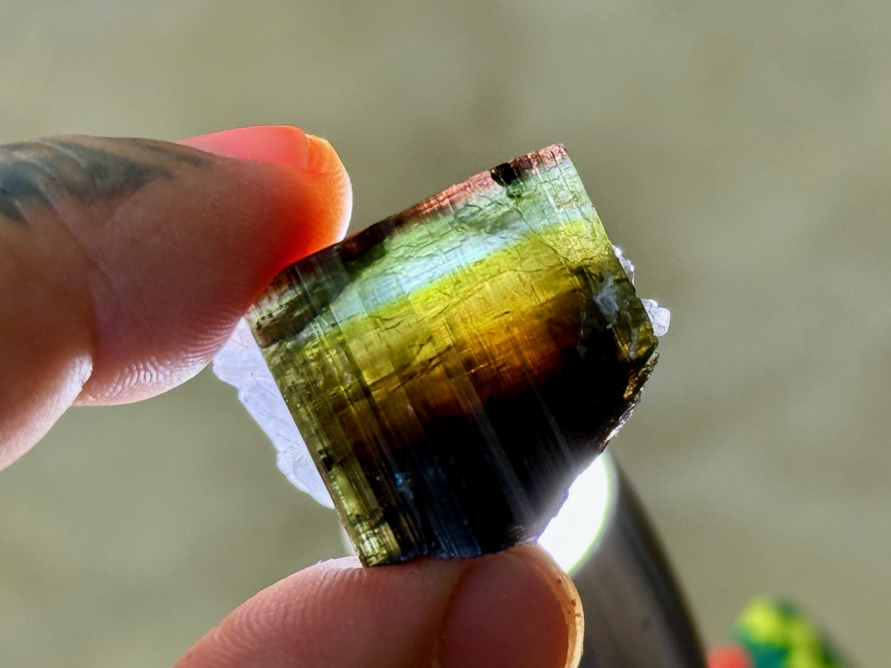 This exceptional Multicolor Tourmaline comes from a new (2025) find in Coronel Murta, Minas Gerais, Brazil. This crystal is all-natural and possesses banded colors of Orange, Yellow, Blue, Green & Pink.