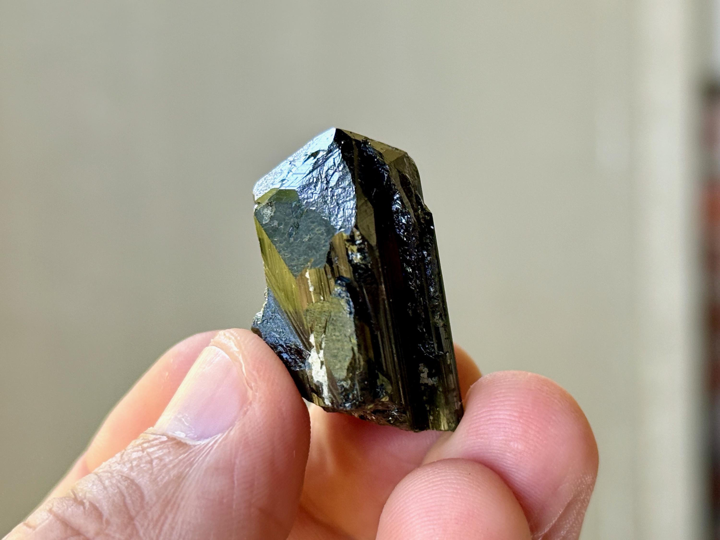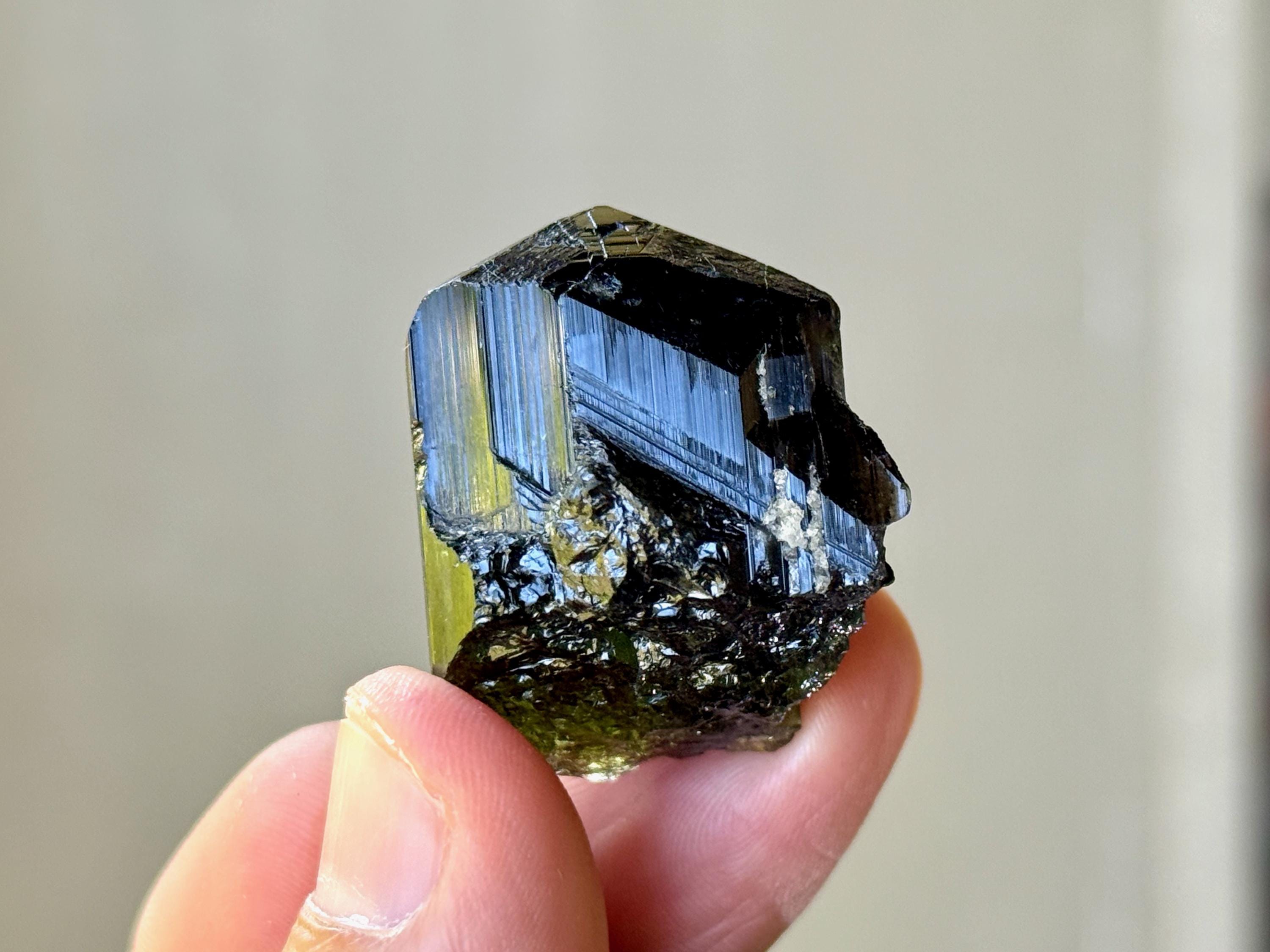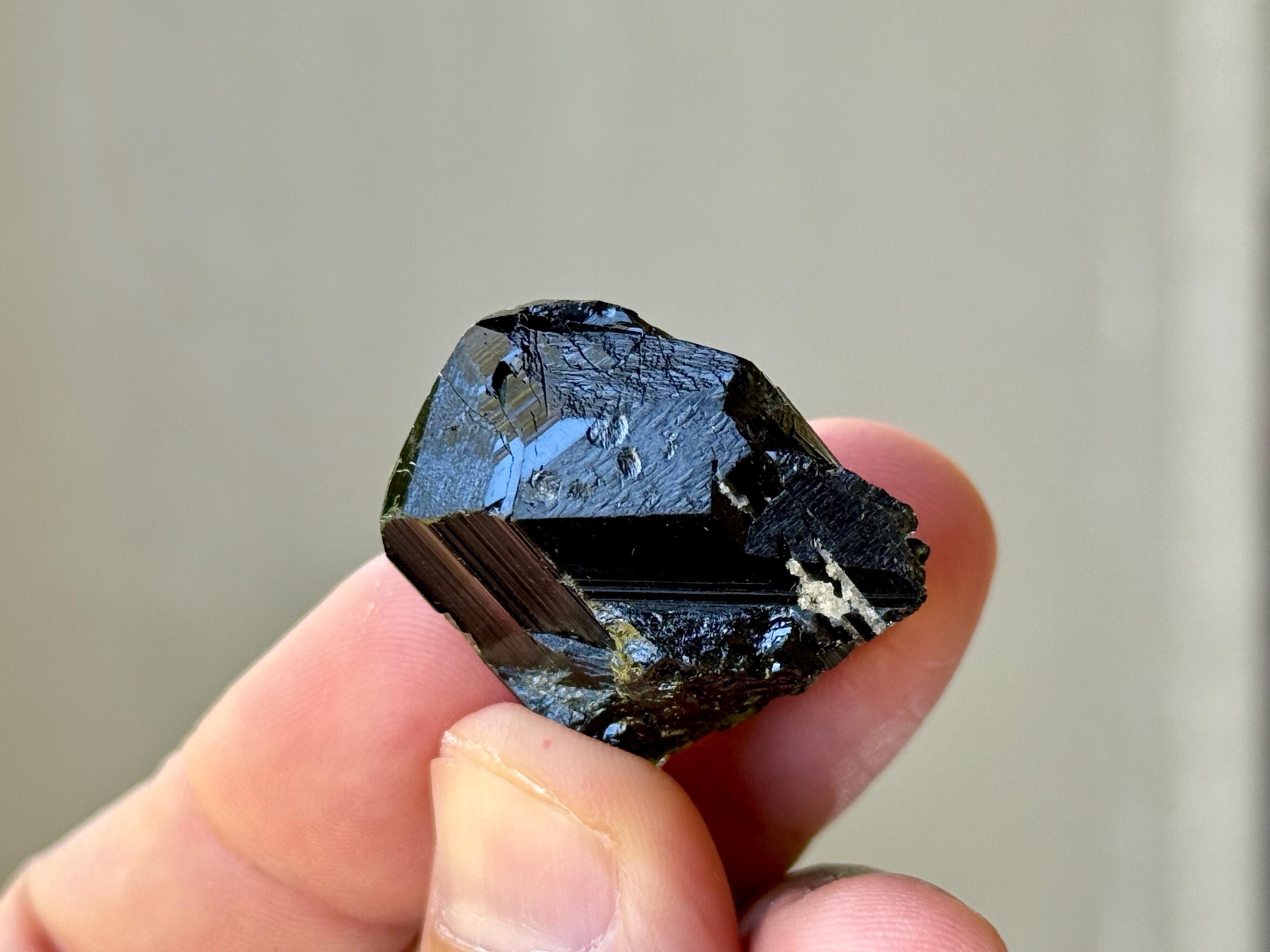 In natural light, this crystal displays a dark and lustrous complexion that appears almost black.