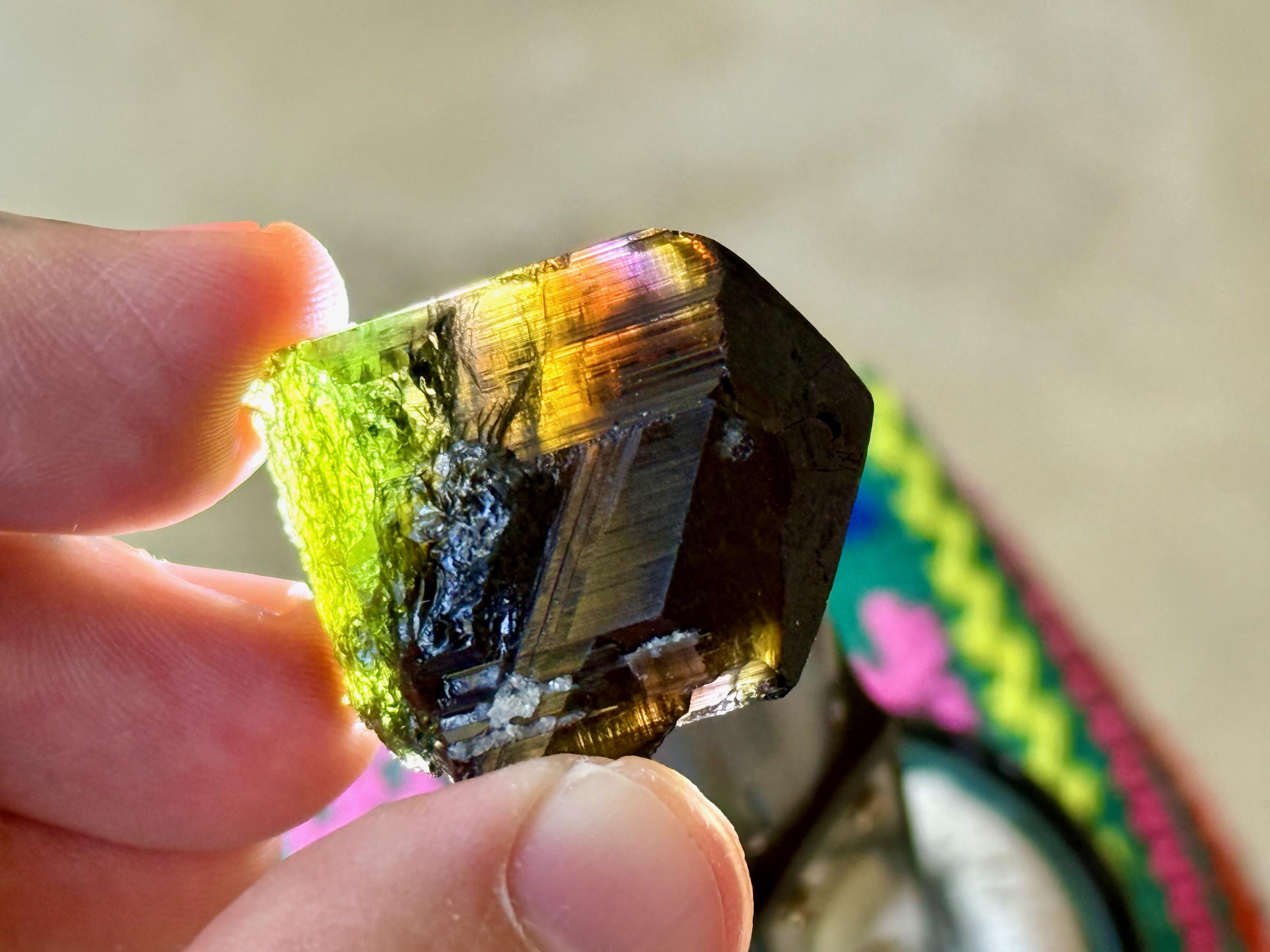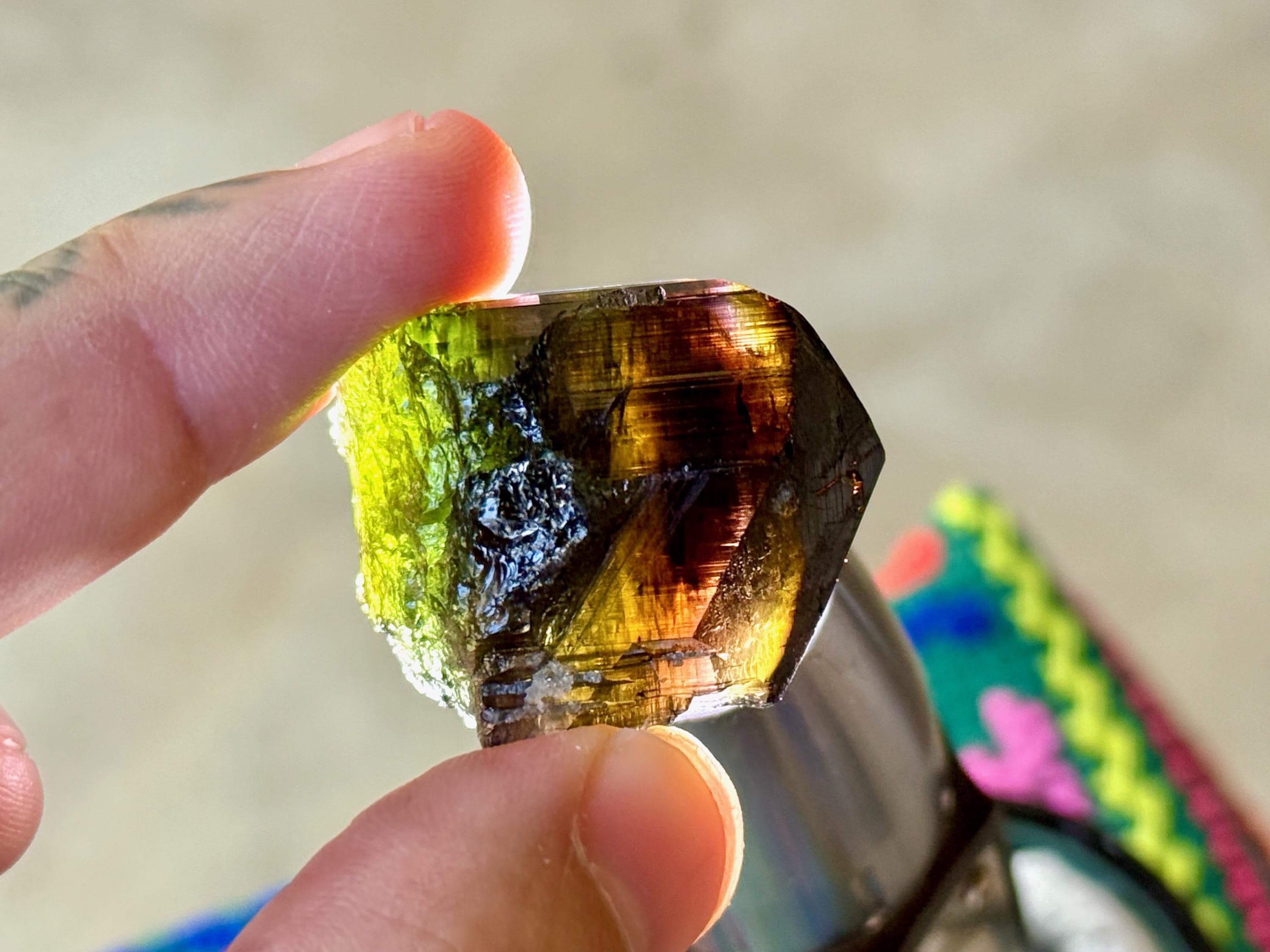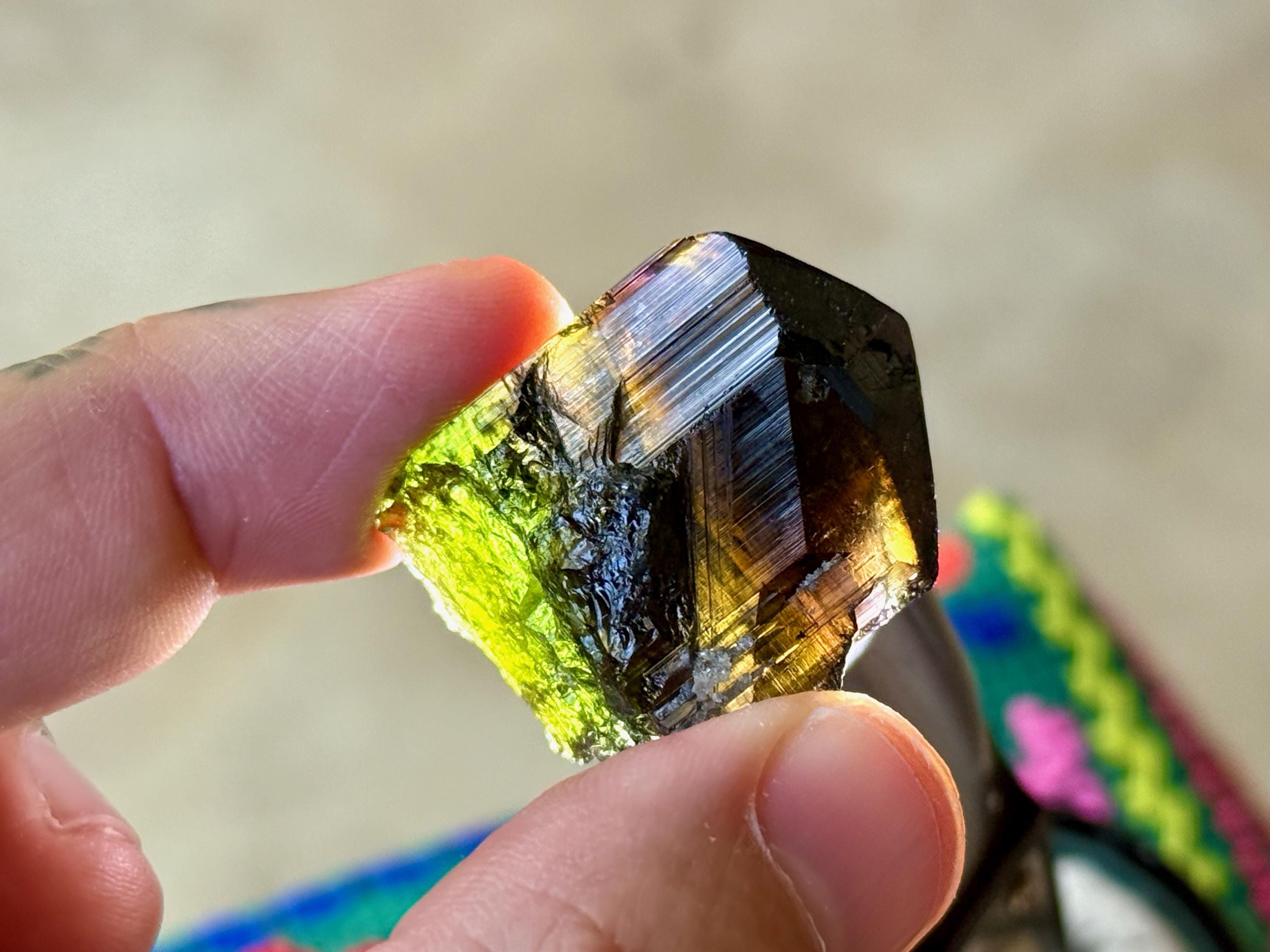 When backlit, however, this crystal comes to life in a spectacular way, displaying banded colors of green, brownish-orange, yellow and pink!